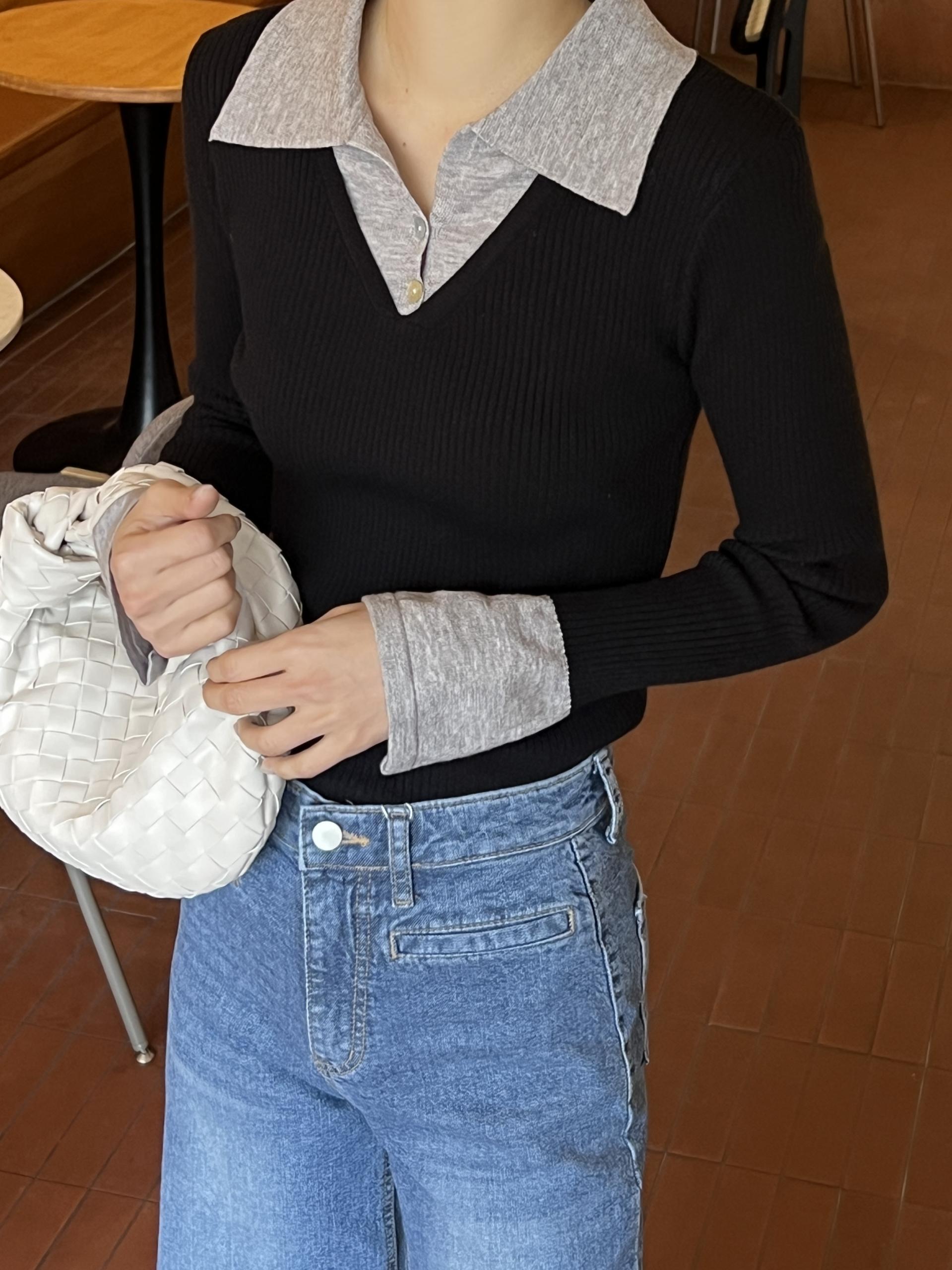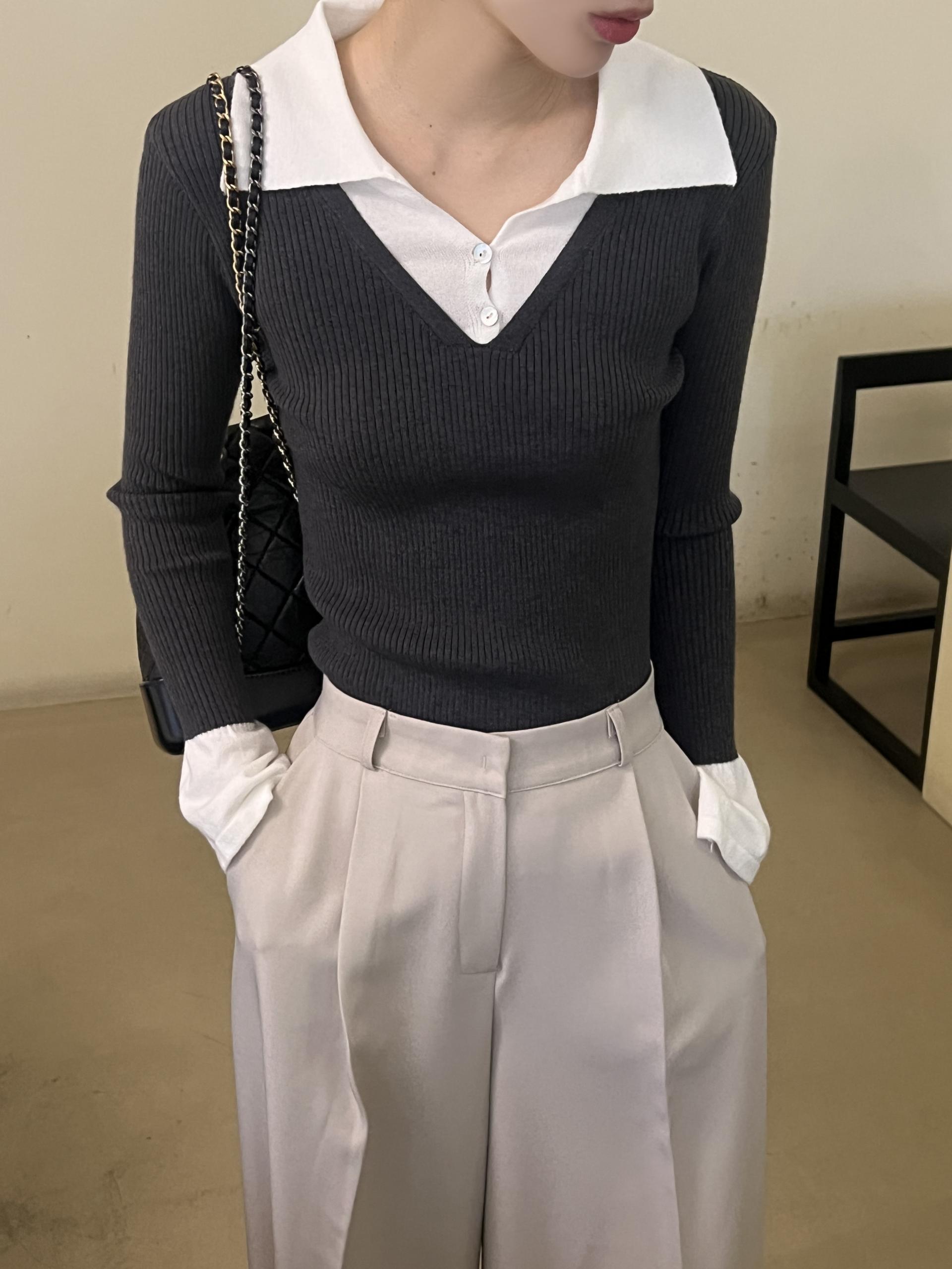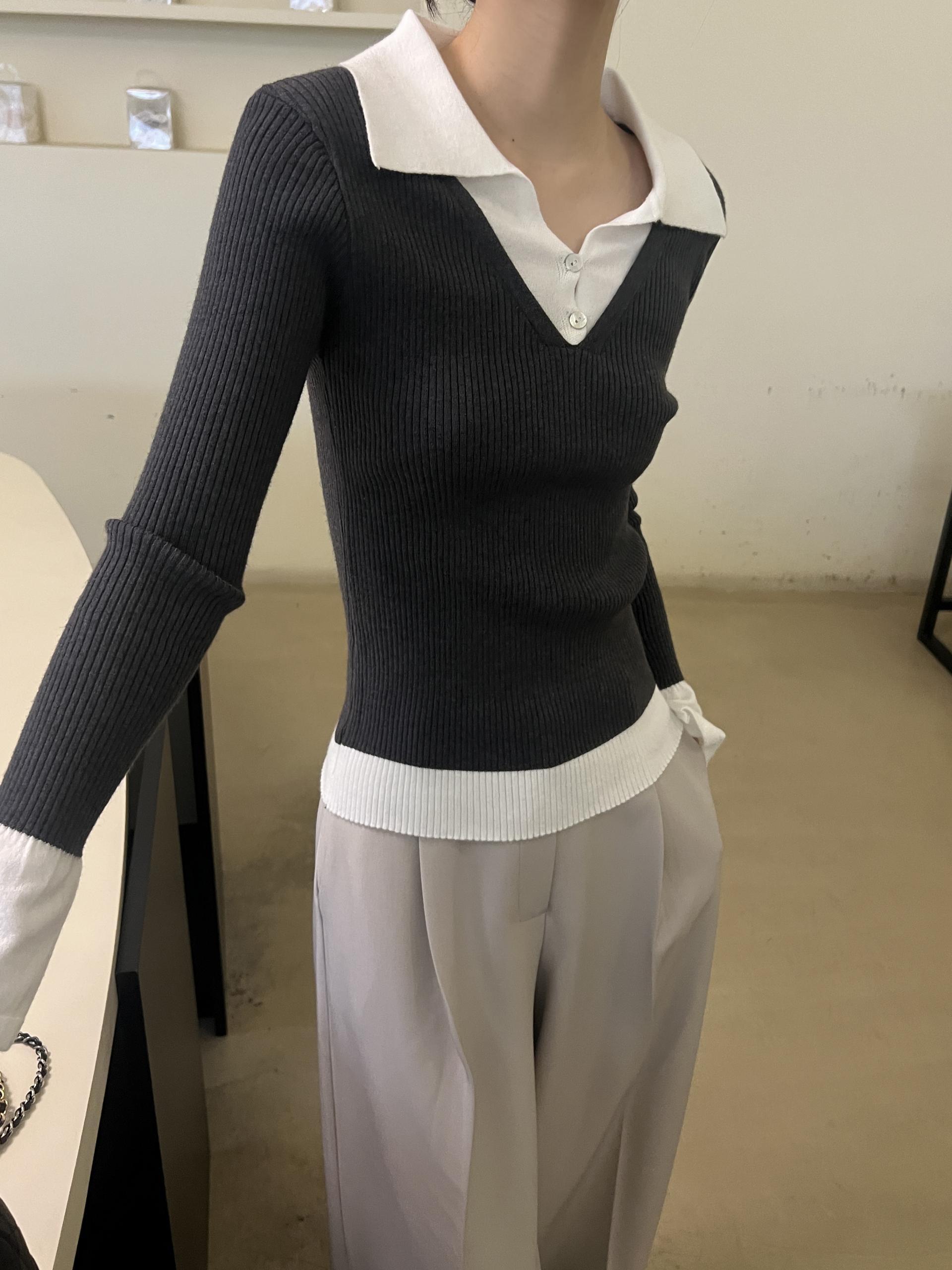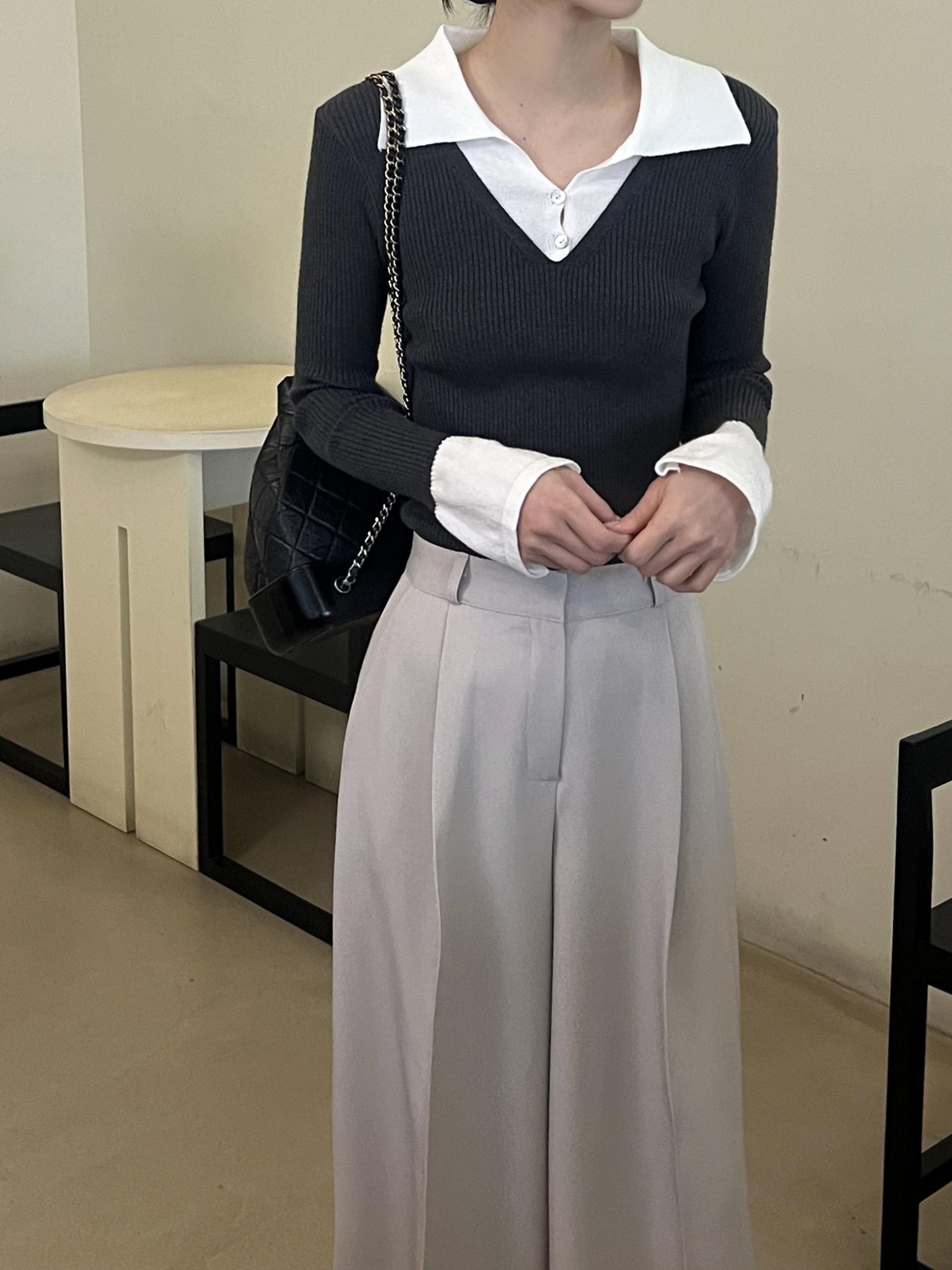 카라 니트와 브이넥 니트가 레이어드된 듯한 디자인의 슬림핏 골지 니트입니다.