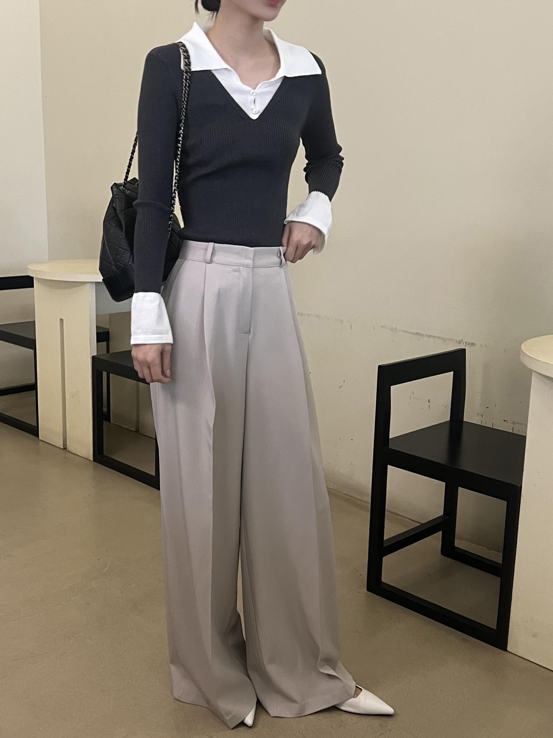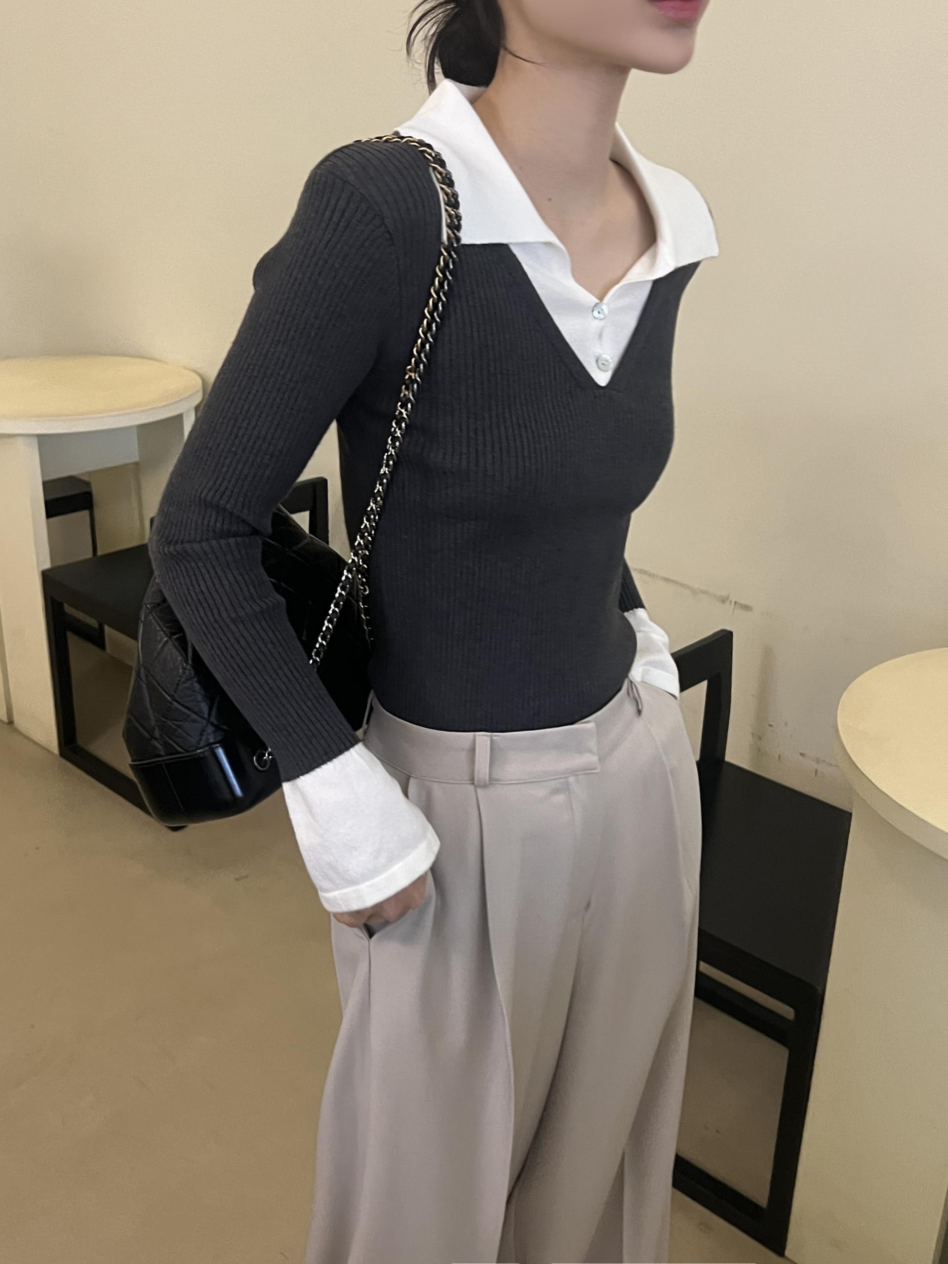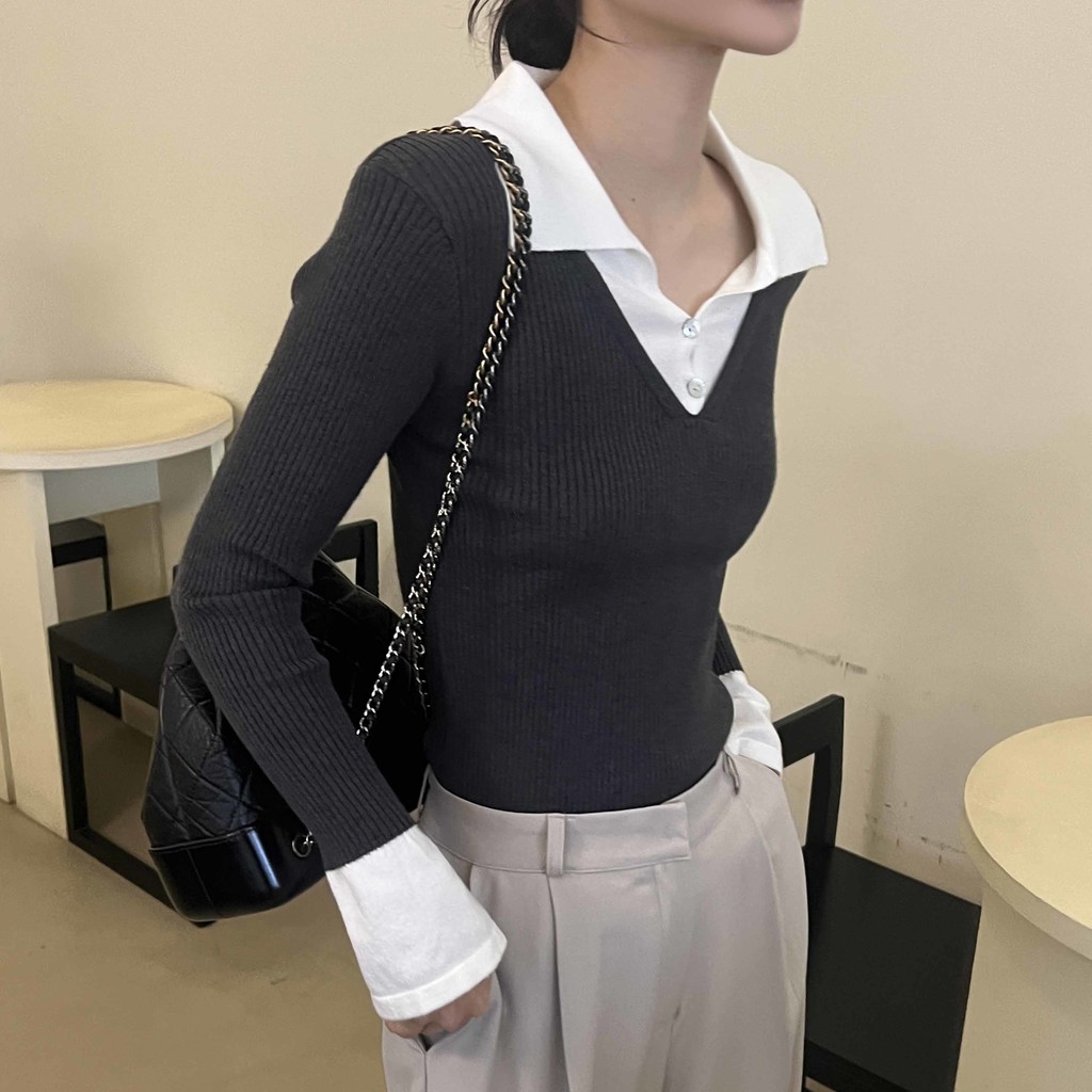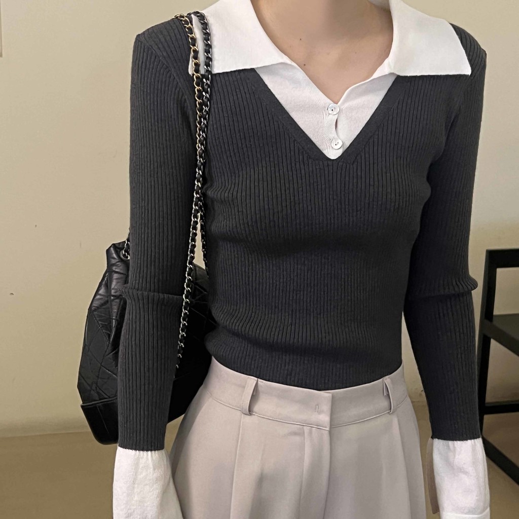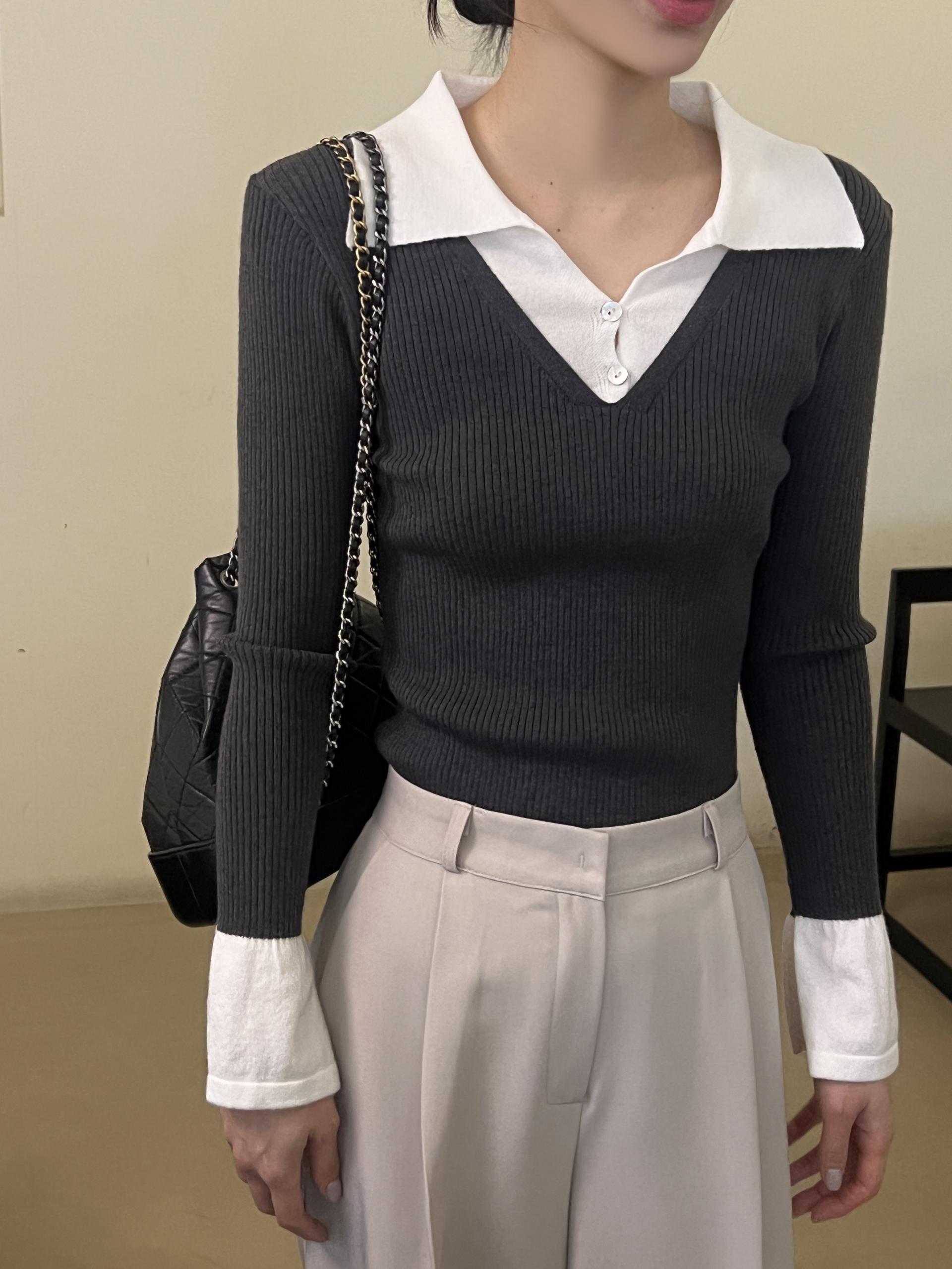 카라 니트와 브이넥 니트가 레이어드된 듯한 디자인의 슬림핏 골지 니트입니다.