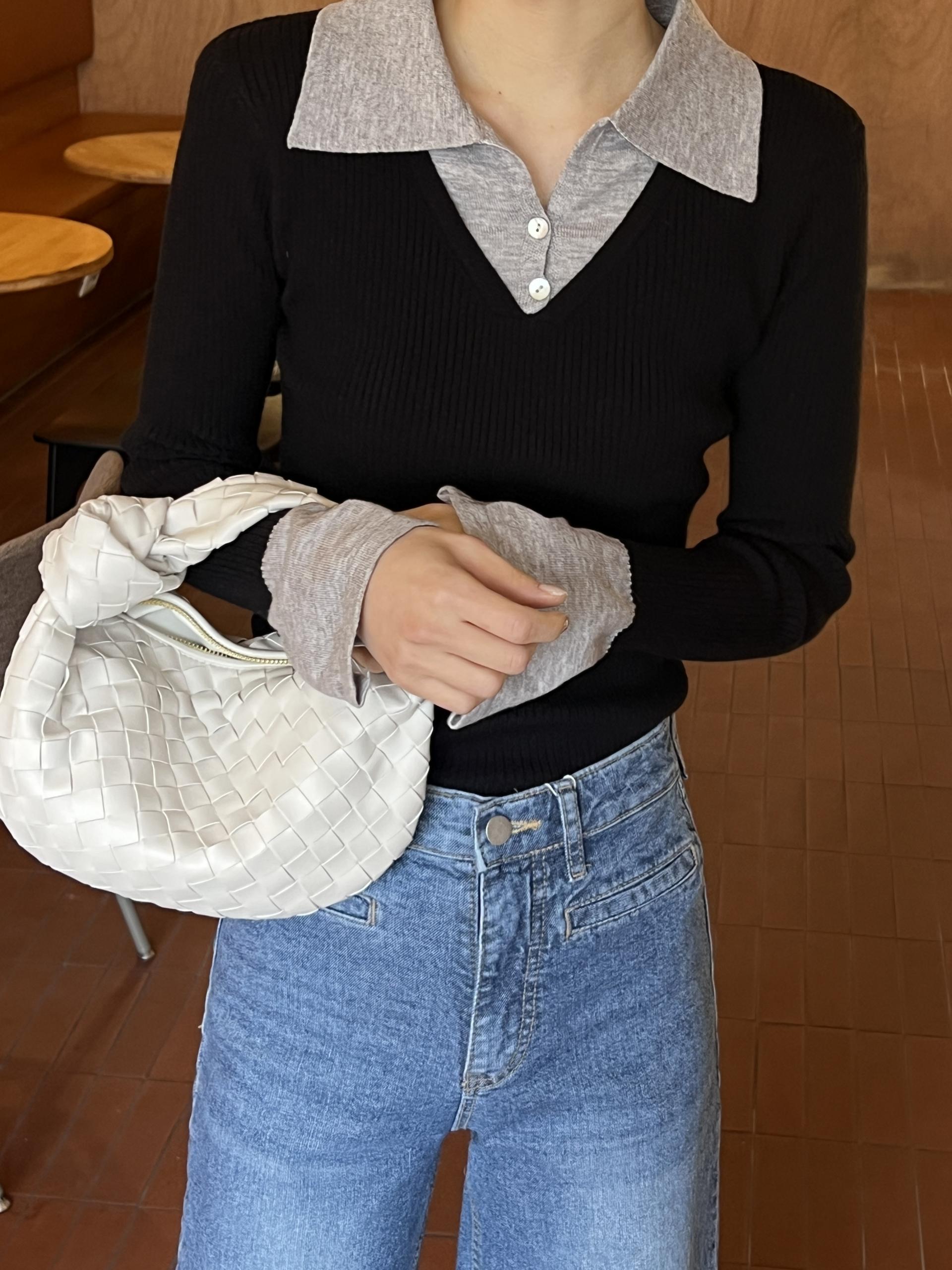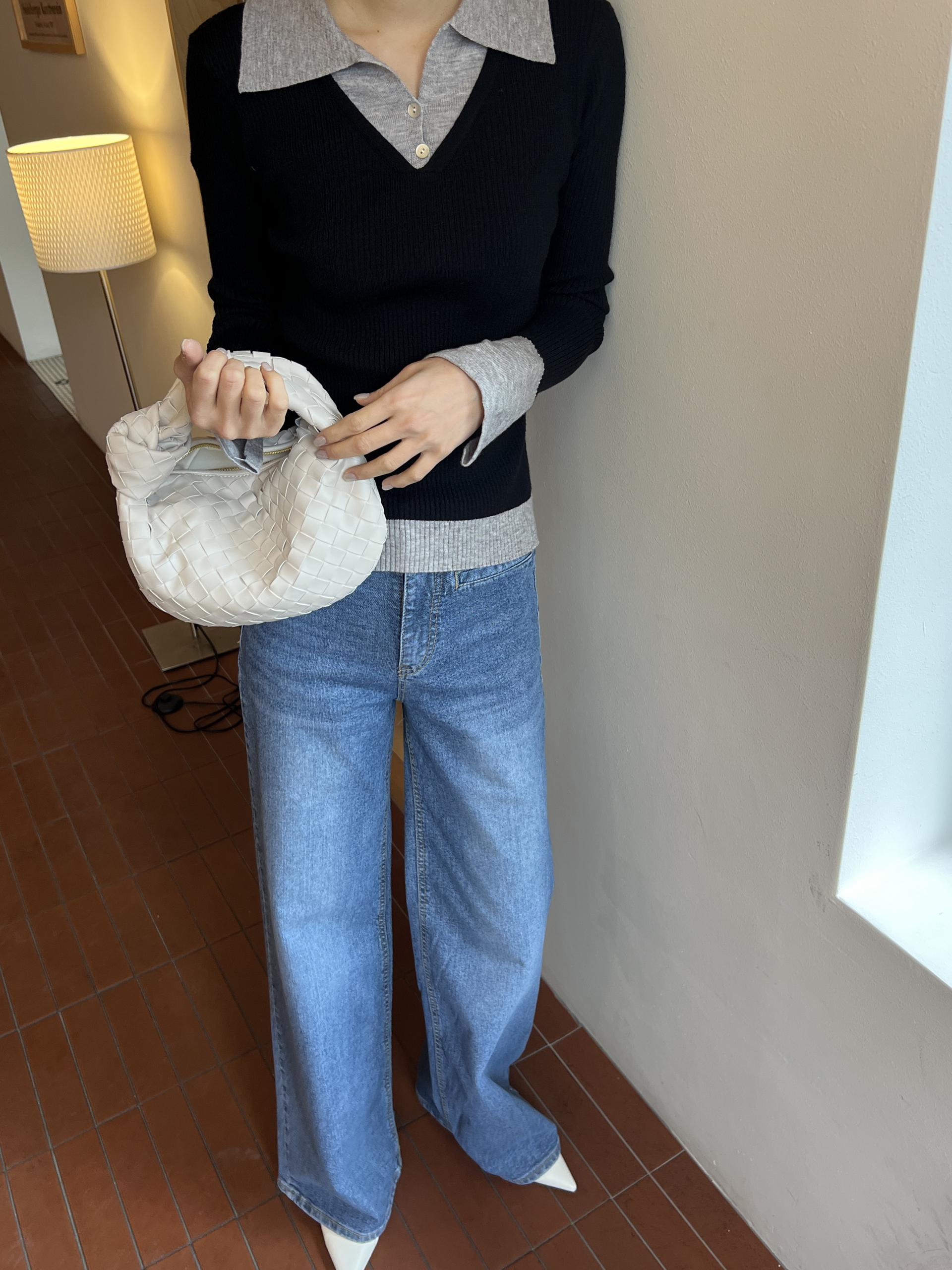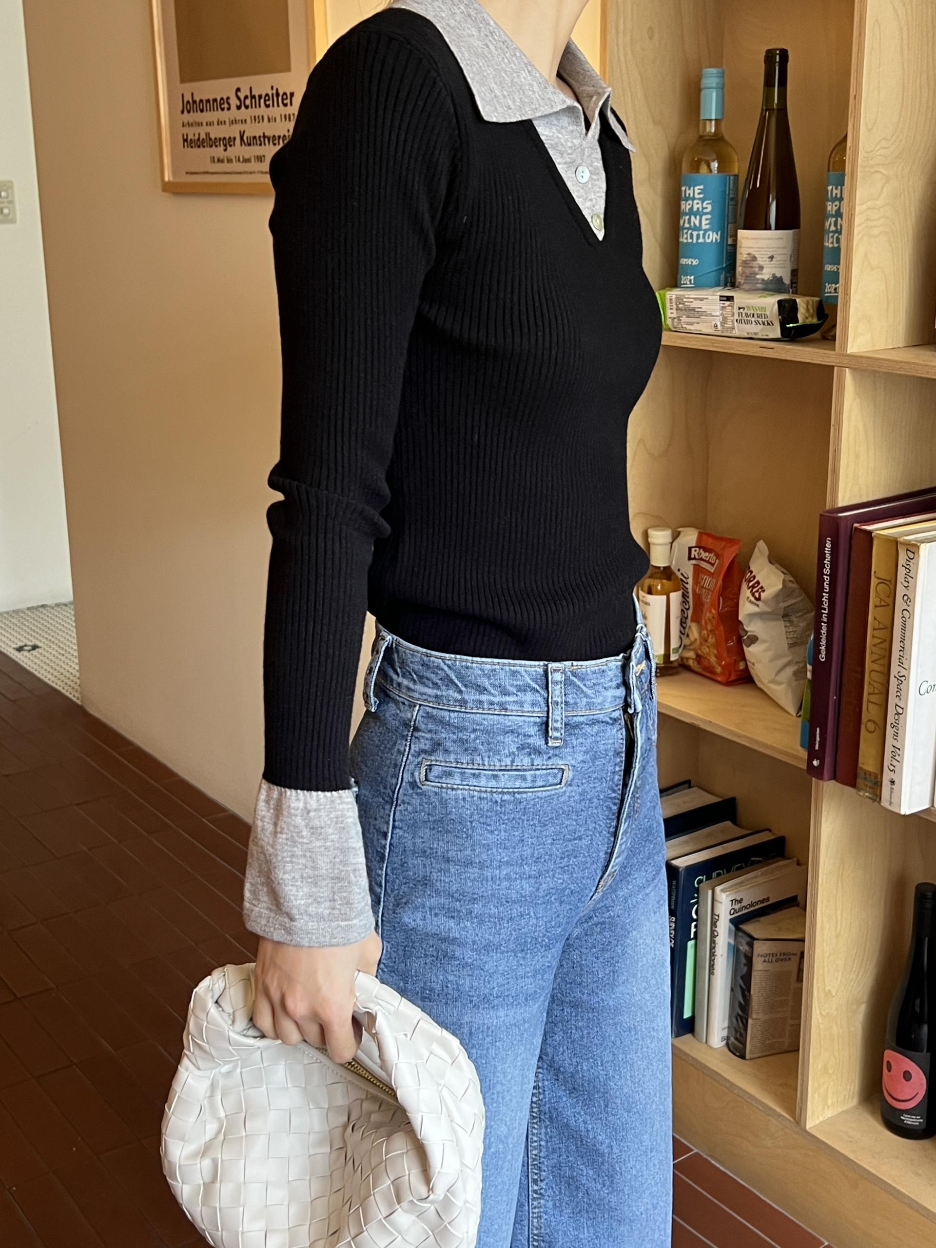카라, 소매 끝, 티셔츠 밑단과 브이넥 니트의 컬러가 서로 다른 배색 디테일로 흔하지 않고 하나로도 밋밋하지 않아 좋았어요.