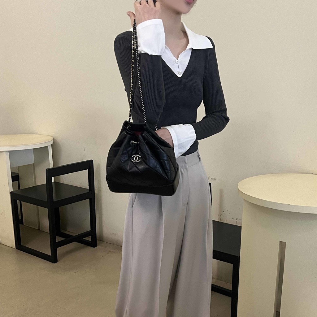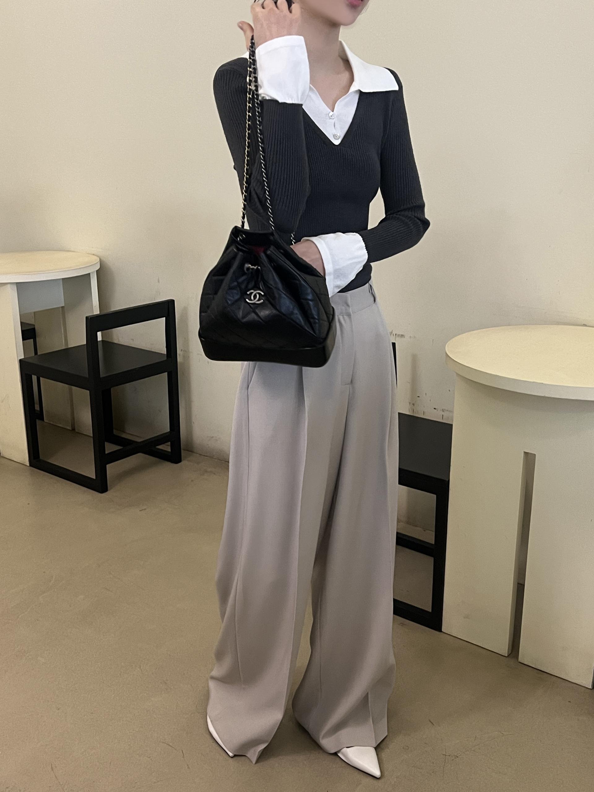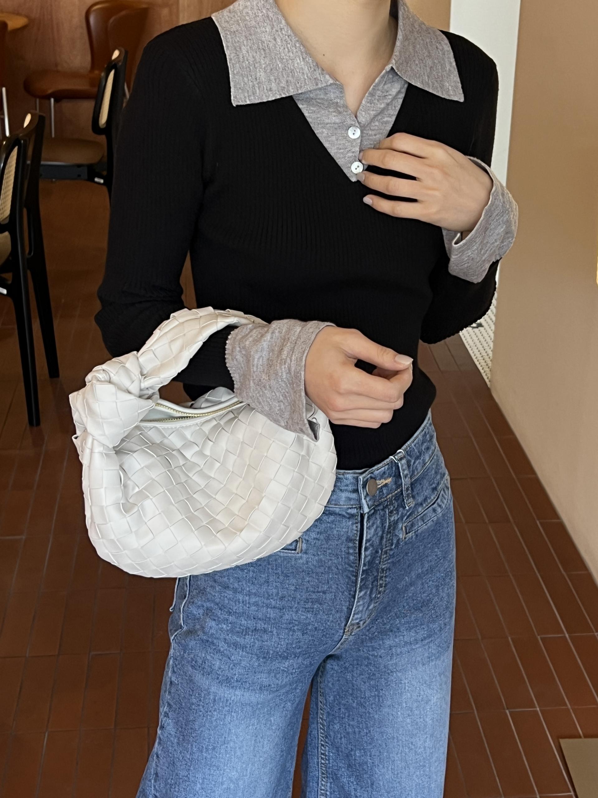 카라, 소매 끝, 티셔츠 밑단과 브이넥 니트의 컬러가 서로 다른 배색 디테일로 흔하지 않고 하나로도 밋밋하지 않아 좋았어요.