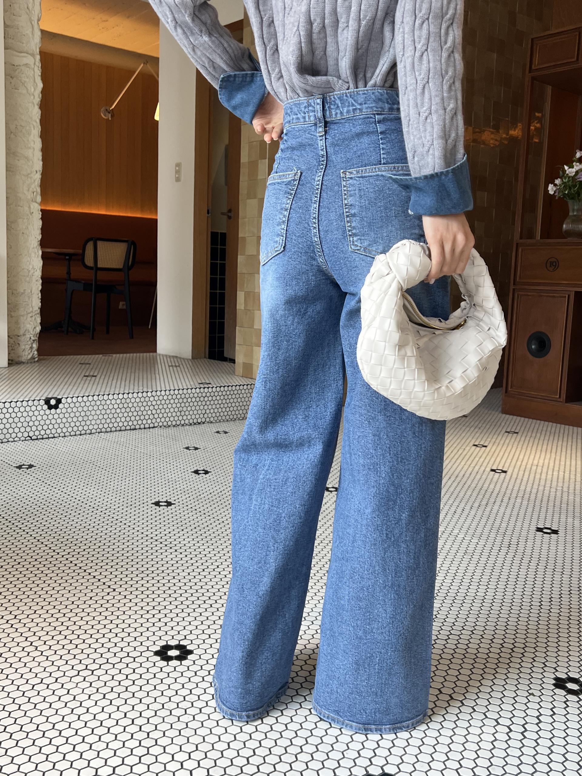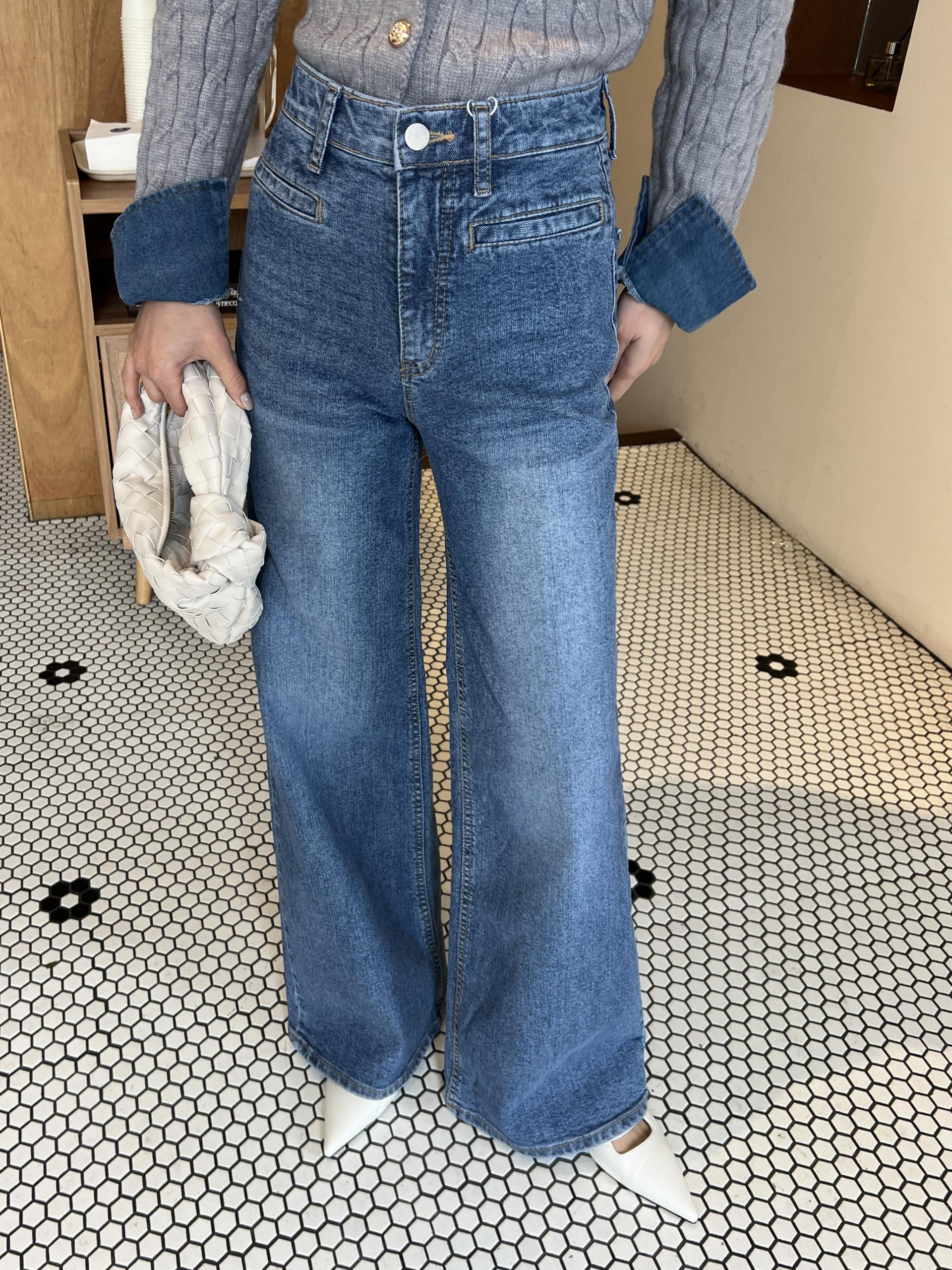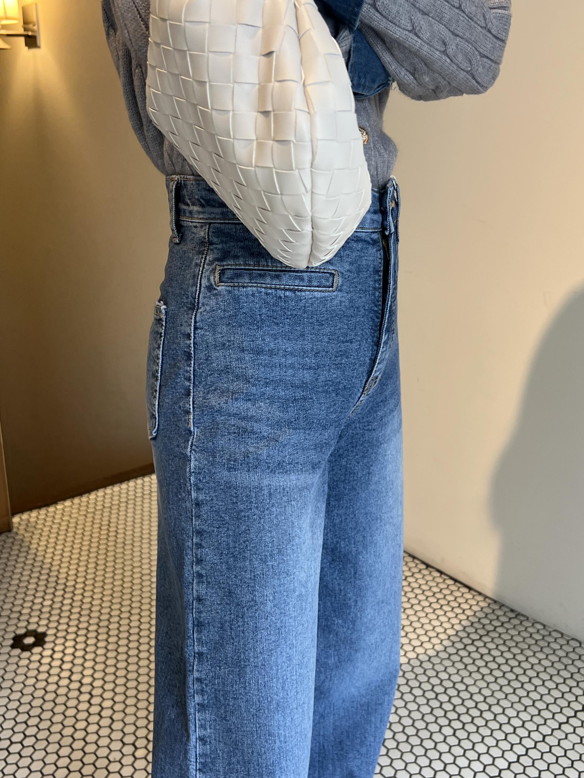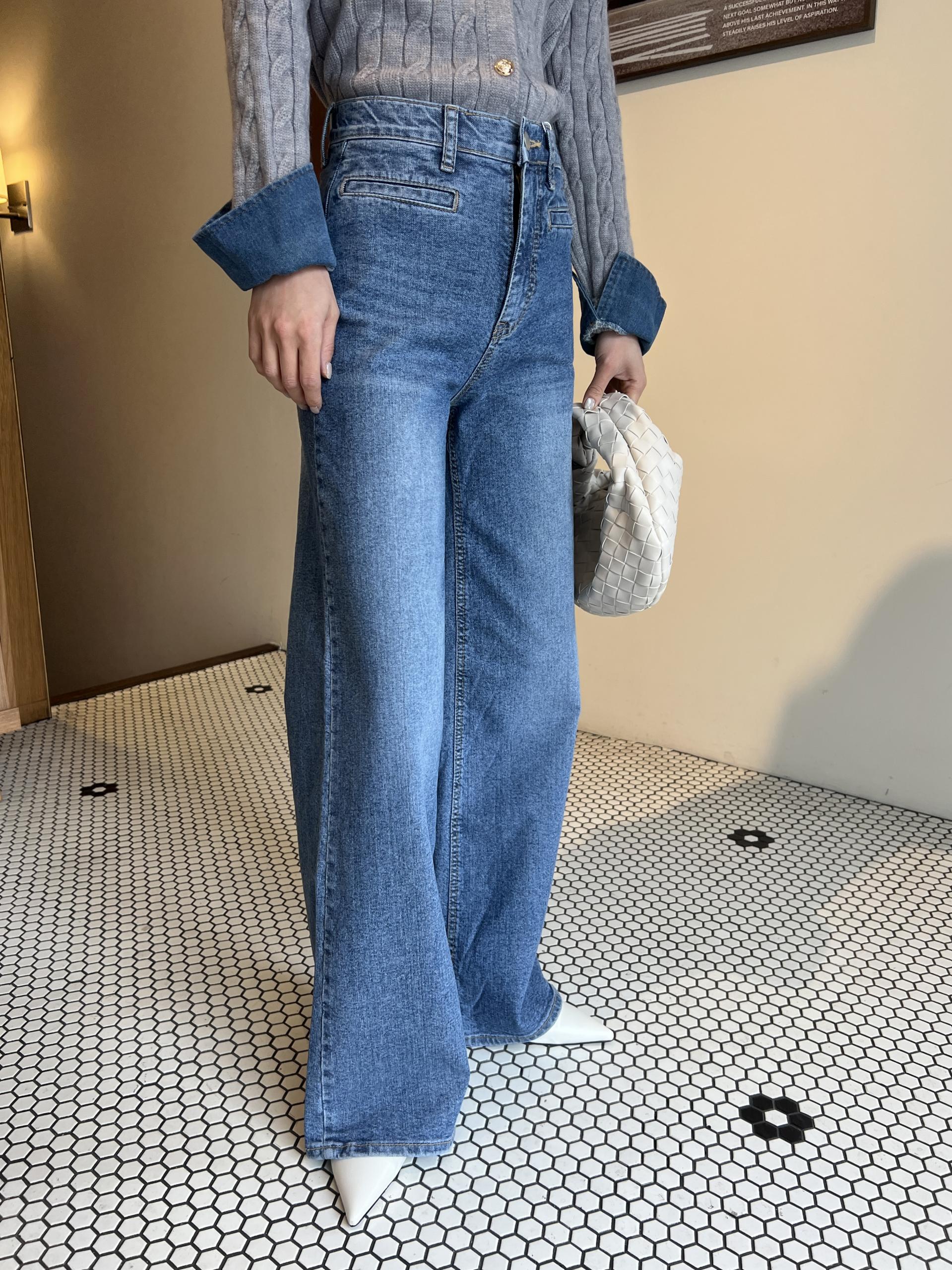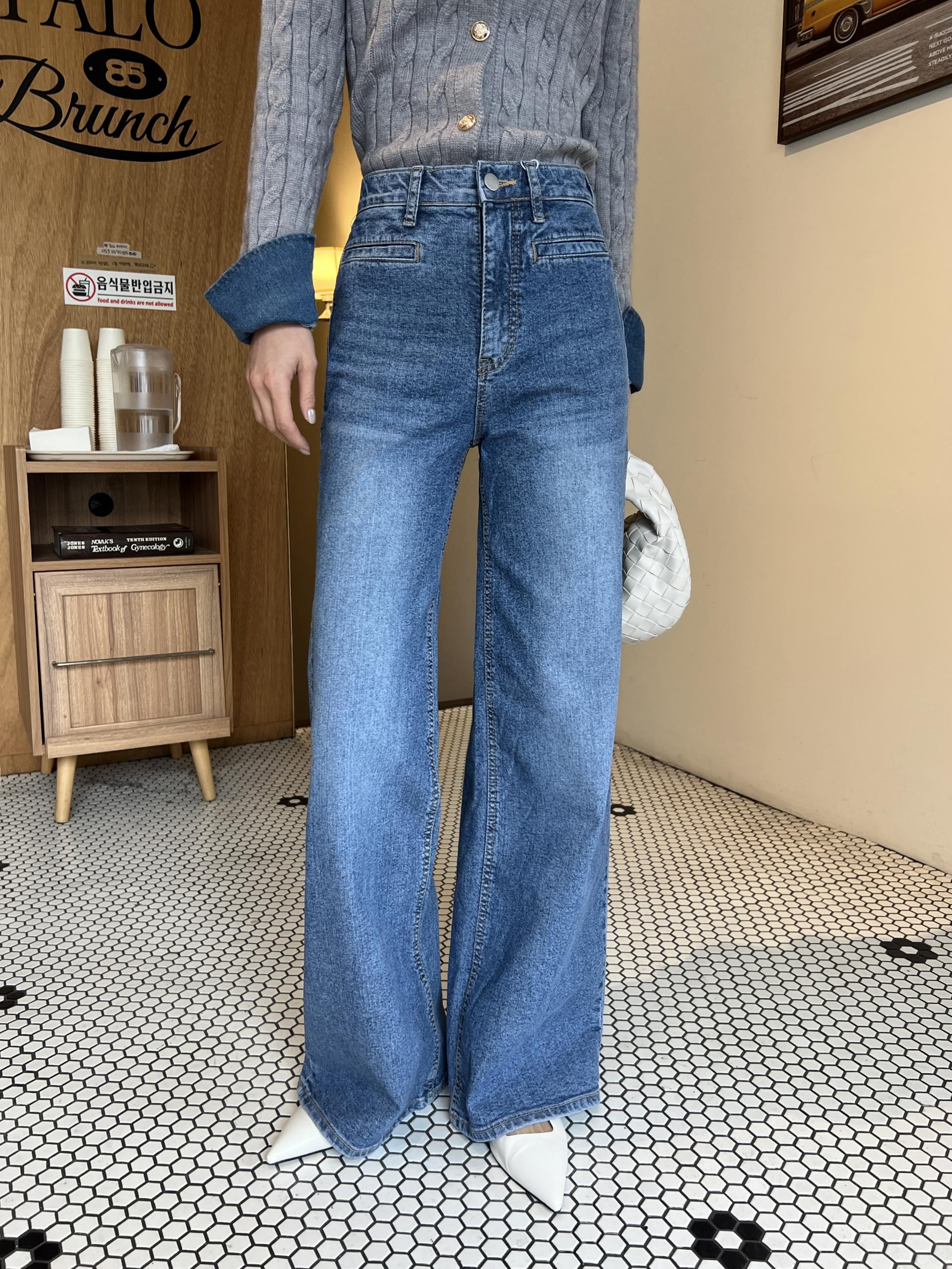 히든 밴딩에 스판기가 좋아 체형에 딱 맞는, 예쁜 핏으로 착용 가능한 세미 와이드 핏의 롱 데님 팬츠입니다.