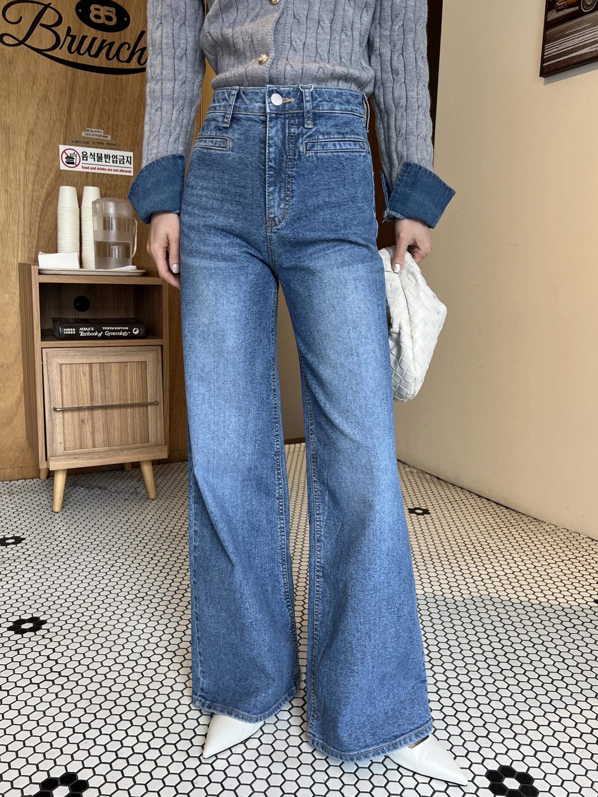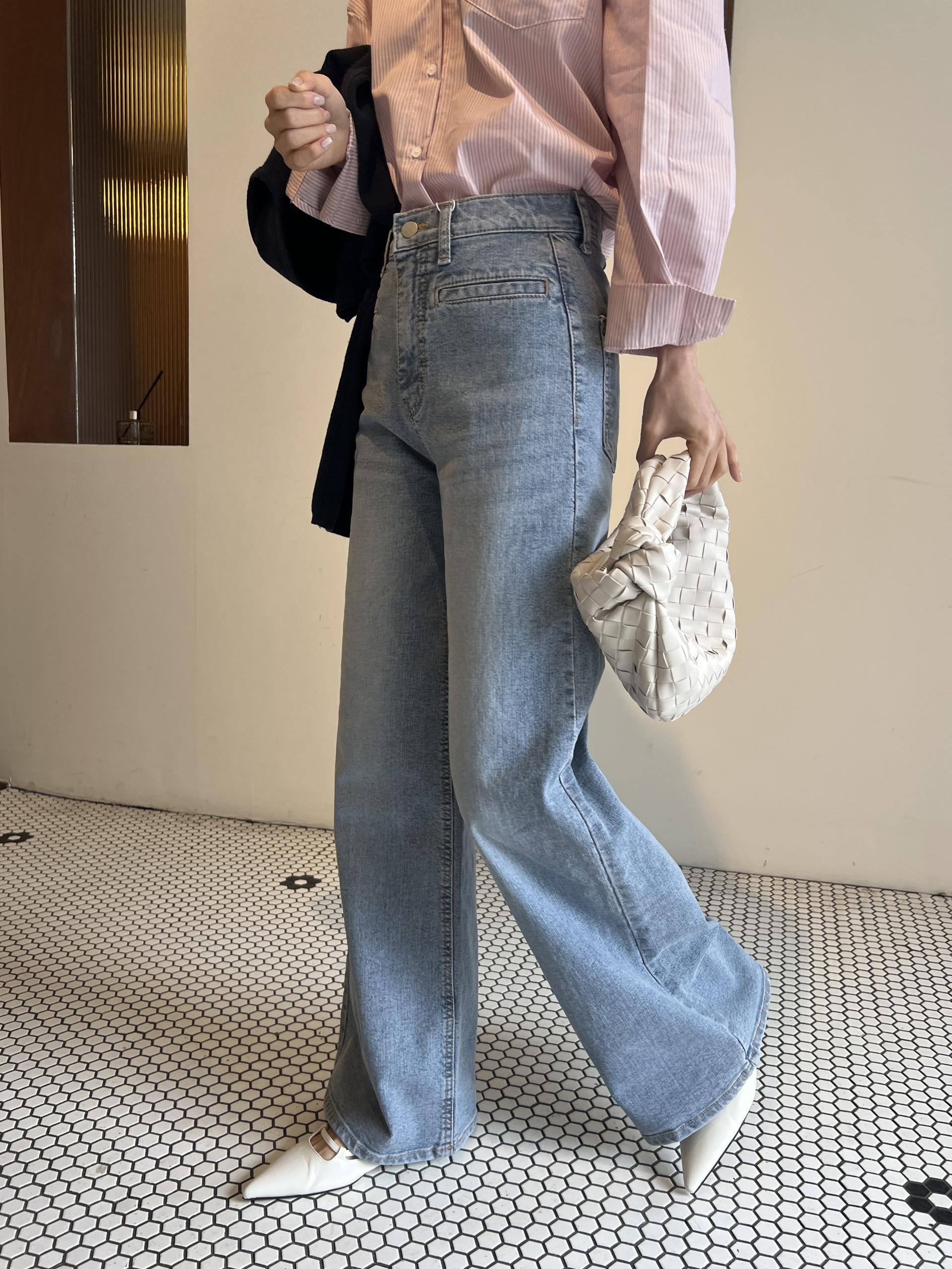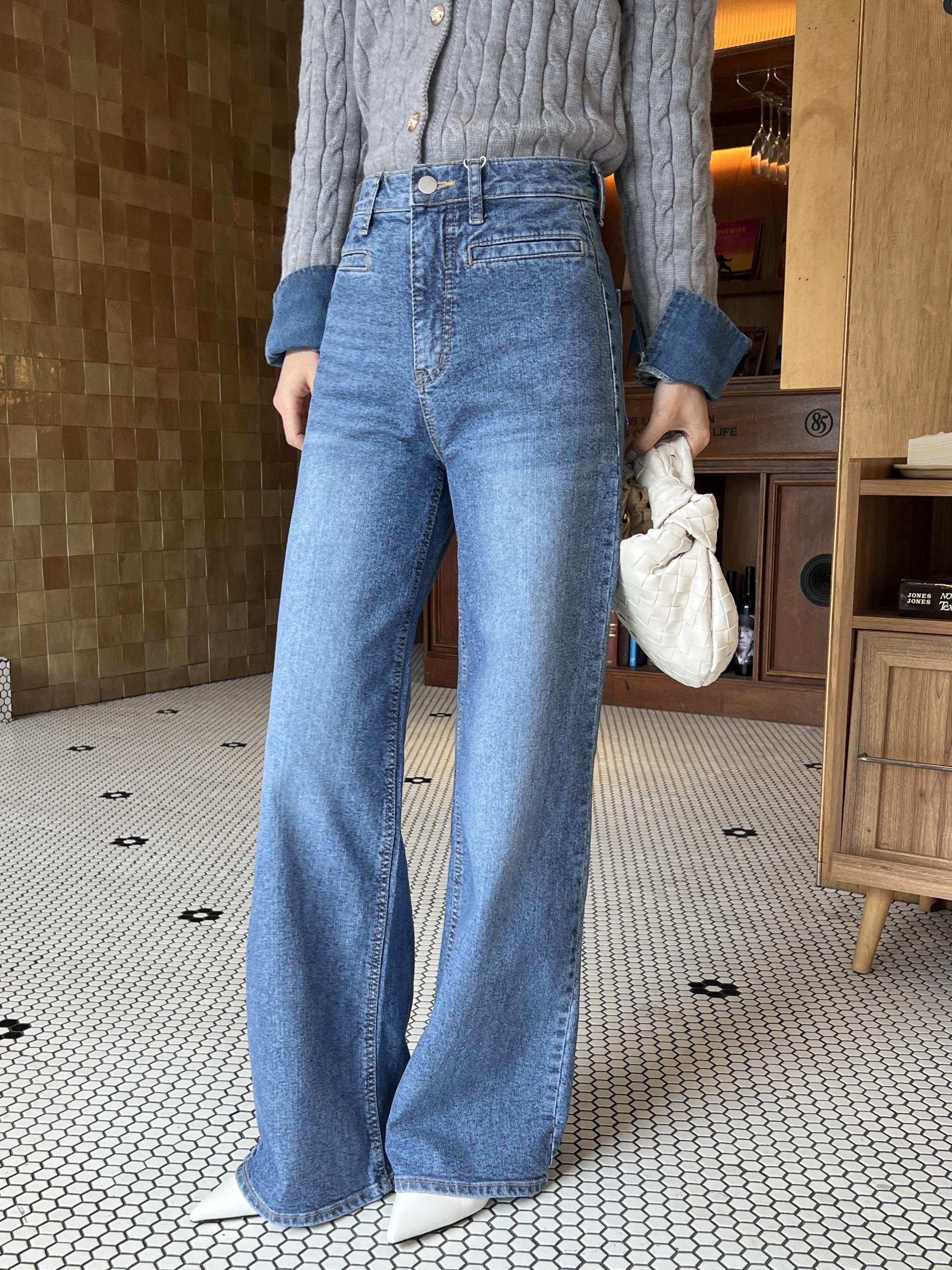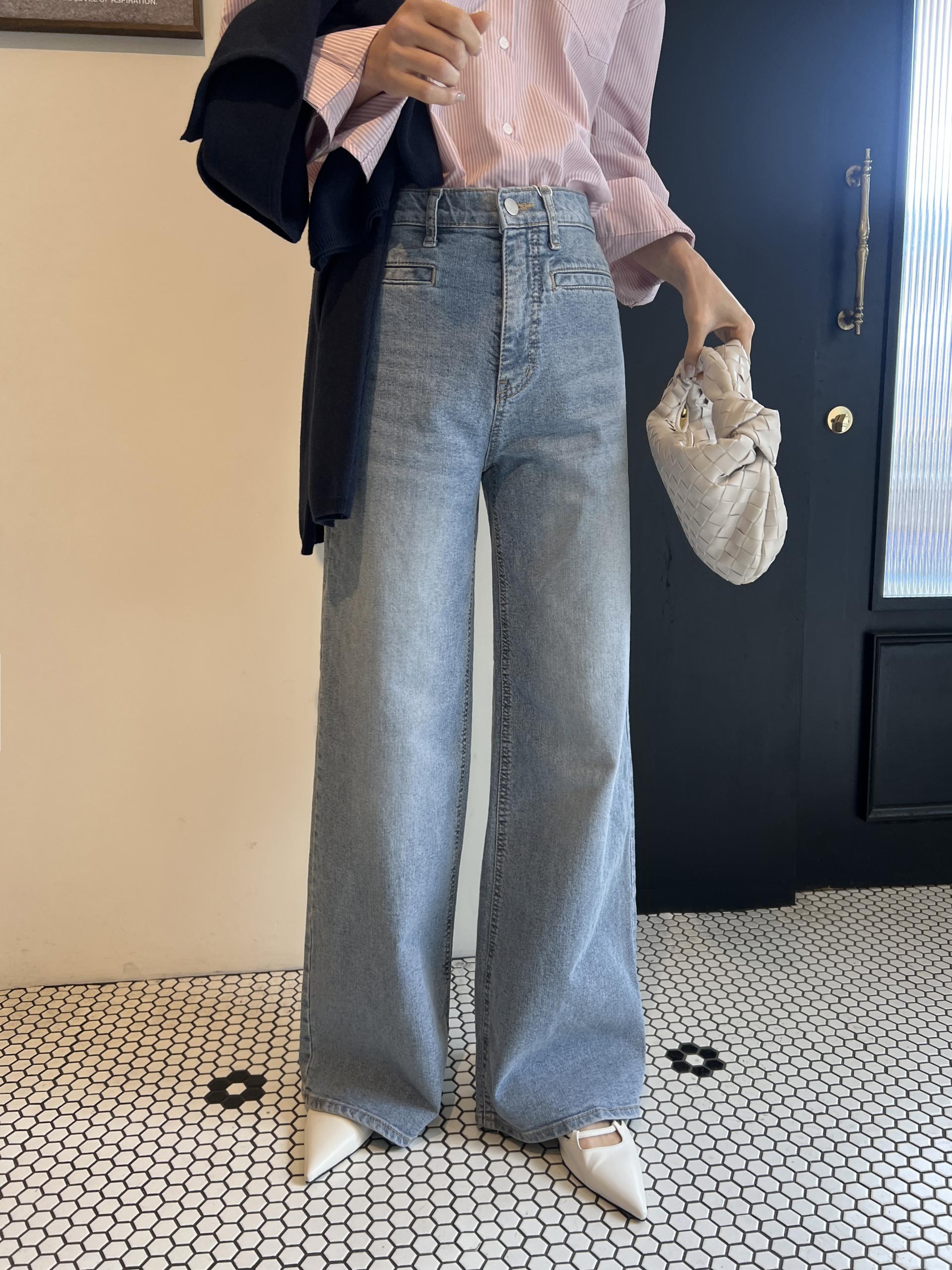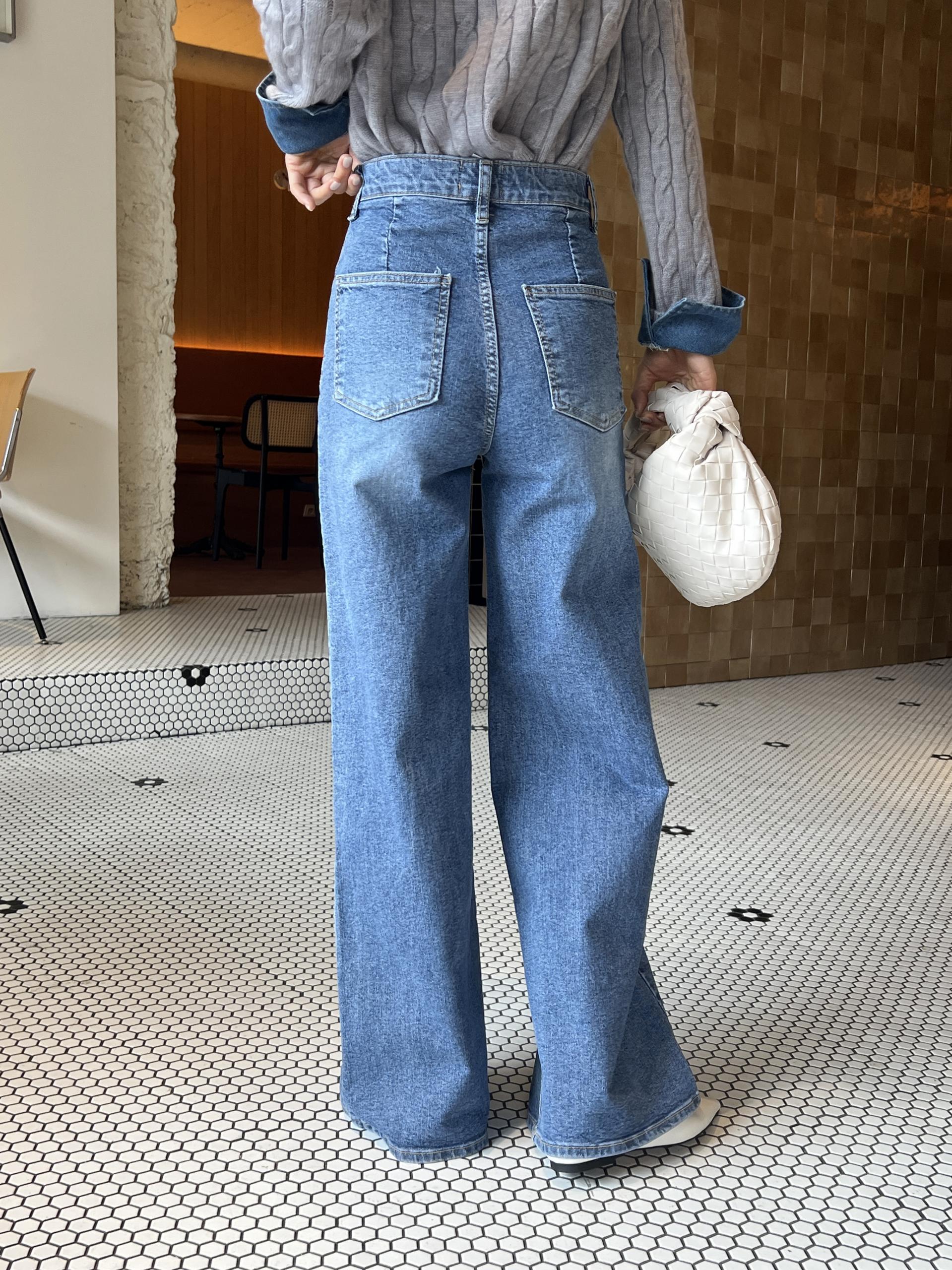 히든 밴딩에 스판기가 좋아 체형에 딱 맞는, 예쁜 핏으로 착용 가능한 세미 와이드 핏의 롱 데님 팬츠입니다.