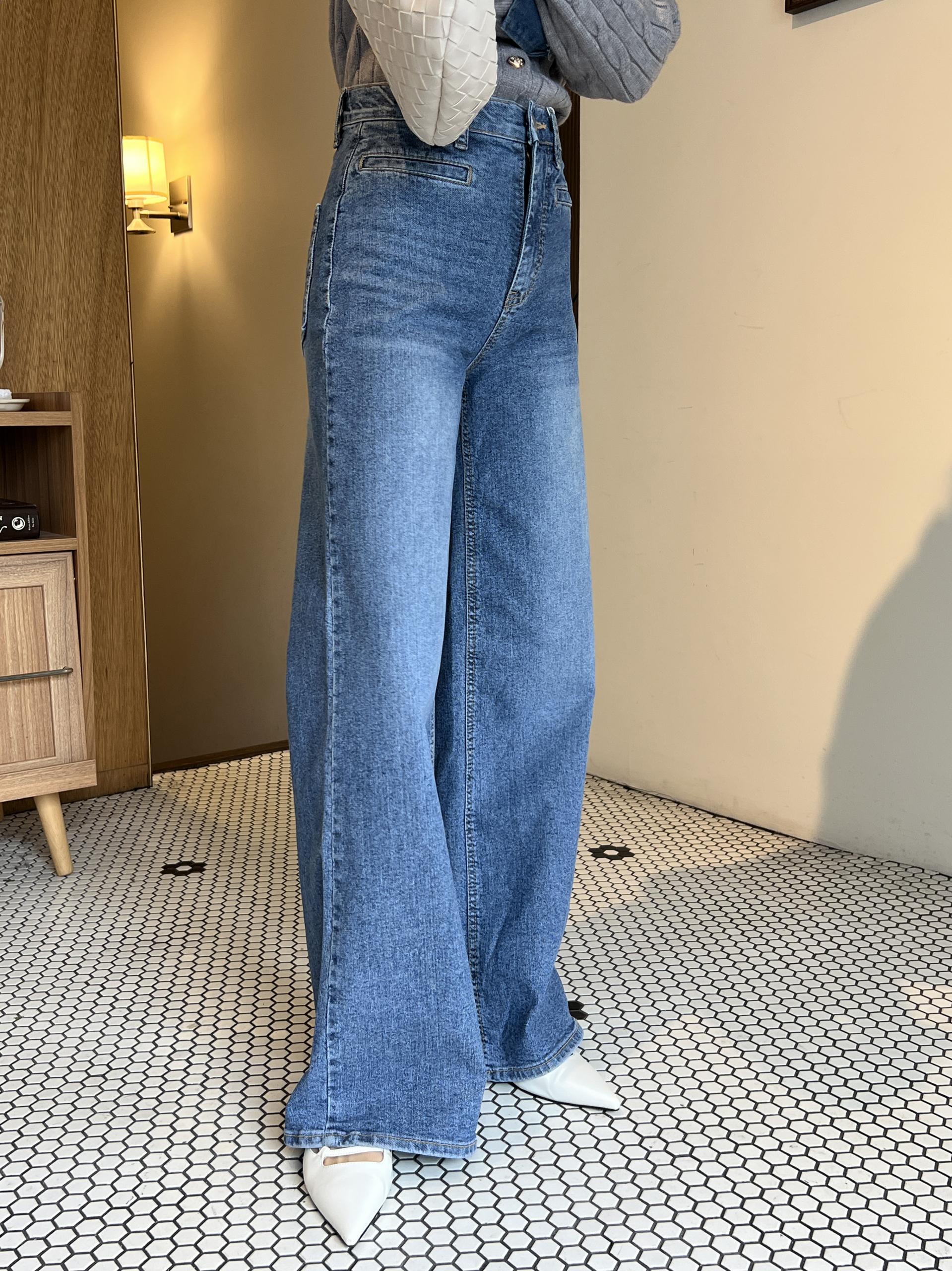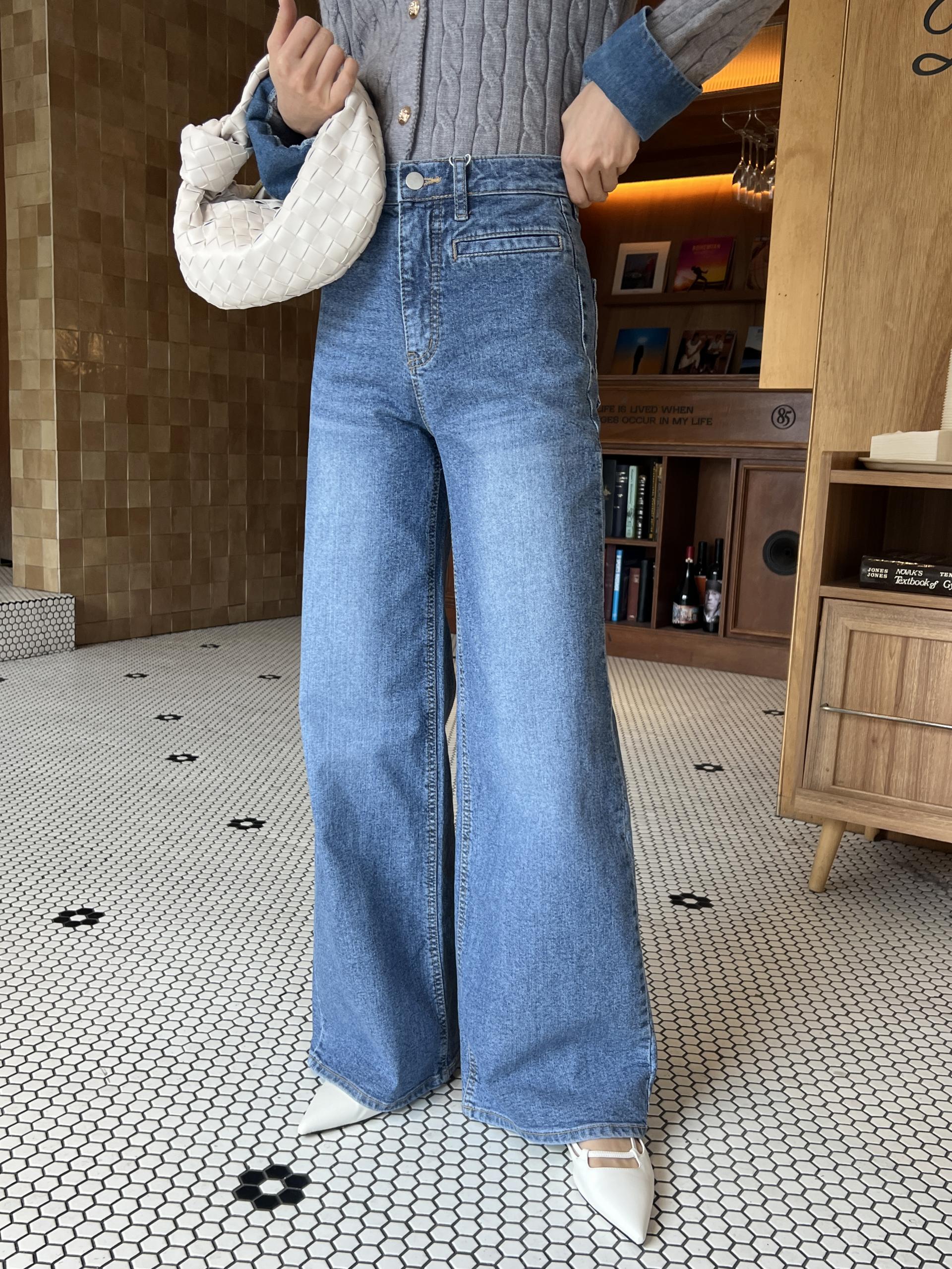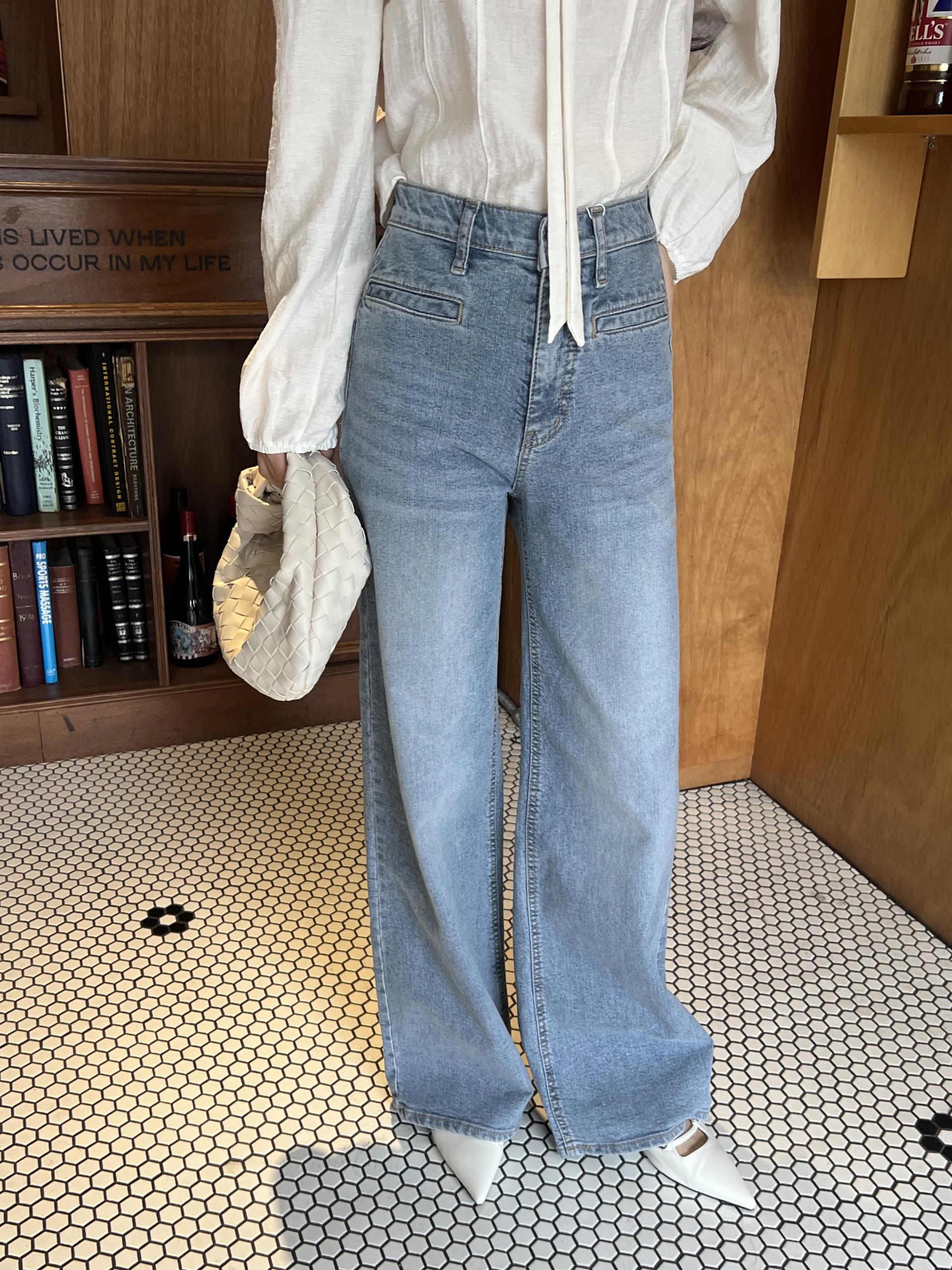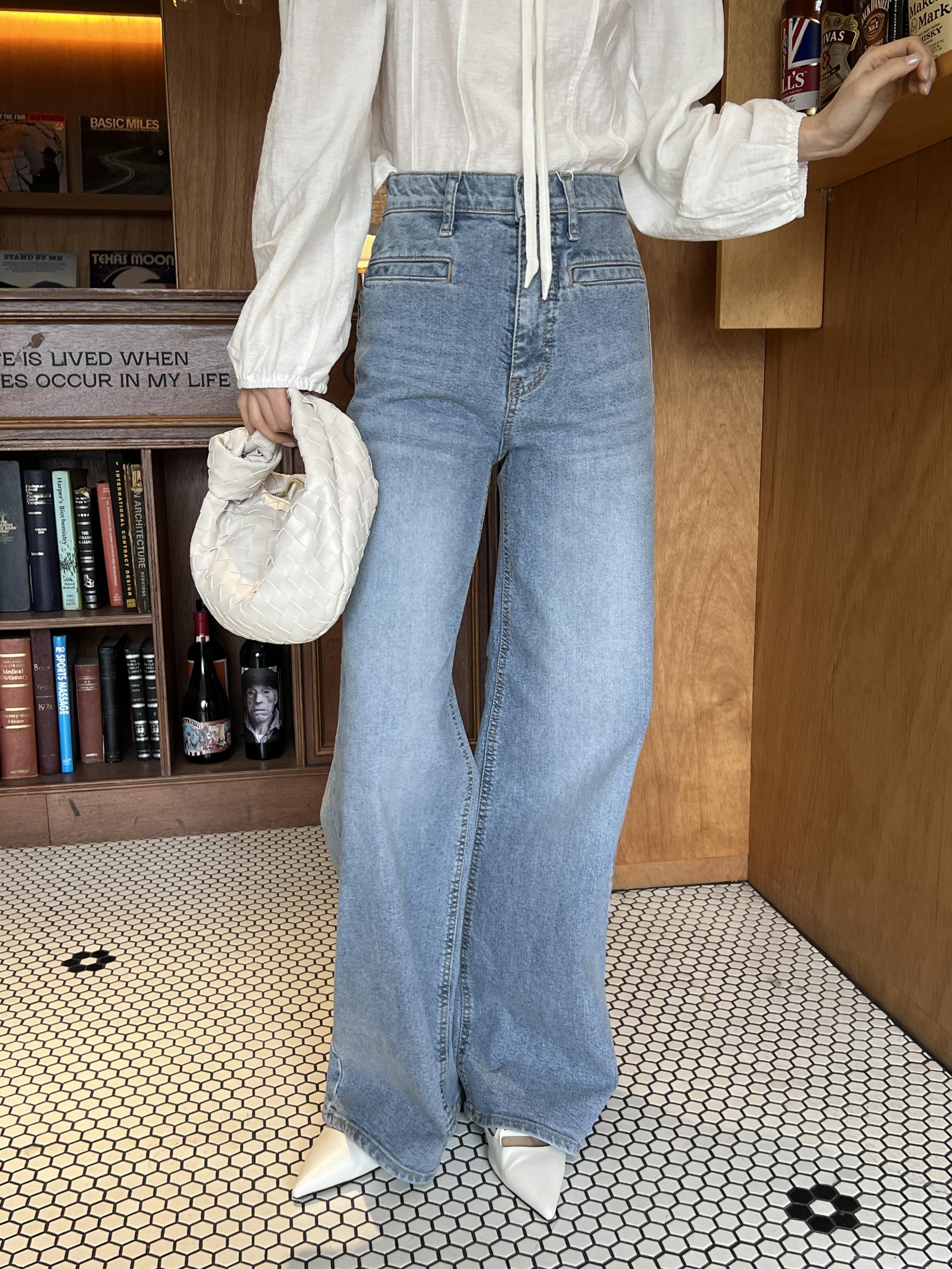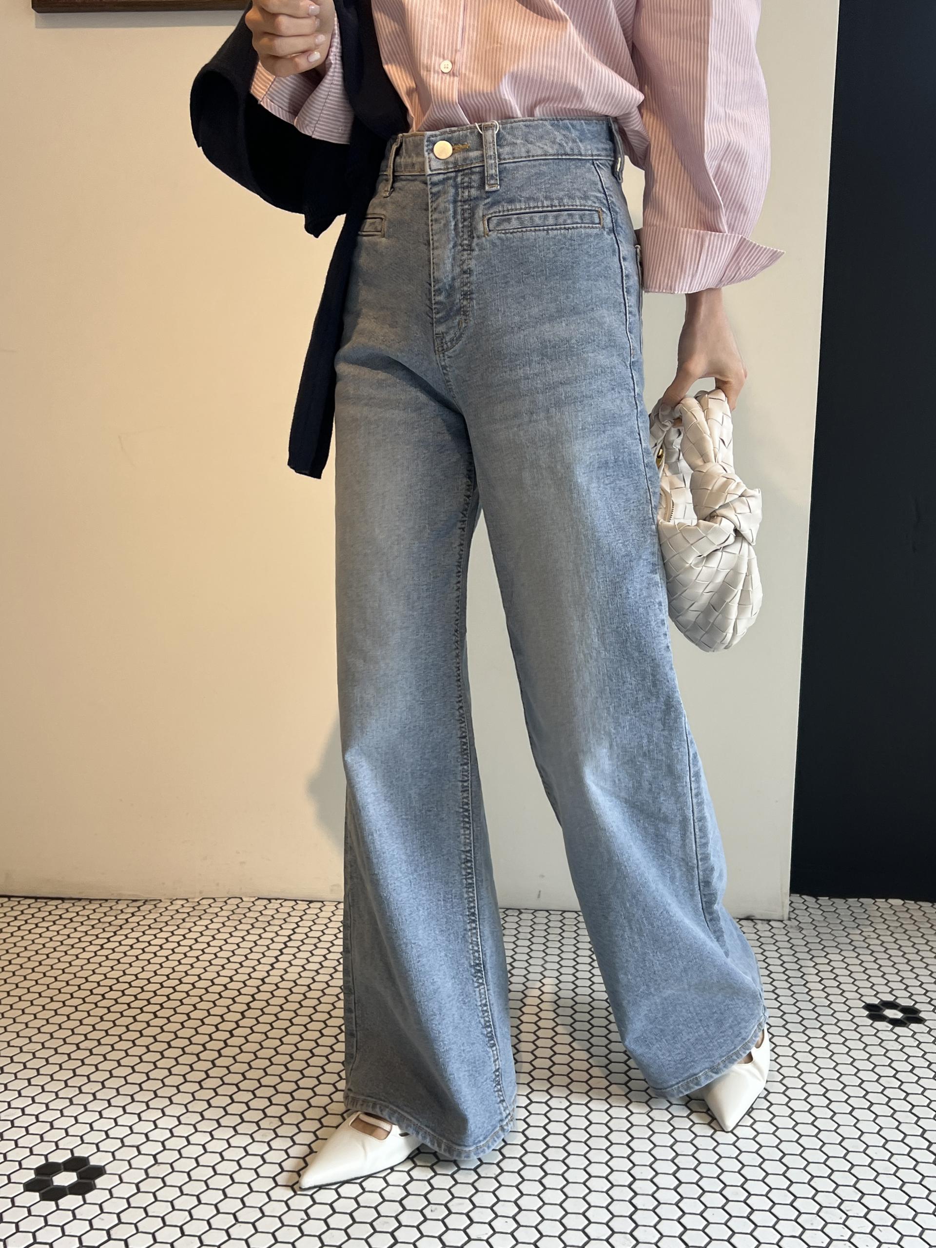 히든 밴딩에 스판기가 좋아 체형에 딱 맞는, 예쁜 핏으로 착용 가능한 세미 와이드 핏의 롱 데님 팬츠입니다.
