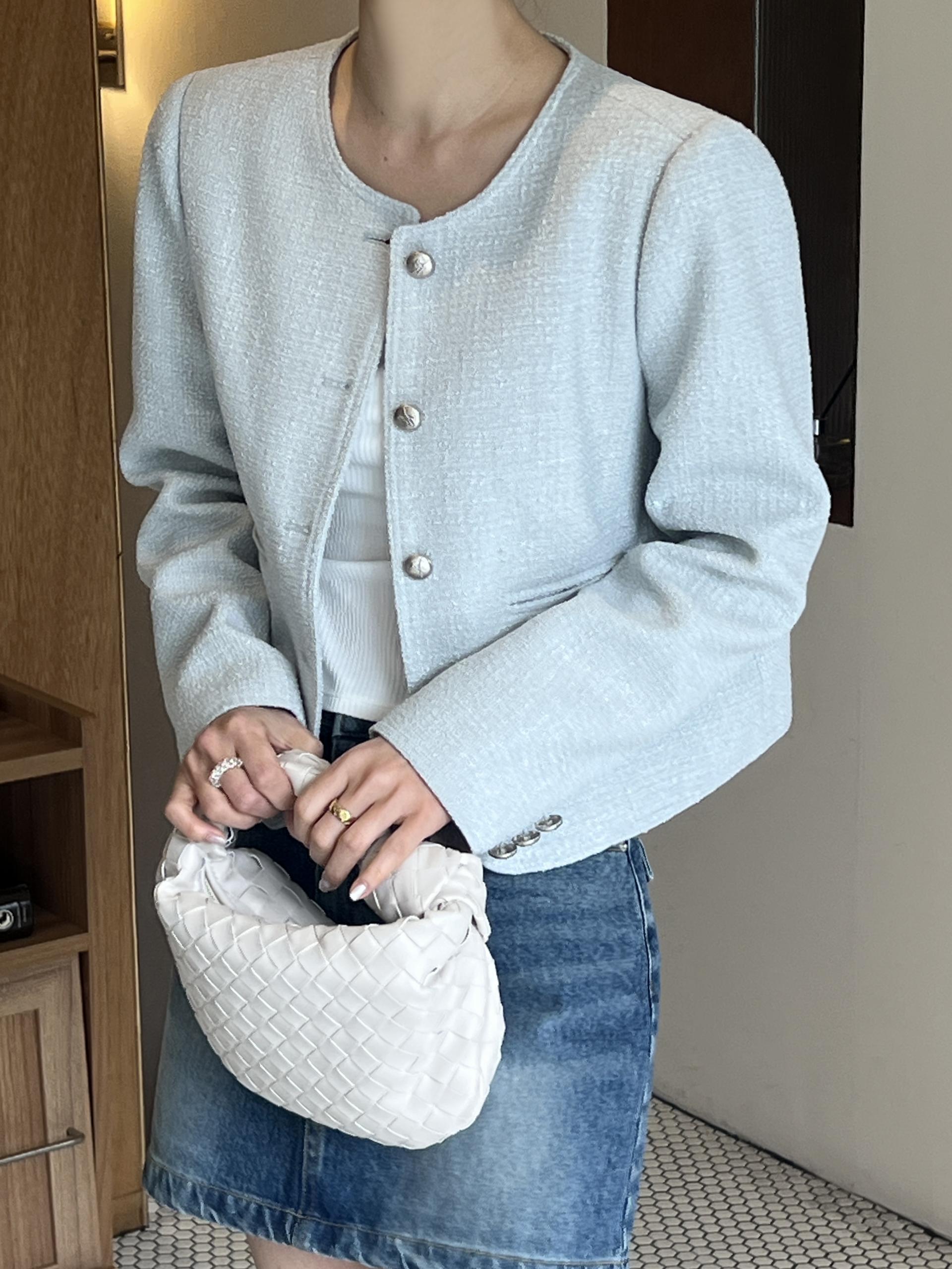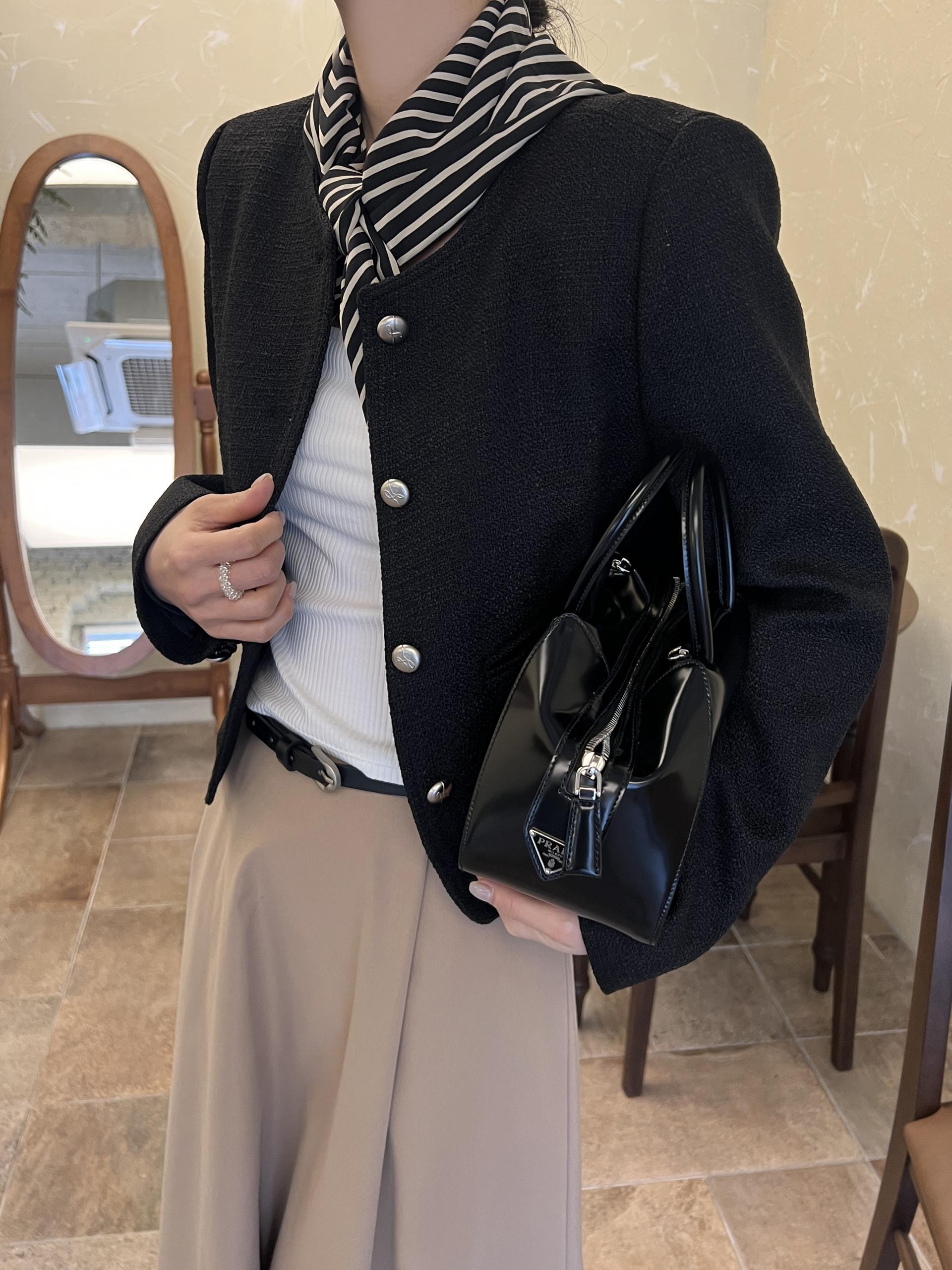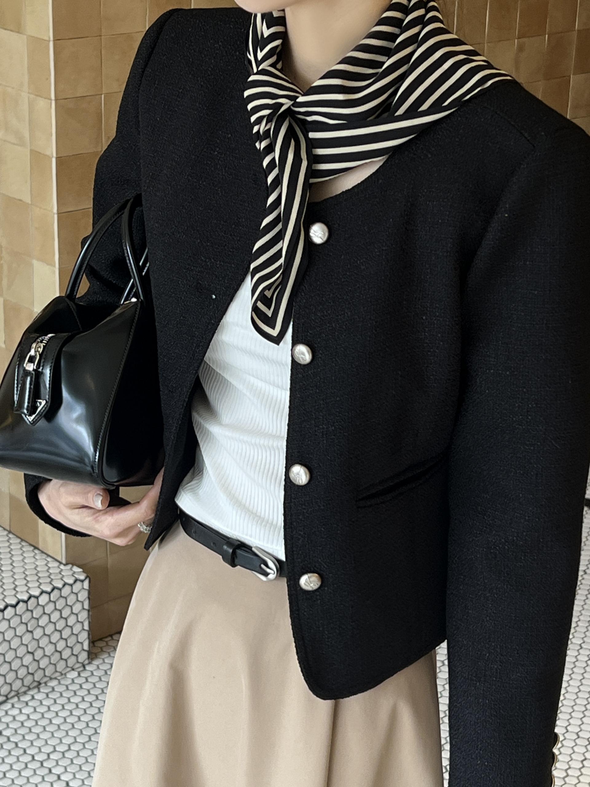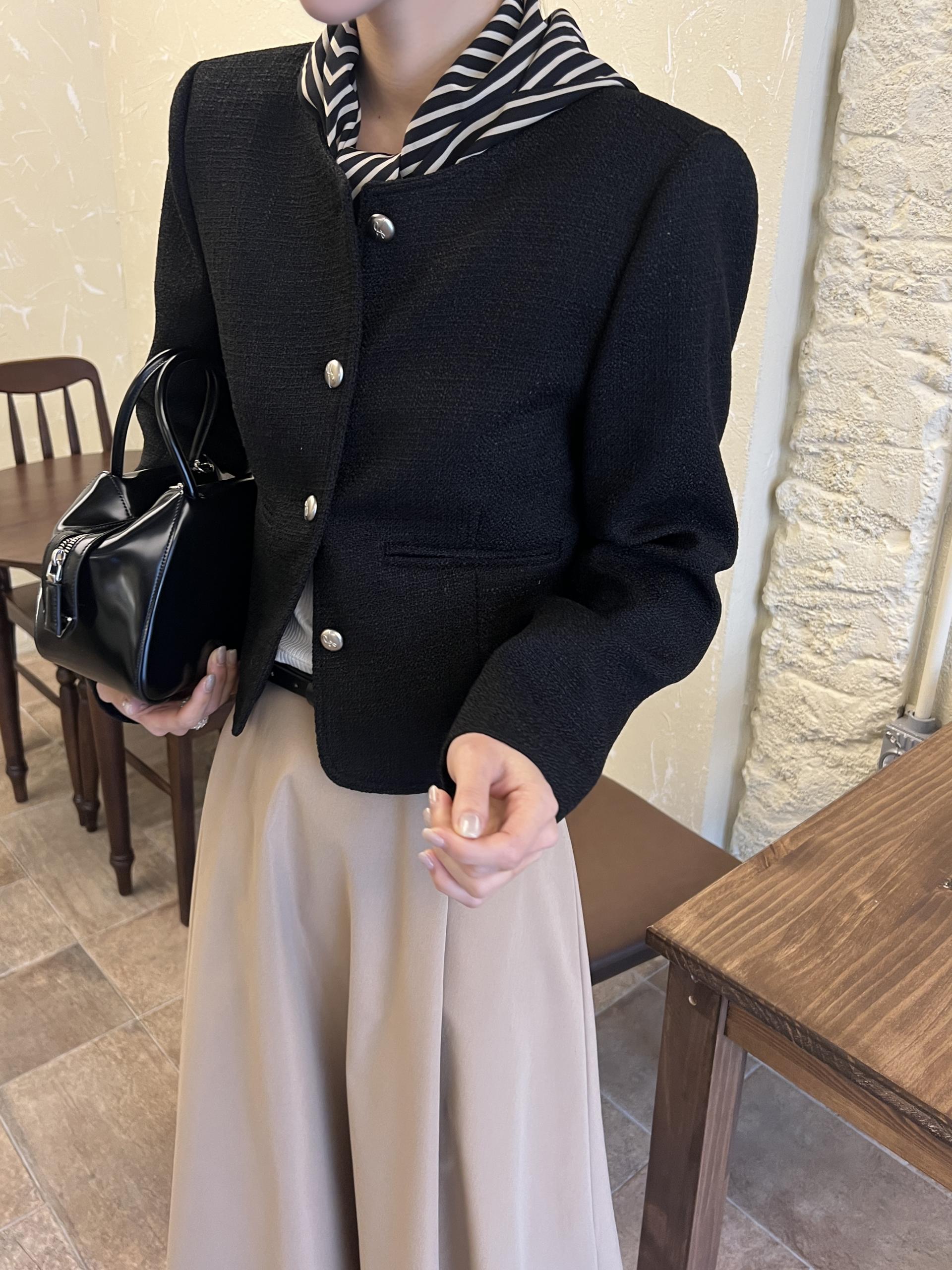 세련된 은장 단추, 깔끔한 포켓 라인, 배꼽을 넘기는 기본 기장과 너무 타이트하지도 루즈하지도 않은 기본 핏으로 유행 없이 오래 착용하기 좋은 트위드 자켓입니다.