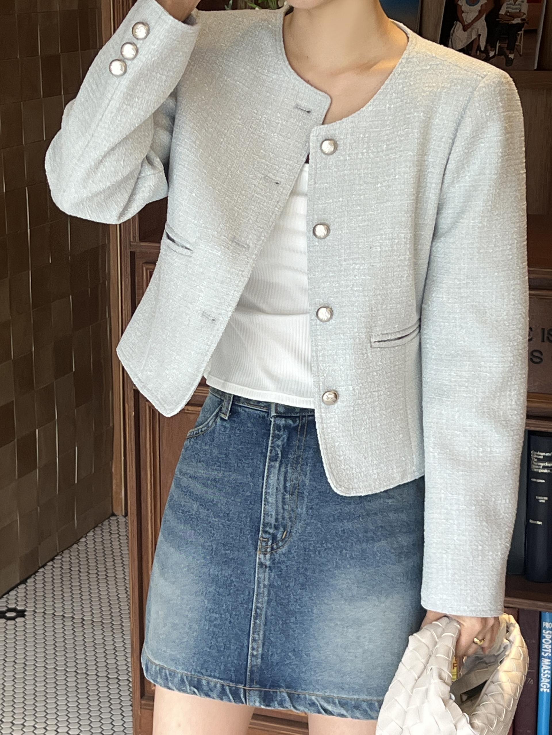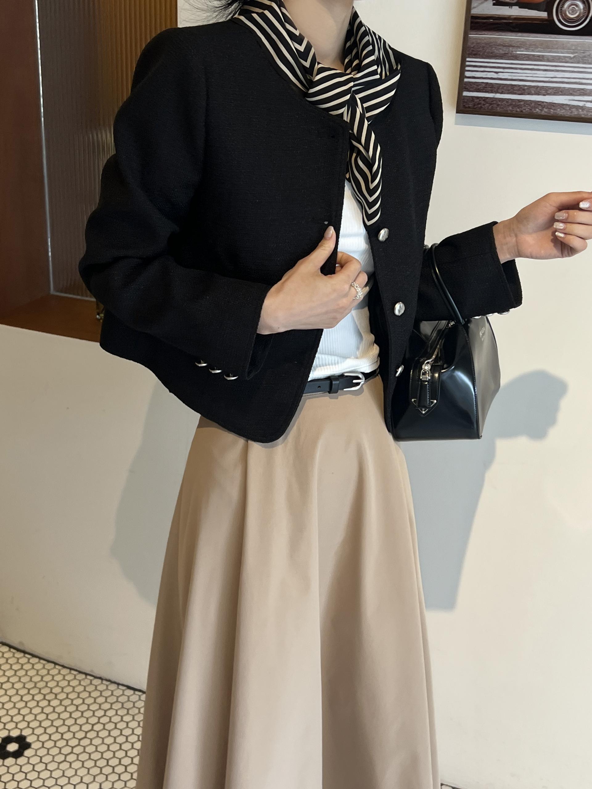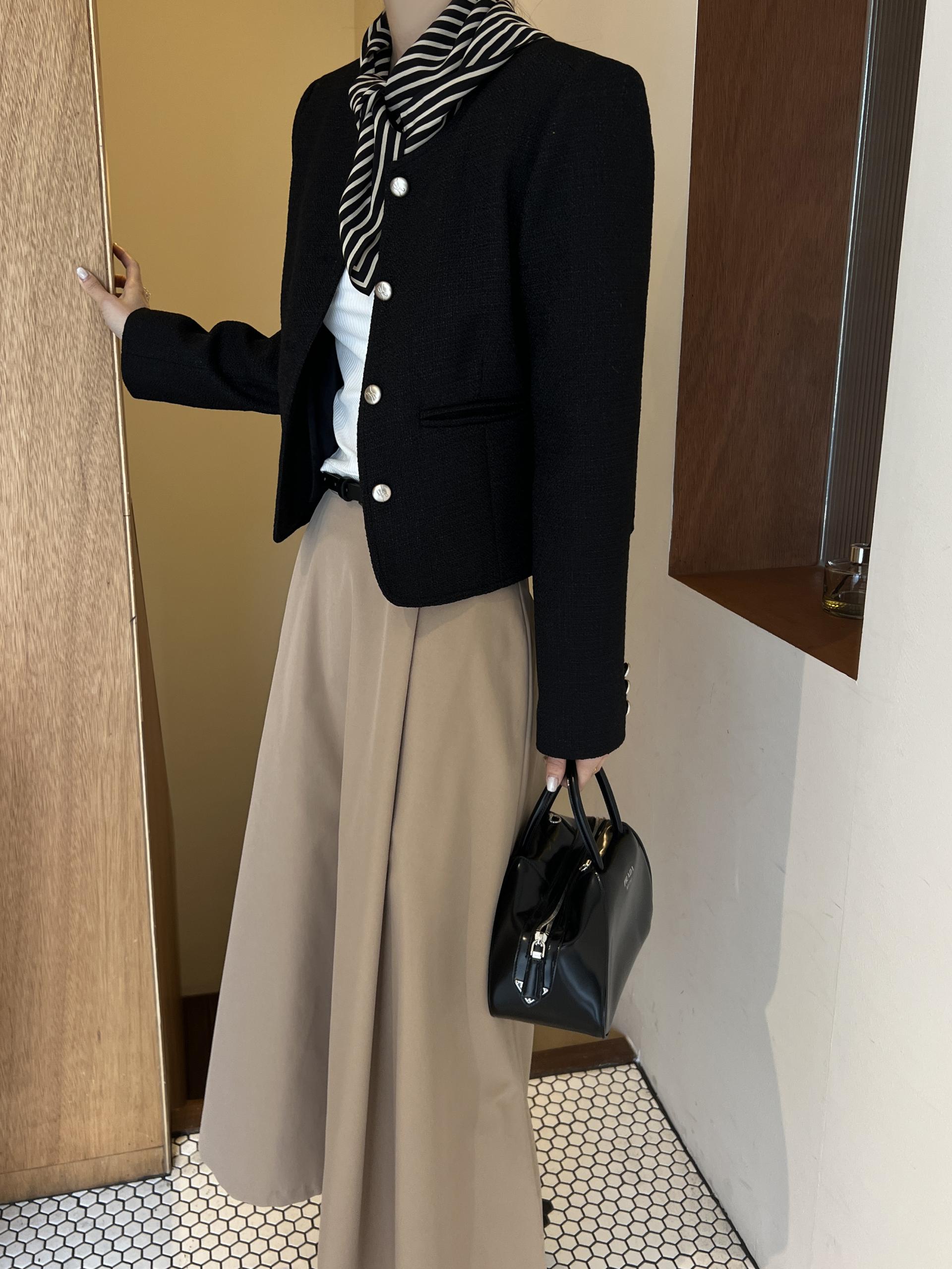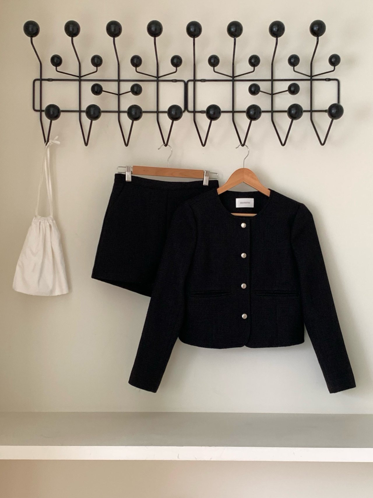 세련된 은장 단추, 깔끔한 포켓 라인, 배꼽을 넘기는 기본 기장과 너무 타이트하지도 루즈하지도 않은 기본 핏으로 유행 없이 오래 착용하기 좋은 트위드 자켓입니다.