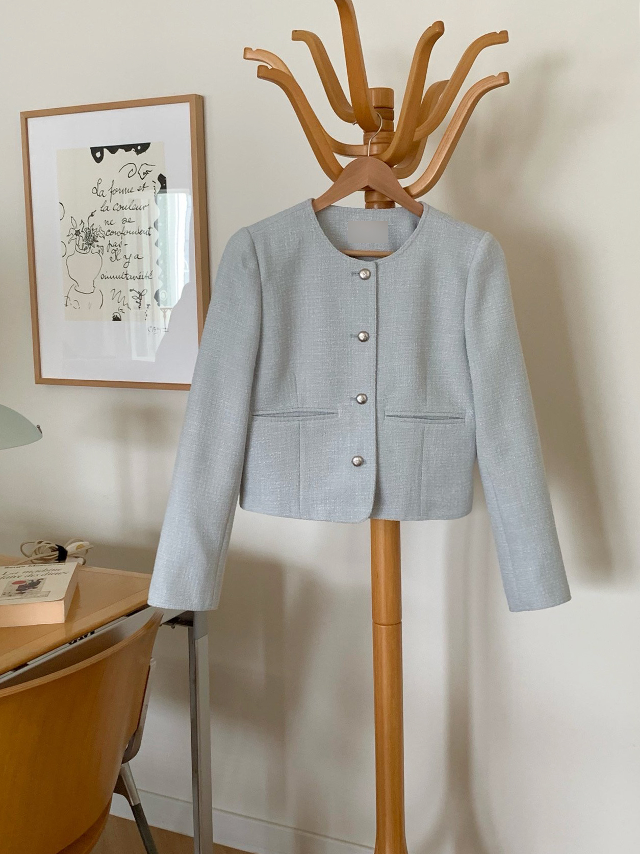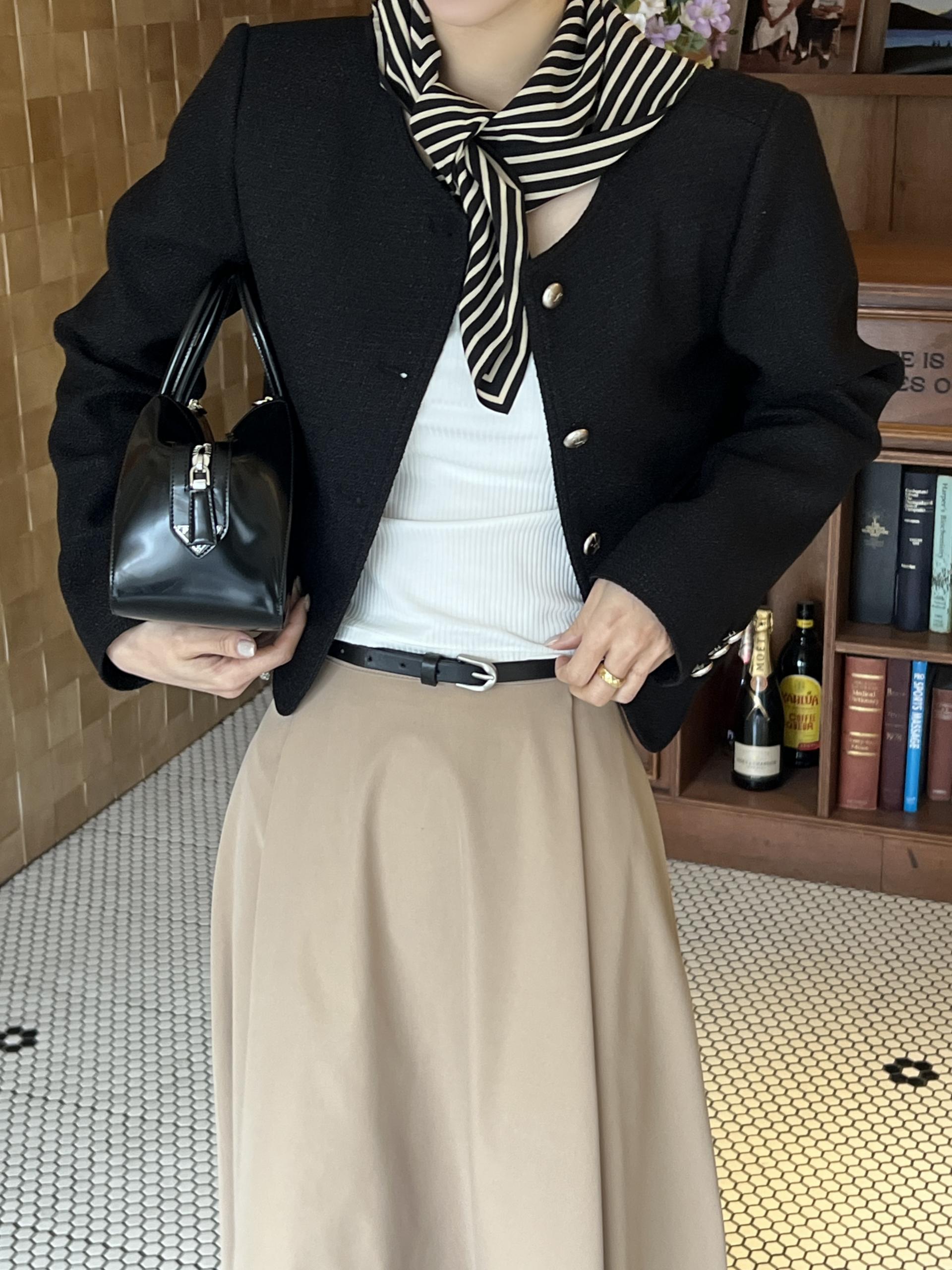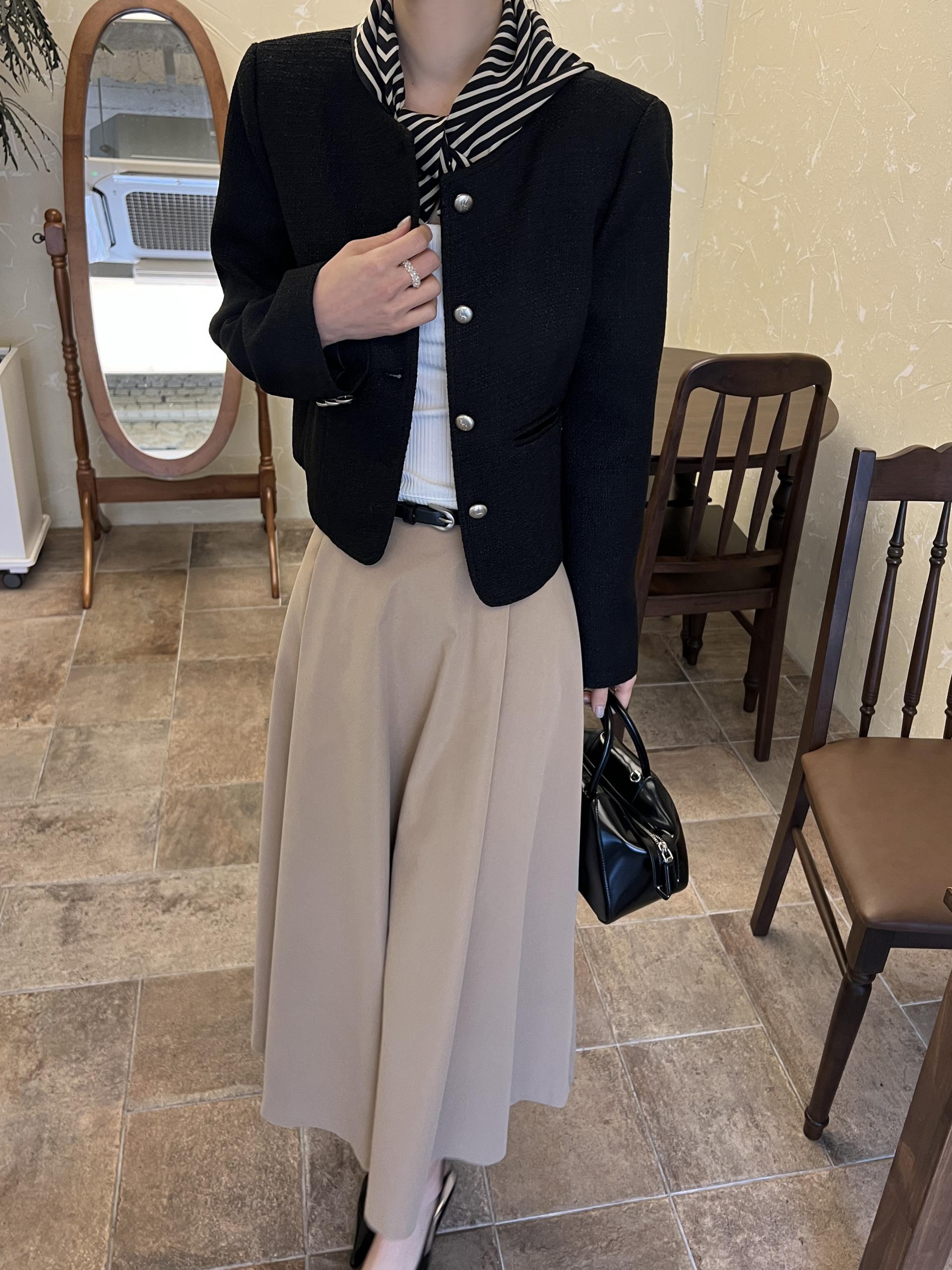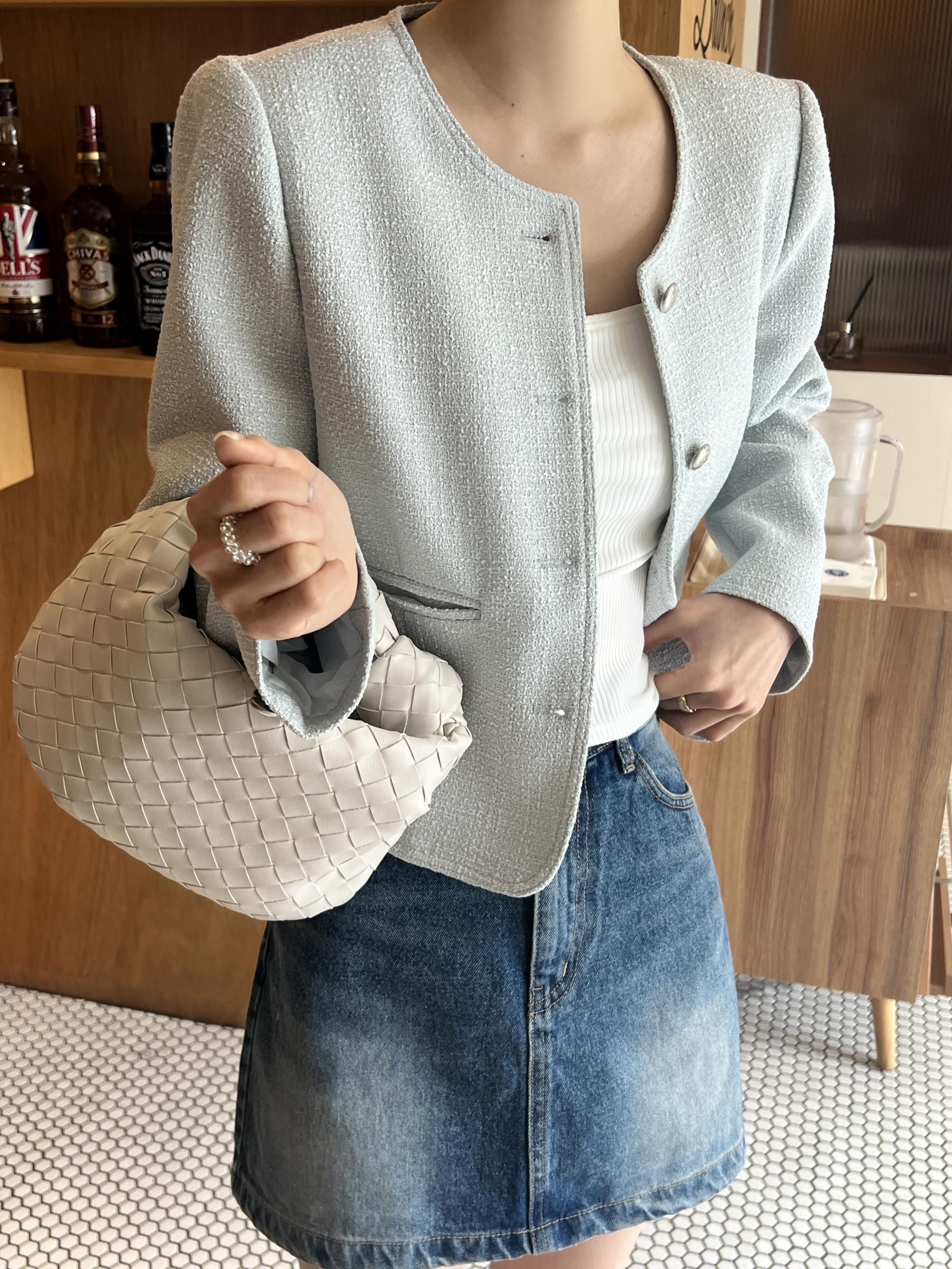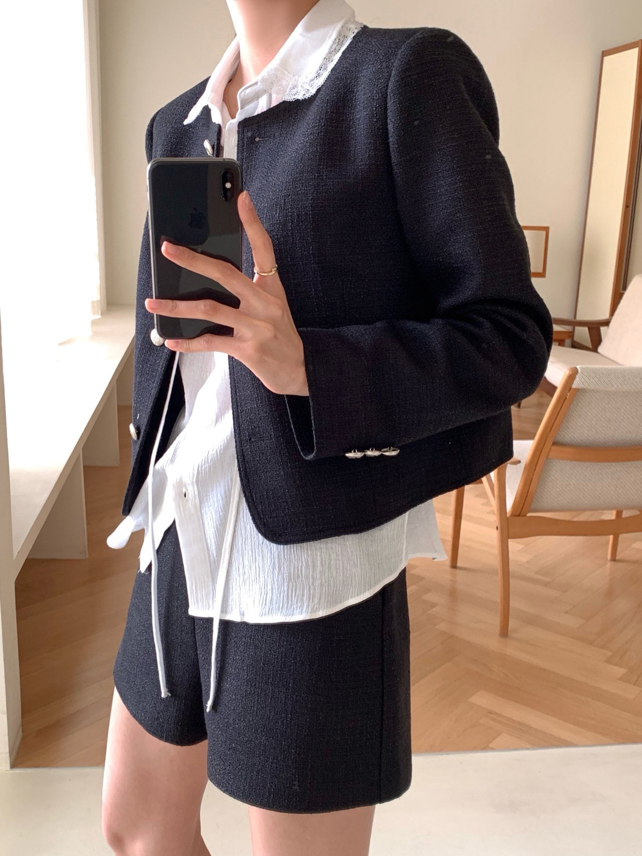 세련된 은장 단추, 깔끔한 포켓 라인, 배꼽을 넘기는 기본 기장과 너무 타이트하지도 루즈하지도 않은 기본 핏으로 유행 없이 오래 착용하기 좋은 트위드 자켓입니다.
