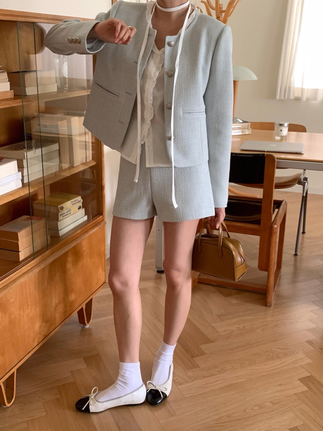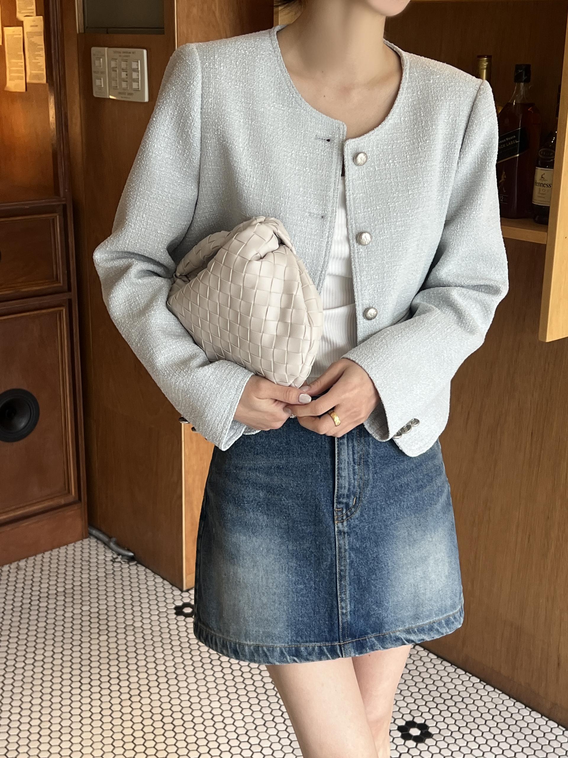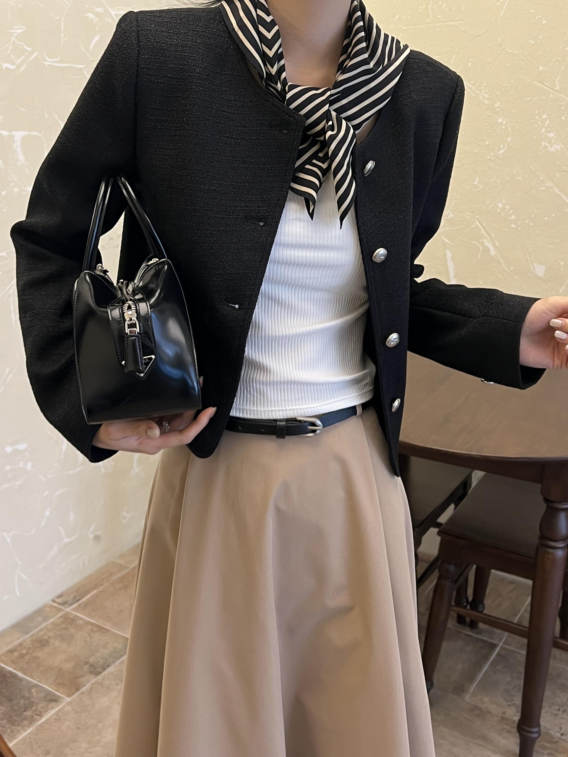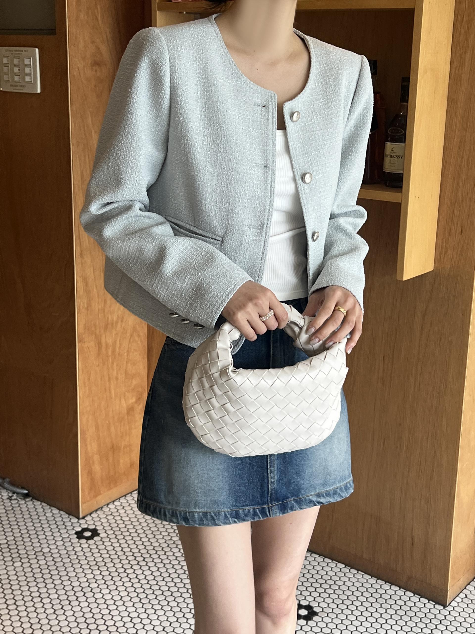 세련된 은장 단추, 깔끔한 포켓 라인, 배꼽을 넘기는 기본 기장과 너무 타이트하지도 루즈하지도 않은 기본 핏으로 유행 없이 오래 착용하기 좋은 트위드 자켓입니다.