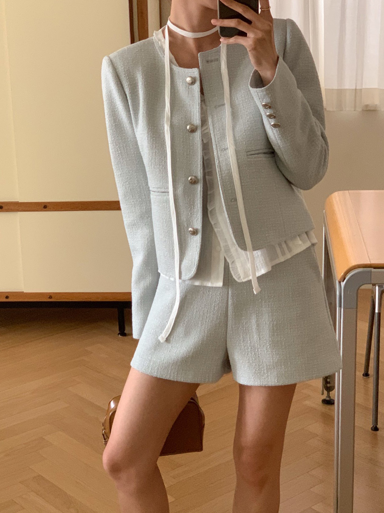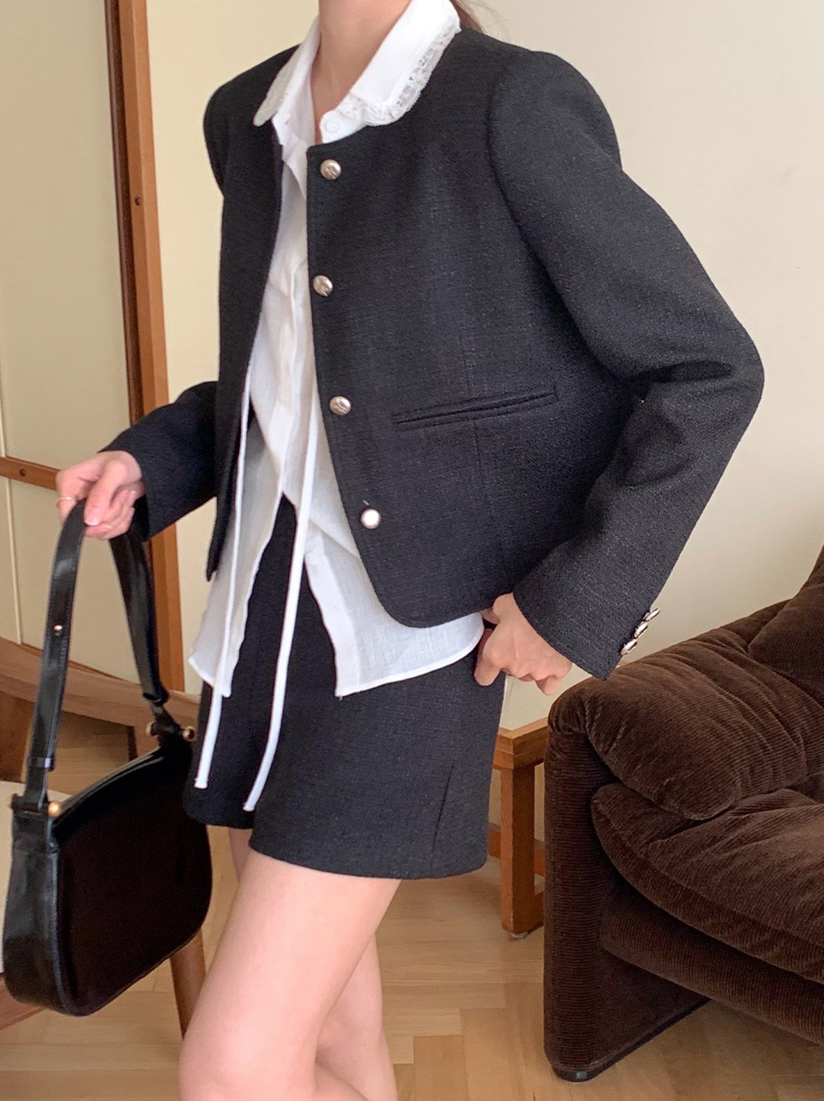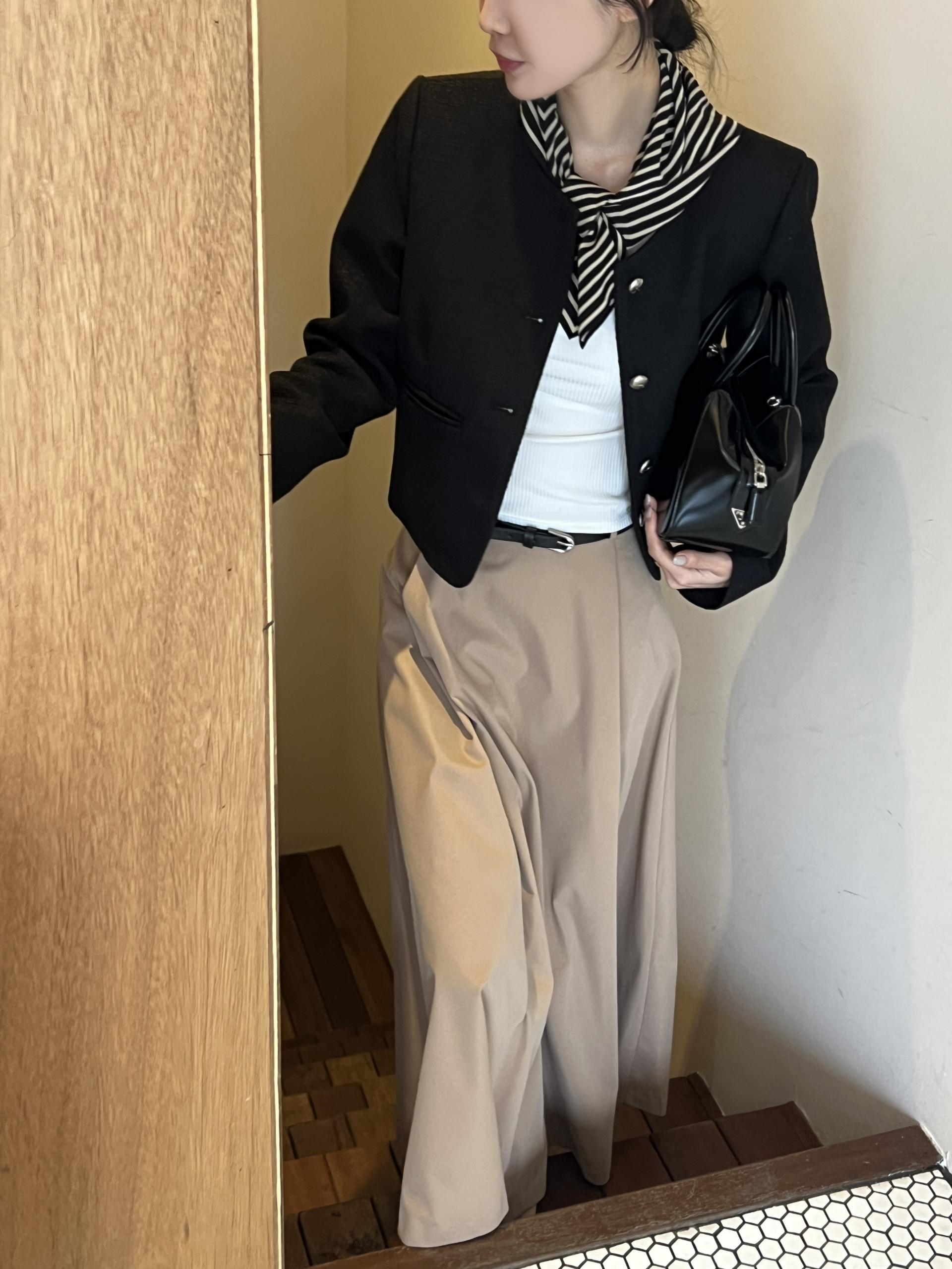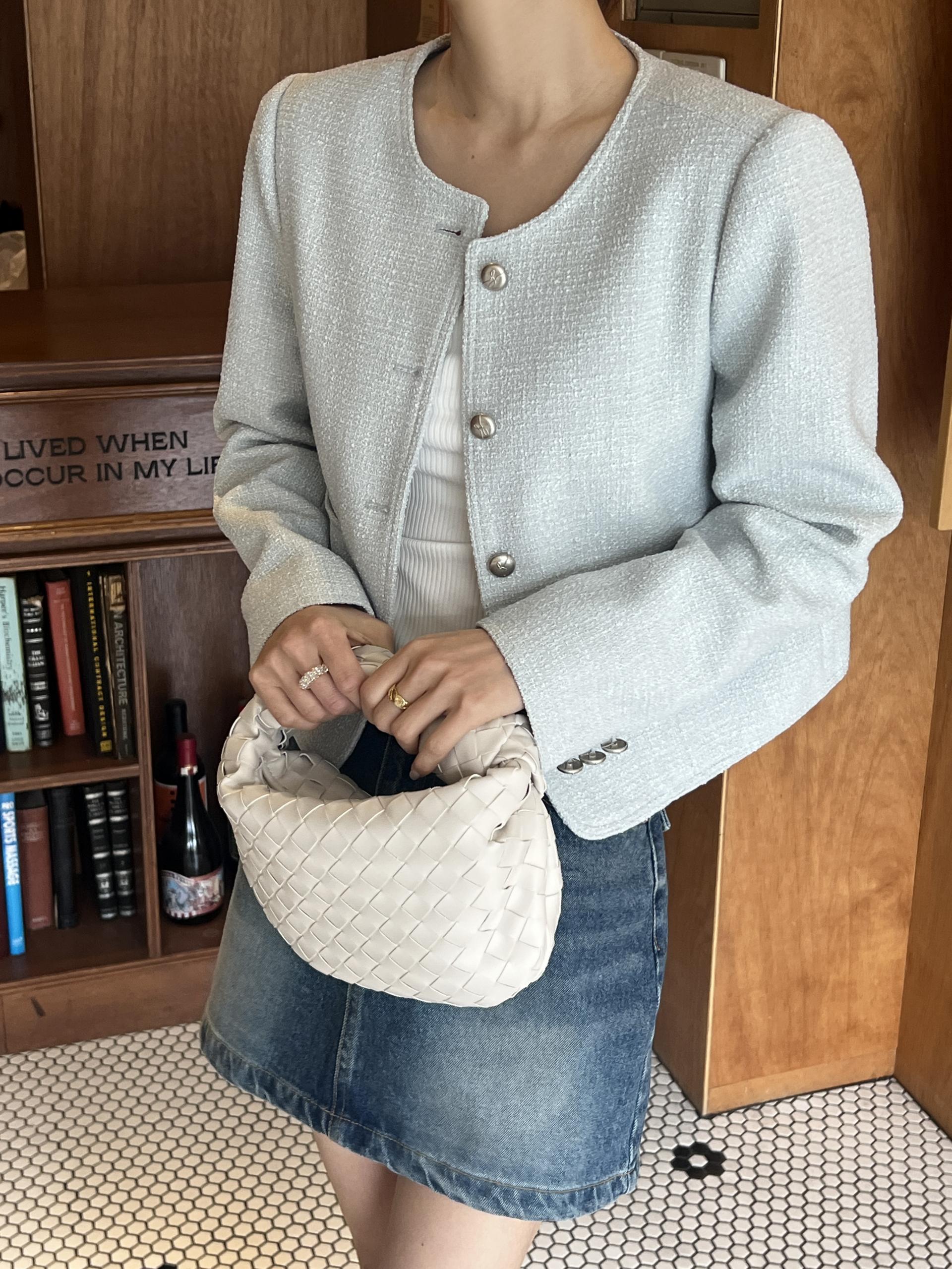 세련된 은장 단추, 깔끔한 포켓 라인, 배꼽을 넘기는 기본 기장과 너무 타이트하지도 루즈하지도 않은 기본 핏으로 유행 없이 오래 착용하기 좋은 트위드 자켓입니다.