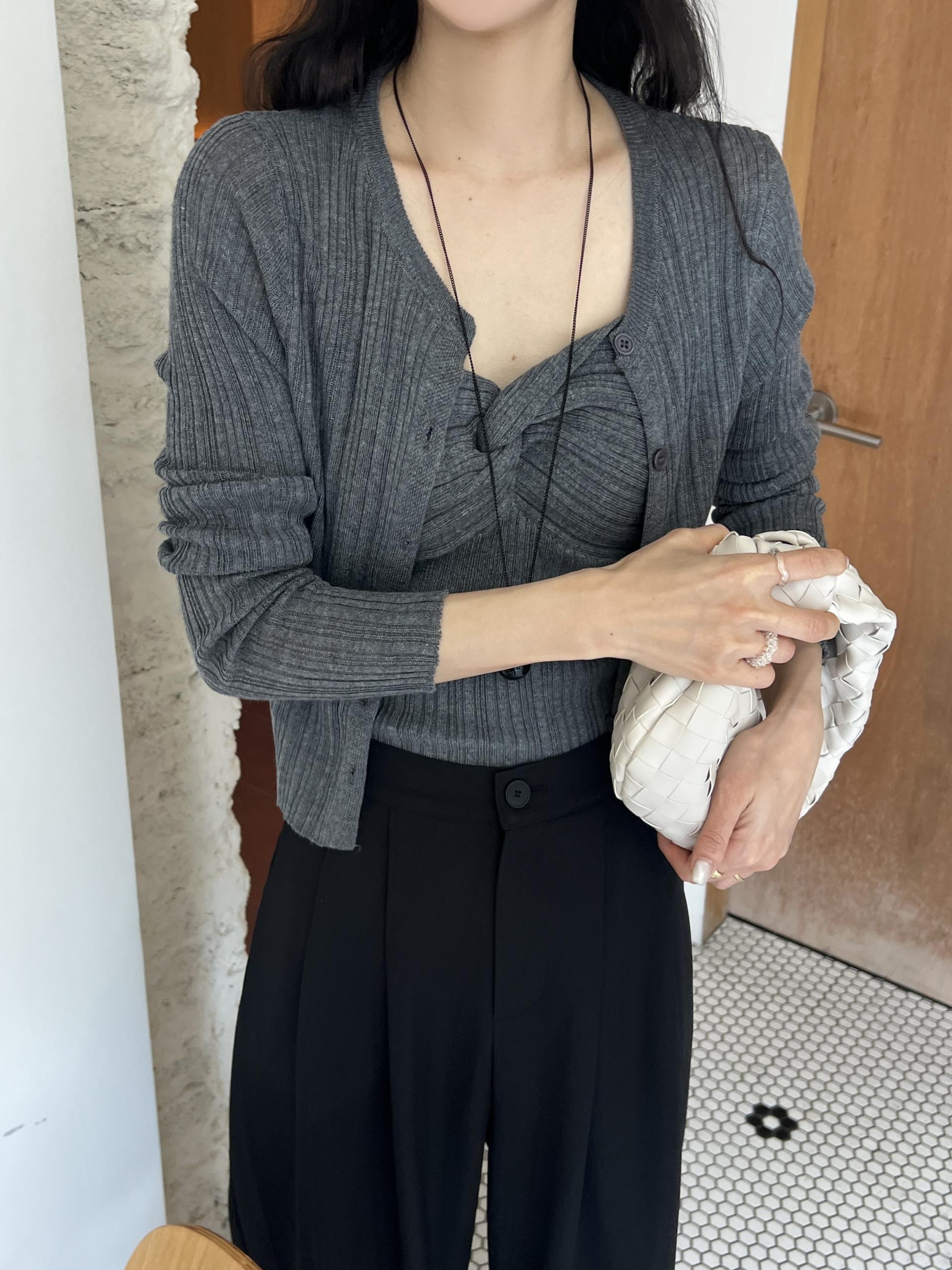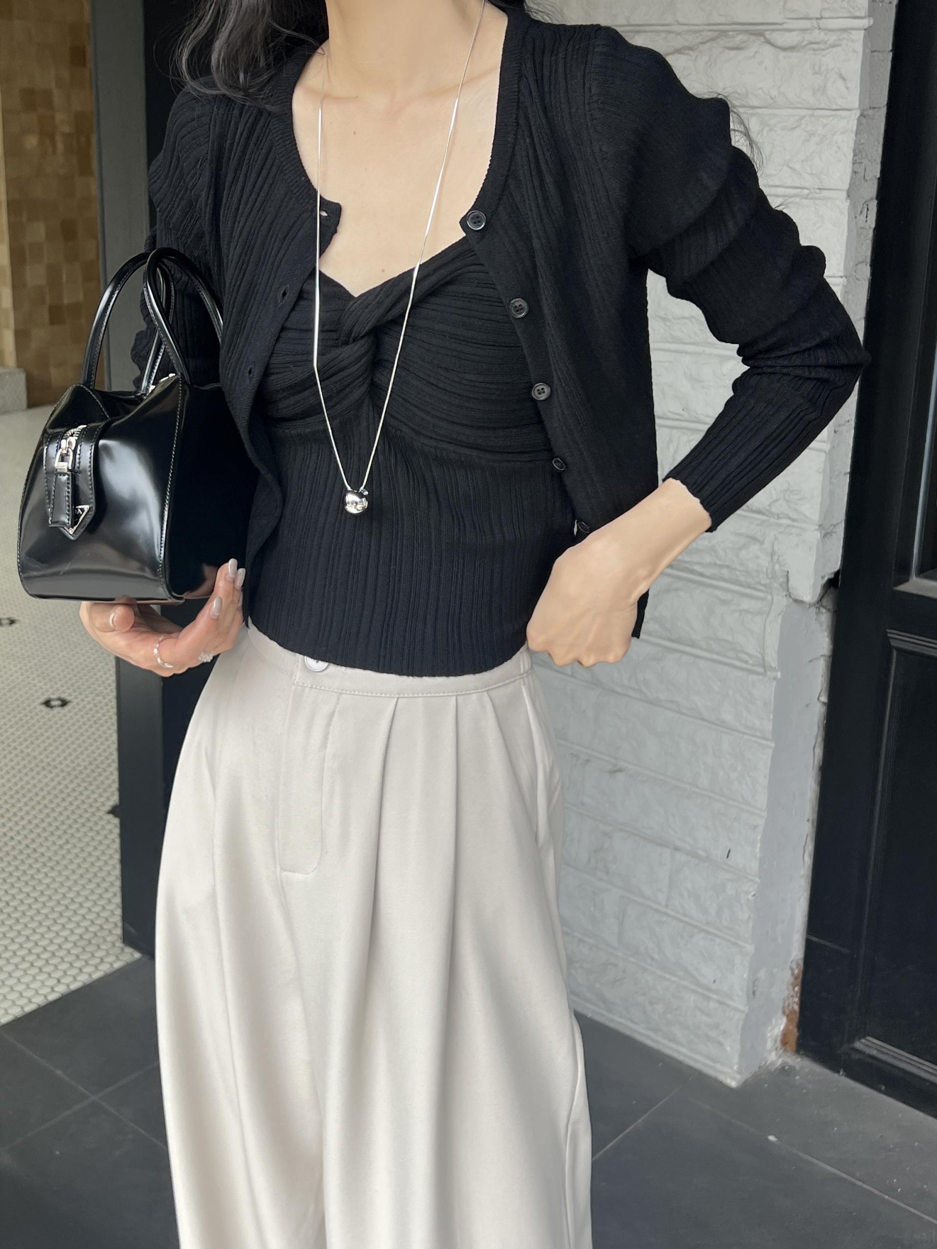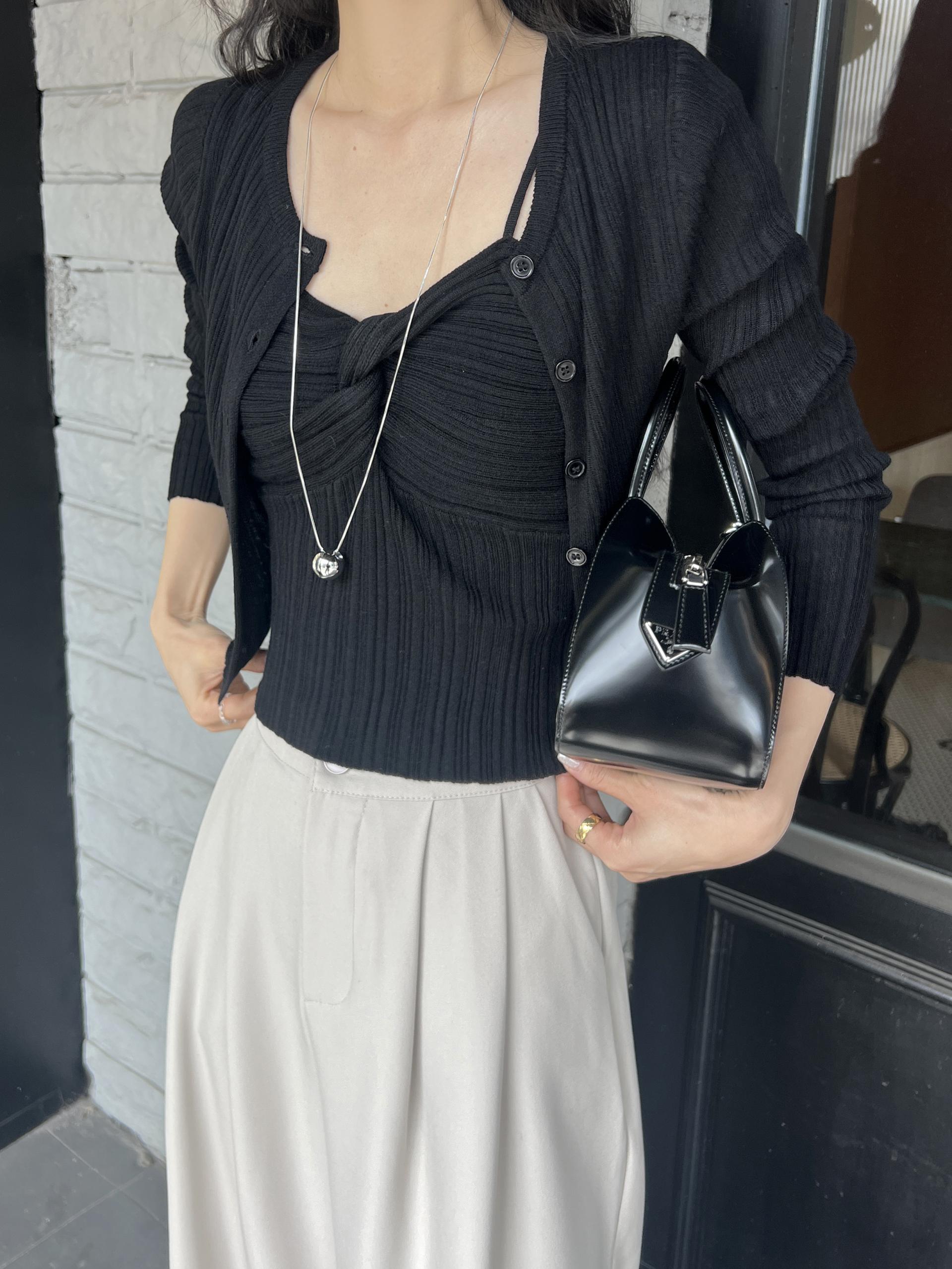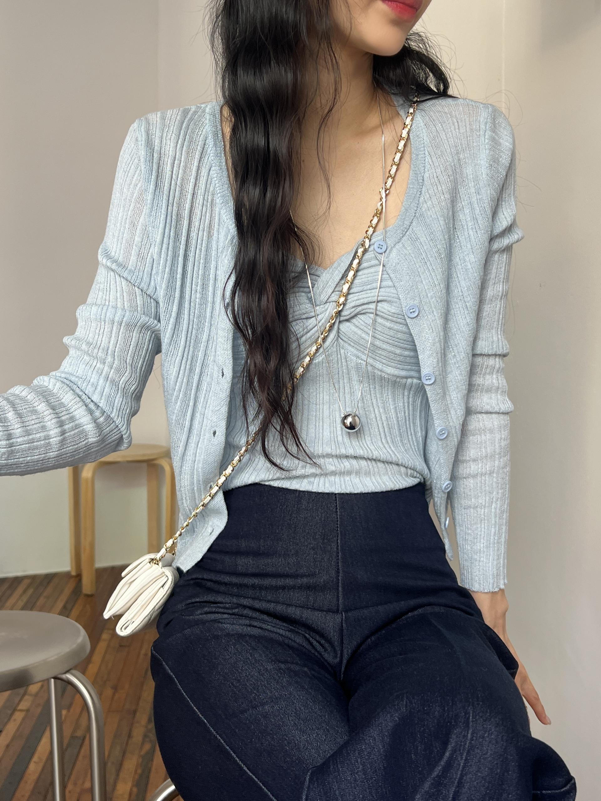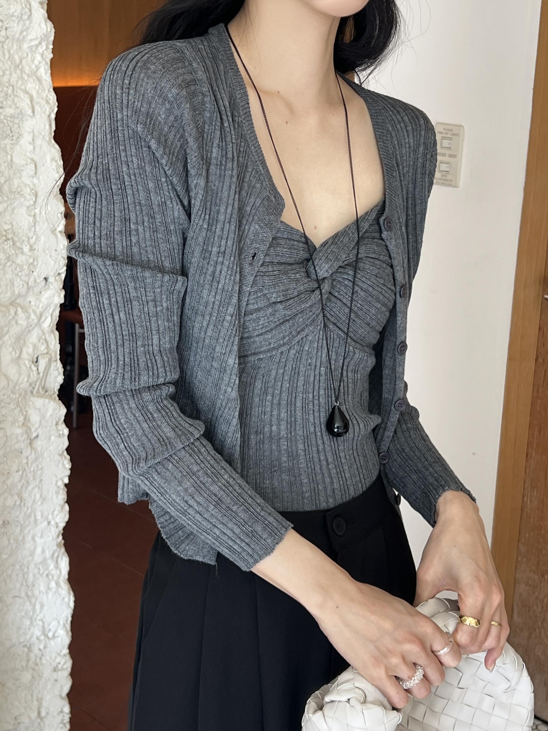 하트넥의 꼬임 골지 나시와 여리여리핏의 라운드넥 니트 가디건 세트입니다.