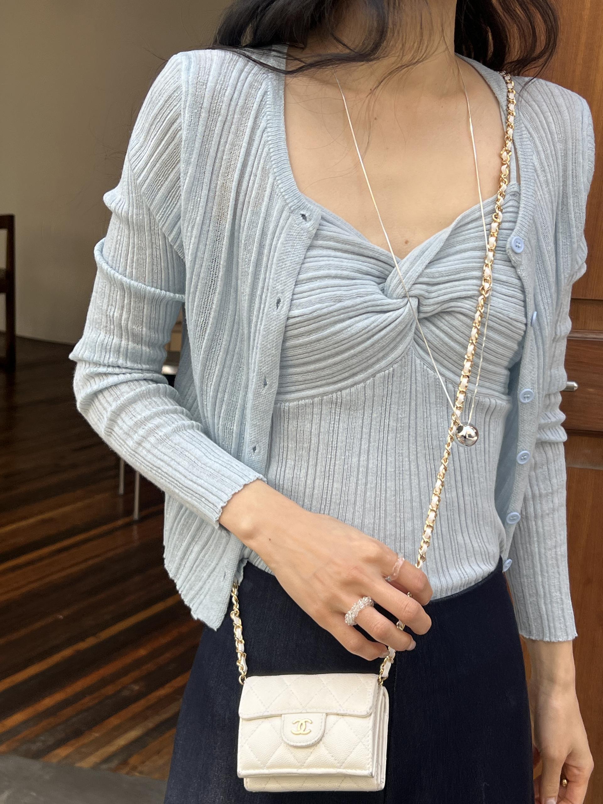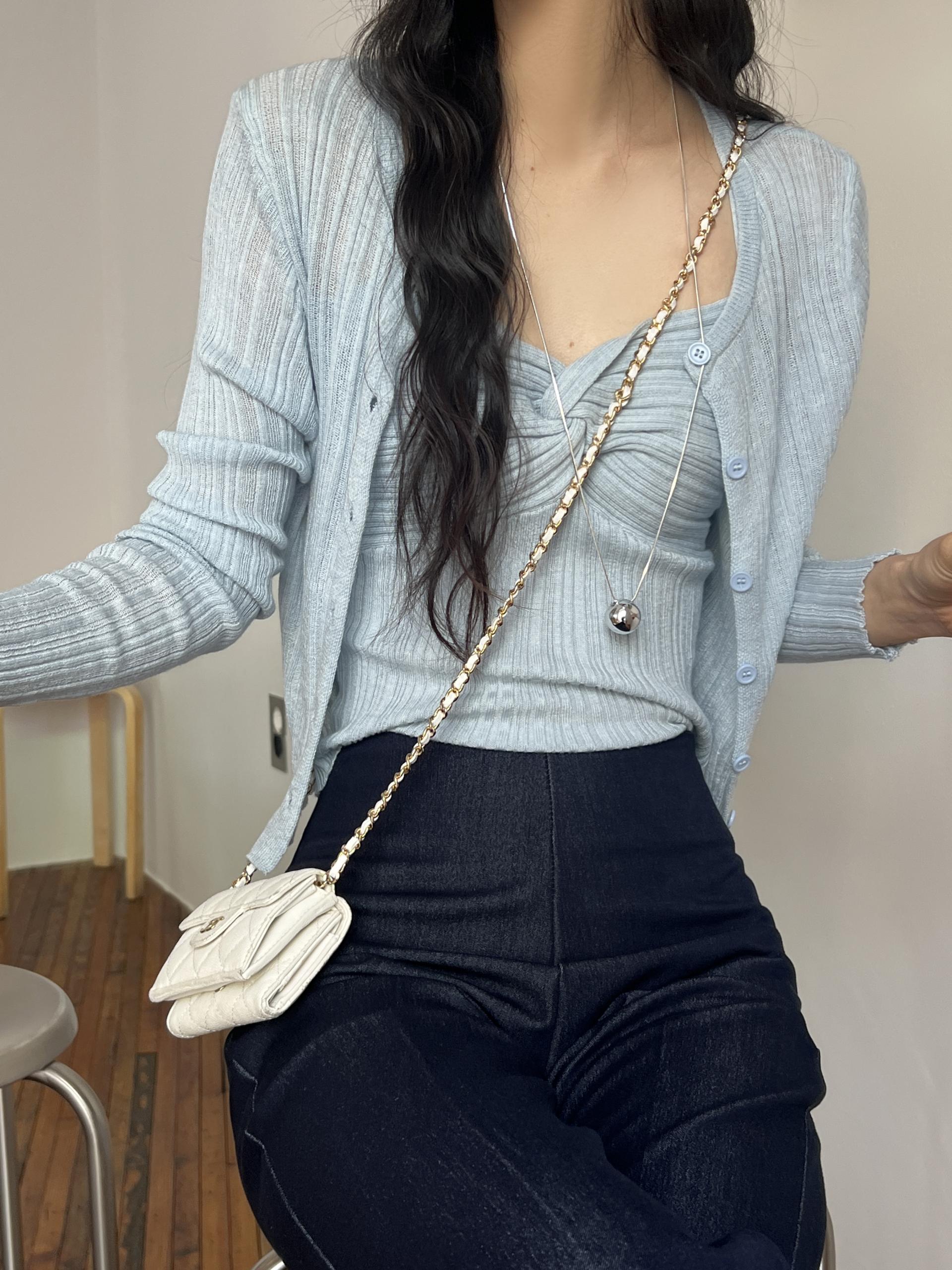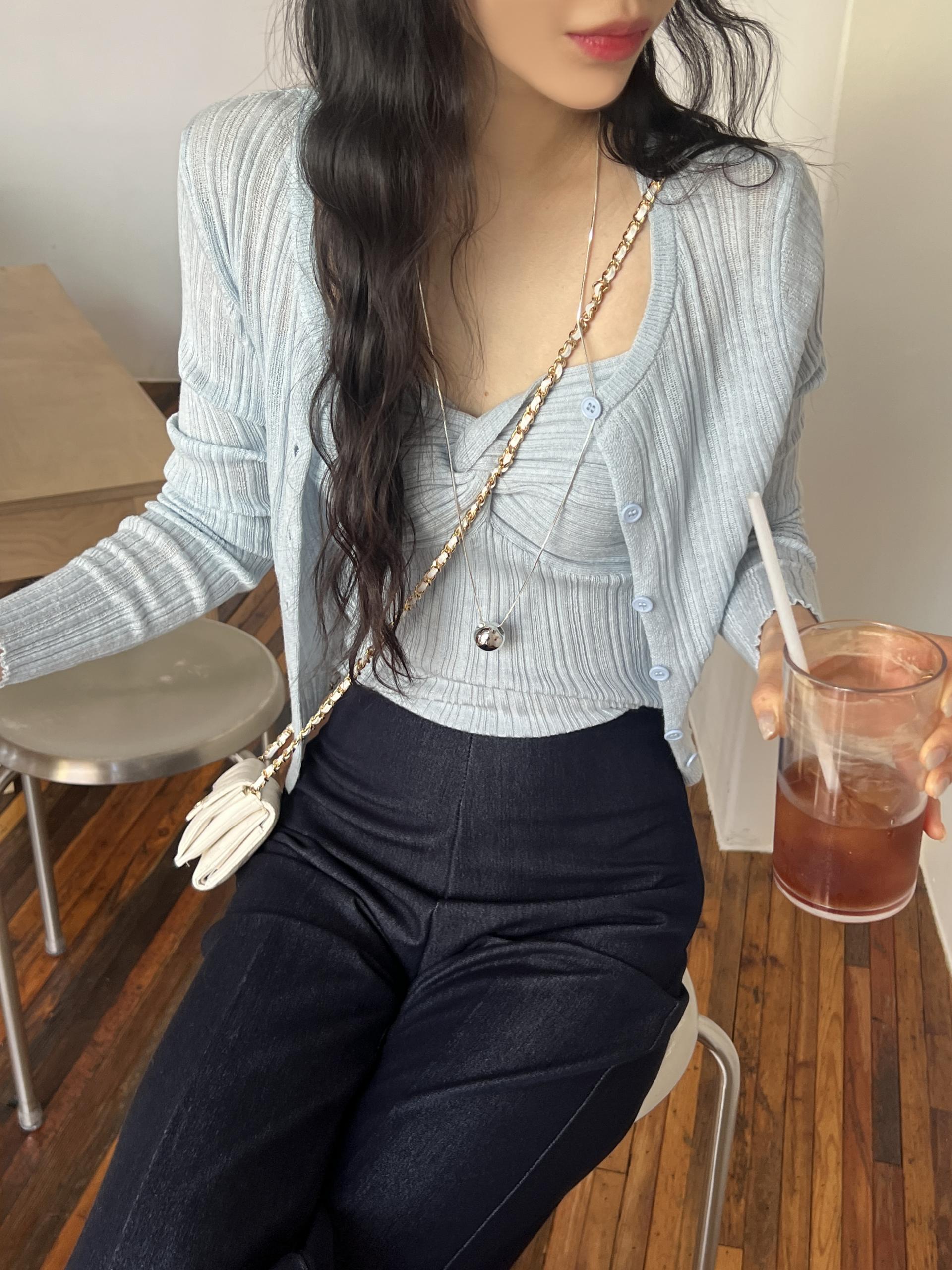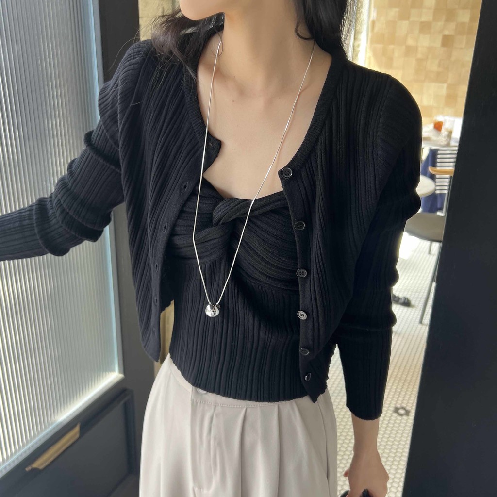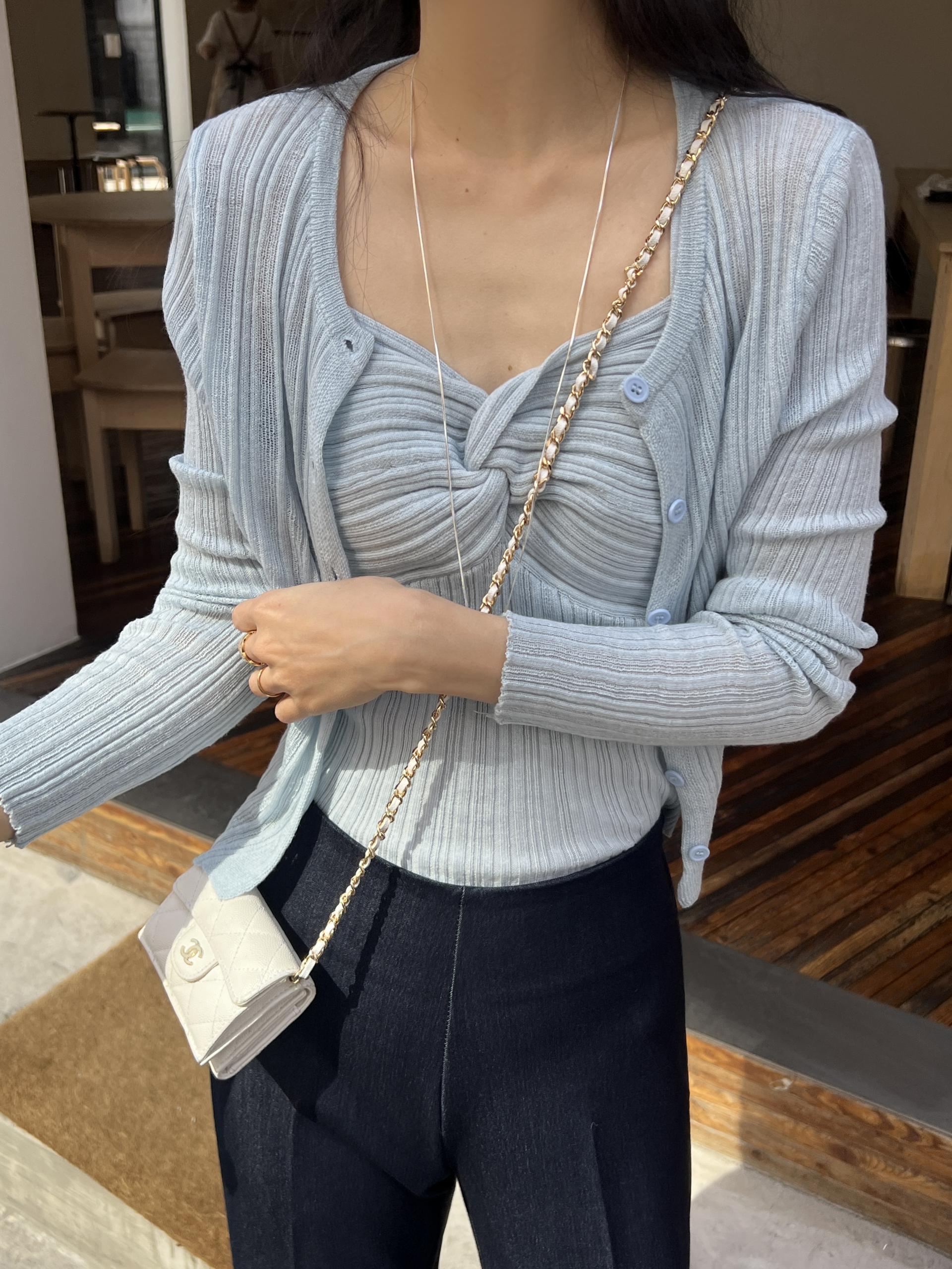 하트넥의 꼬임 골지 나시와 여리여리핏의 라운드넥 니트 가디건 세트입니다.