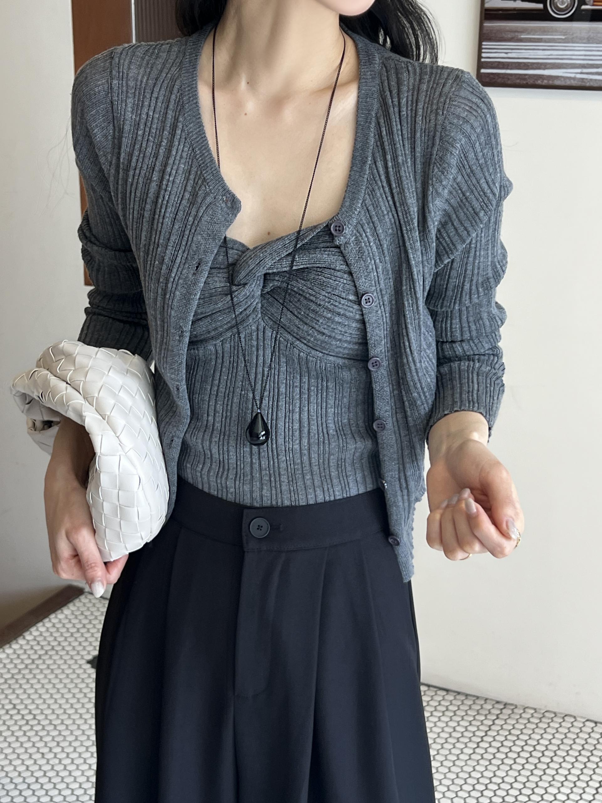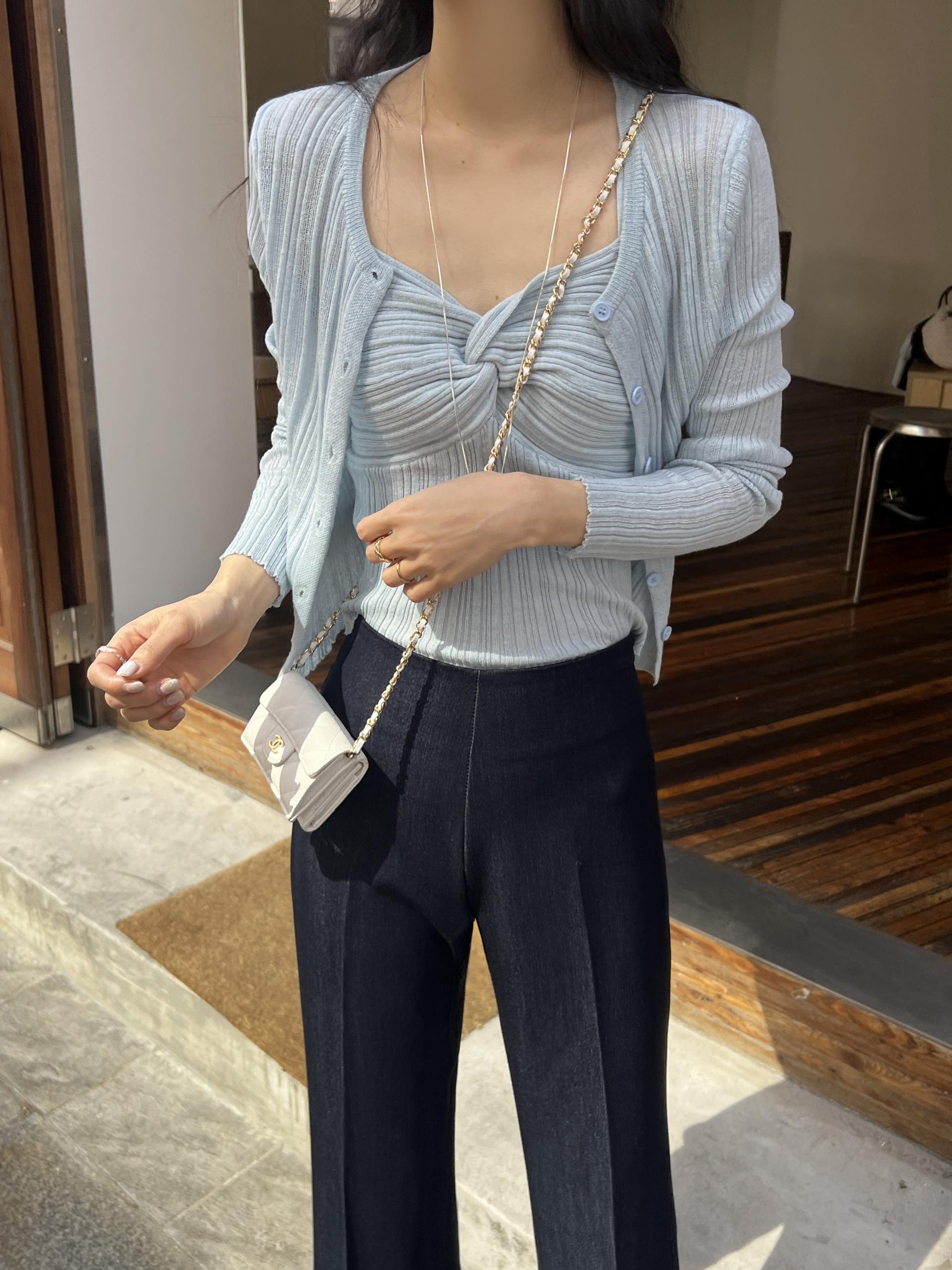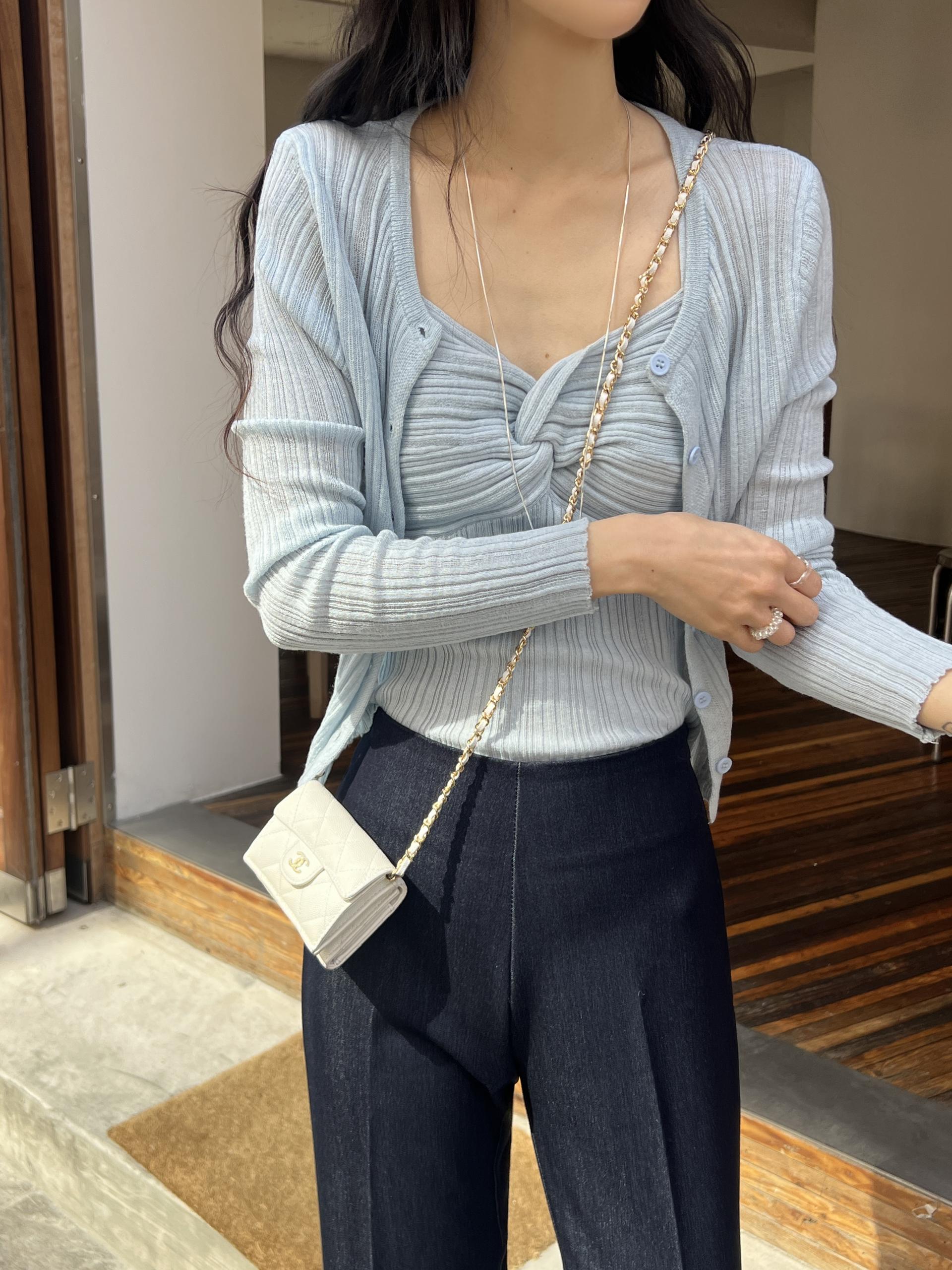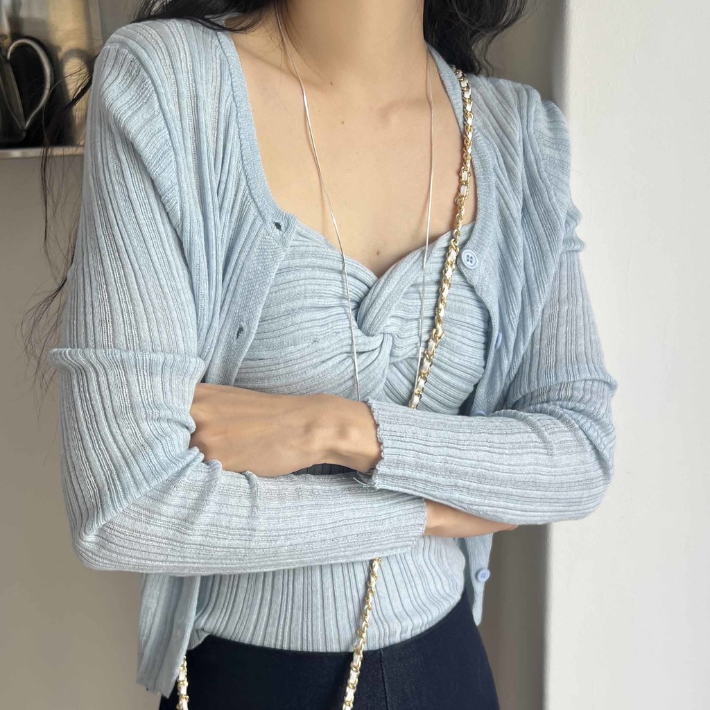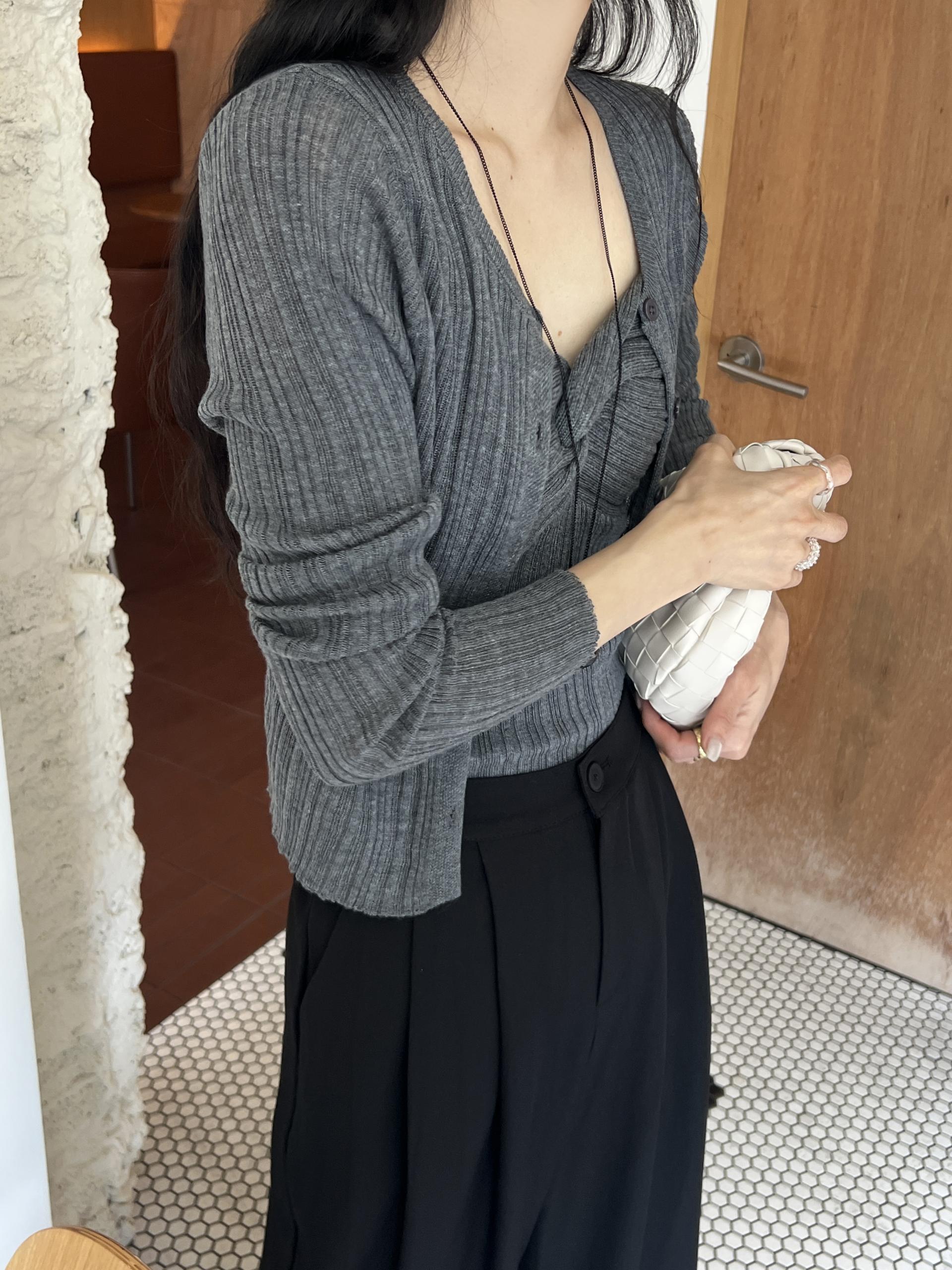 하트넥의 꼬임 골지 나시와 여리여리핏의 라운드넥 니트 가디건 세트입니다.