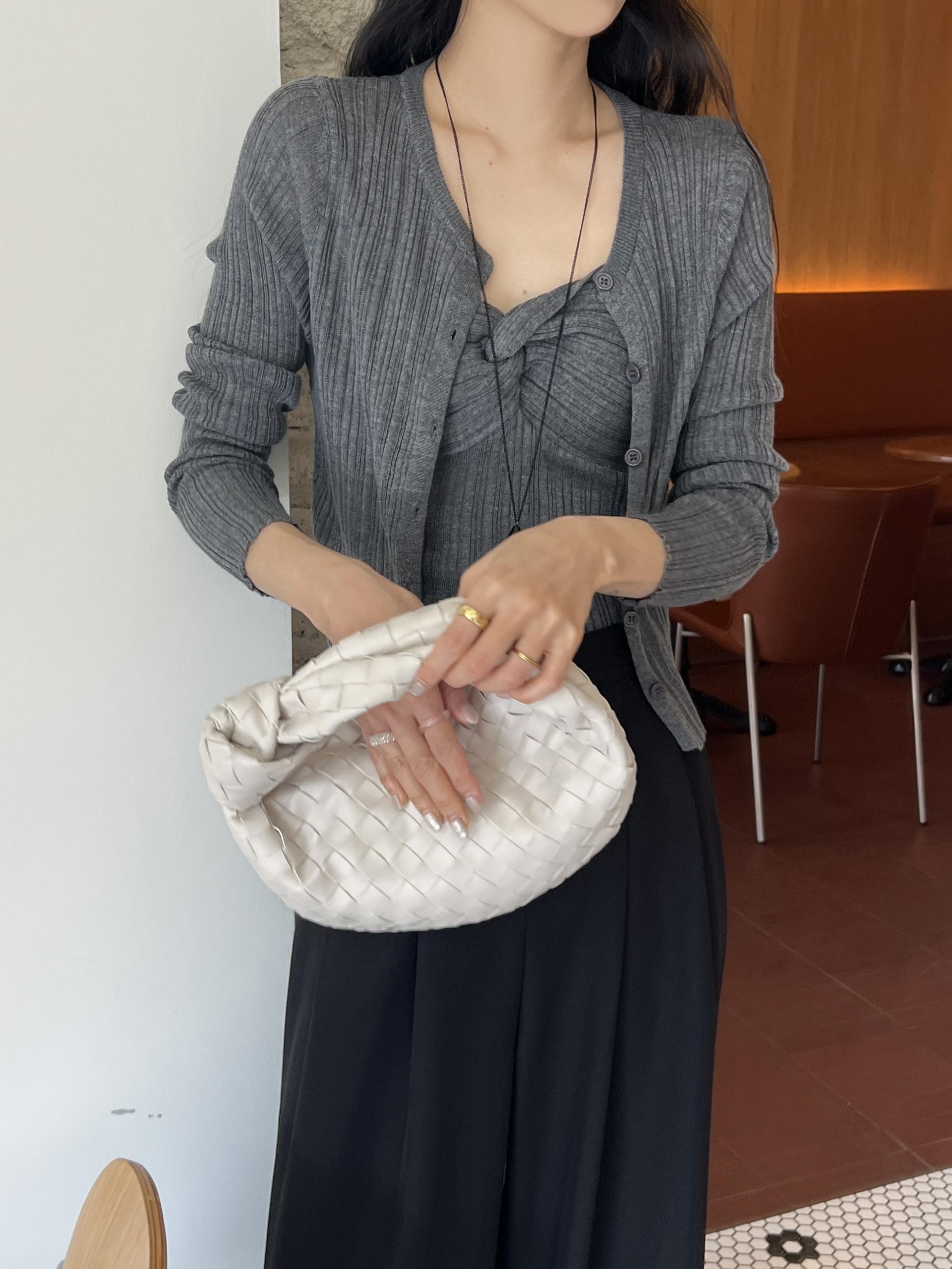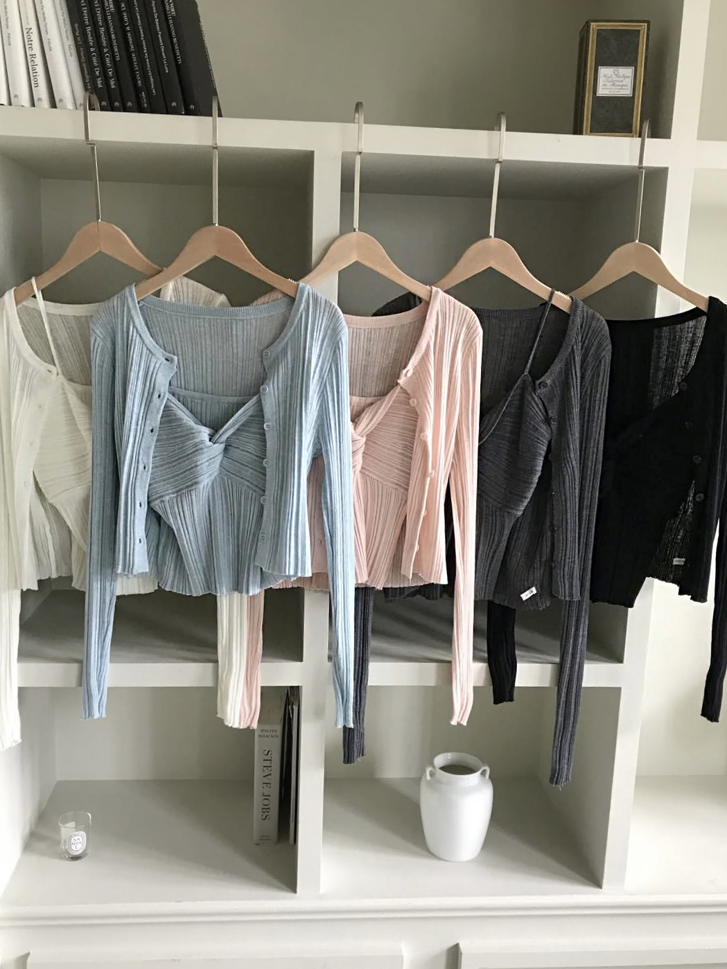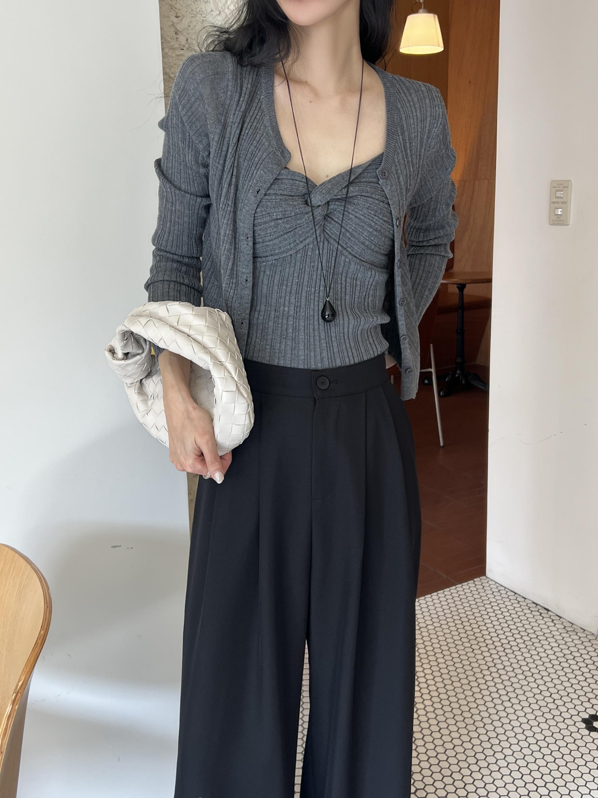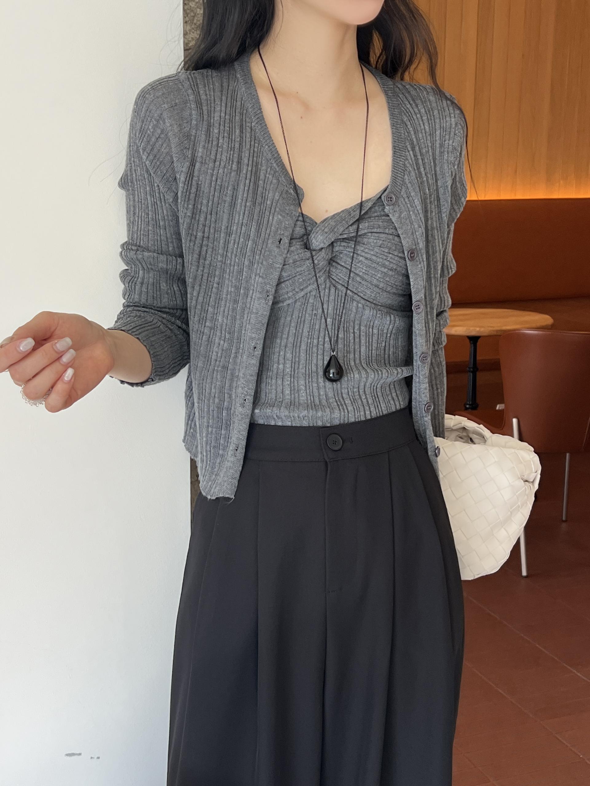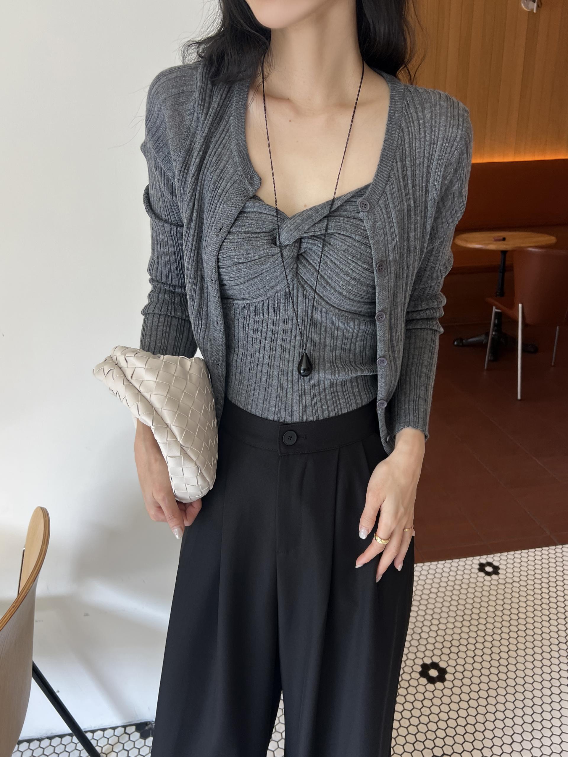 하트넥의 꼬임 골지 나시와 여리여리핏의 라운드넥 니트 가디건 세트입니다.