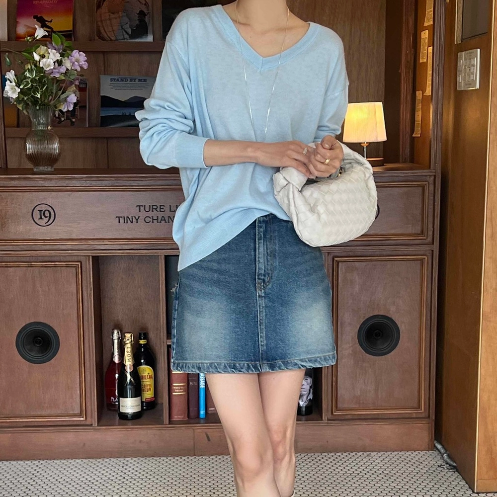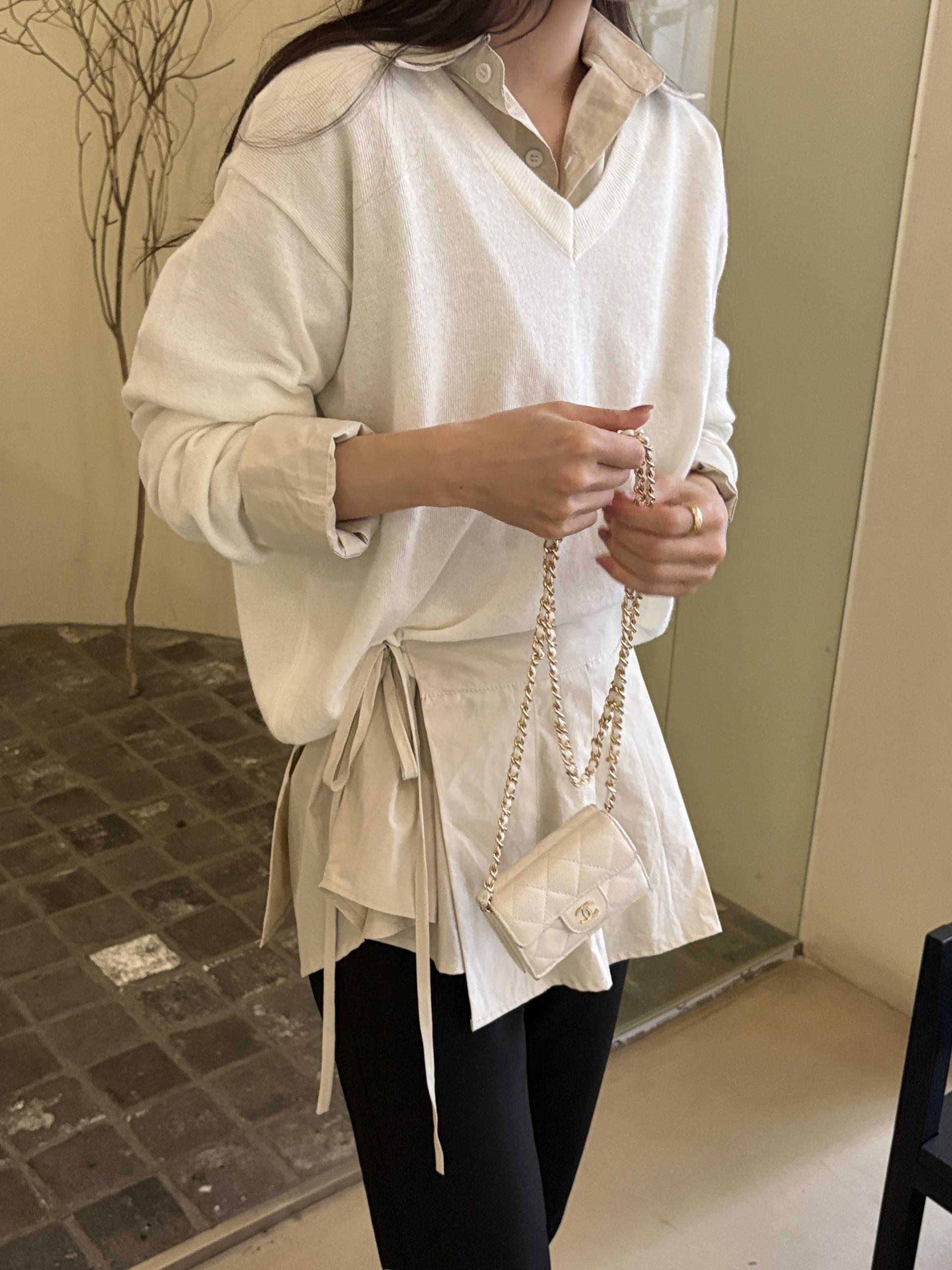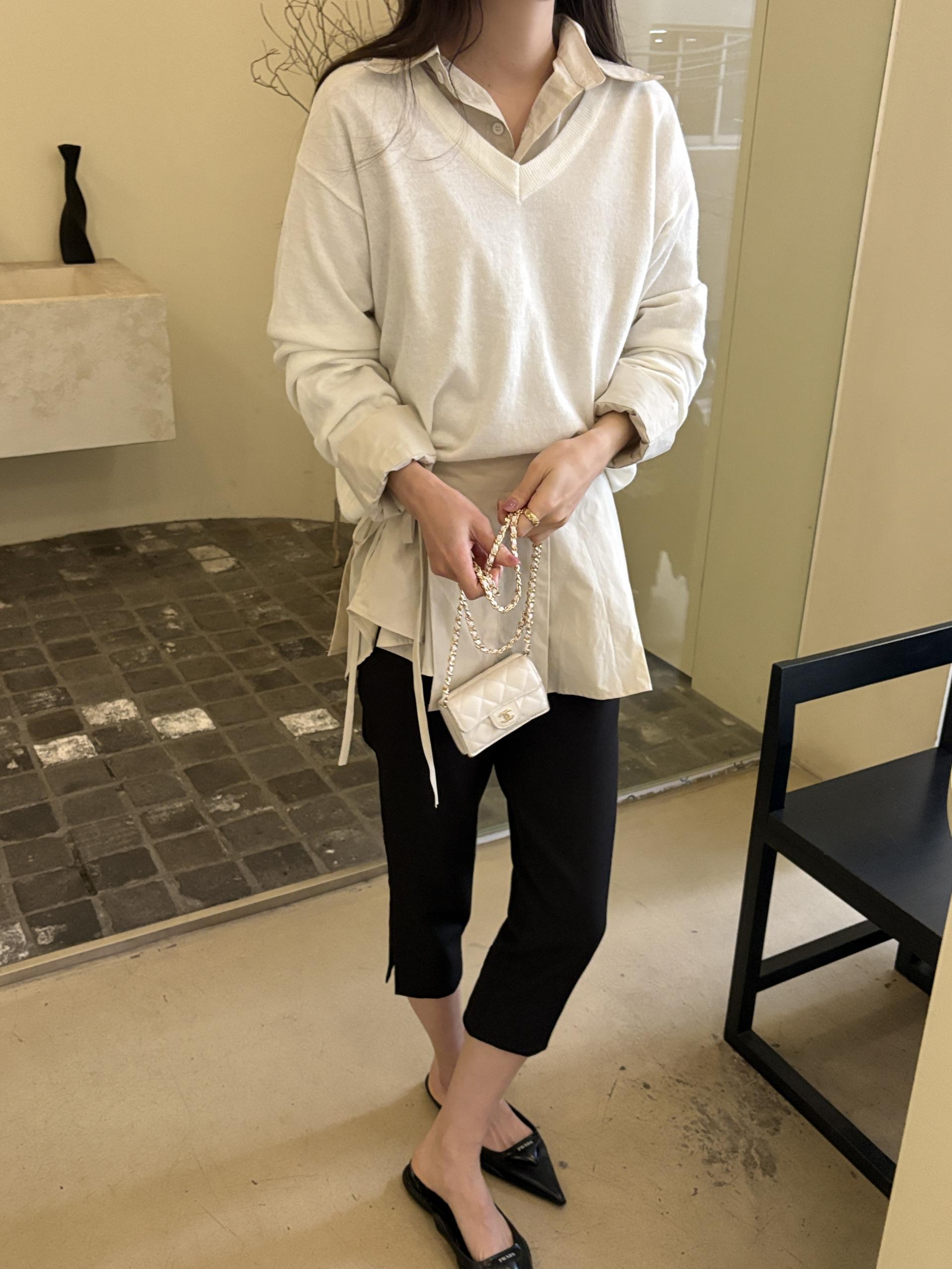 데일리로 편하게 착용하기 좋고, 요즘 유행하는 프릴 아이템 등과 레이어드하기도 좋아요. 브이넥이지만 넥이 너무 파이지 않아 자주 손이 가실 것 같습니다.