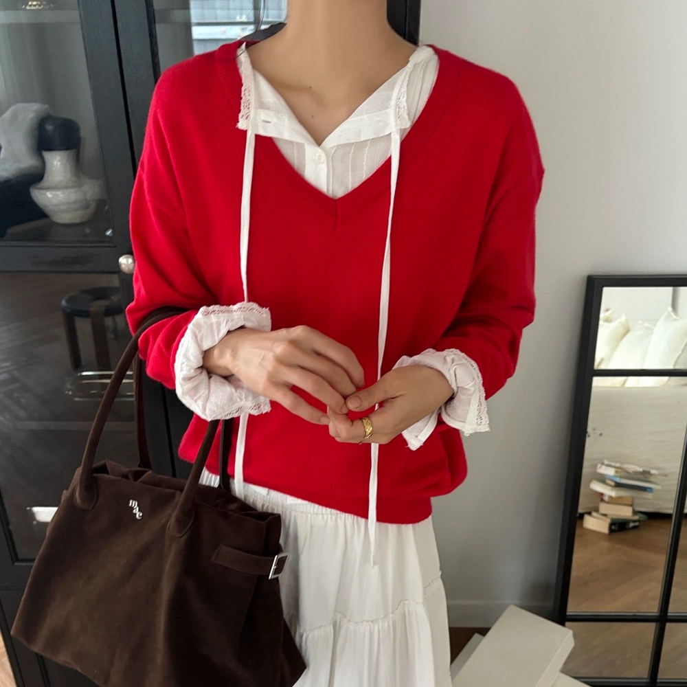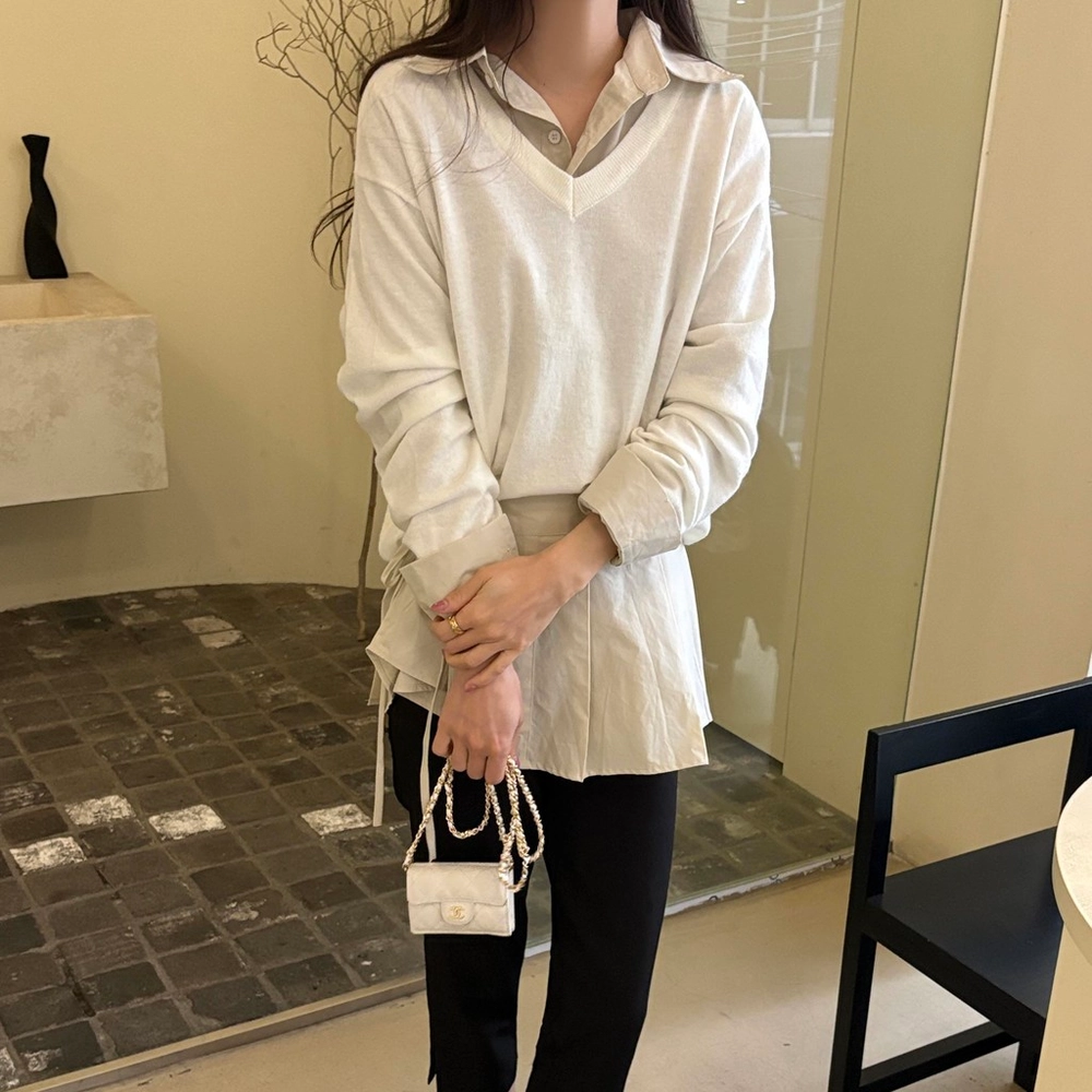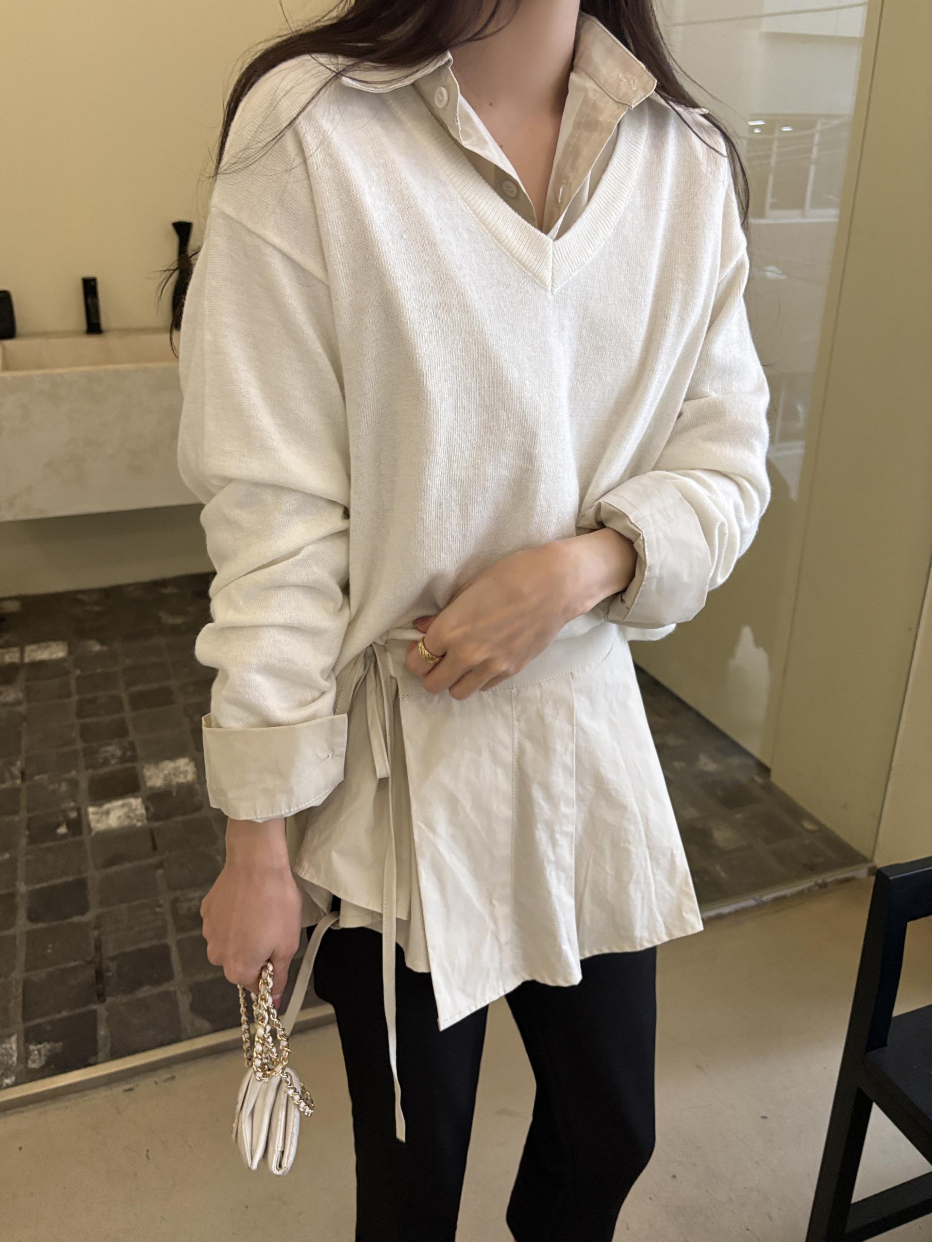 데일리로 편하게 착용하기 좋고, 요즘 유행하는 프릴 아이템 등과 레이어드하기도 좋아요. 브이넥이지만 넥이 너무 파이지 않아 자주 손이 가실 것 같습니다.