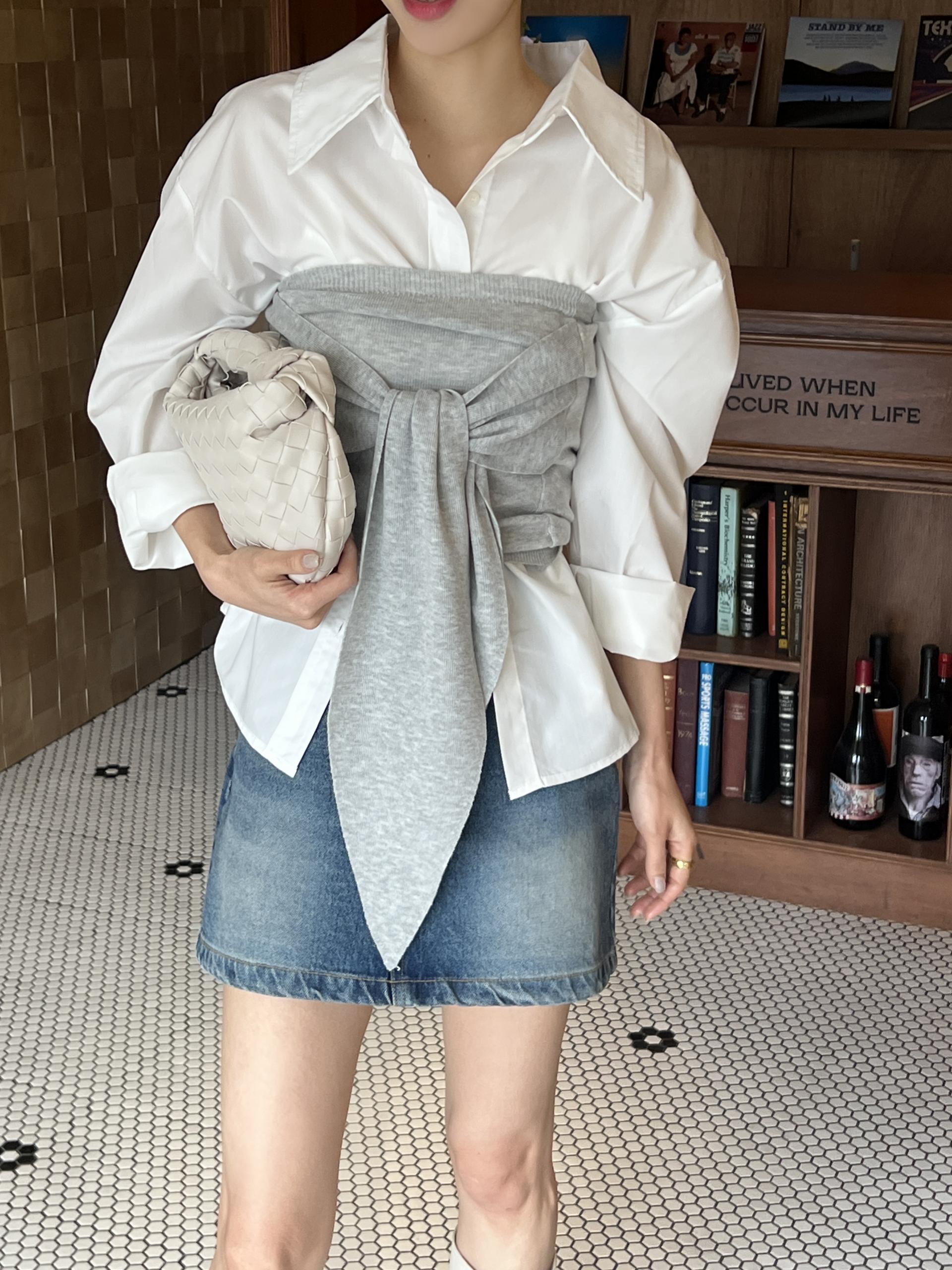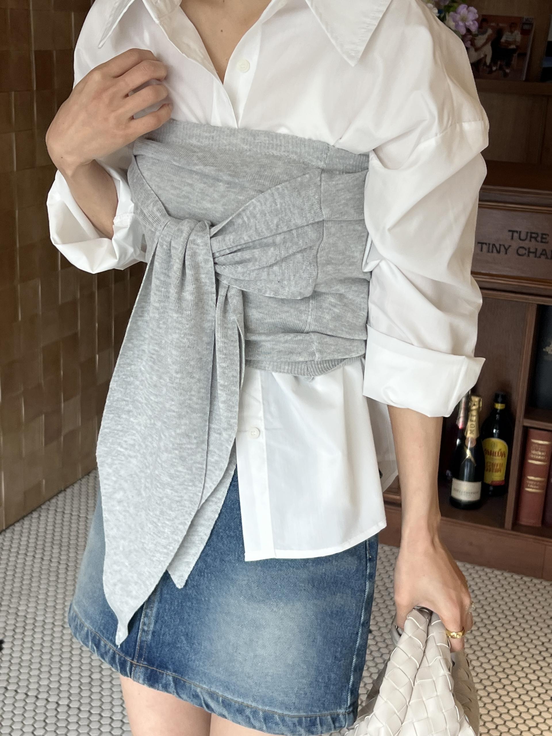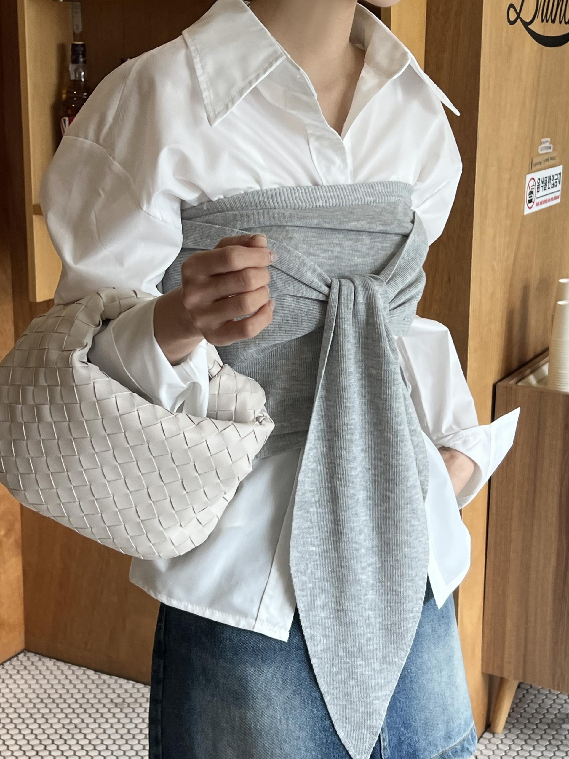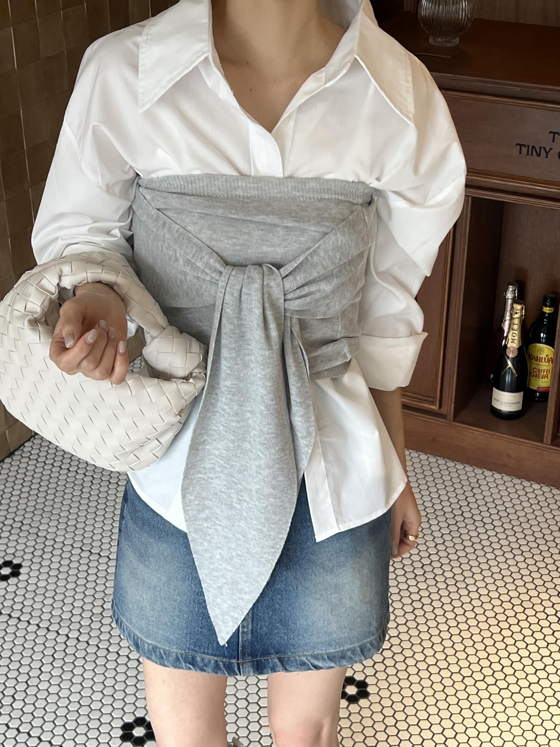 쉽게 레이어드해 어떤 코디도 더욱 살려주는 매듭 형태의 크롭 뷔스티에 탑입니다.