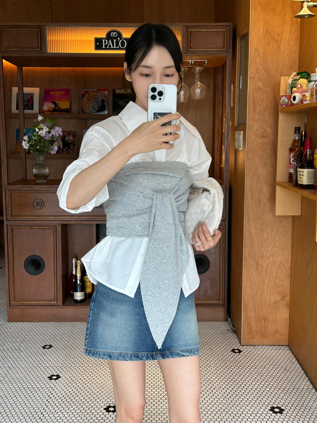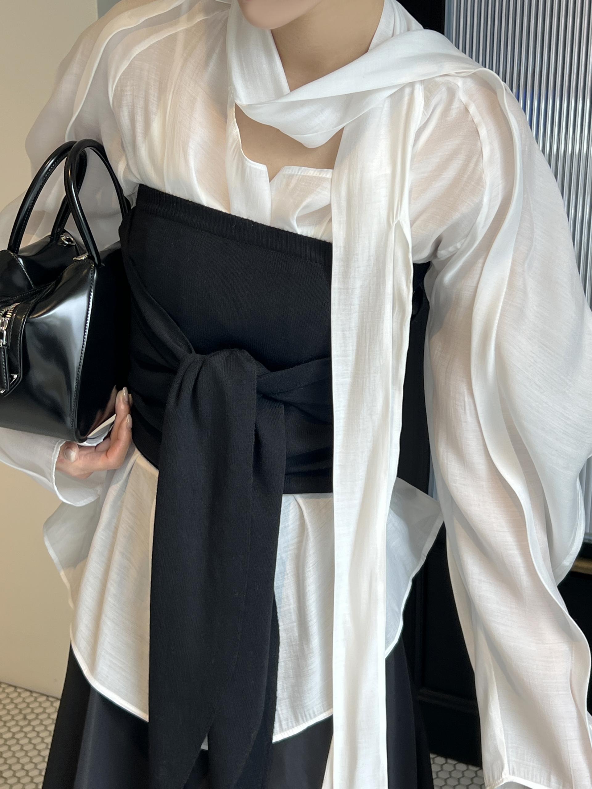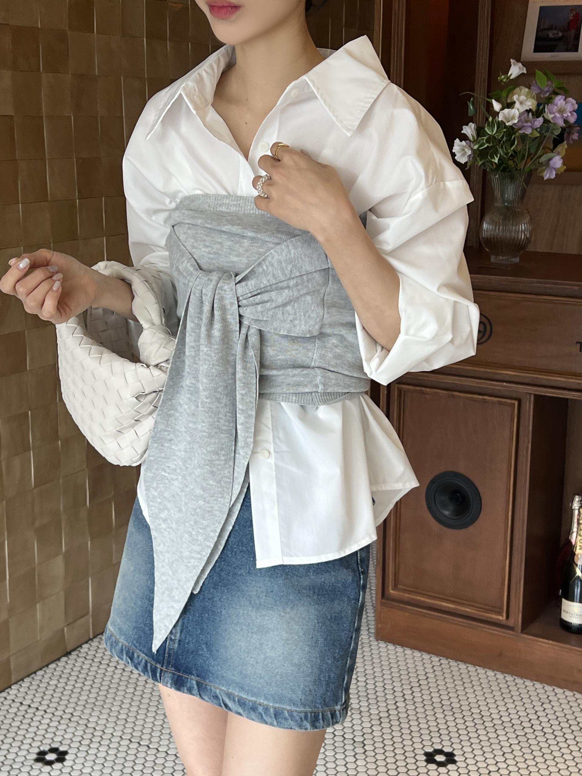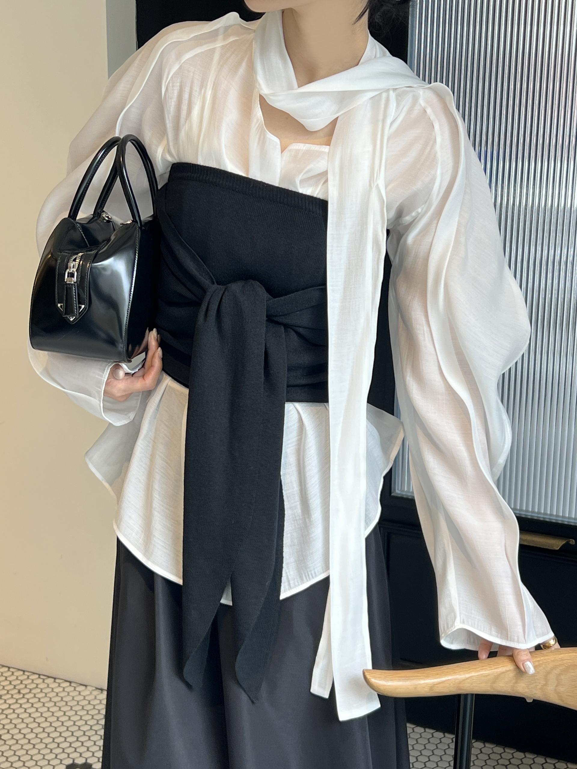 쉽게 레이어드해 어떤 코디도 더욱 살려주는 매듭 형태의 크롭 뷔스티에 탑입니다.