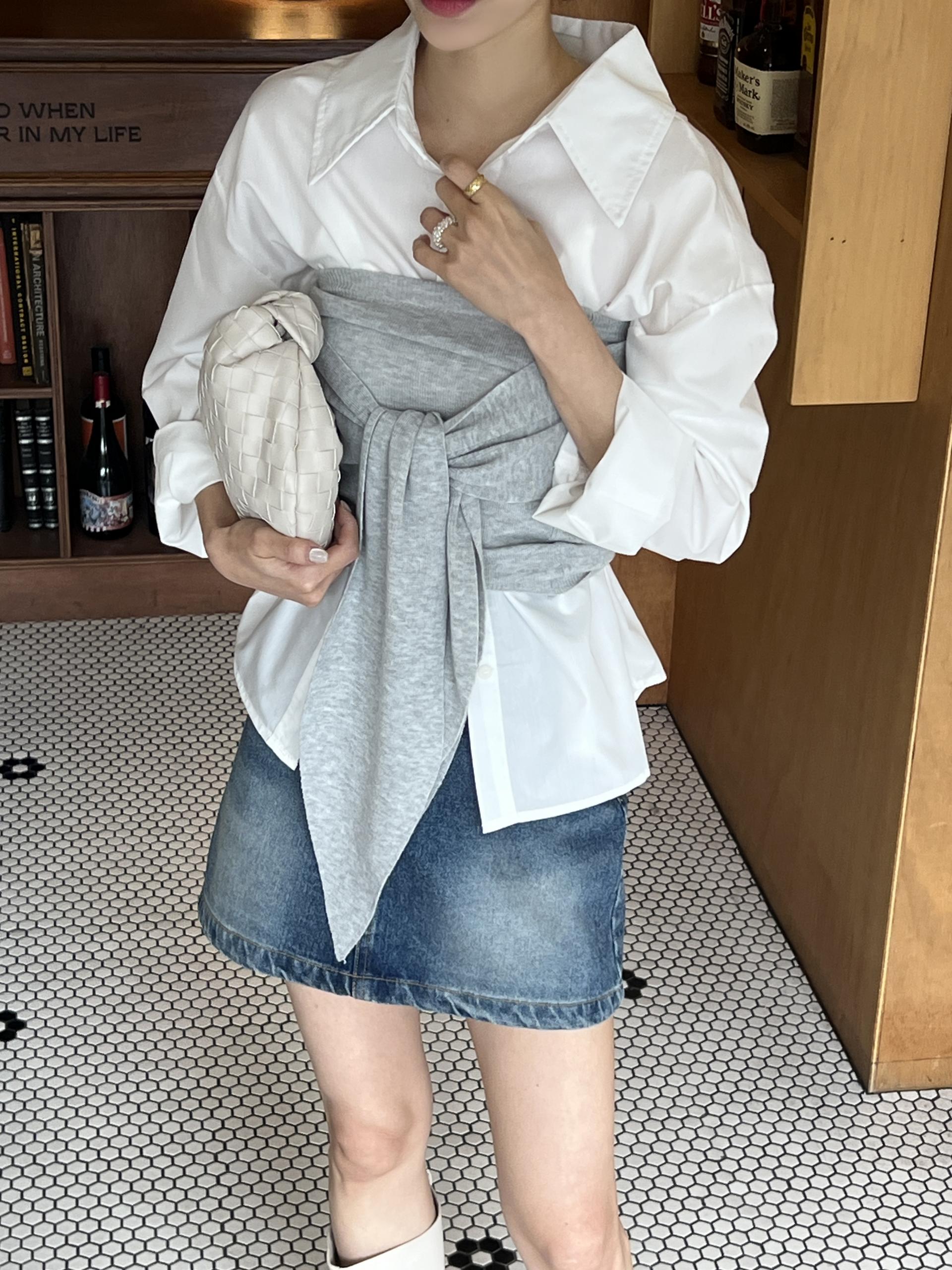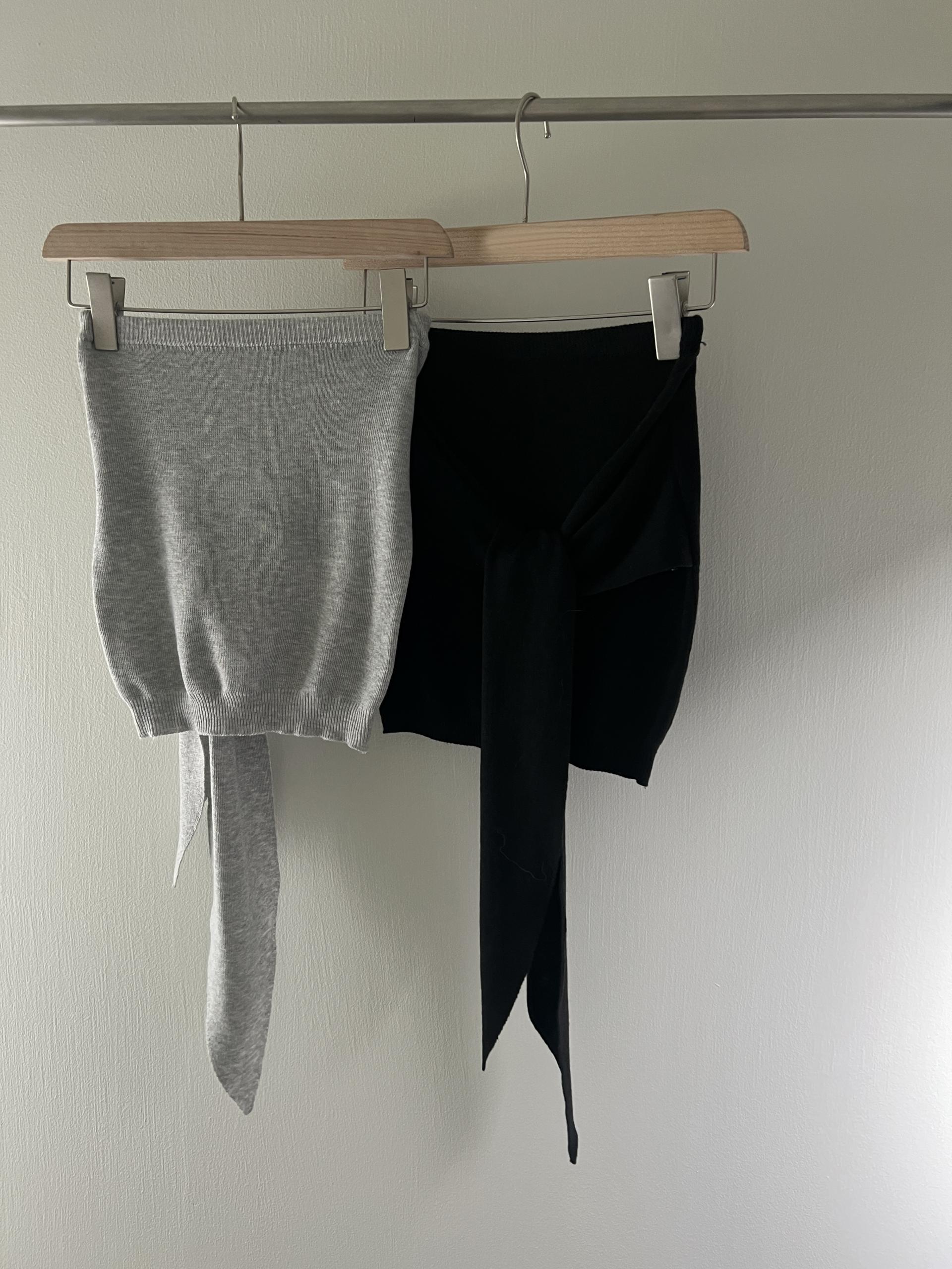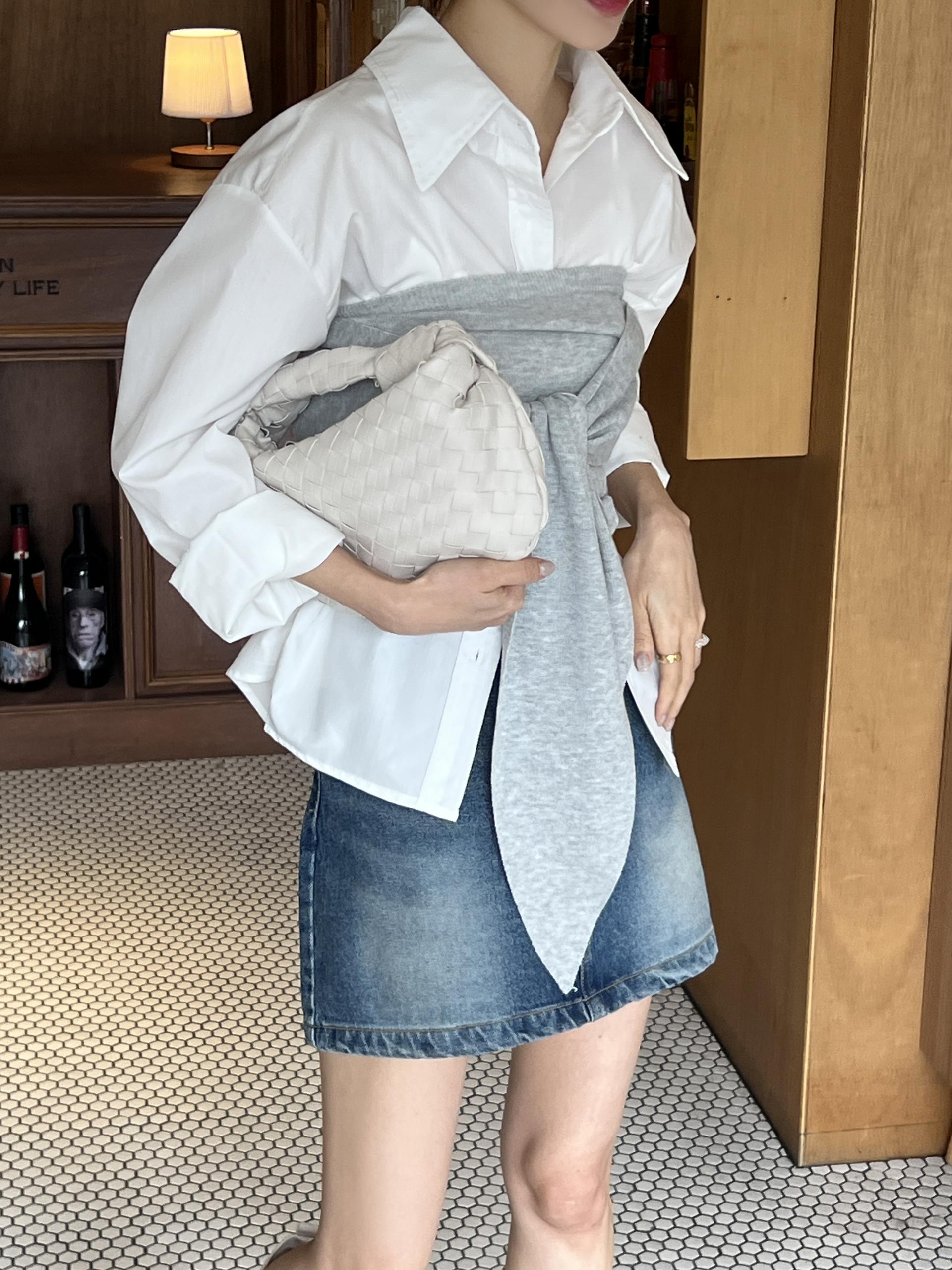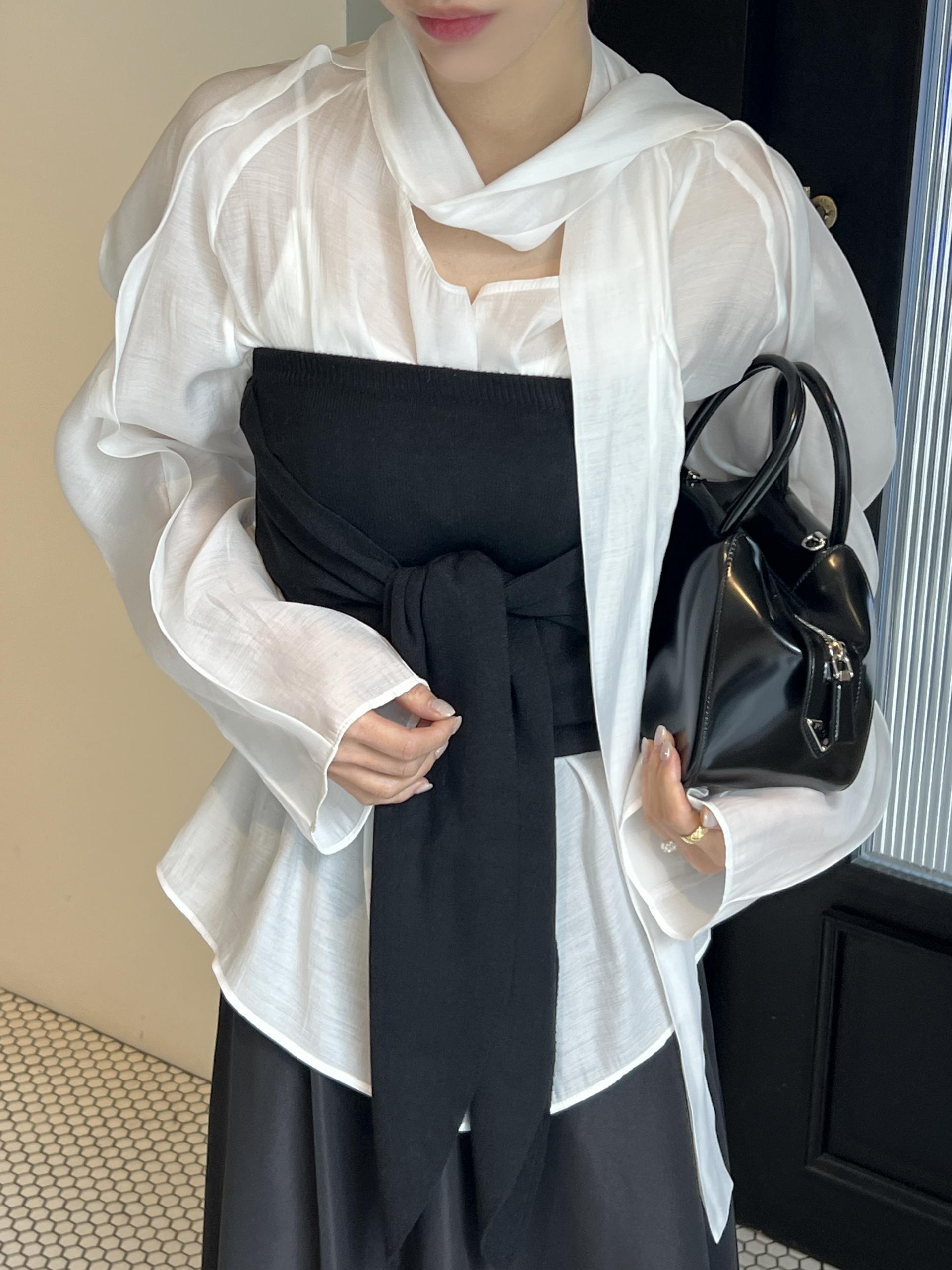 쉽게 레이어드해 어떤 코디도 더욱 살려주는 매듭 형태의 크롭 뷔스티에 탑입니다.