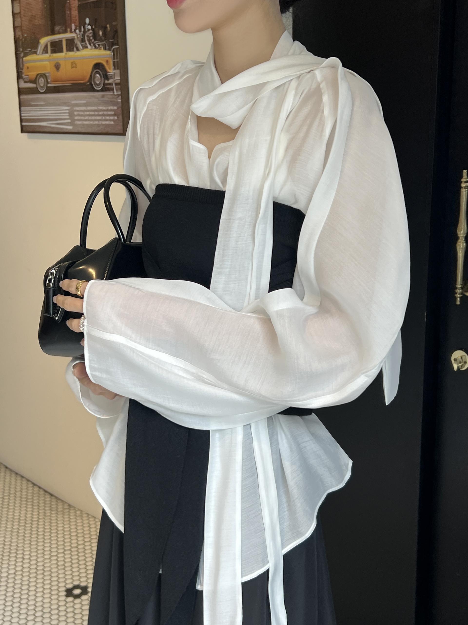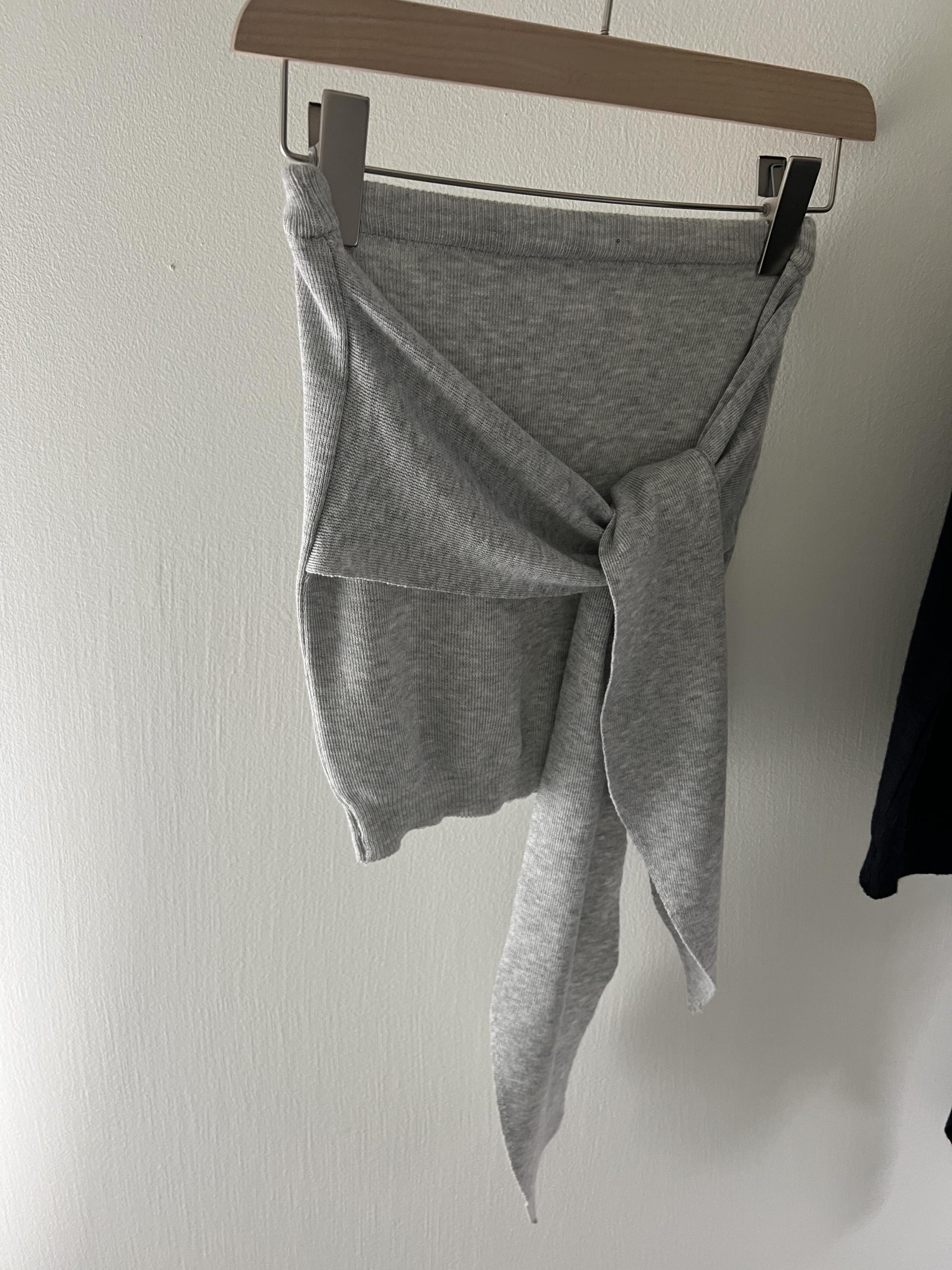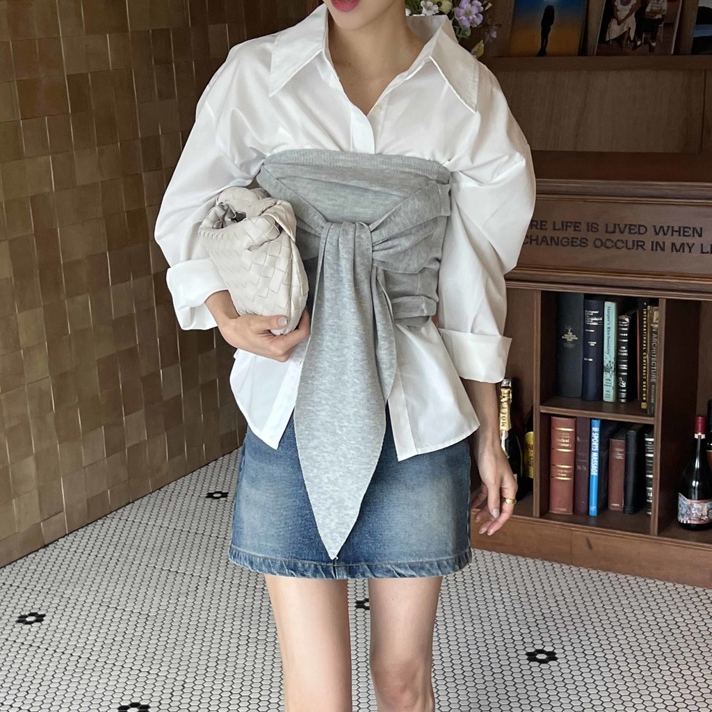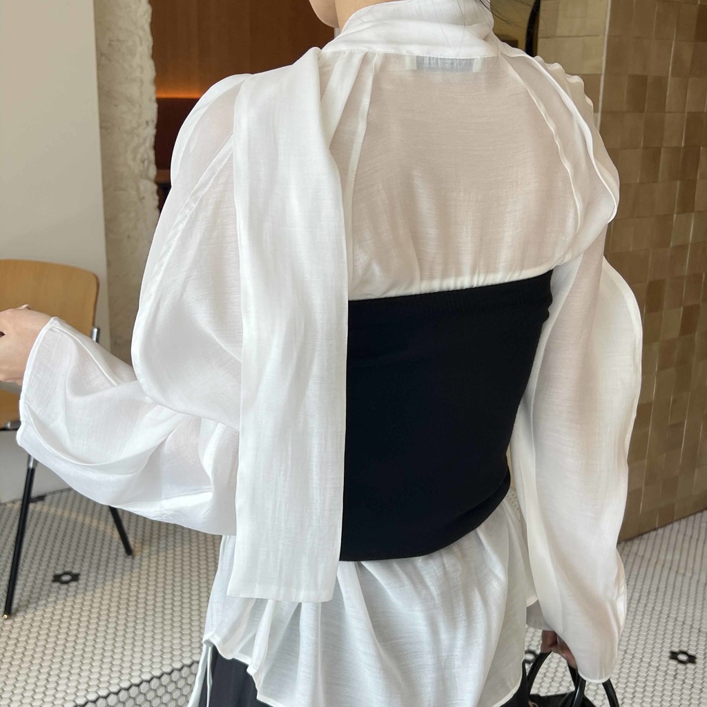 쉽게 레이어드해 어떤 코디도 더욱 살려주는 매듭 형태의 크롭 뷔스티에 탑입니다.