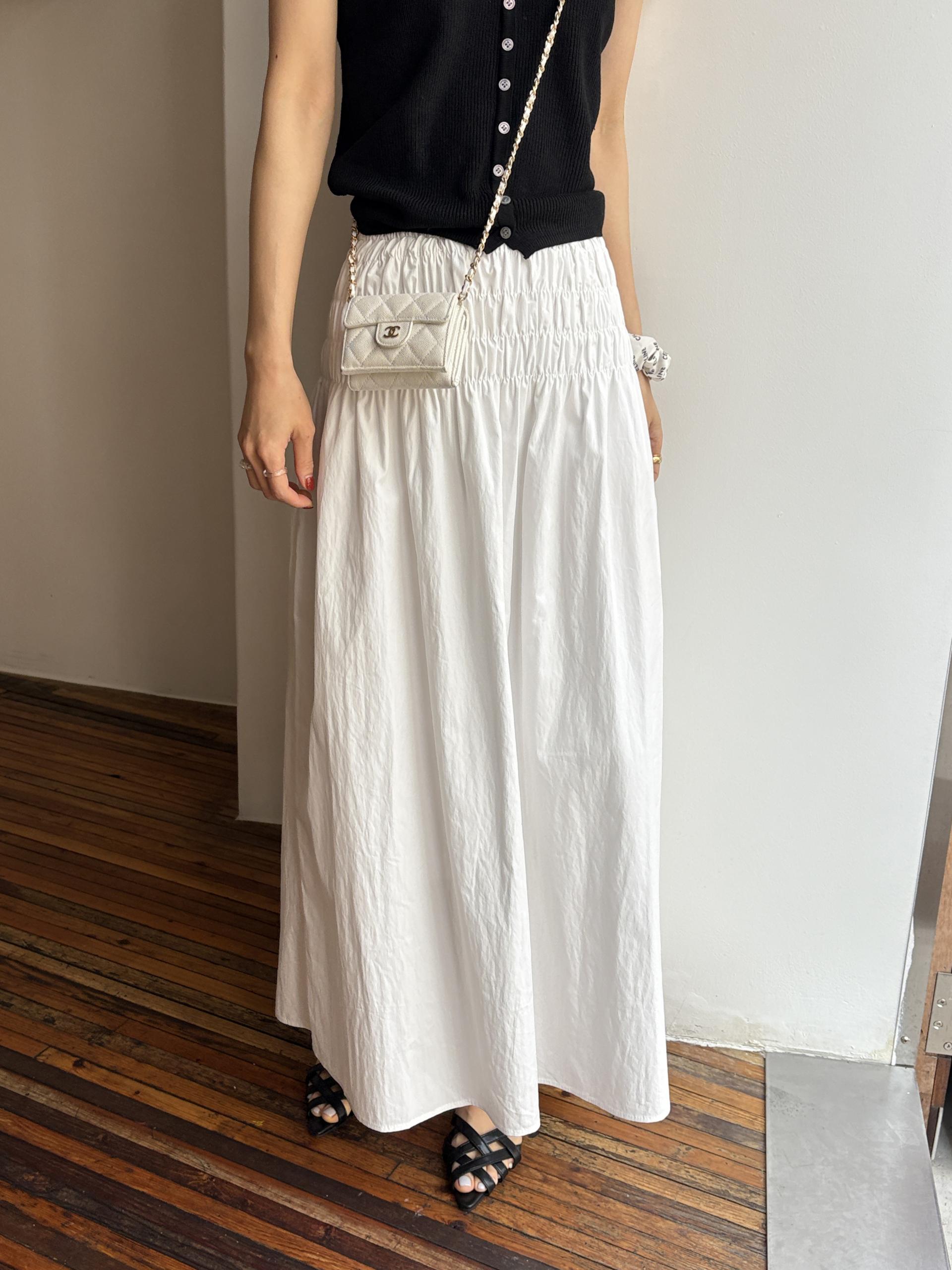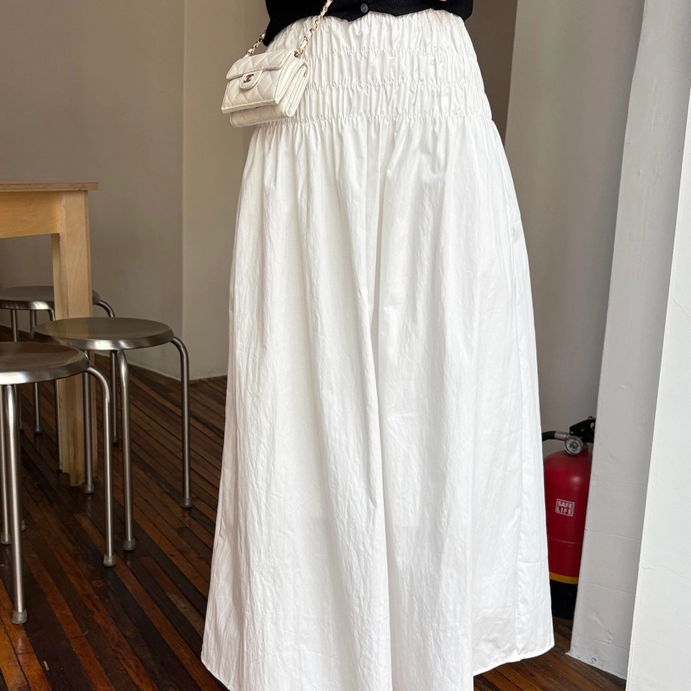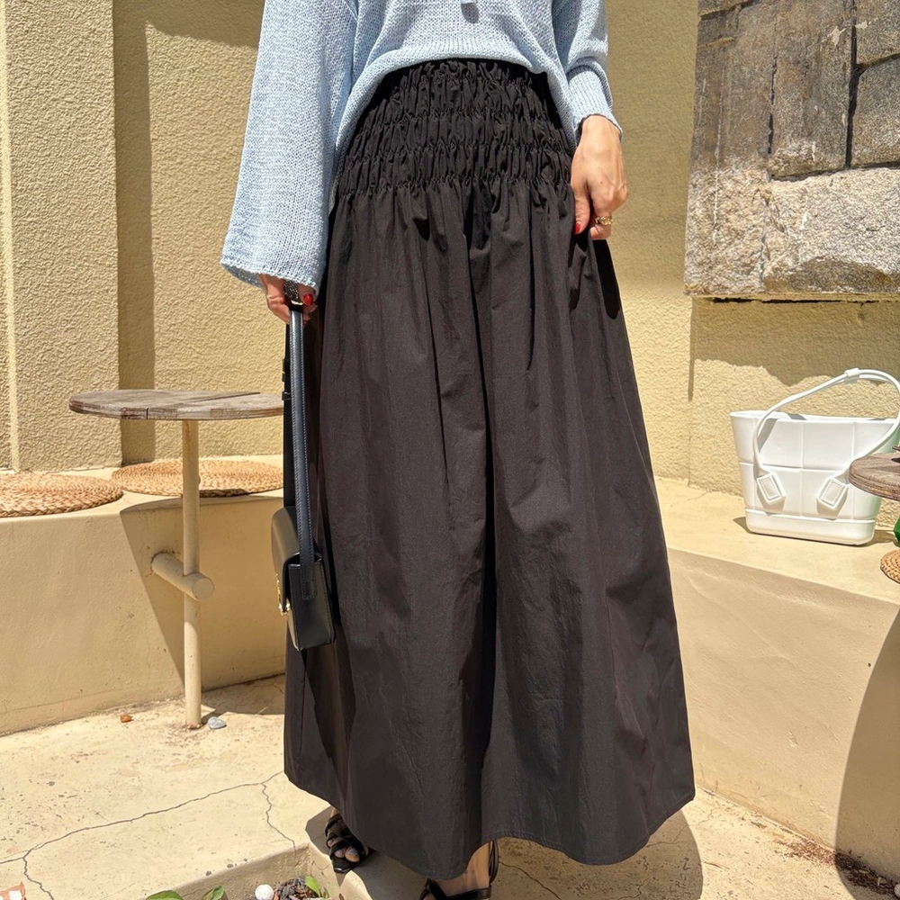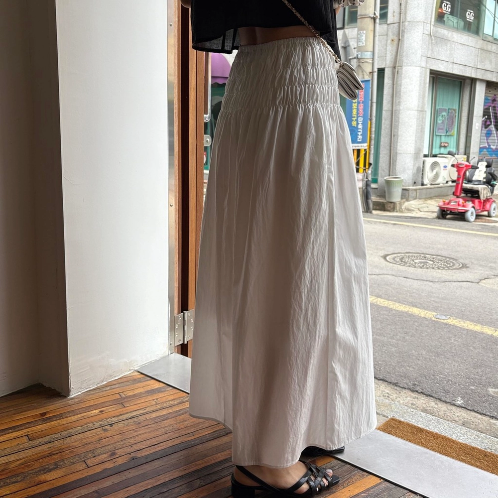 허리, 배 전체의 스모크 밴딩으로 유니크한 디자인과 편안한 착용감의 맥시 롱 스커트입니다.