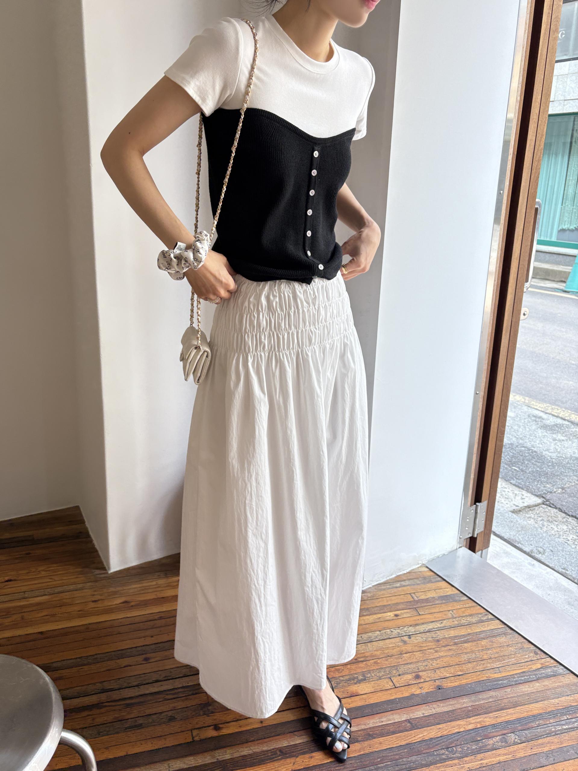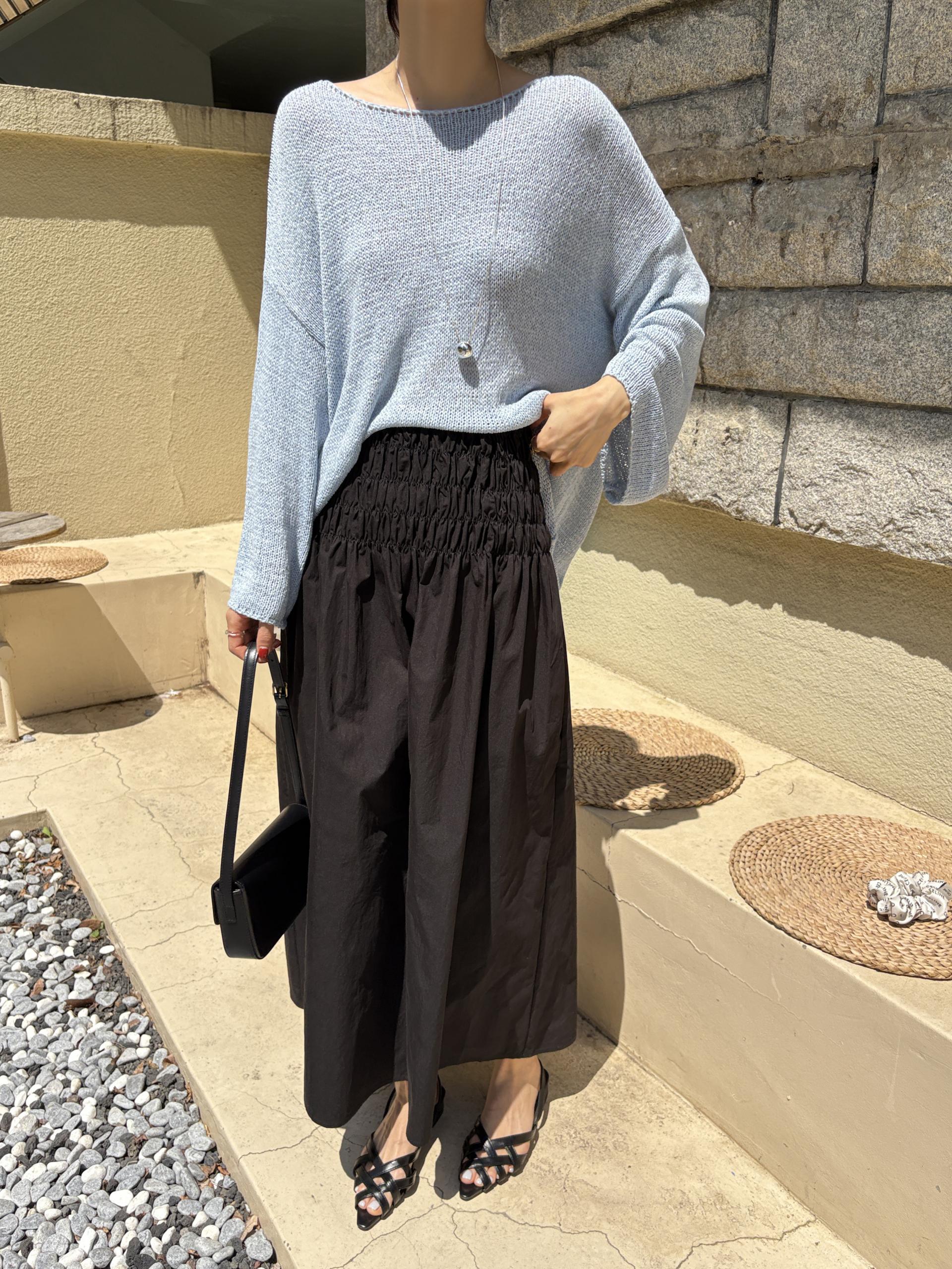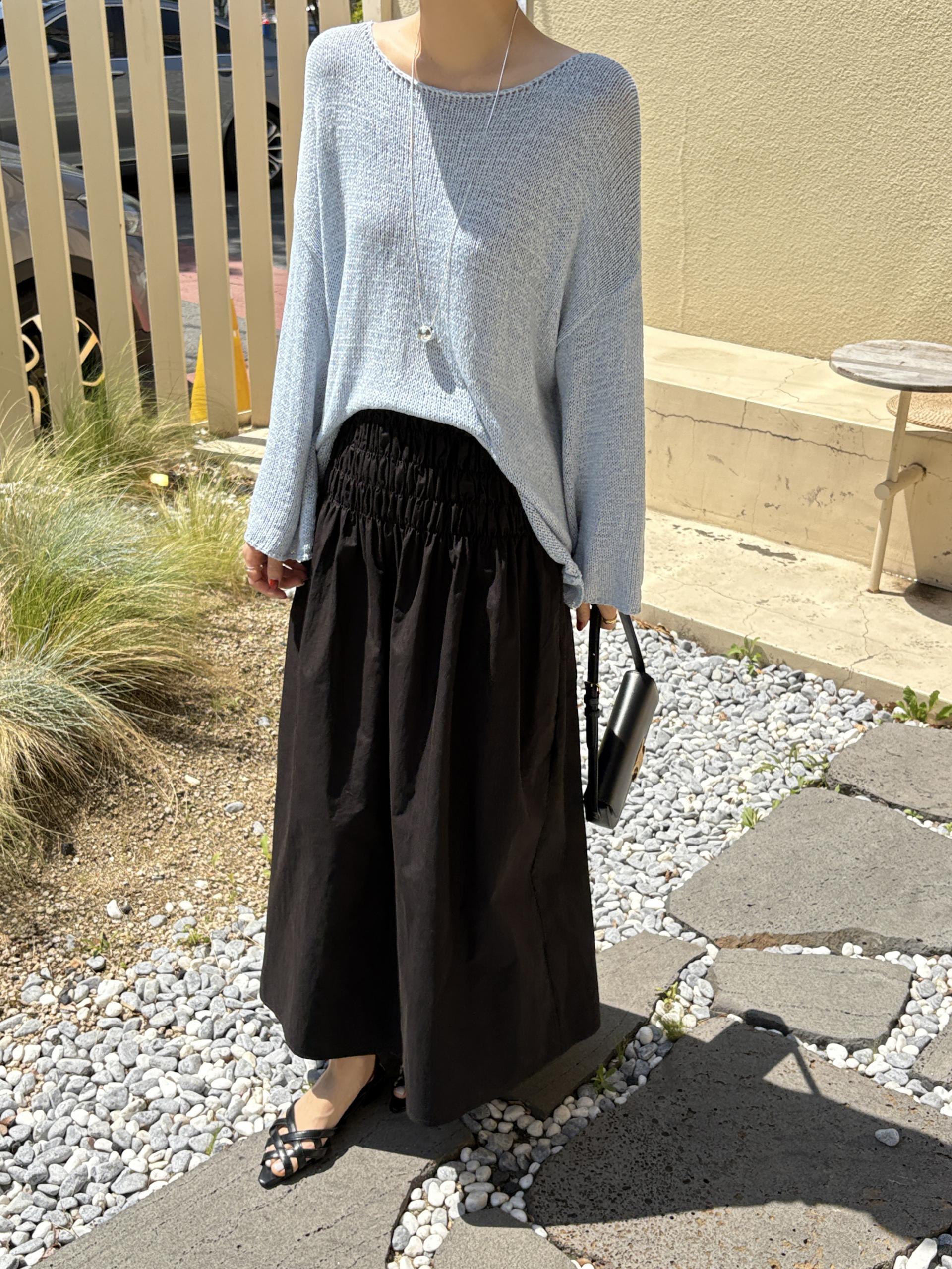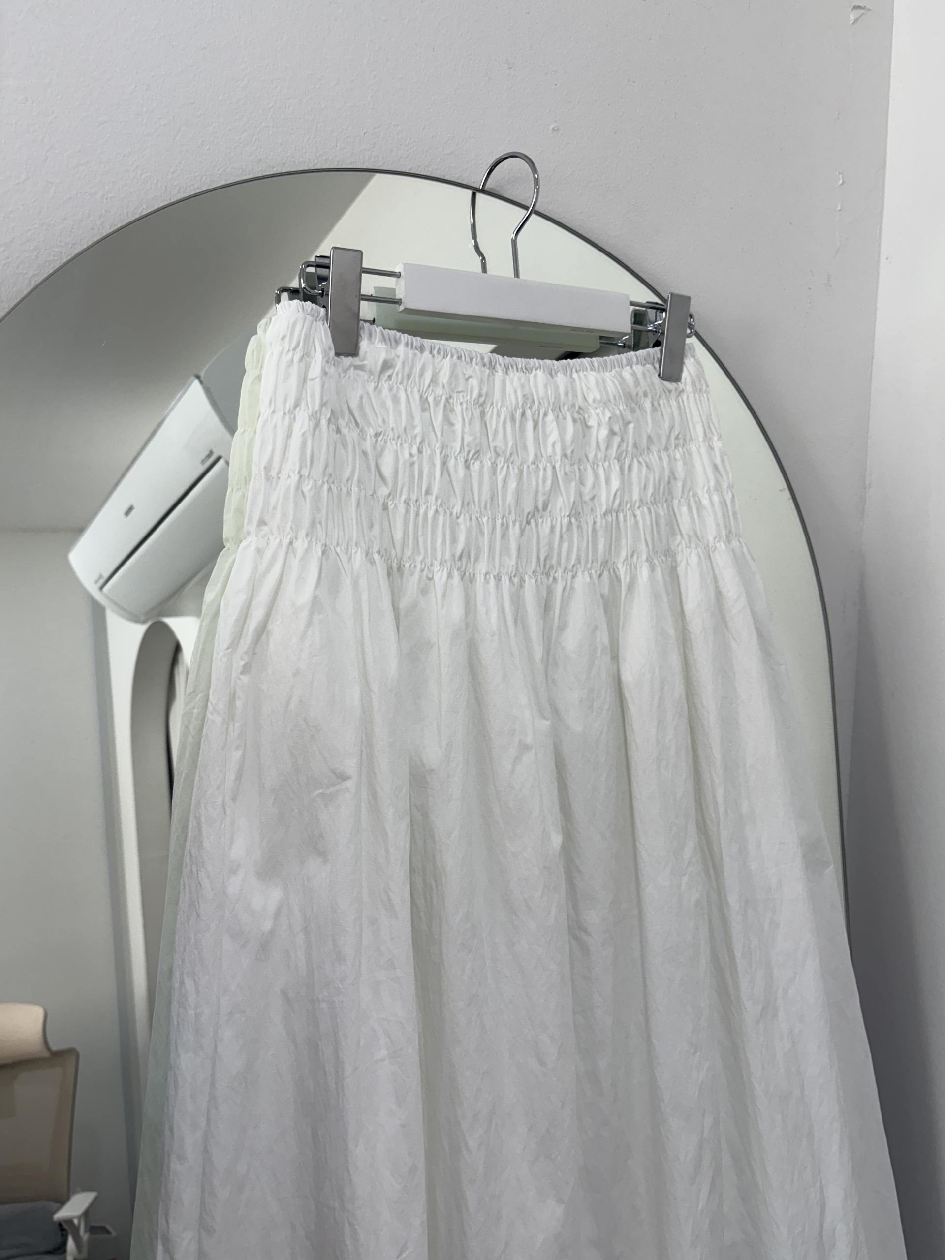 허리, 배 전체의 스모크 밴딩으로 유니크한 디자인과 편안한 착용감의 맥시 롱 스커트입니다.