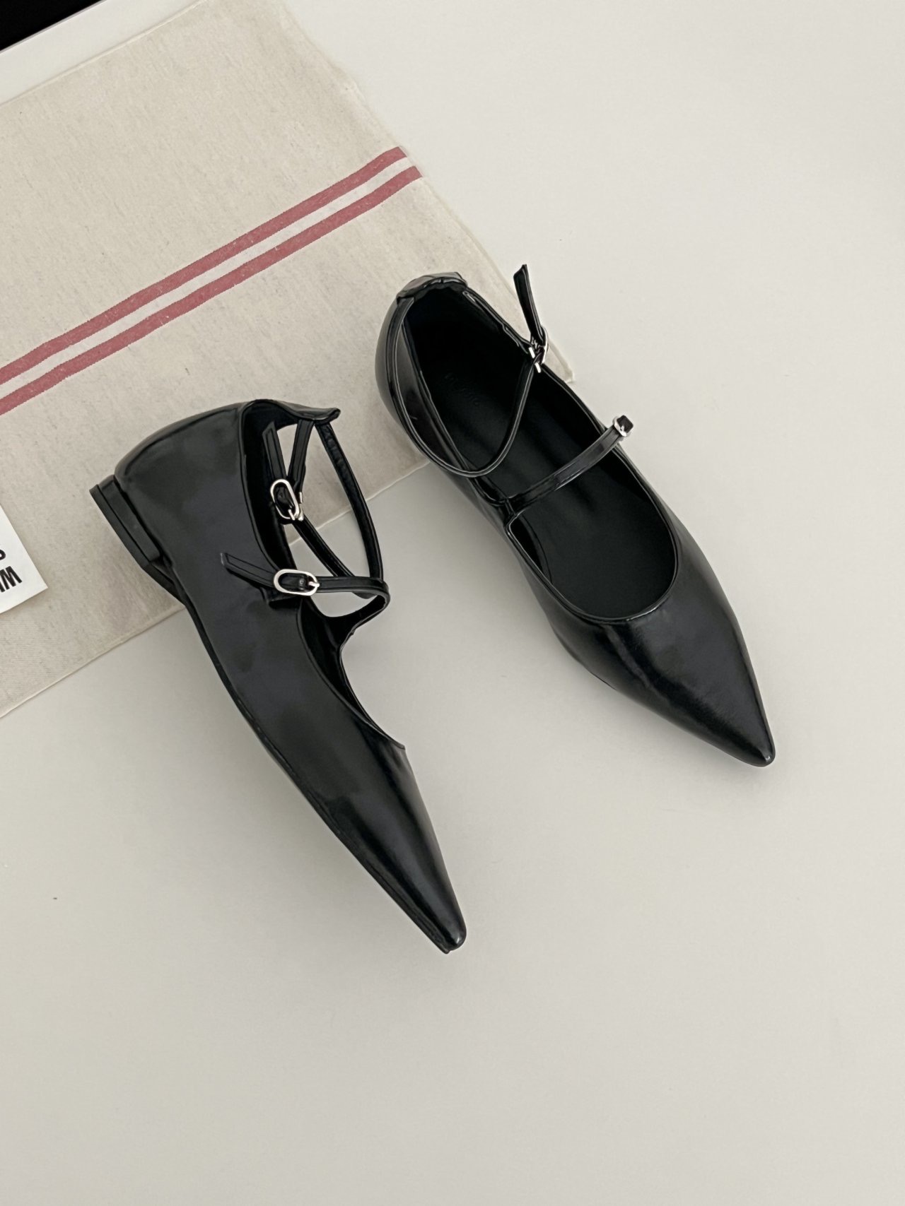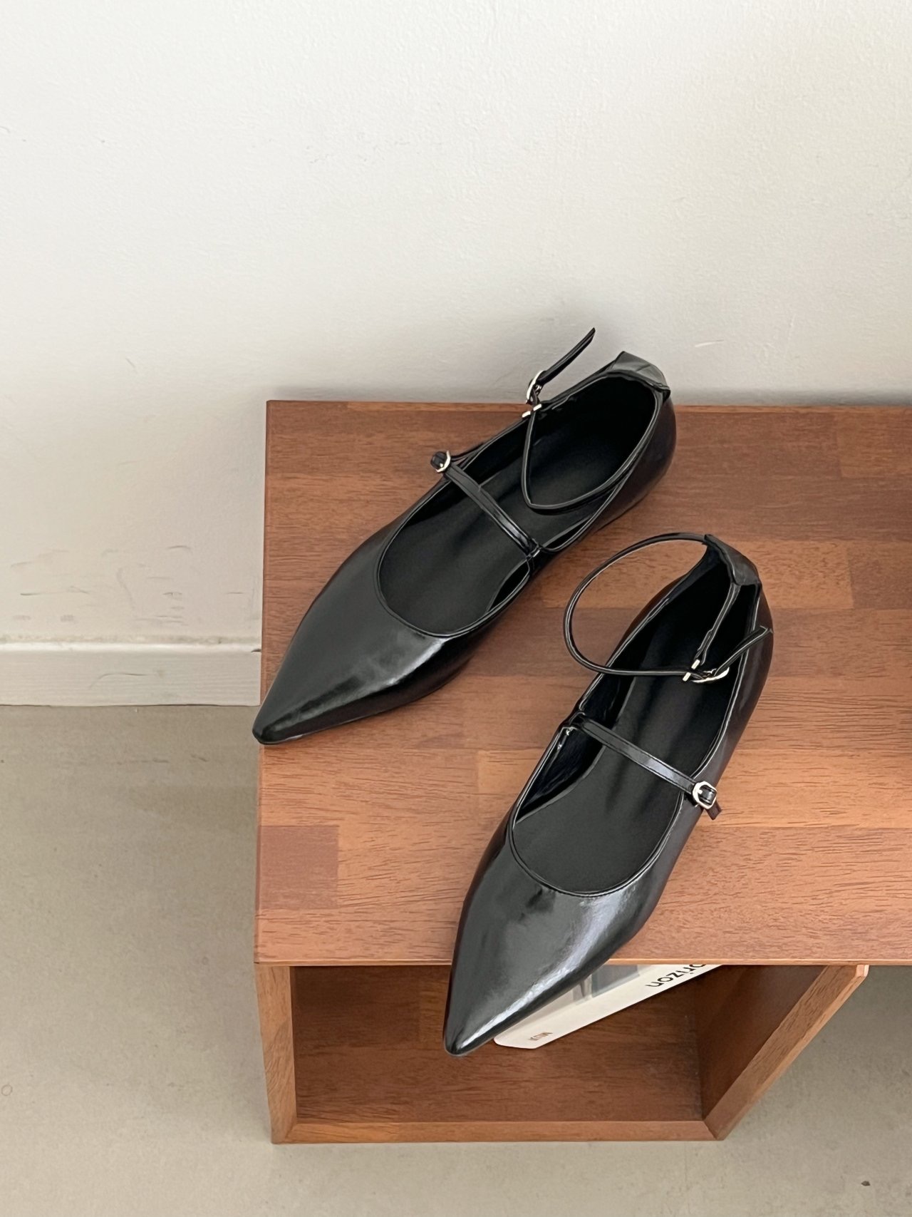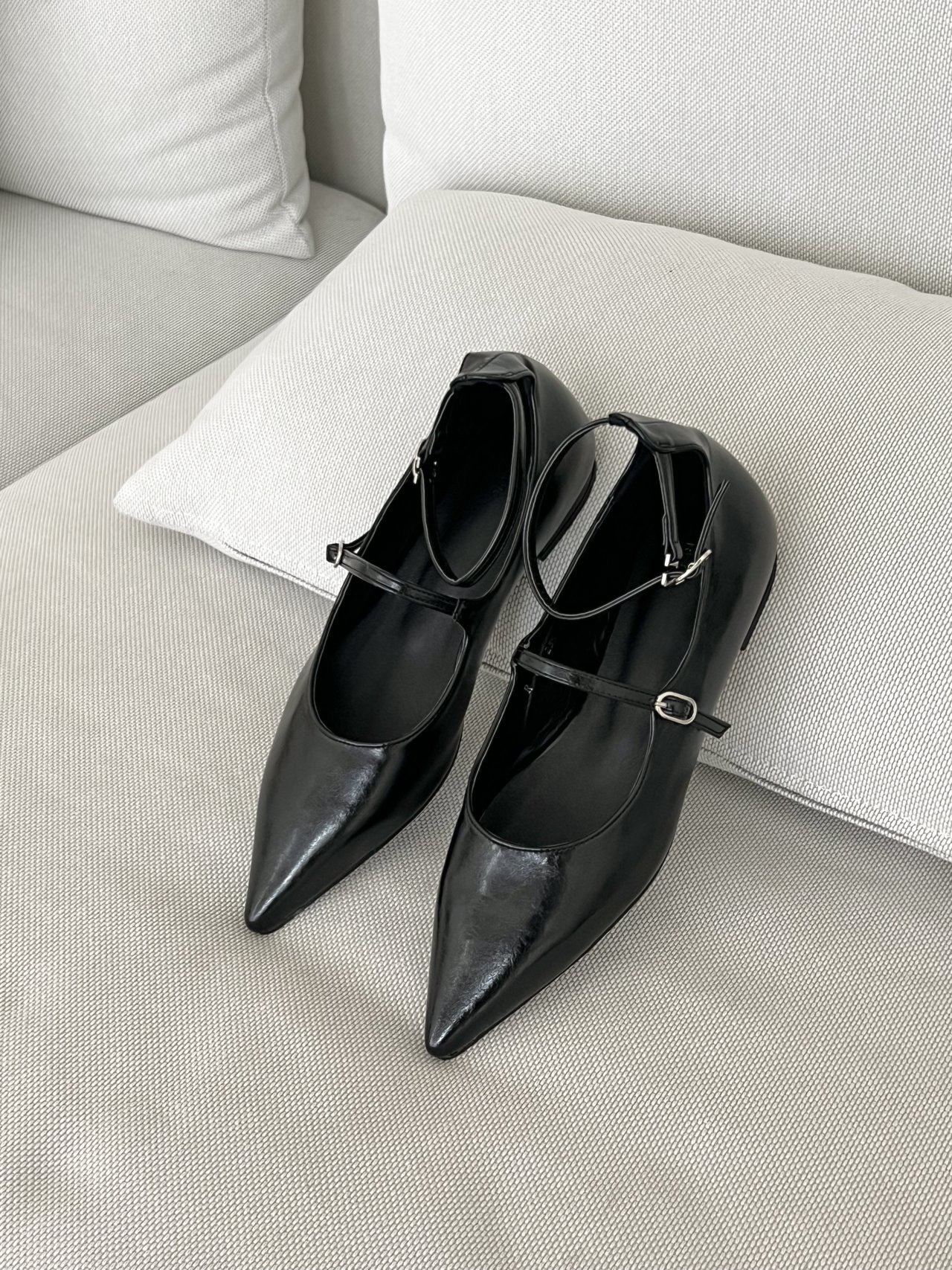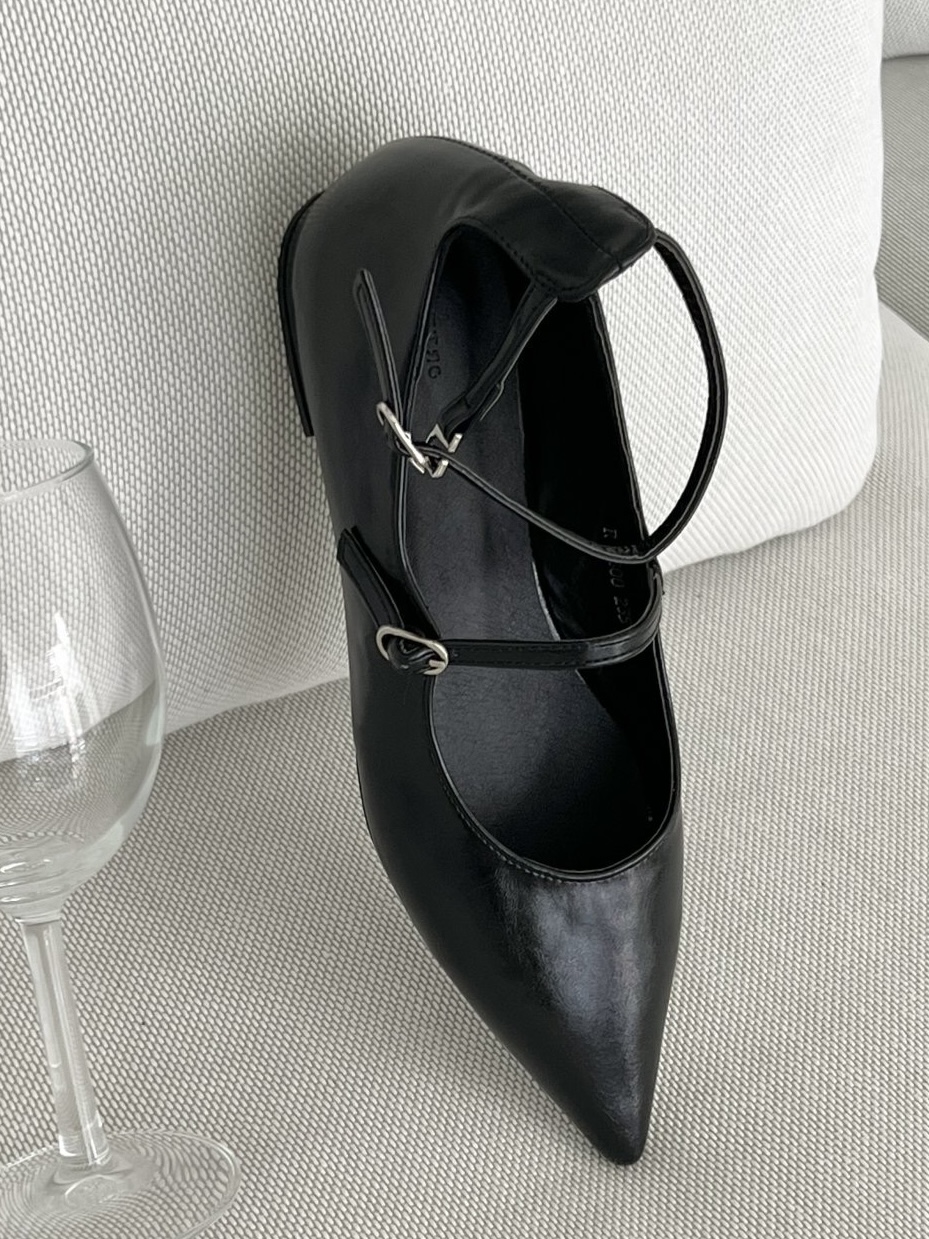 발등과 발목 2개의 스트랩이 흔하지 않고 매력적이에요. 뾰족한 포인트토에 발등이 보이는 디자인으로, 다리가 더 길고 가늘어 보여 추천해요.