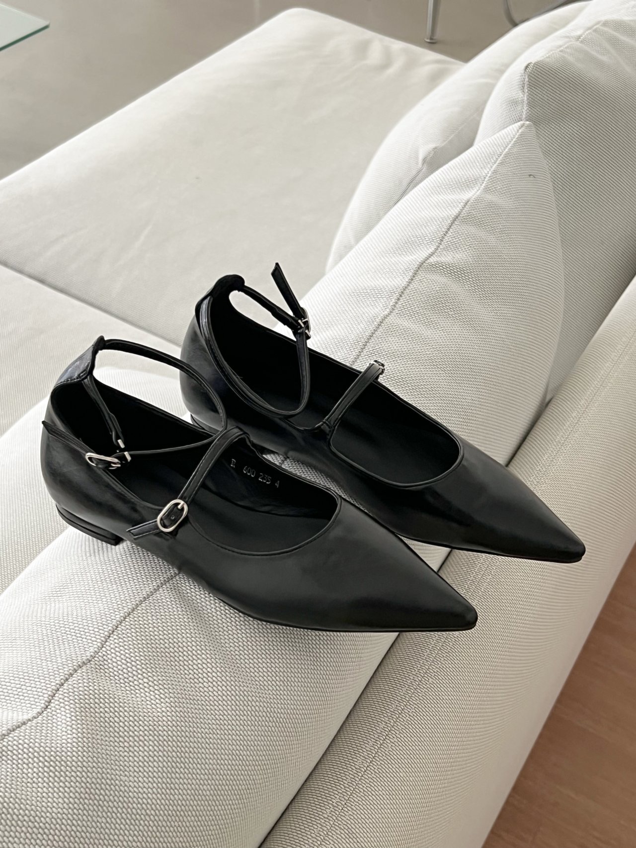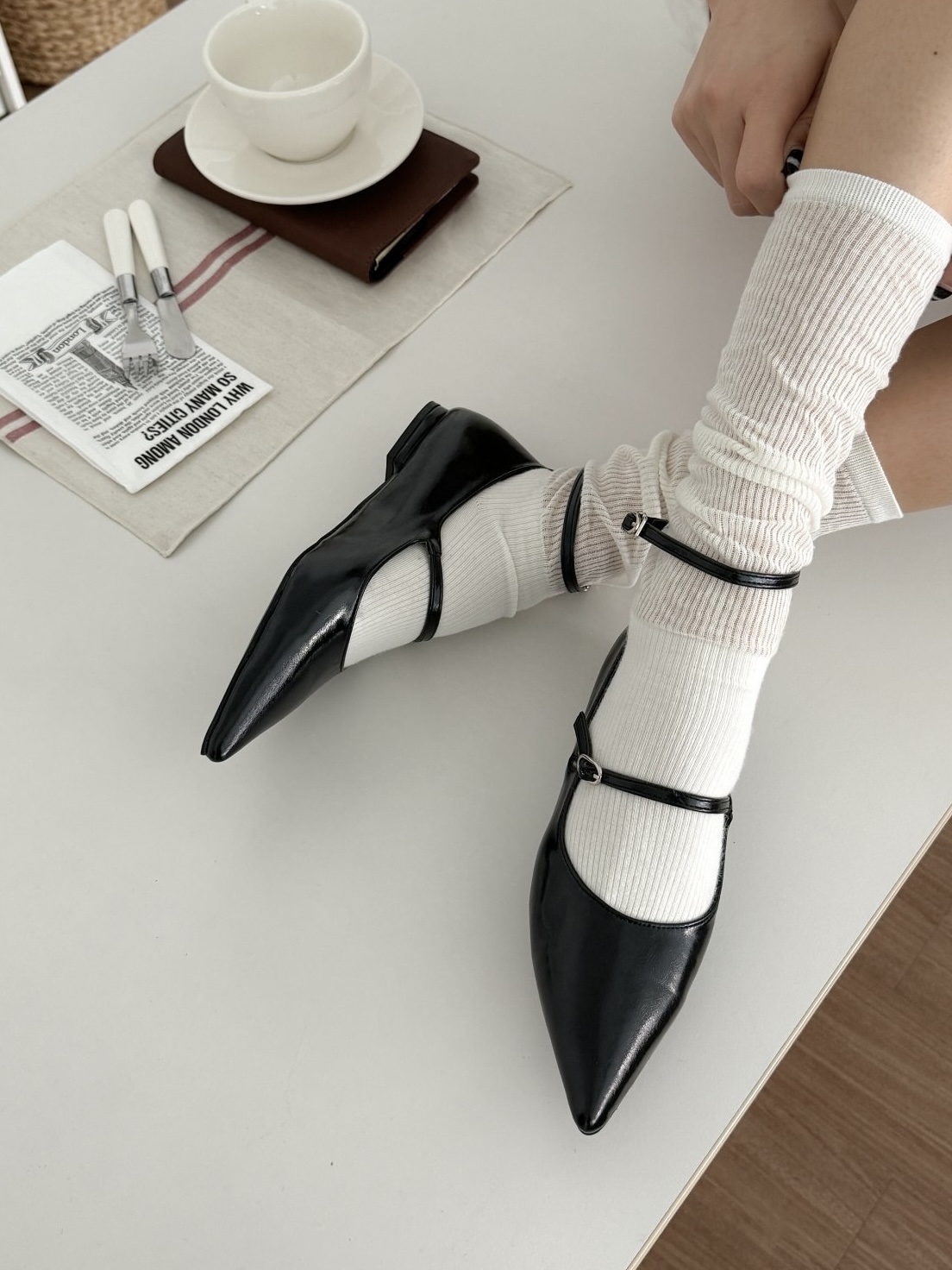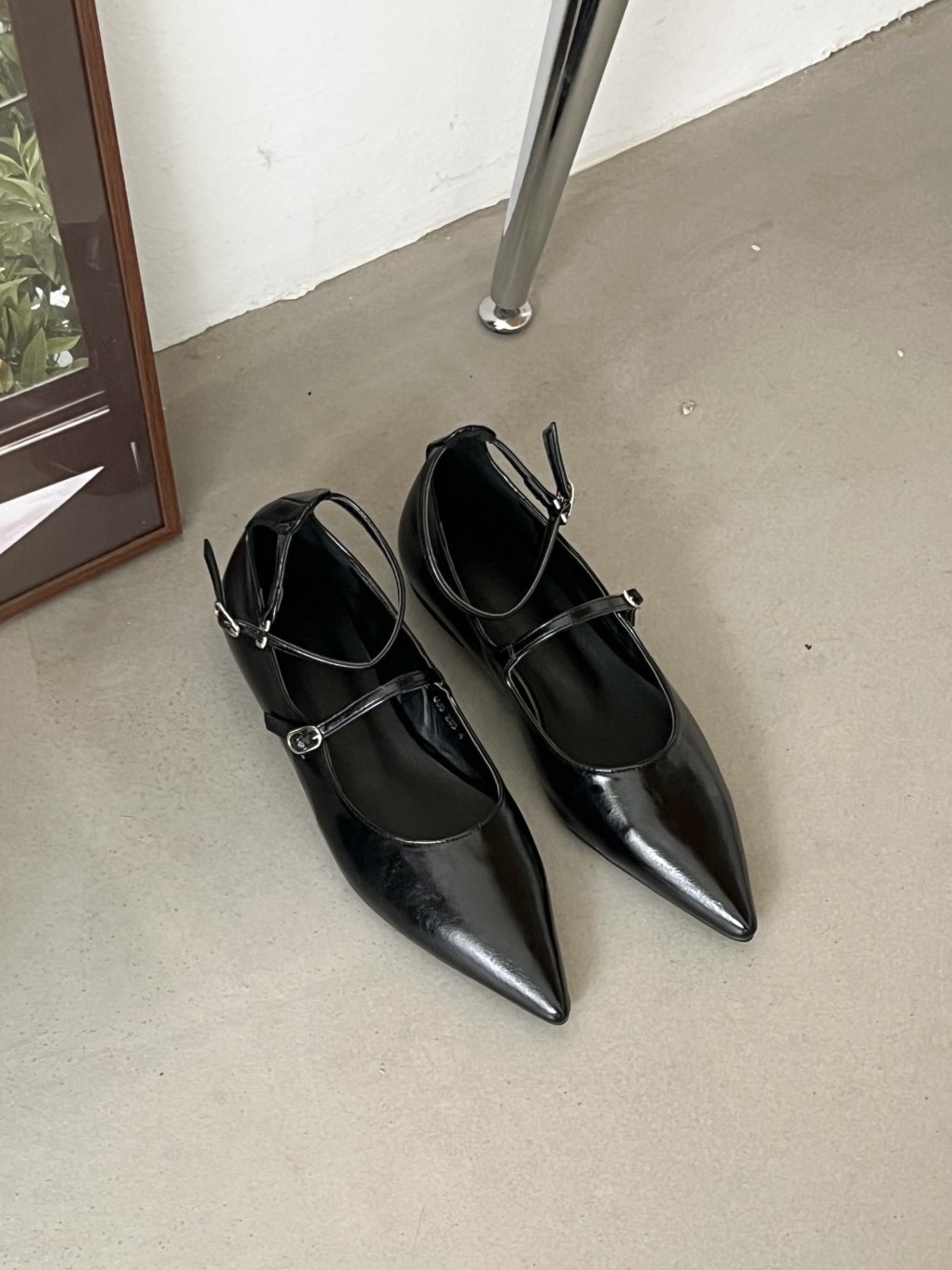 발등과 발목 2개의 스트랩이 흔하지 않고 매력적이에요. 뾰족한 포인트토에 발등이 보이는 디자인으로, 다리가 더 길고 가늘어 보여 추천해요.