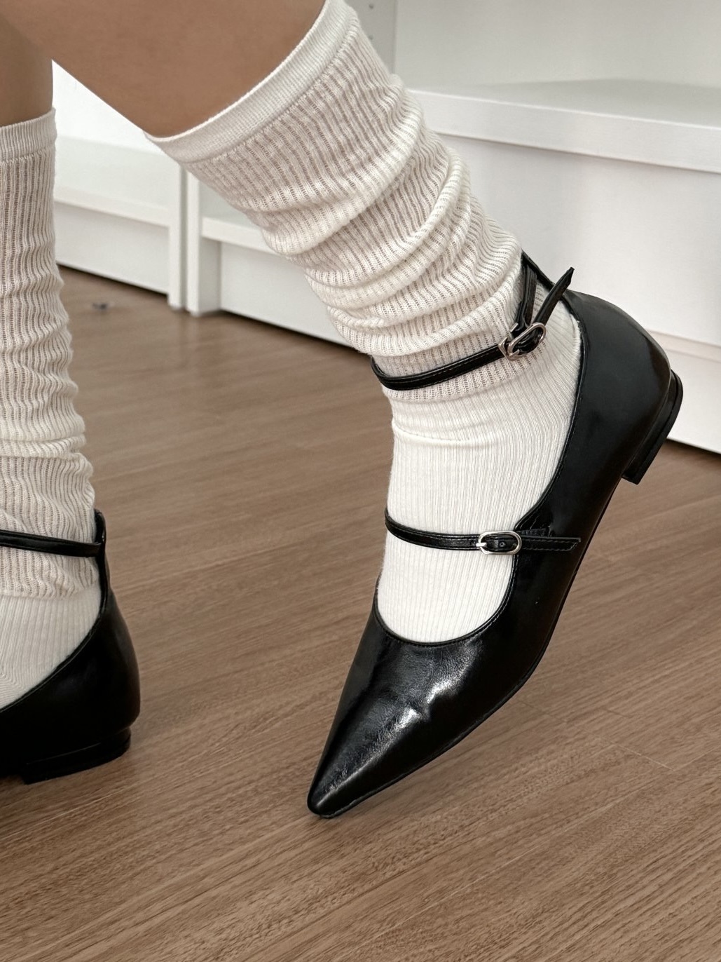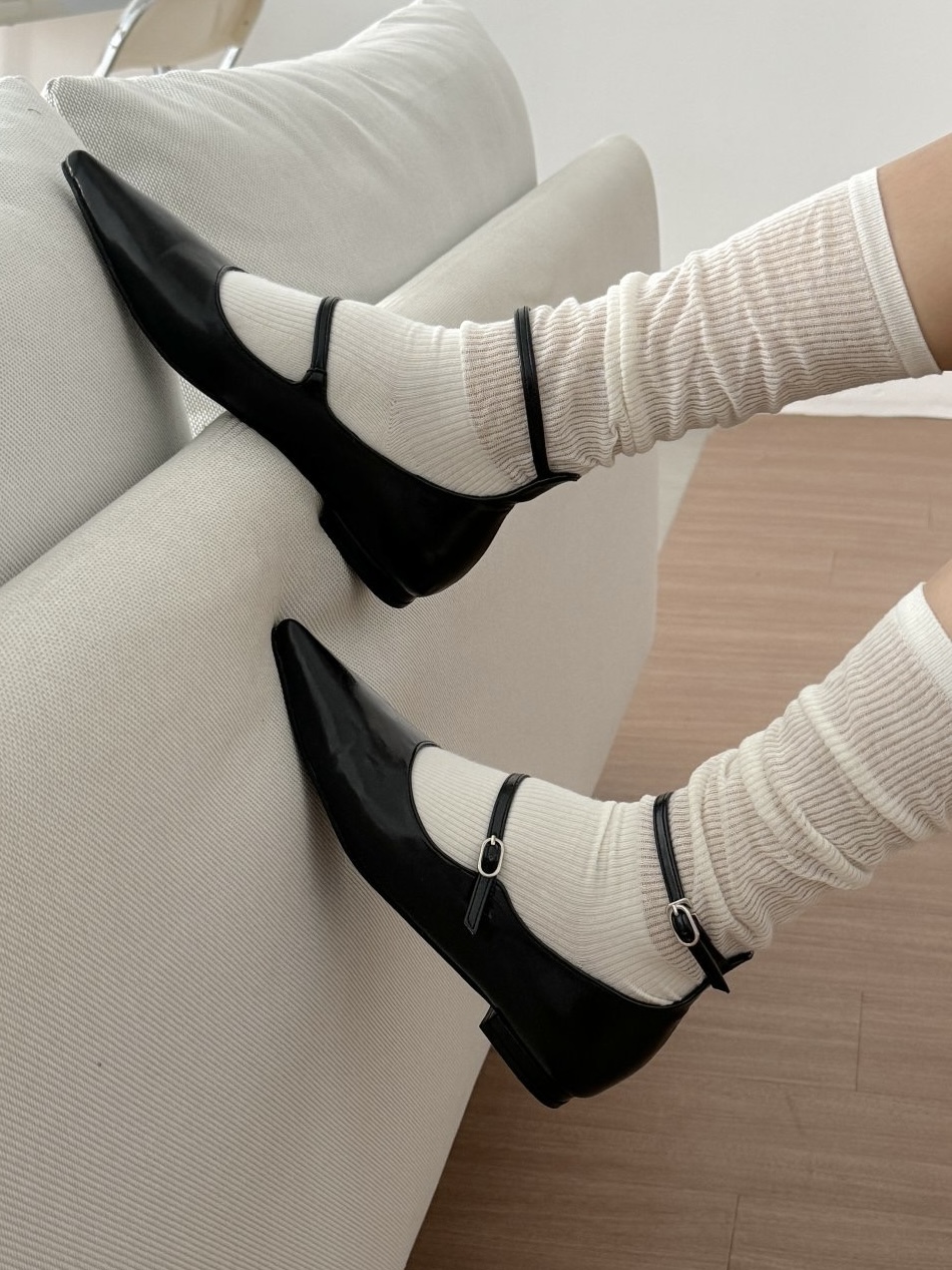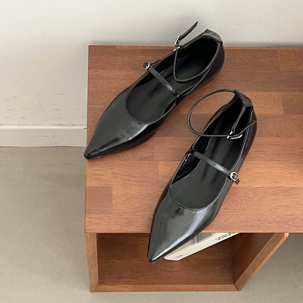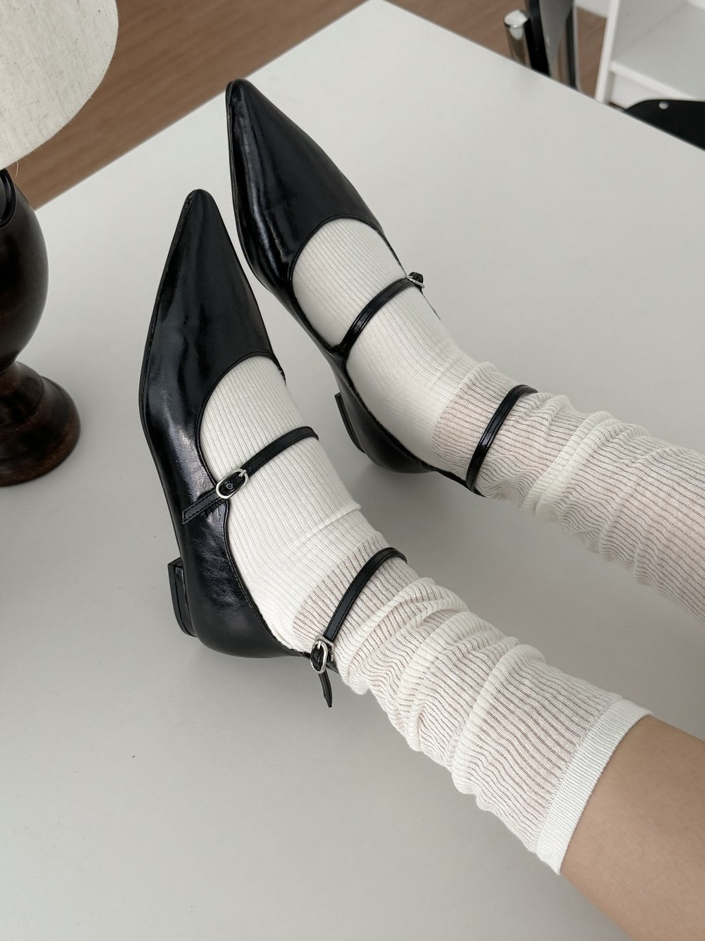 발등과 발목 2개의 스트랩이 흔하지 않고 매력적이에요. 뾰족한 포인트토에 발등이 보이는 디자인으로, 다리가 더 길고 가늘어 보여 추천해요.