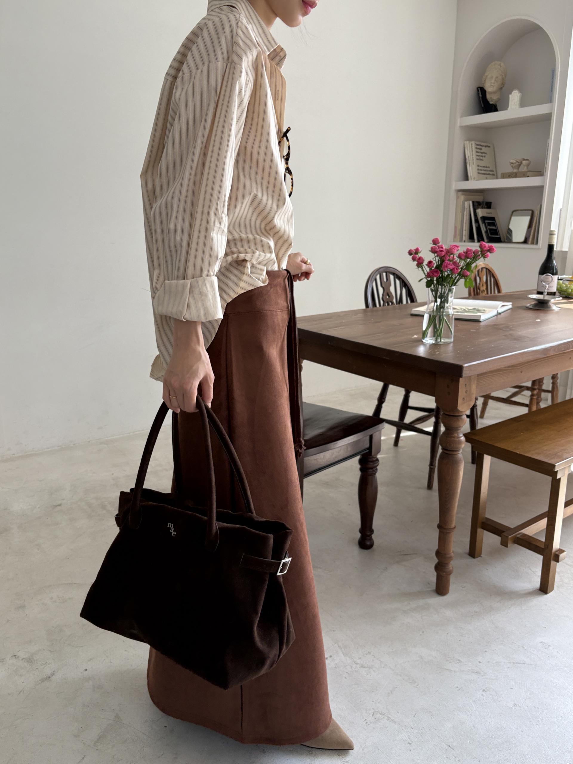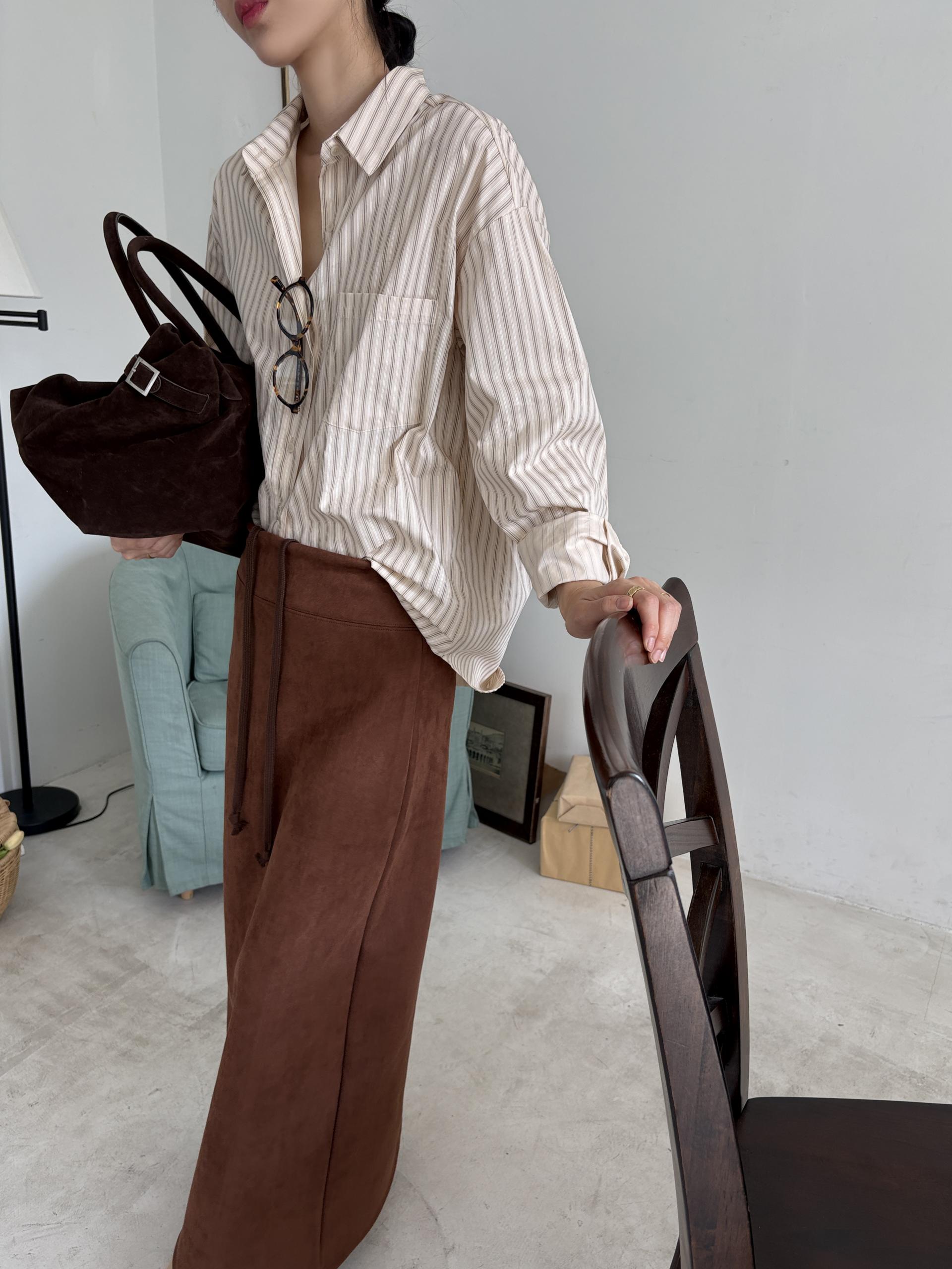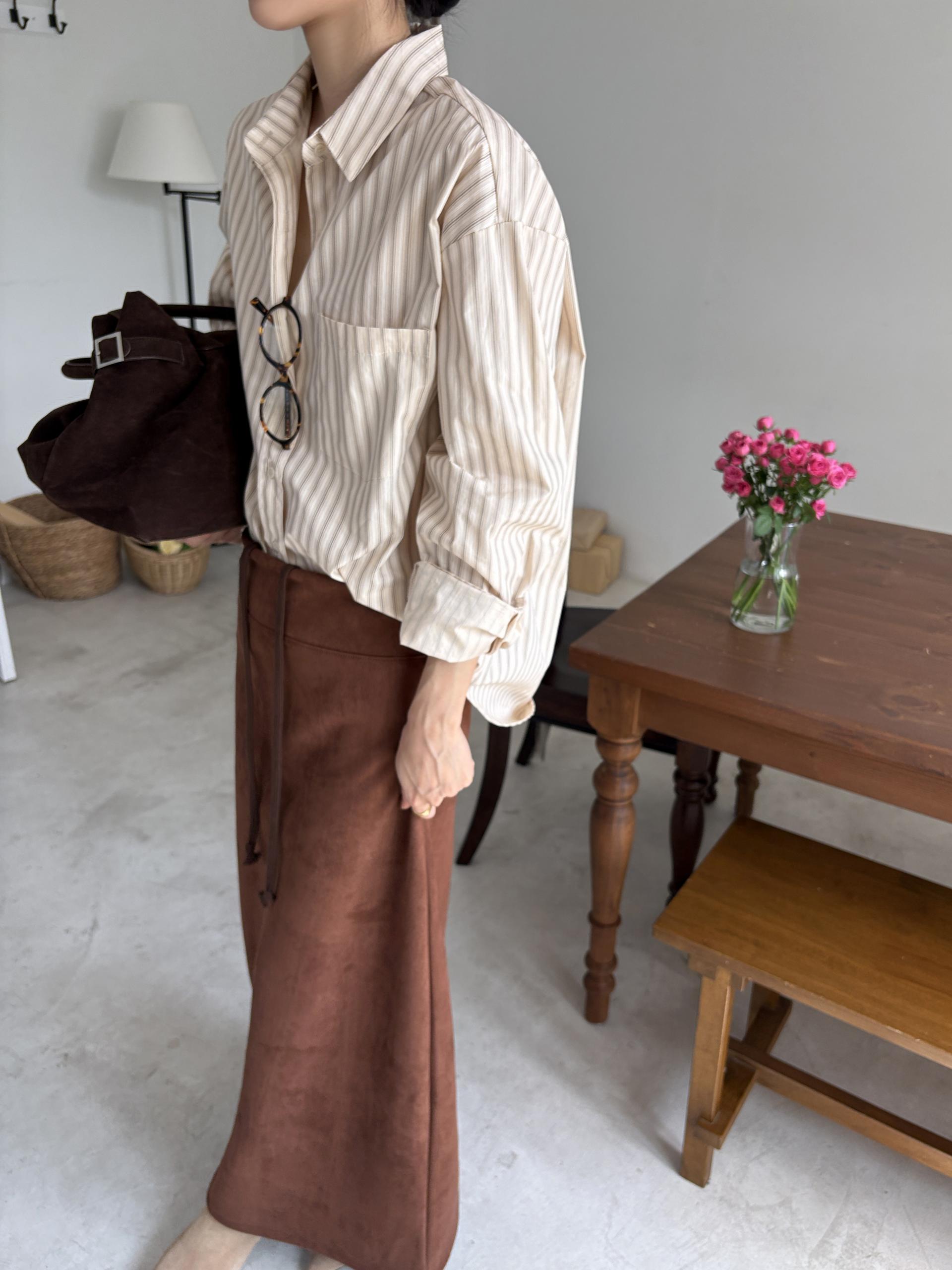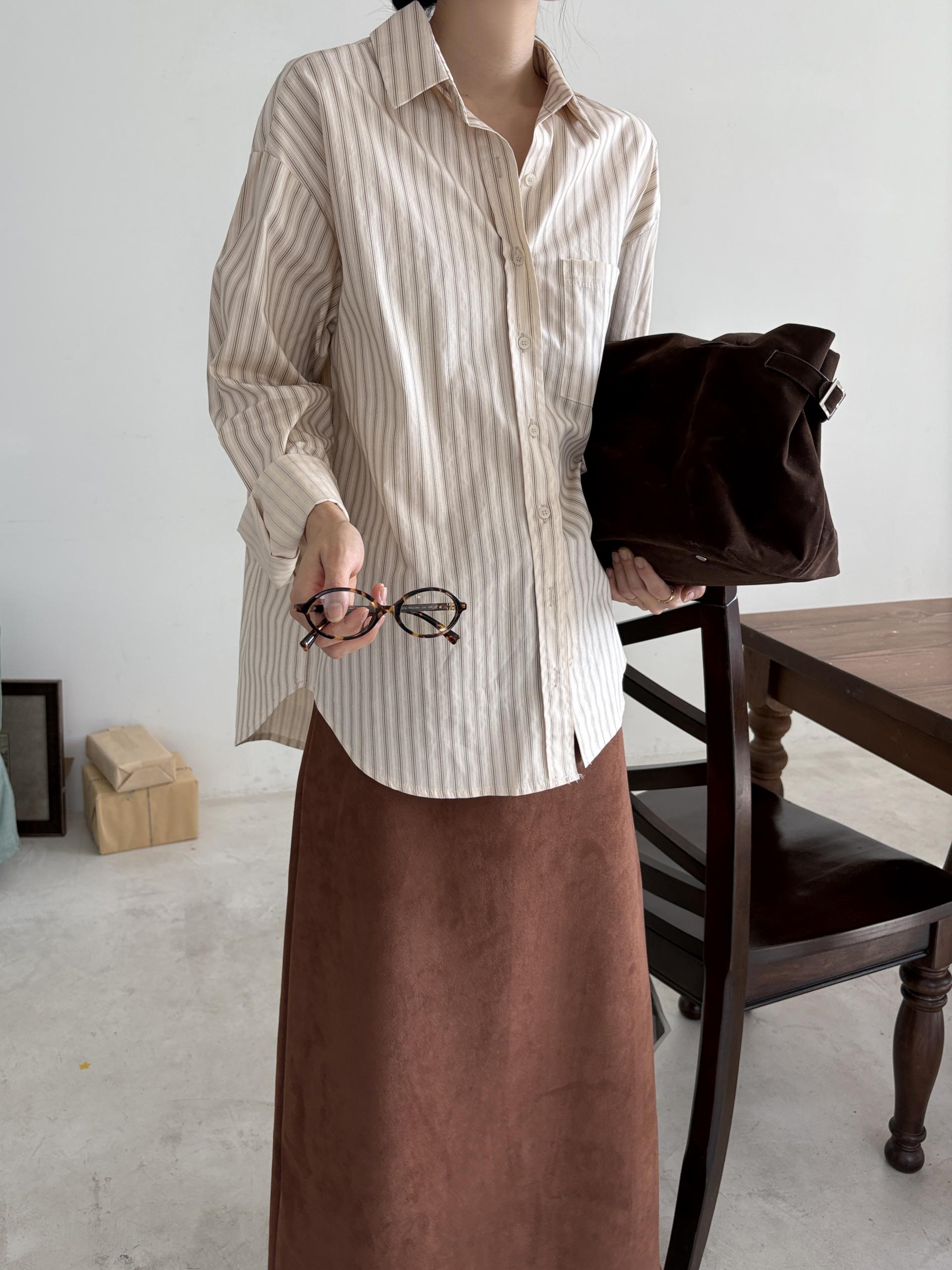 가을 시즌에 맞는 차분한 색감에 은은한 컬러 배색의 스트라이프 패턴이 세련된 분위기를 더해주고, 여유 있는 핏으로 체형 커버는 물론 편안하게 착용 기능합니다.