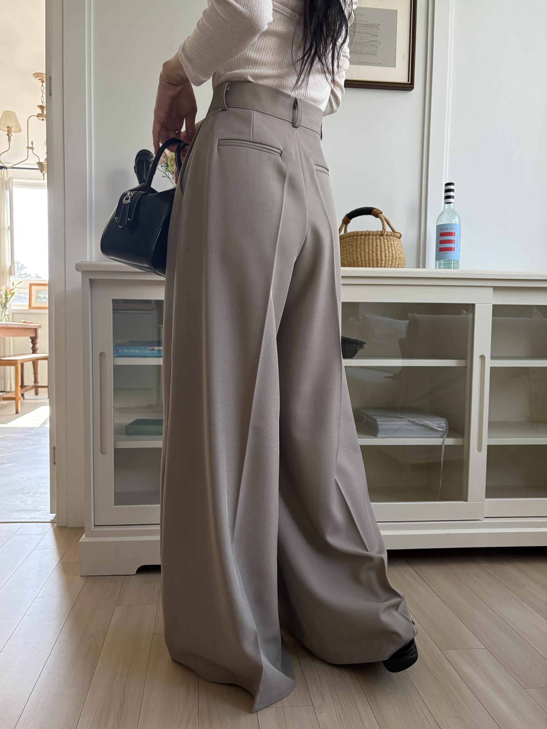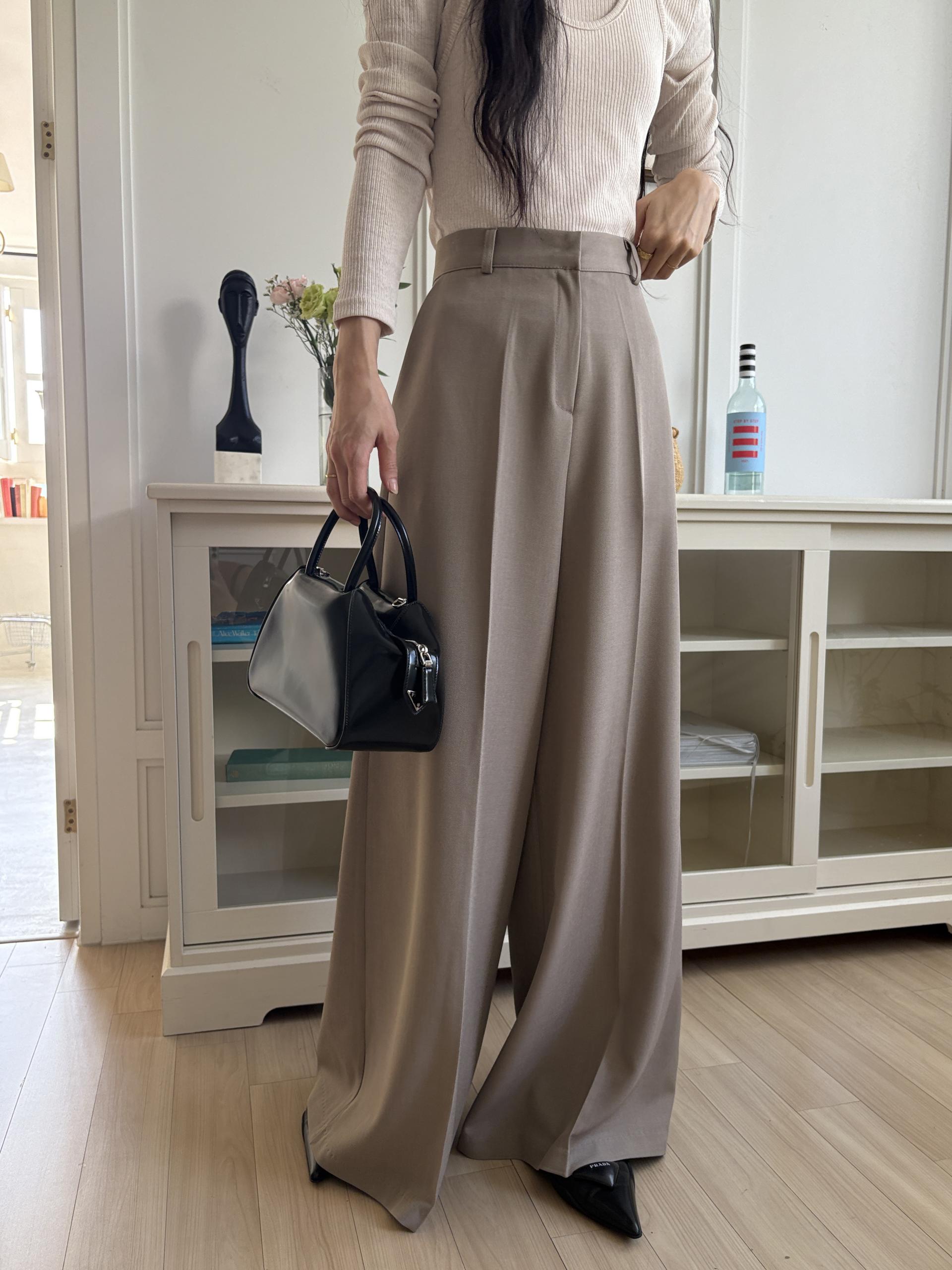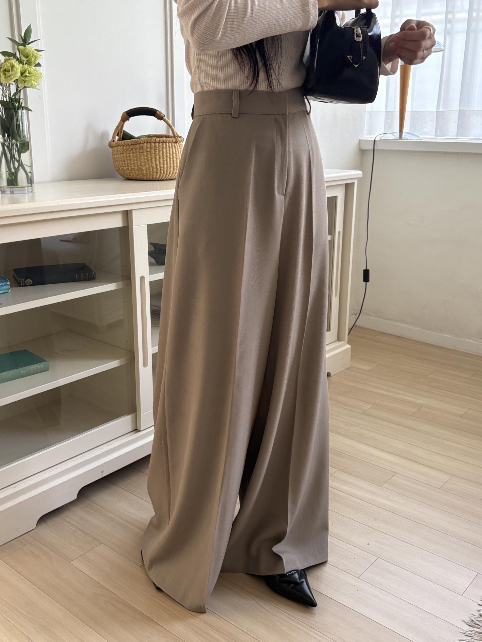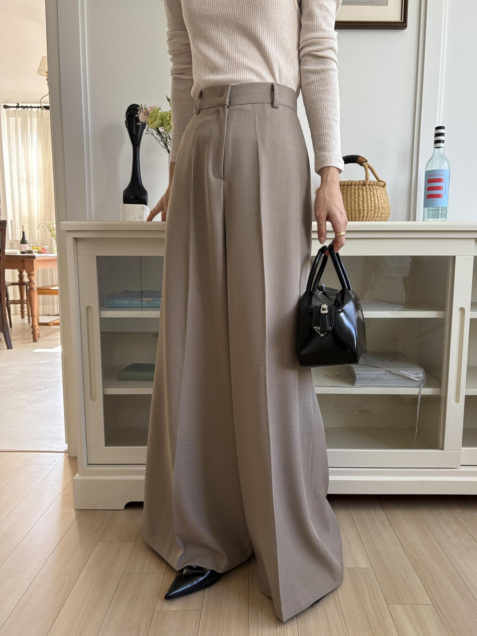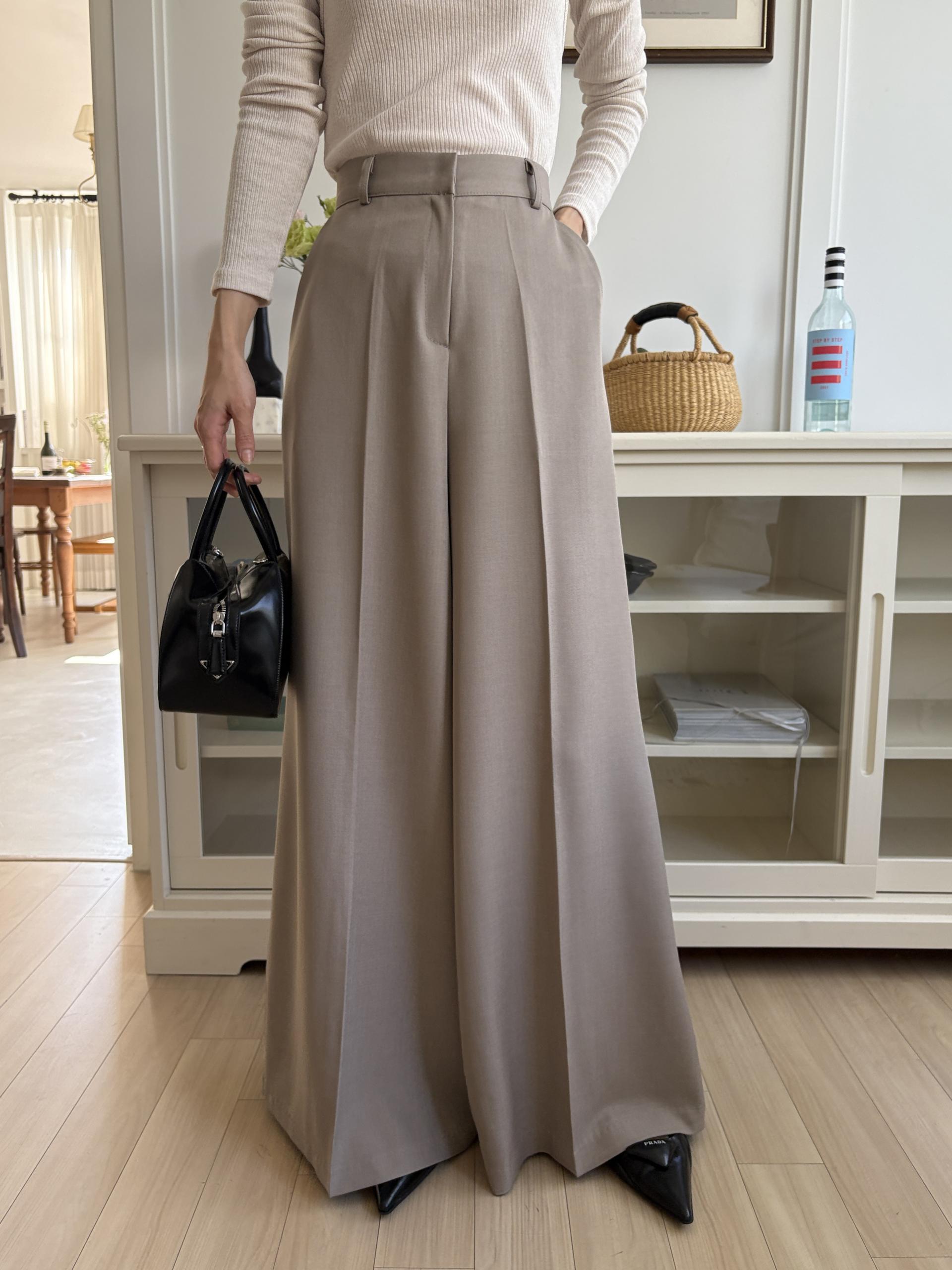 넓은 웨이스트 밴드에 하이웨스트 밑위로 좁은 허리부터 시작해 플레어 핏으로 넓게 퍼지는 핏이며, 통이 크지만 착용 시 굉장히 페미닌한 무드의 슬랙스에요.
