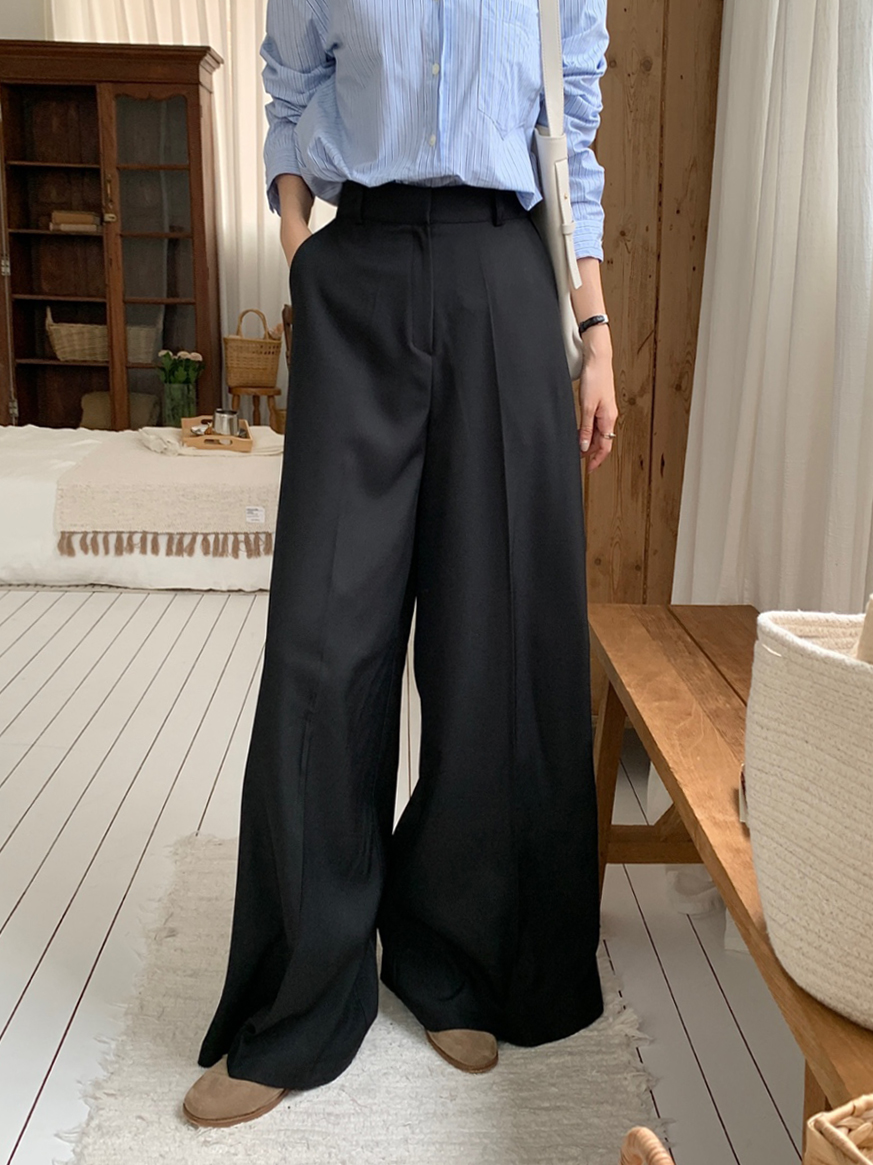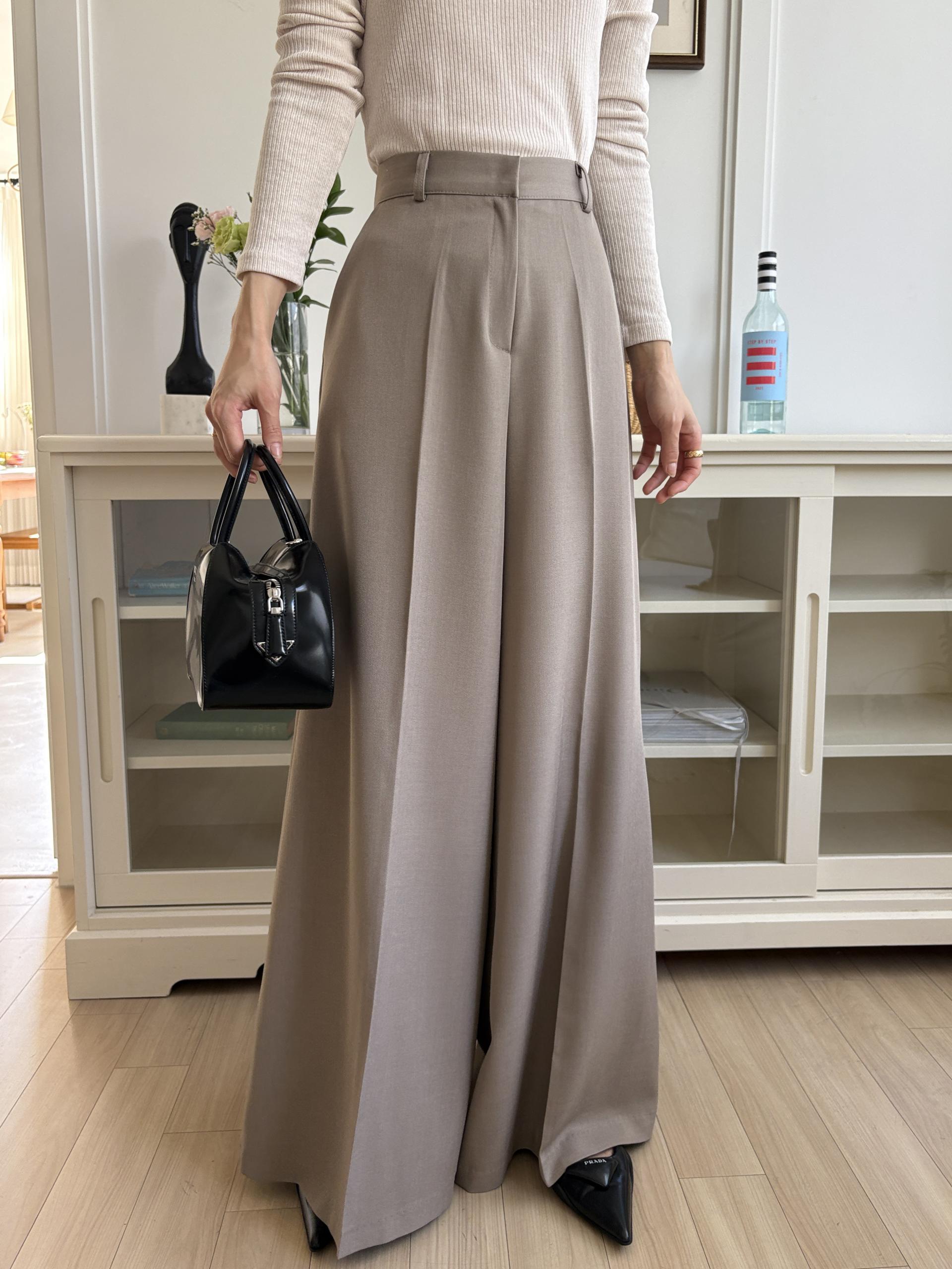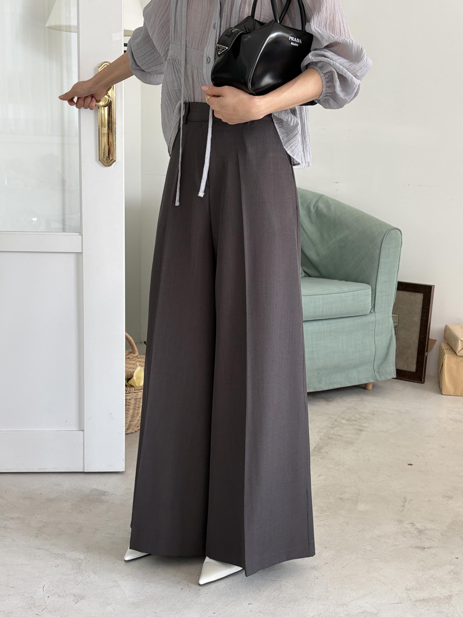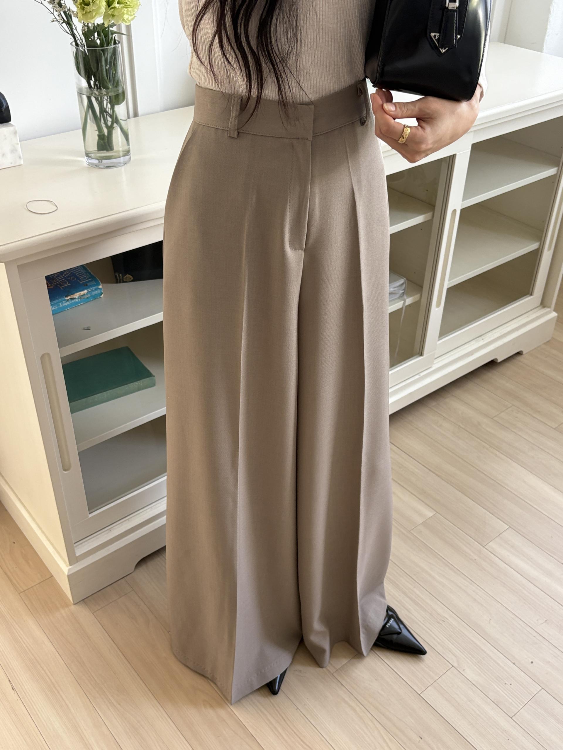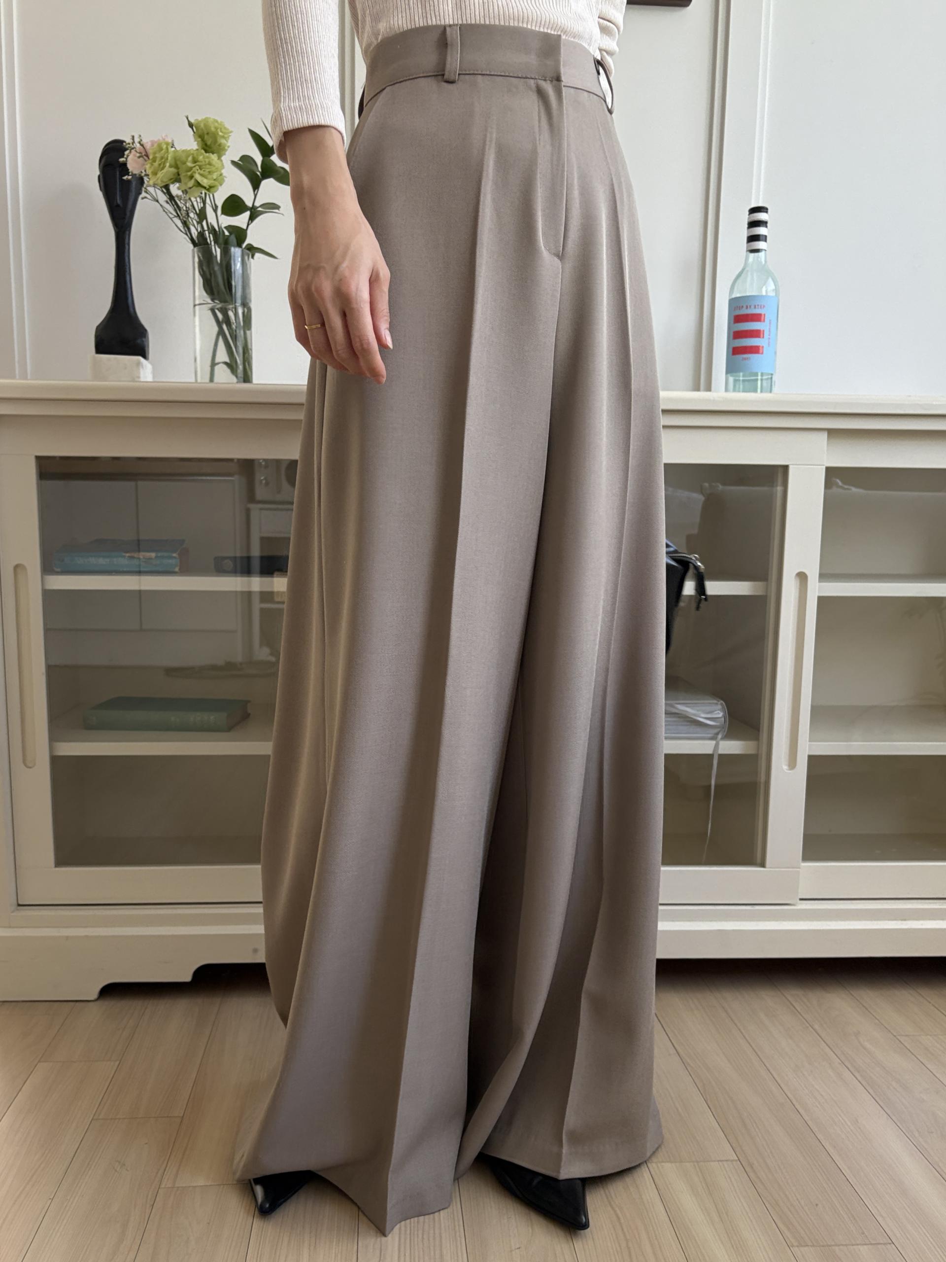 넓은 웨이스트 밴드에 하이웨스트 밑위로 좁은 허리부터 시작해 플레어 핏으로 넓게 퍼지는 핏이며, 통이 크지만 착용 시 굉장히 페미닌한 무드의 슬랙스에요.