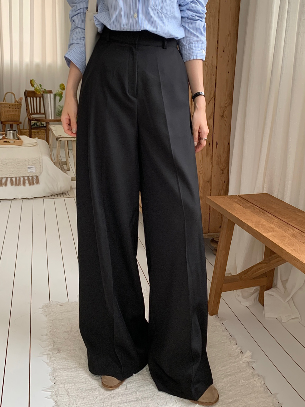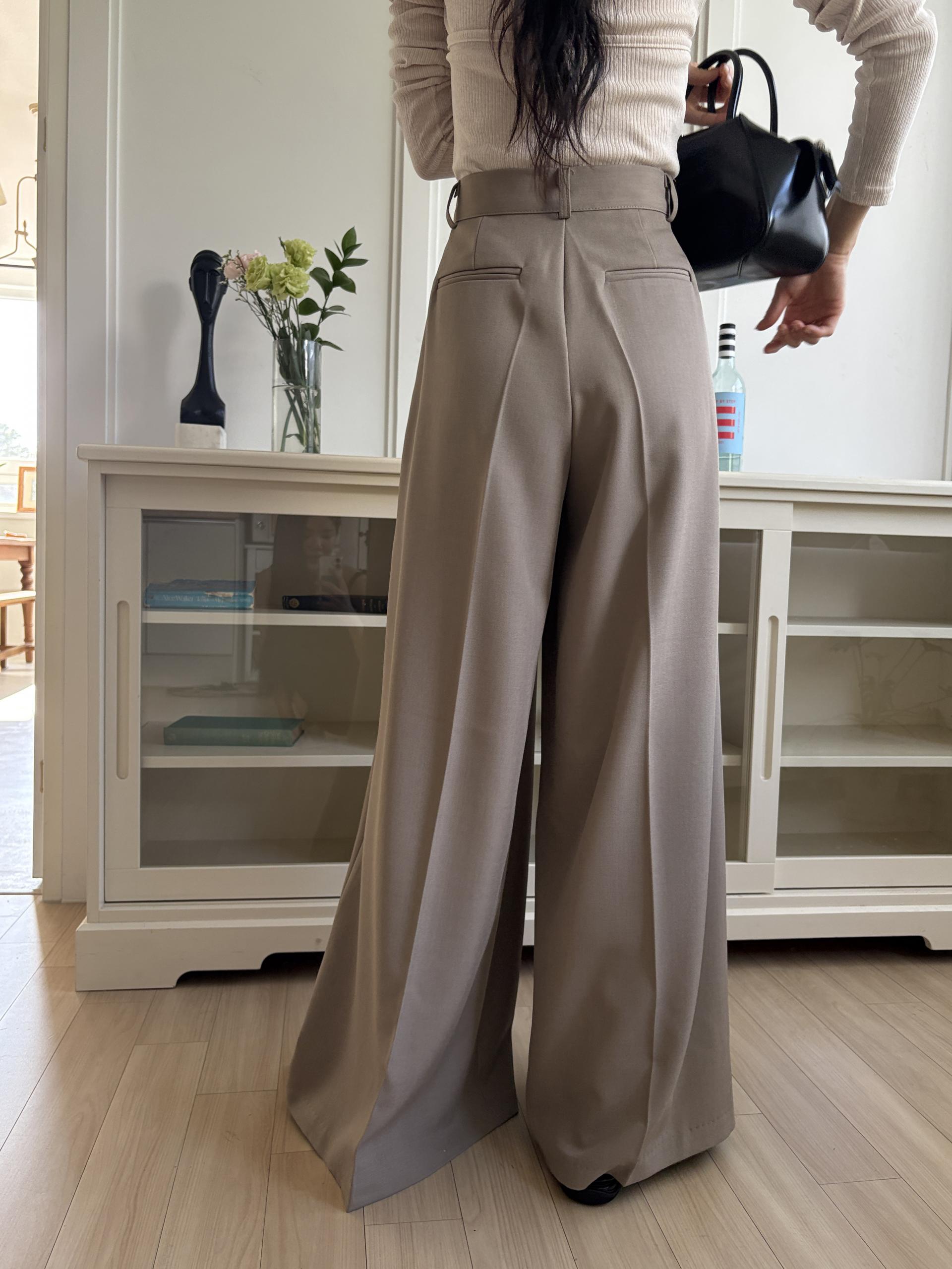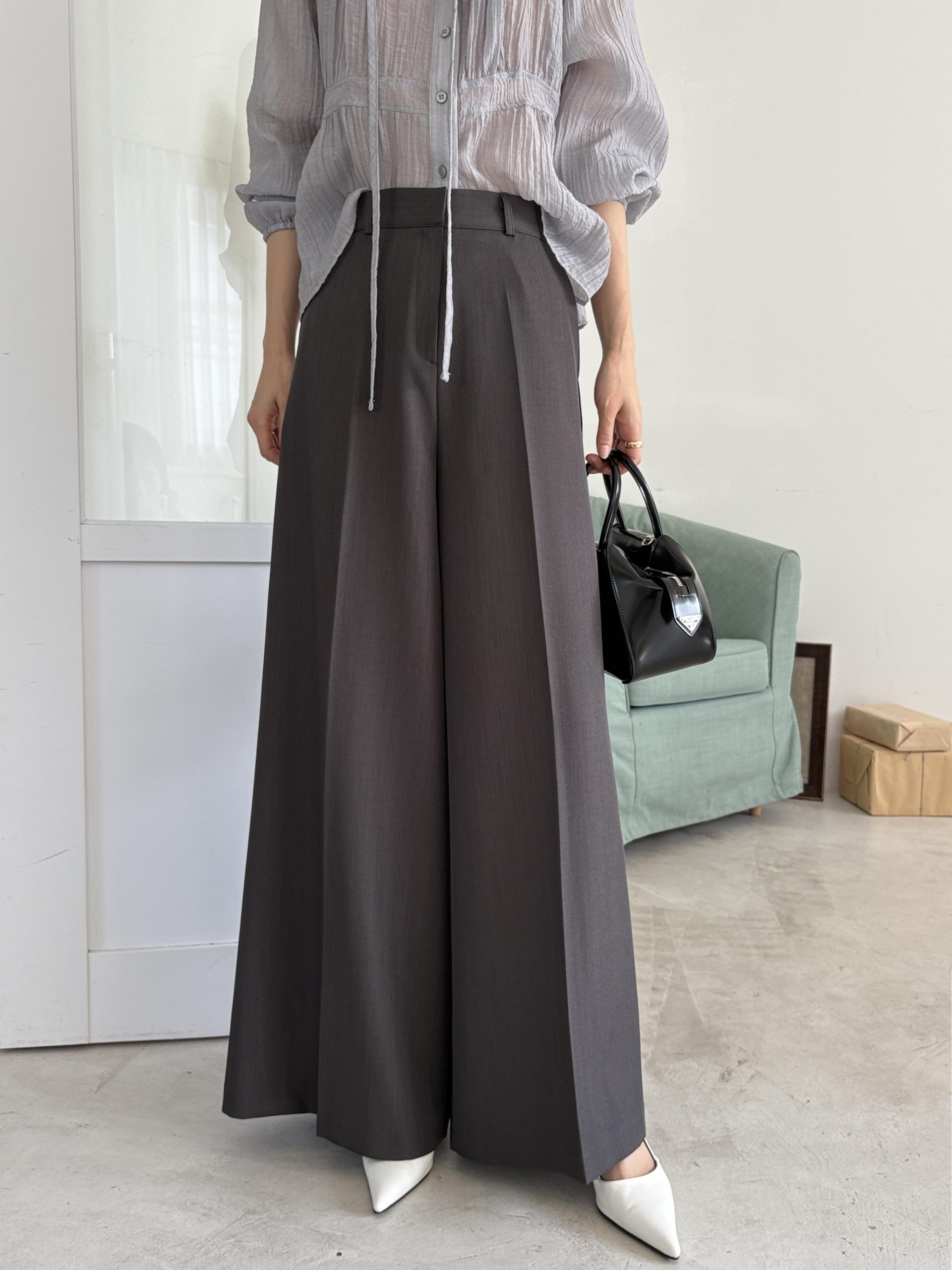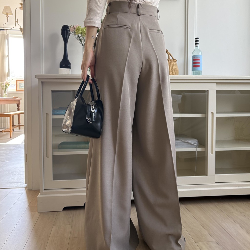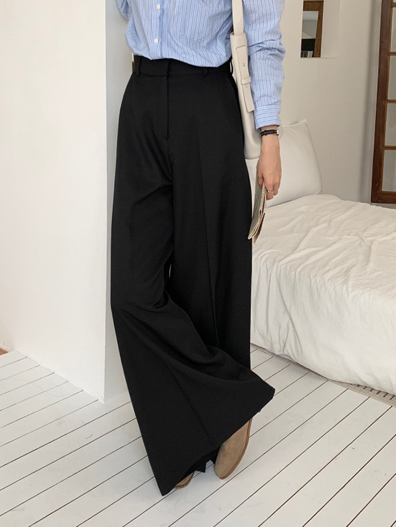 넓은 웨이스트 밴드에 하이웨스트 밑위로 좁은 허리부터 시작해 플레어 핏으로 넓게 퍼지는 핏이며, 통이 크지만 착용 시 굉장히 페미닌한 무드의 슬랙스에요.