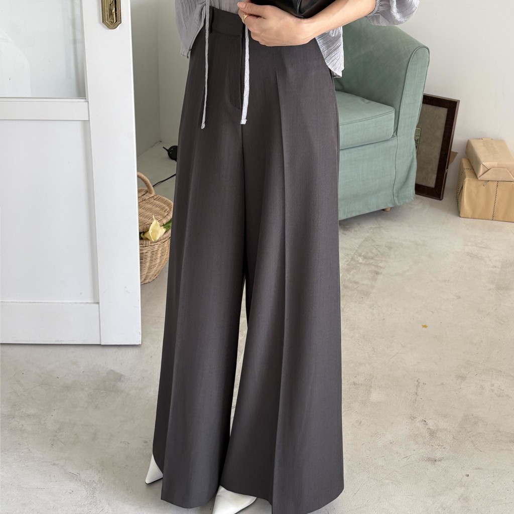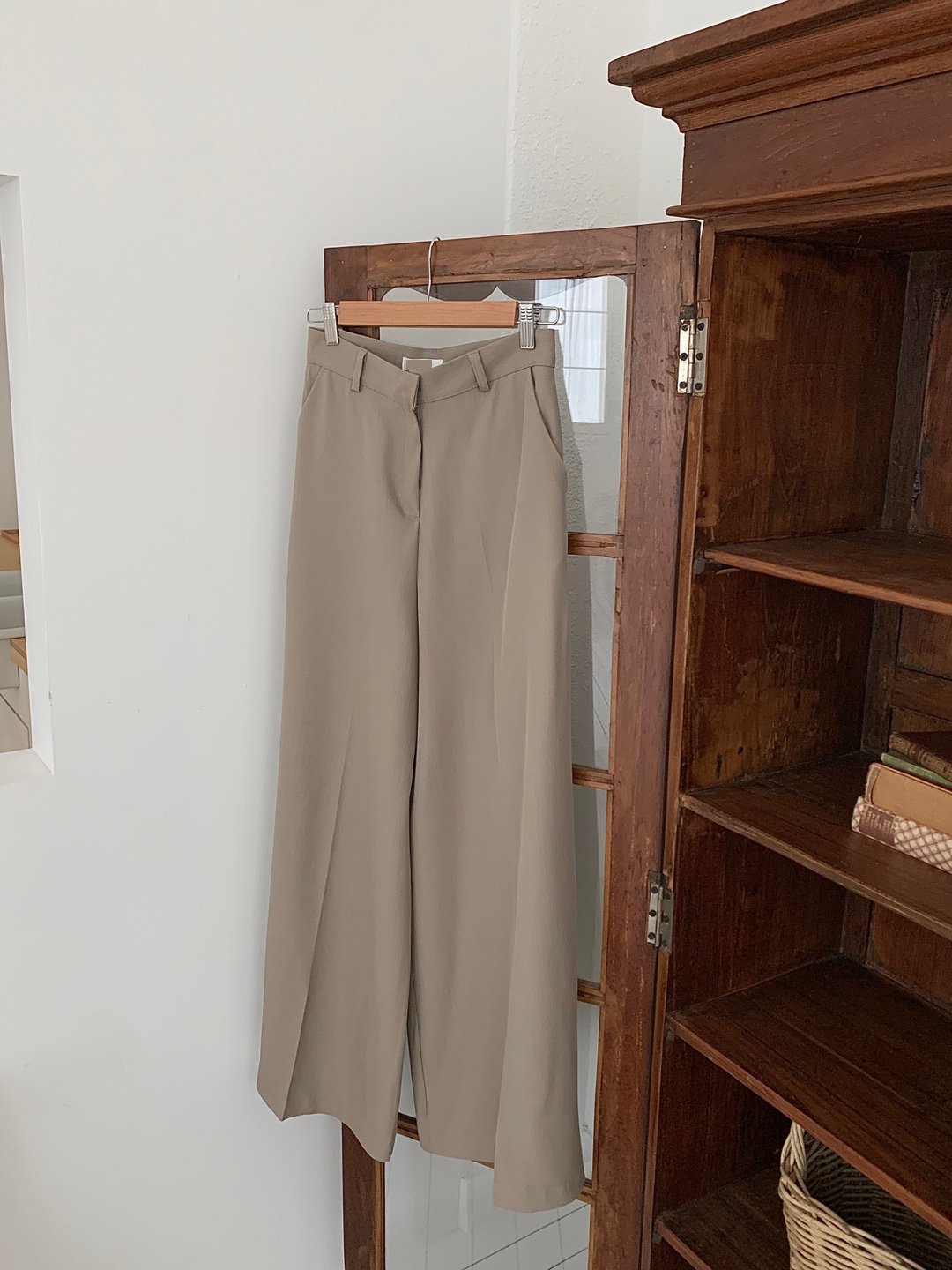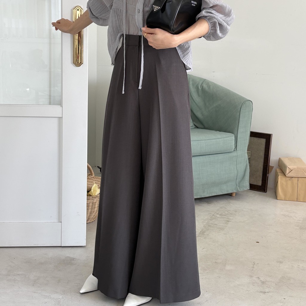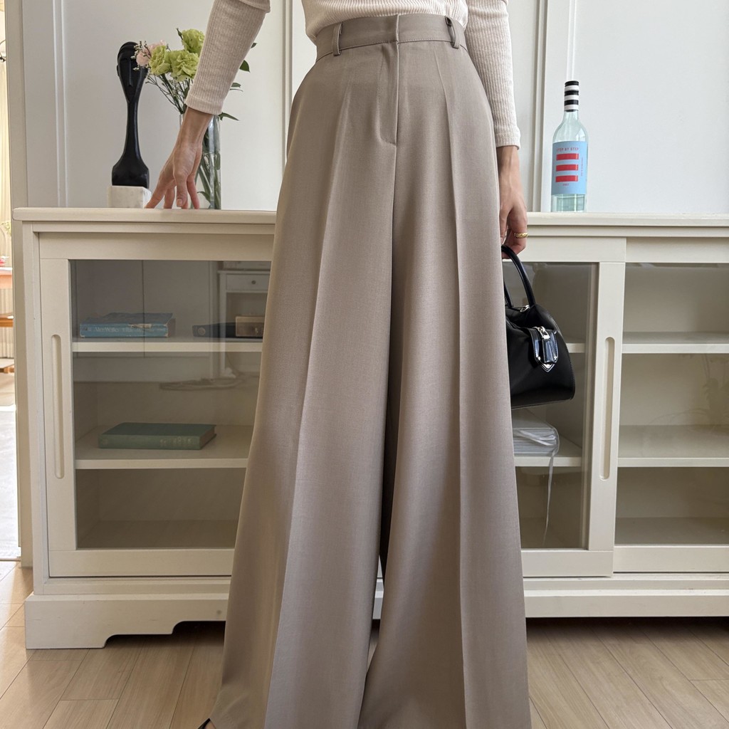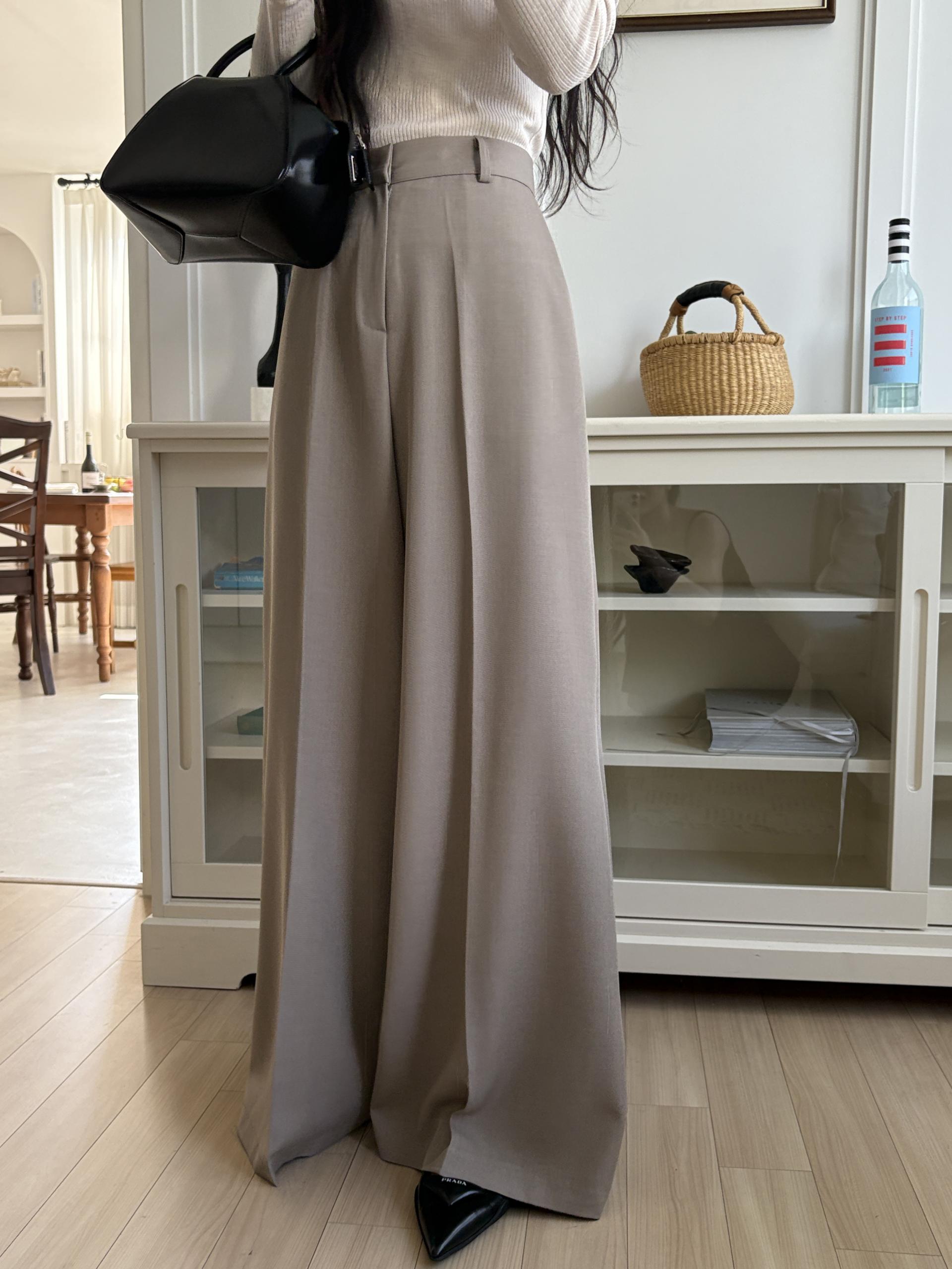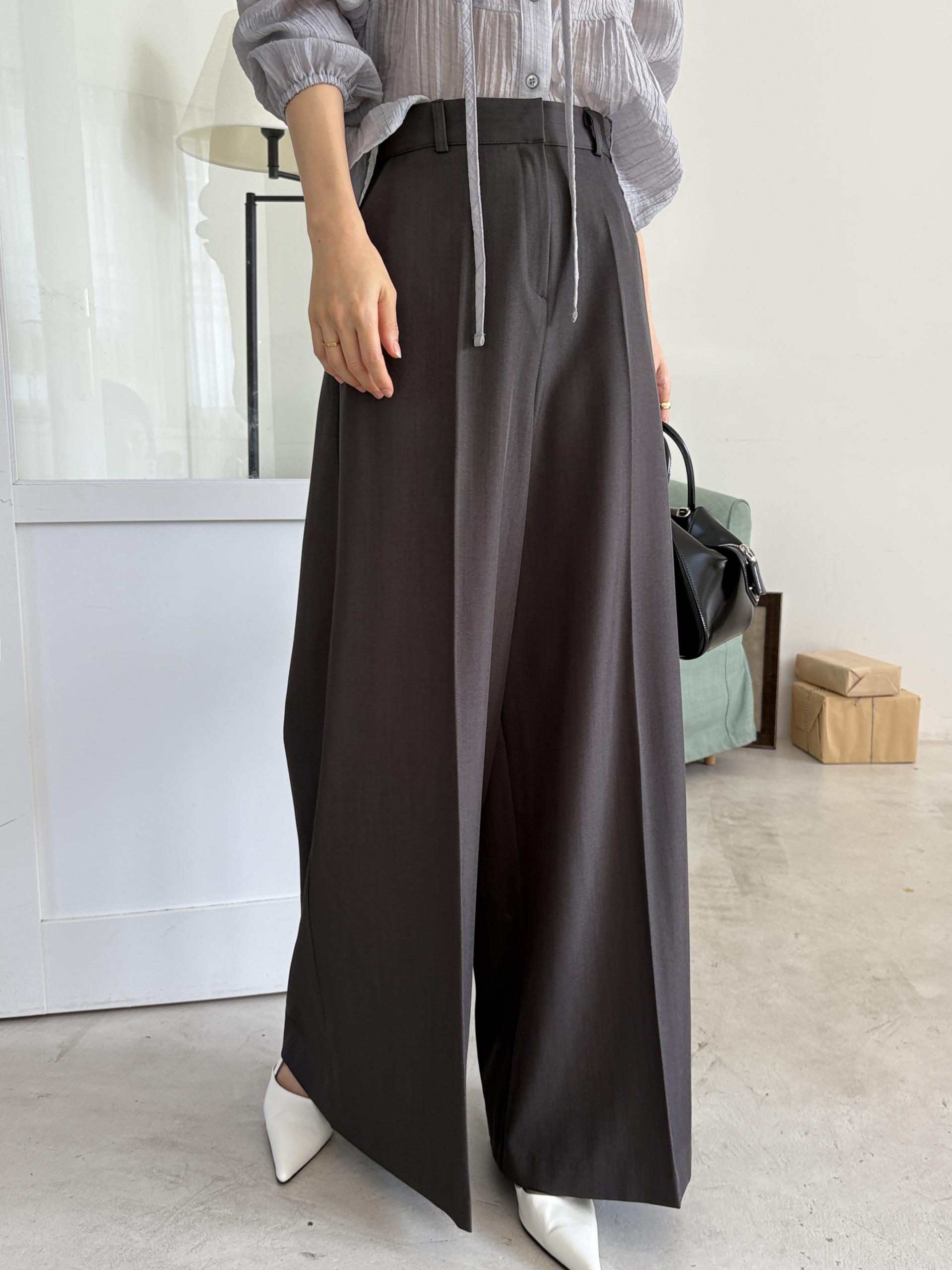 넓은 웨이스트 밴드에 하이웨스트 밑위로 좁은 허리부터 시작해 플레어 핏으로 넓게 퍼지는 핏이며, 통이 크지만 착용 시 굉장히 페미닌한 무드의 슬랙스에요.