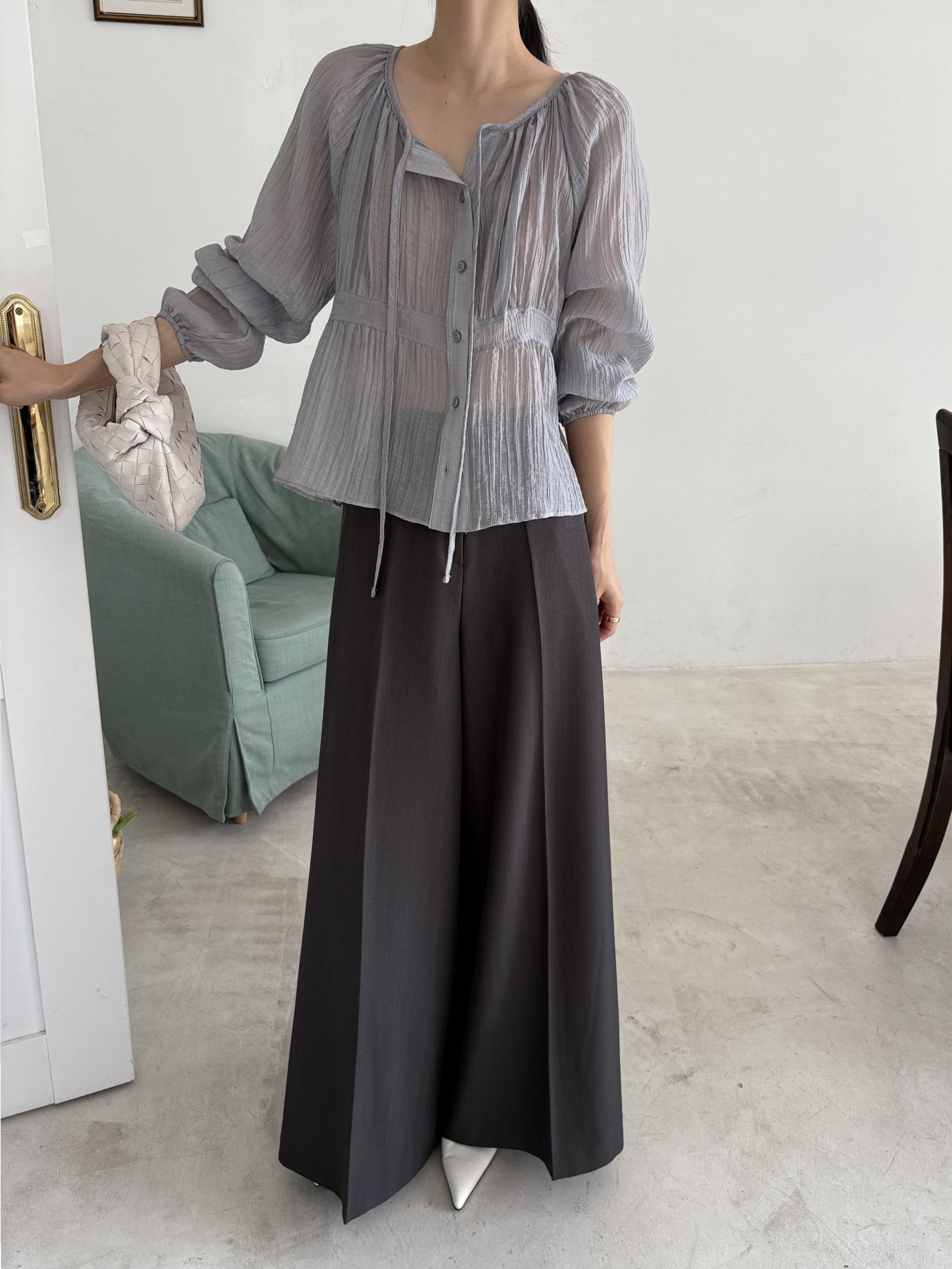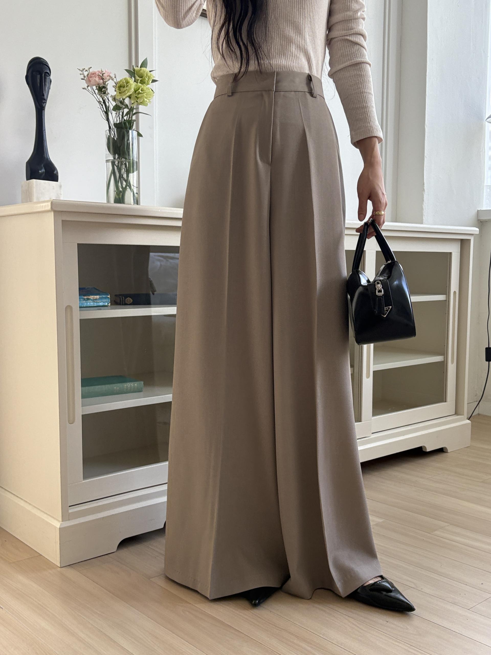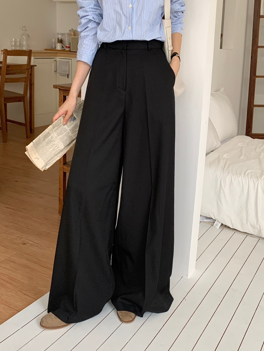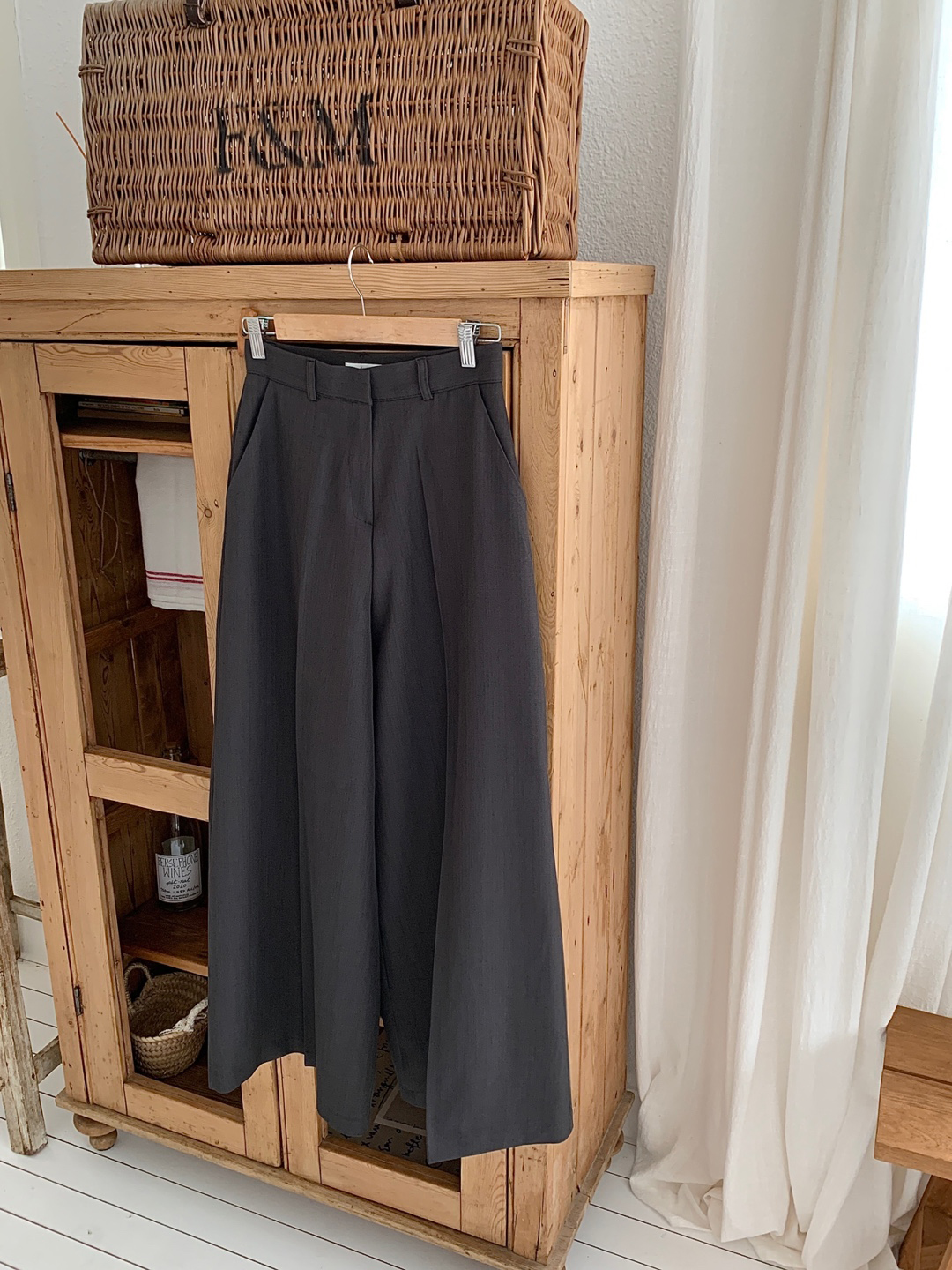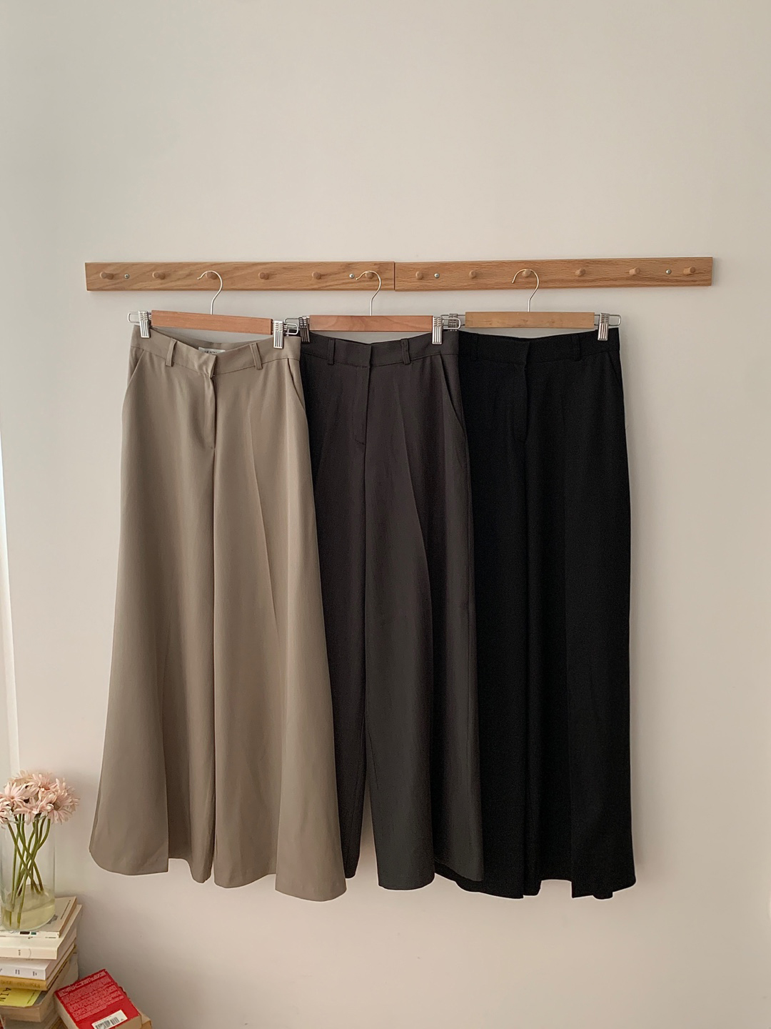 넓은 웨이스트 밴드에 하이웨스트 밑위로 좁은 허리부터 시작해 플레어 핏으로 넓게 퍼지는 핏이며, 통이 크지만 착용 시 굉장히 페미닌한 무드의 슬랙스에요.