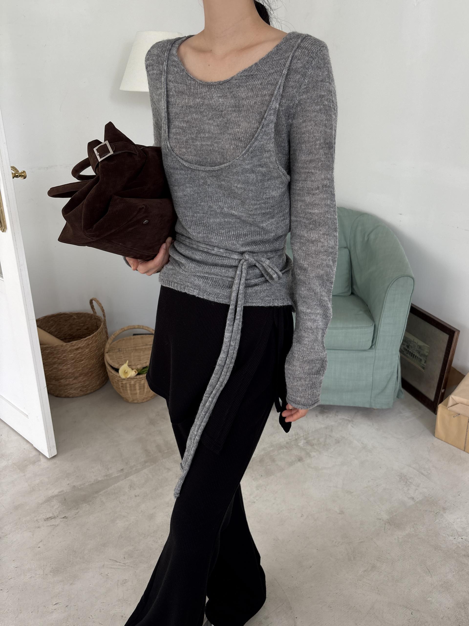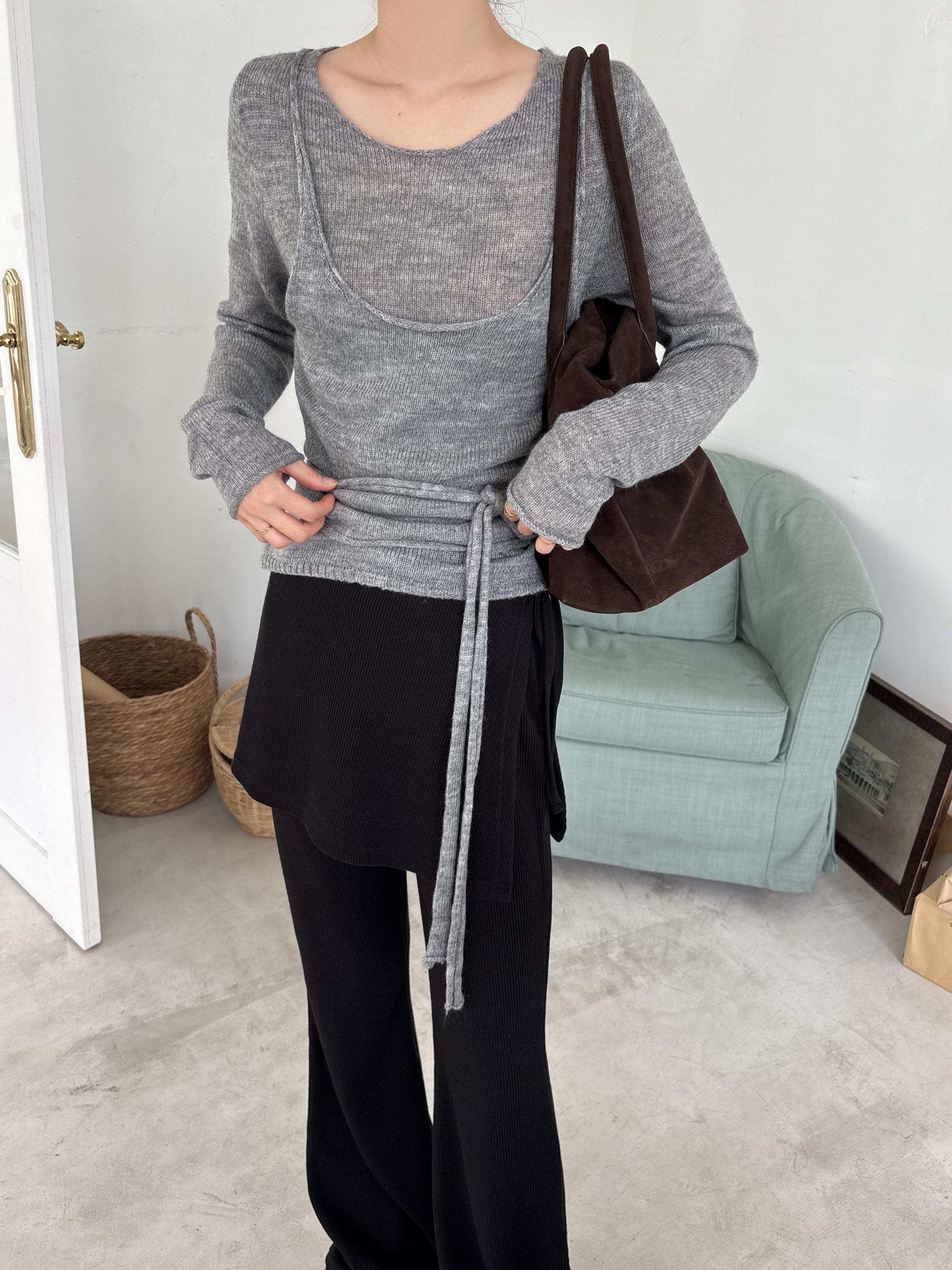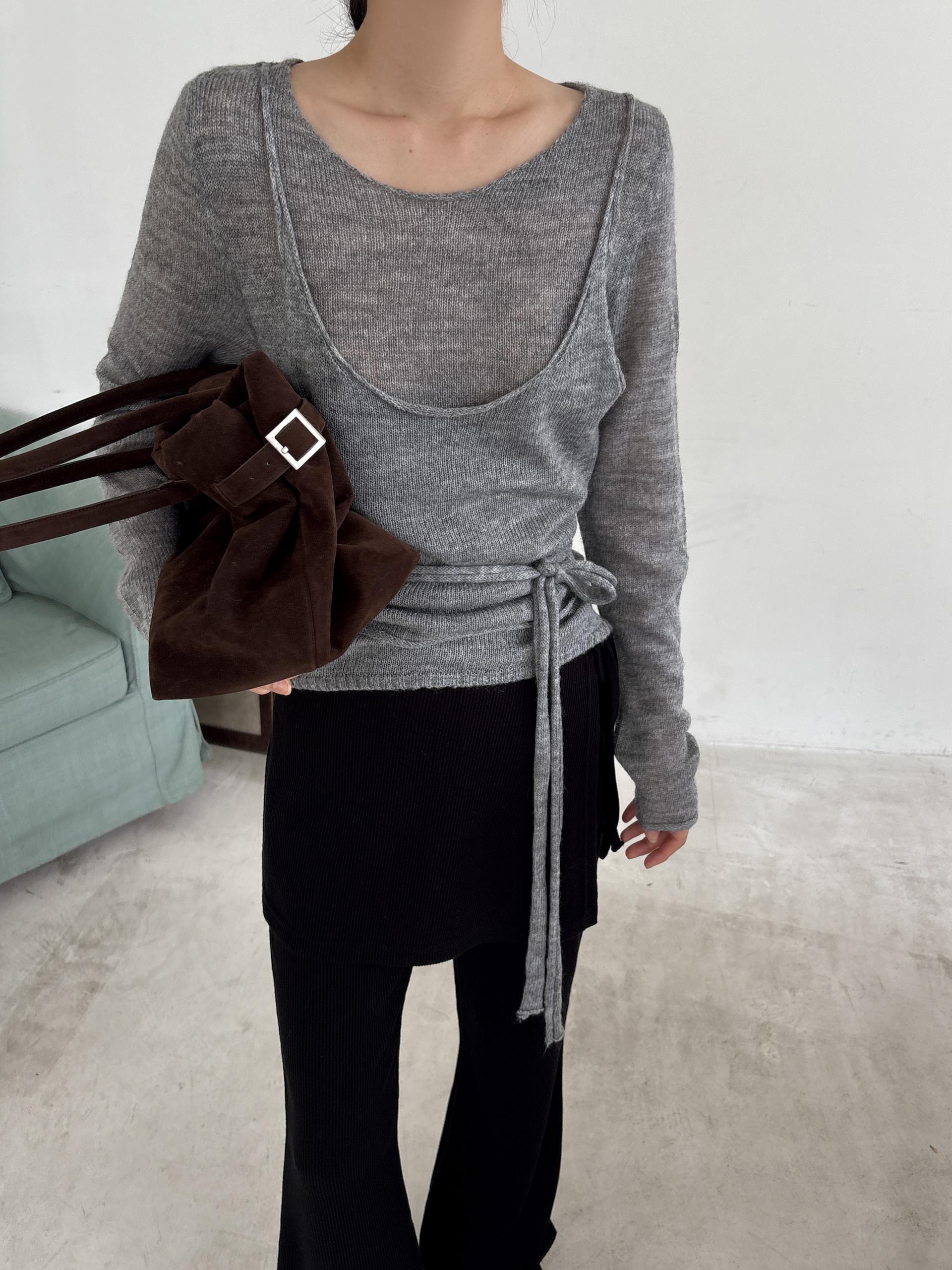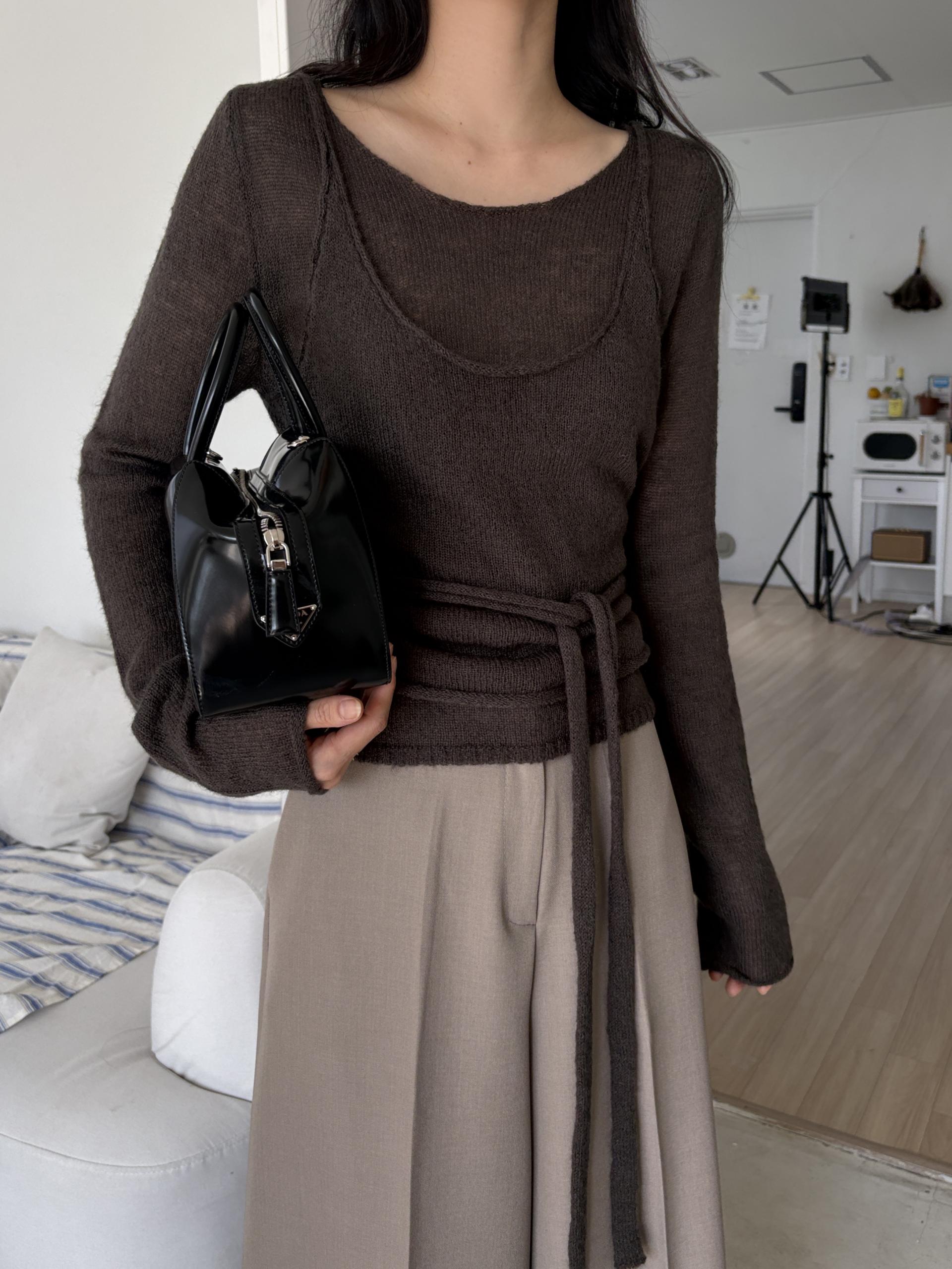 뷔스티에와 허리 스트랩이 부착된 디자인의 니트 티셔츠입니다.