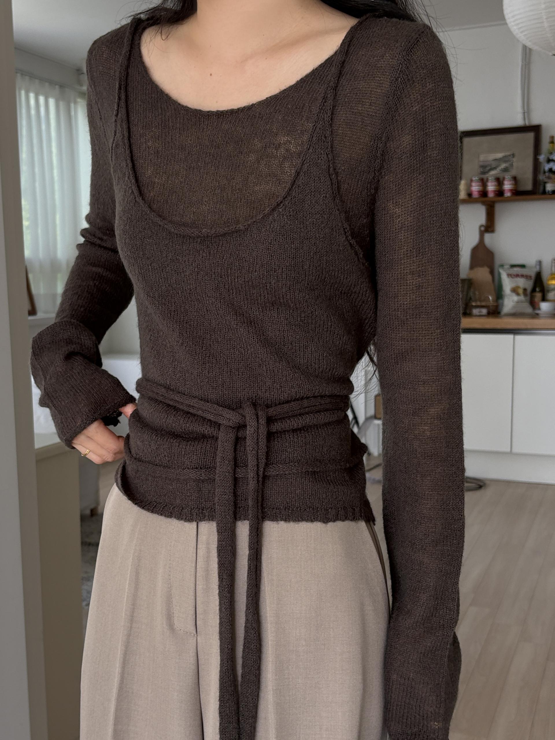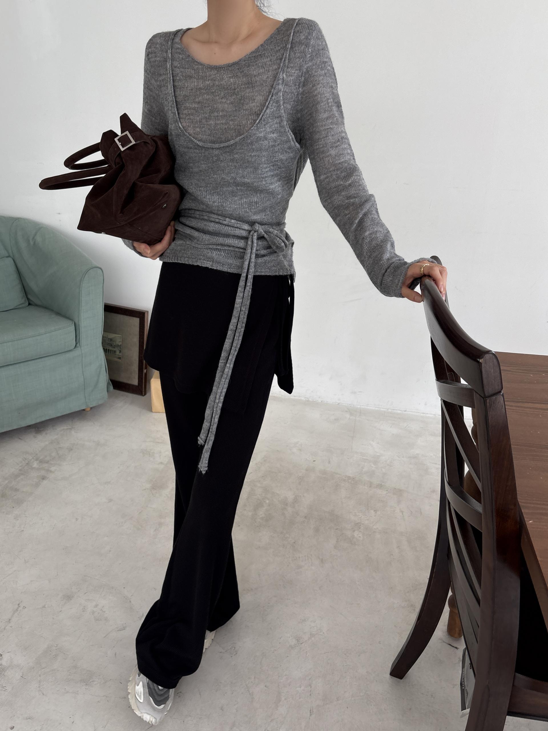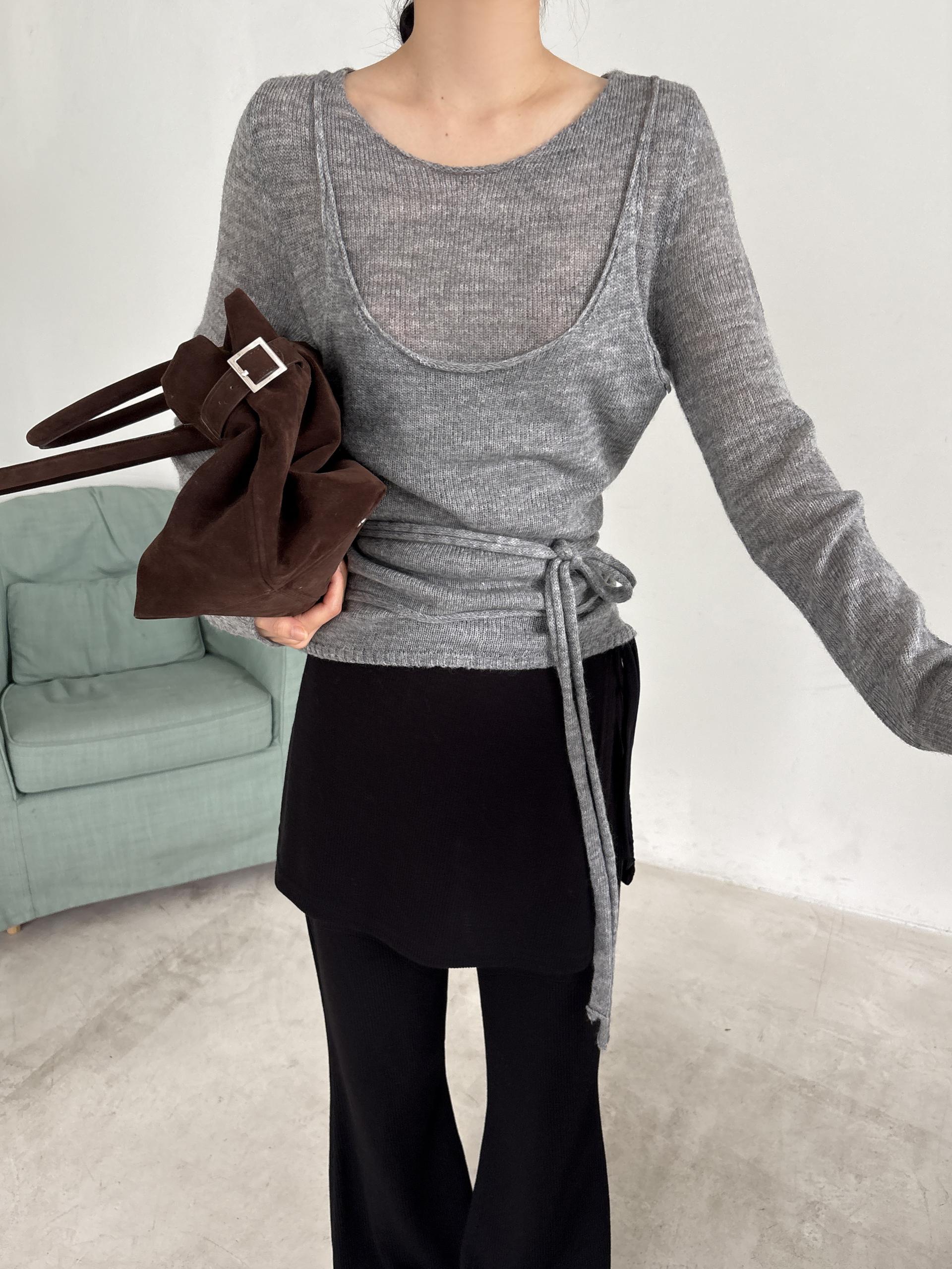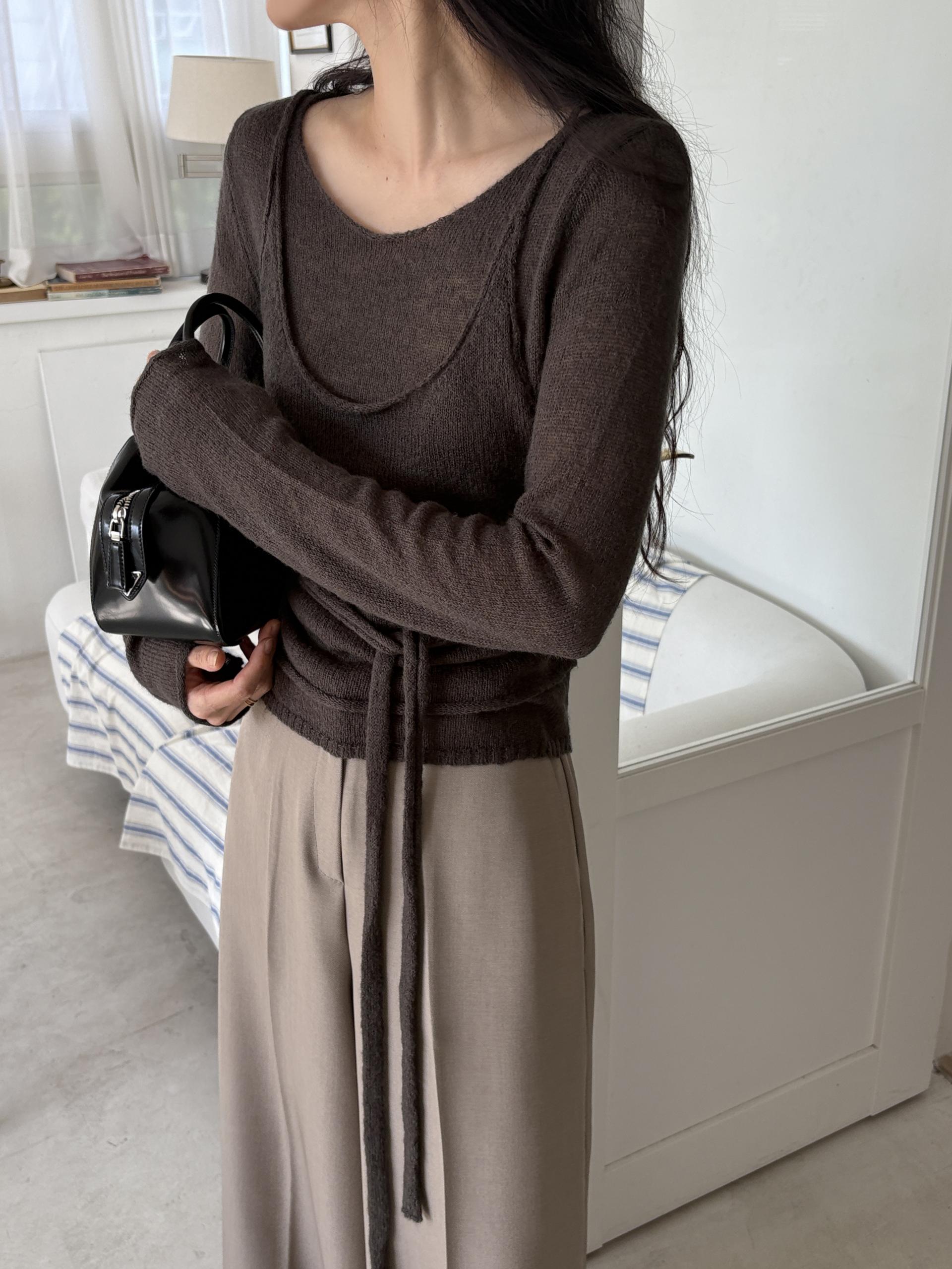 뷔스티에와 허리 스트랩이 부착된 디자인의 니트 티셔츠입니다.