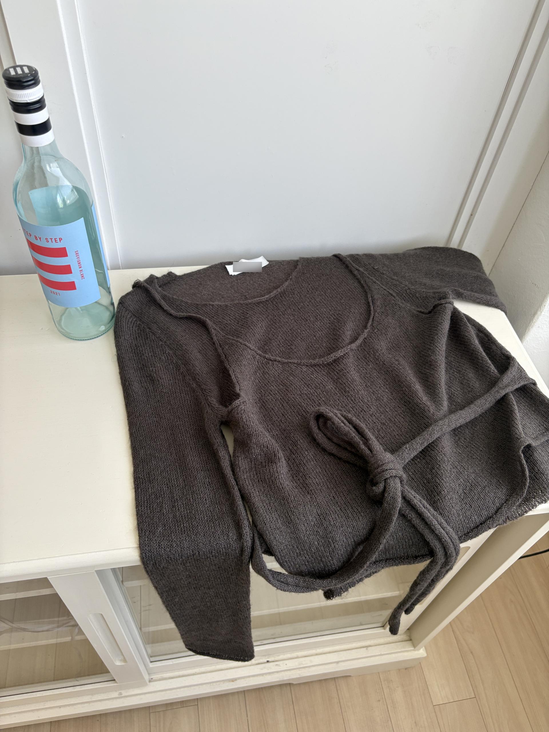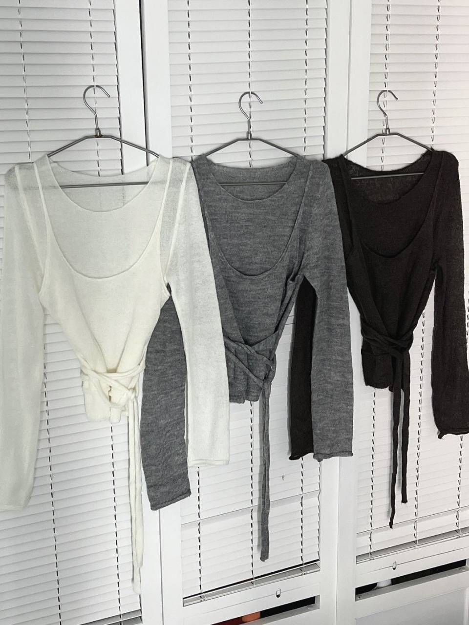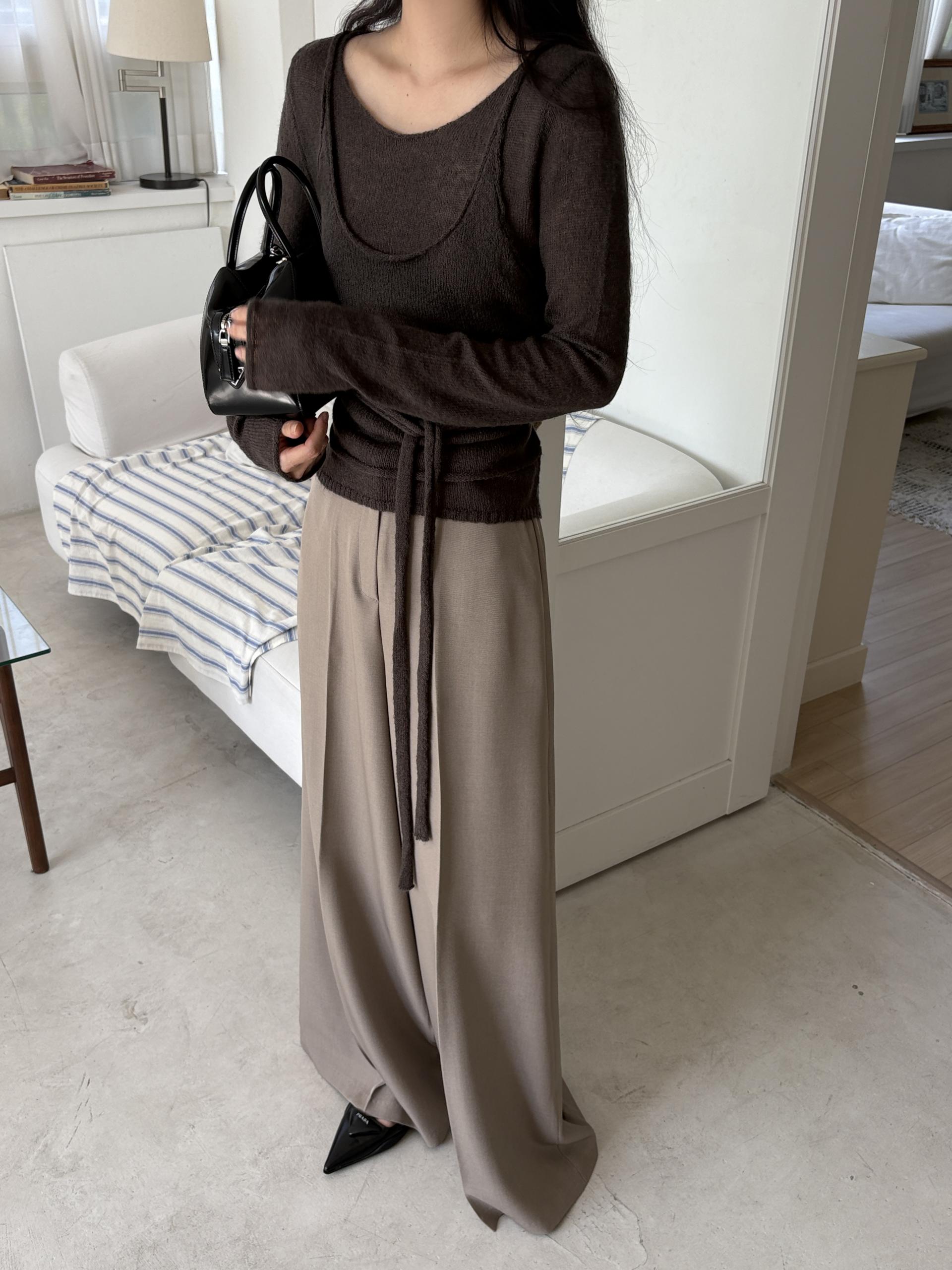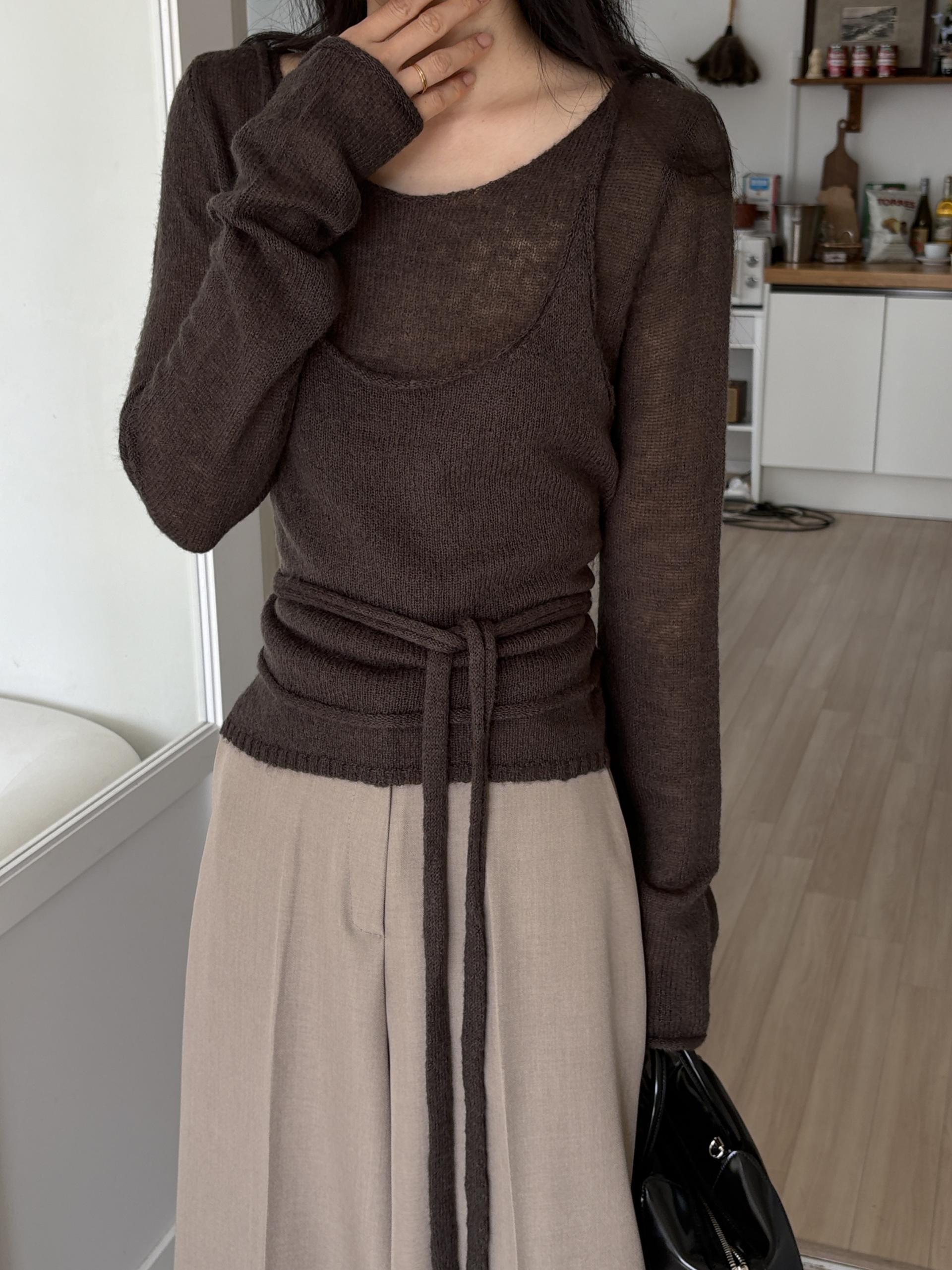뷔스티에와 허리 스트랩이 부착된 디자인의 니트 티셔츠입니다.