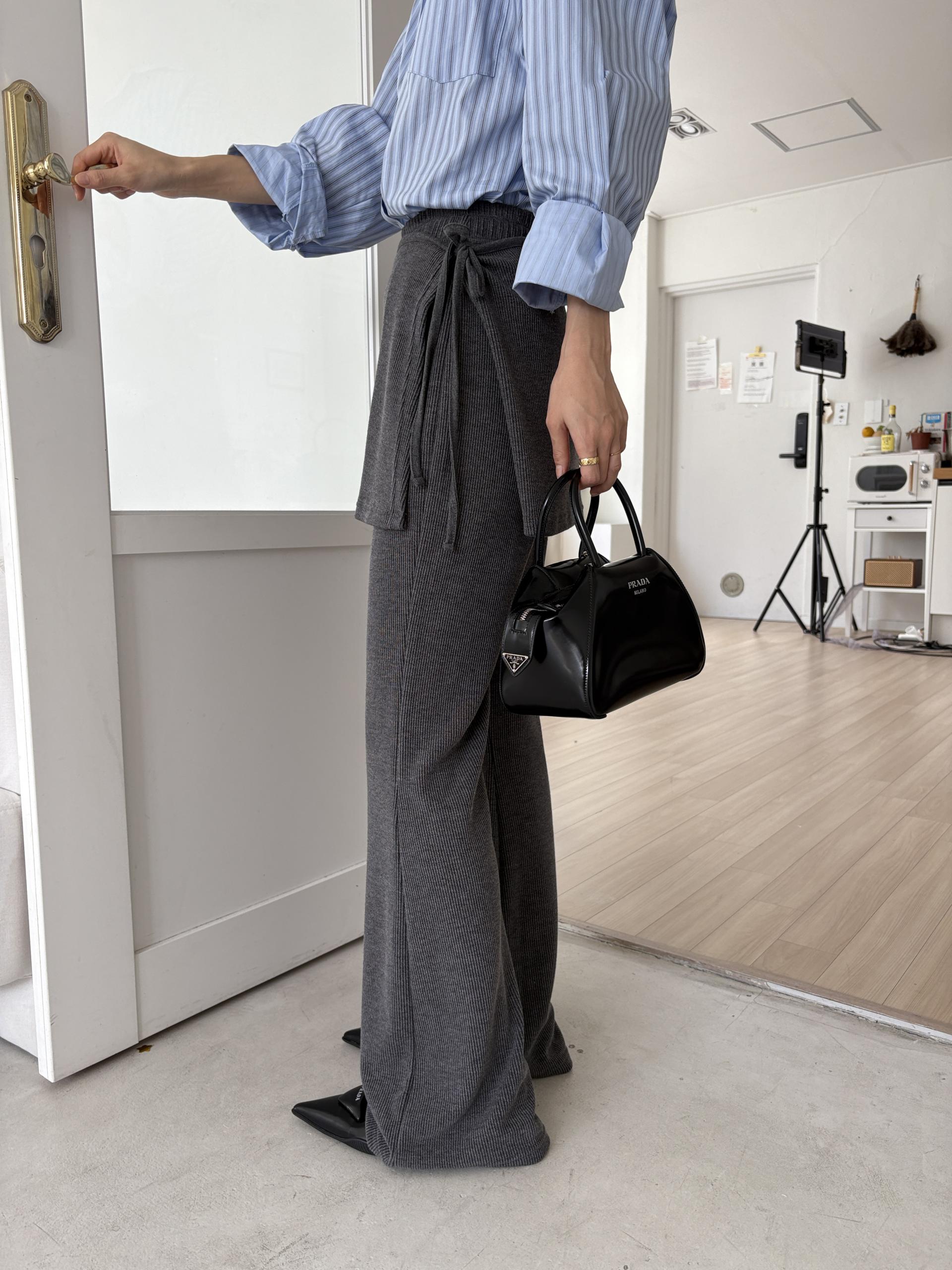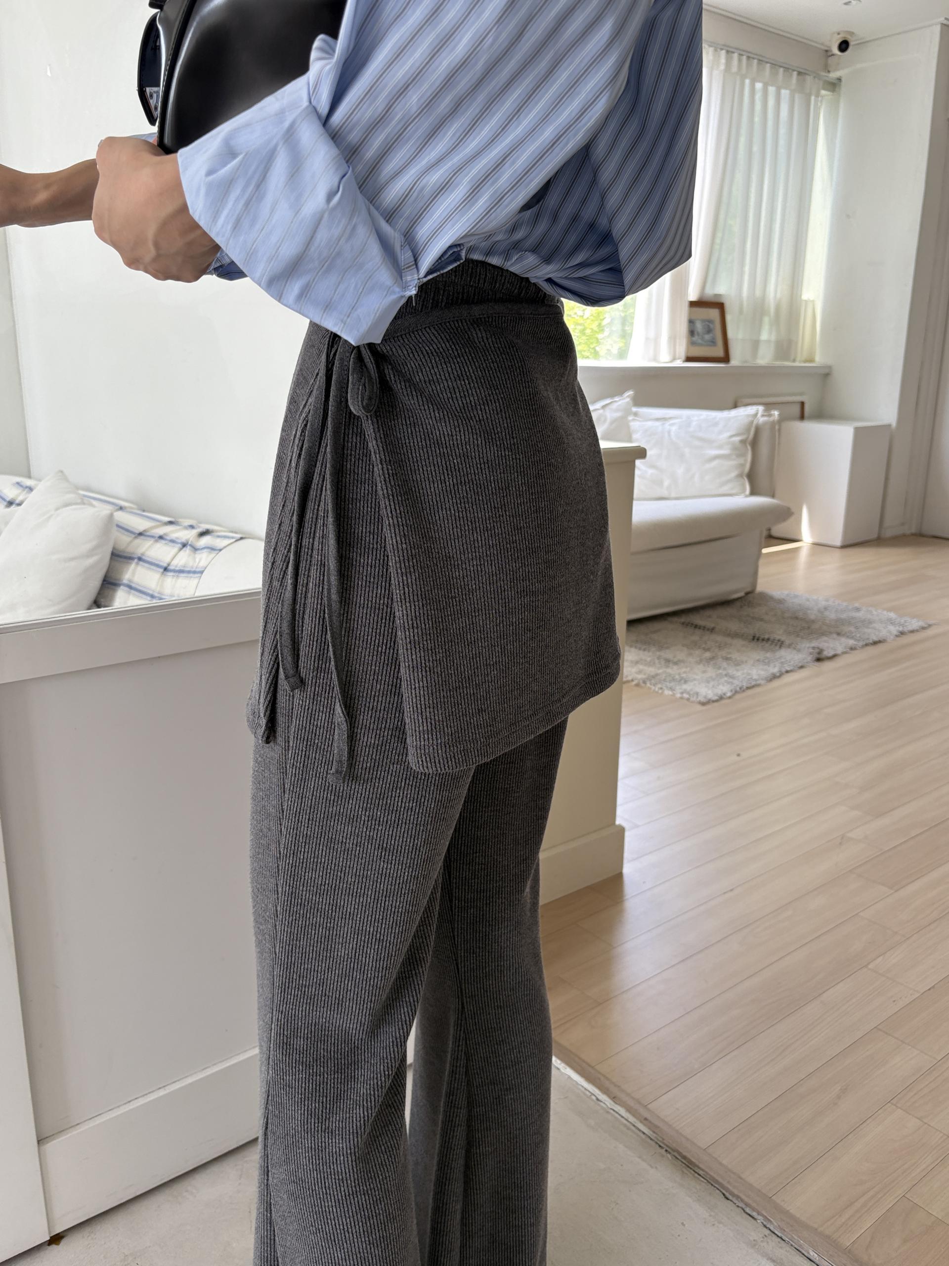 탄탄한 골지 니트 소재에 랩 형태의 레이어드 스커트가 세트인 부츠컷 팬츠입니다.