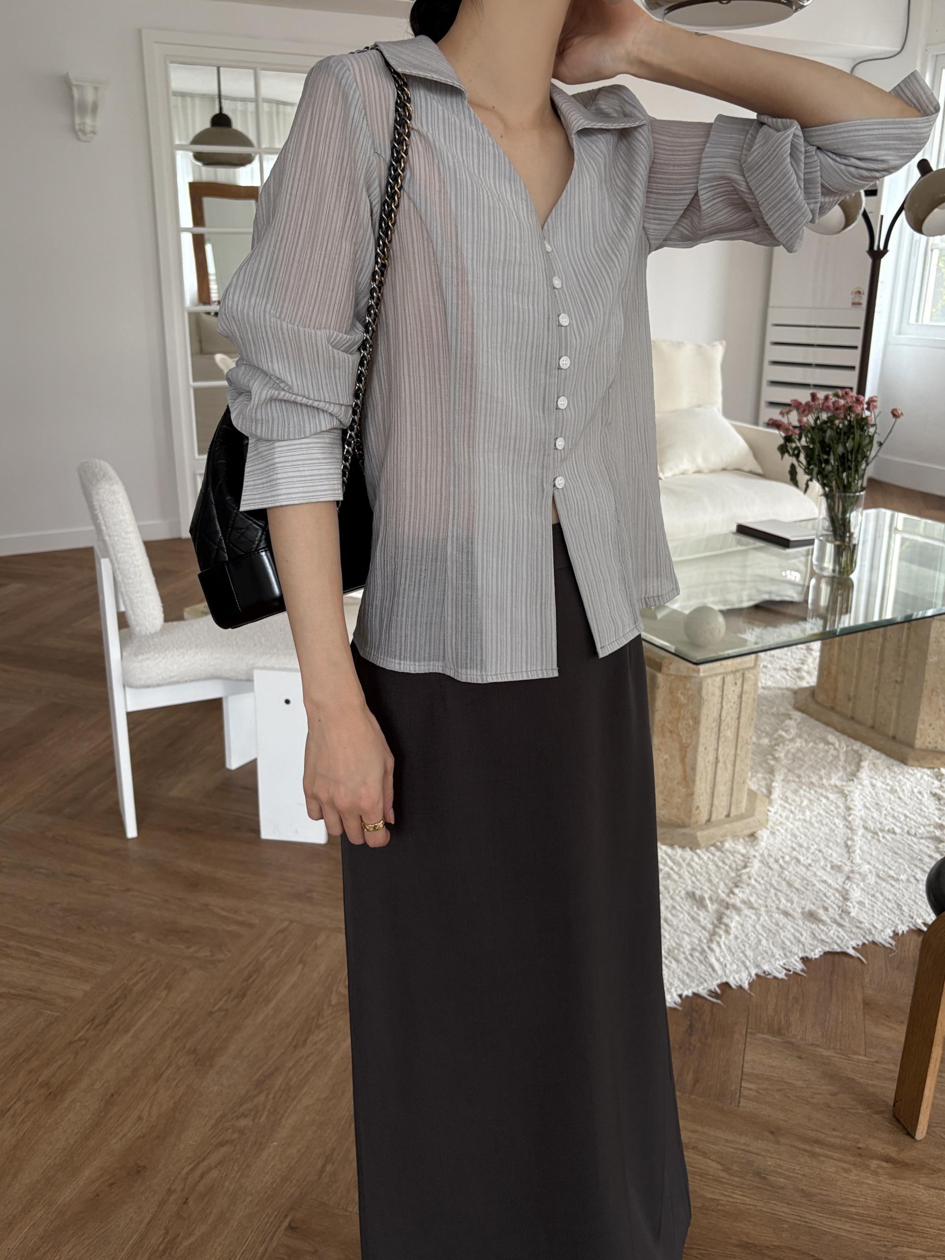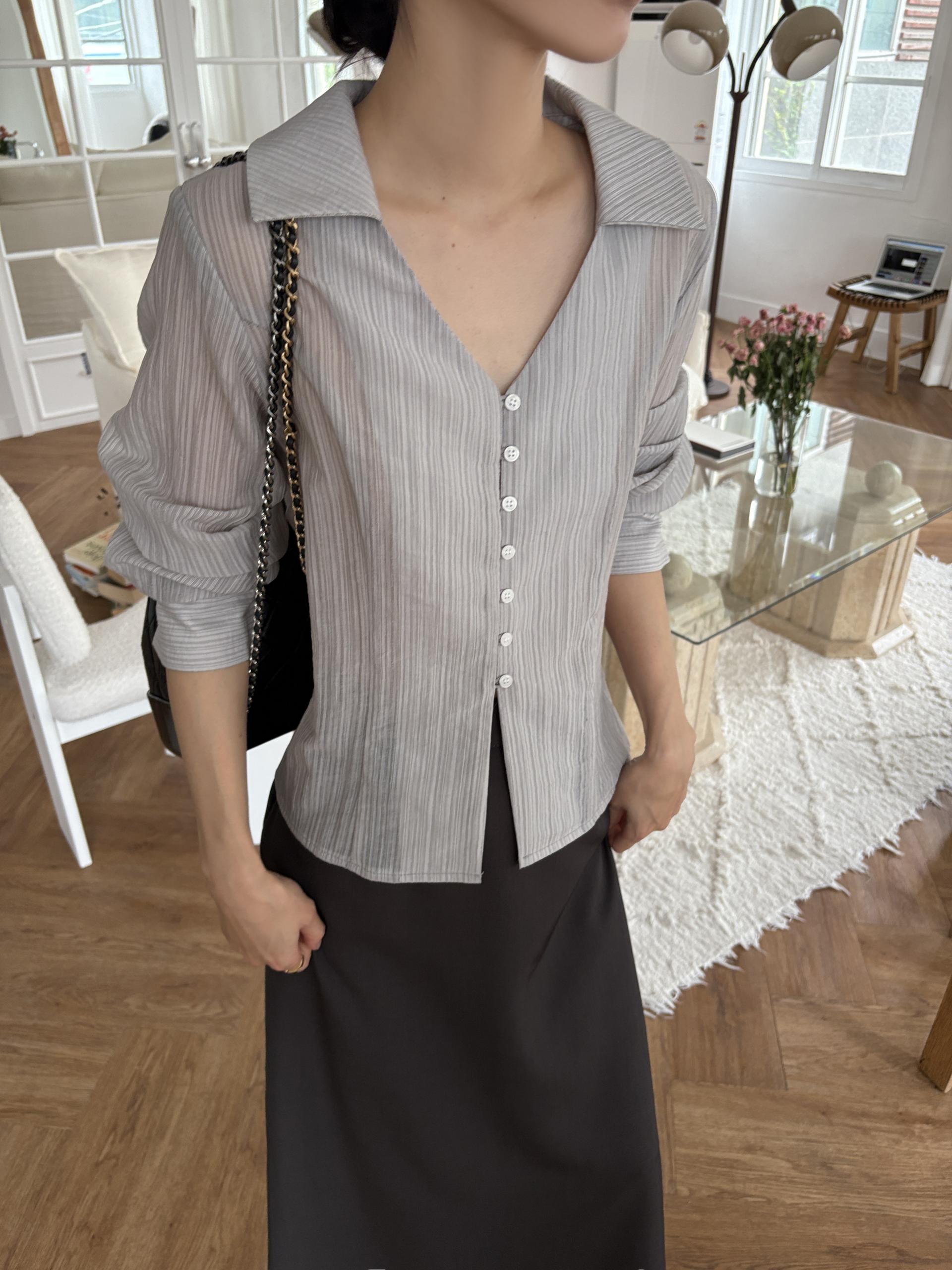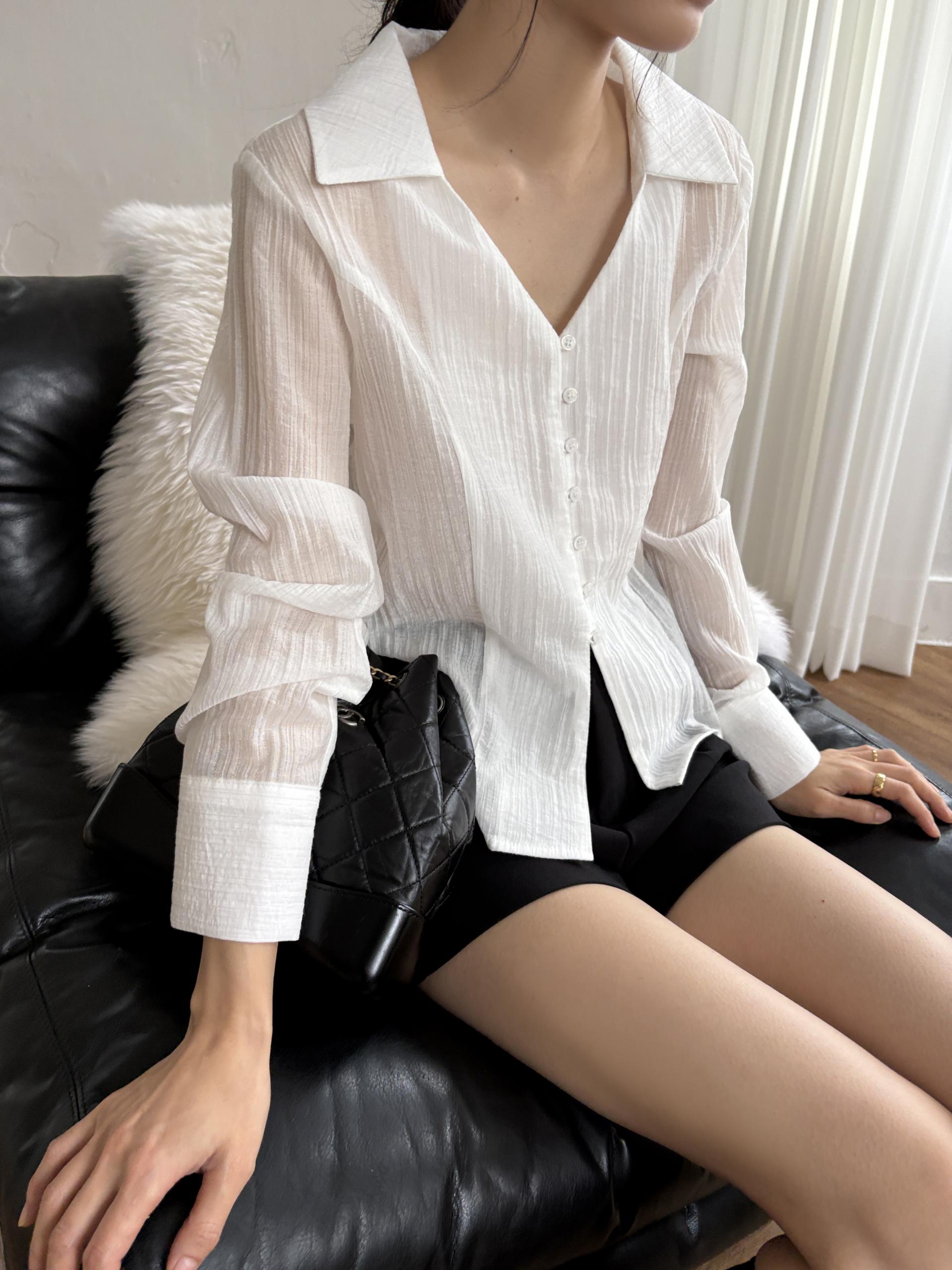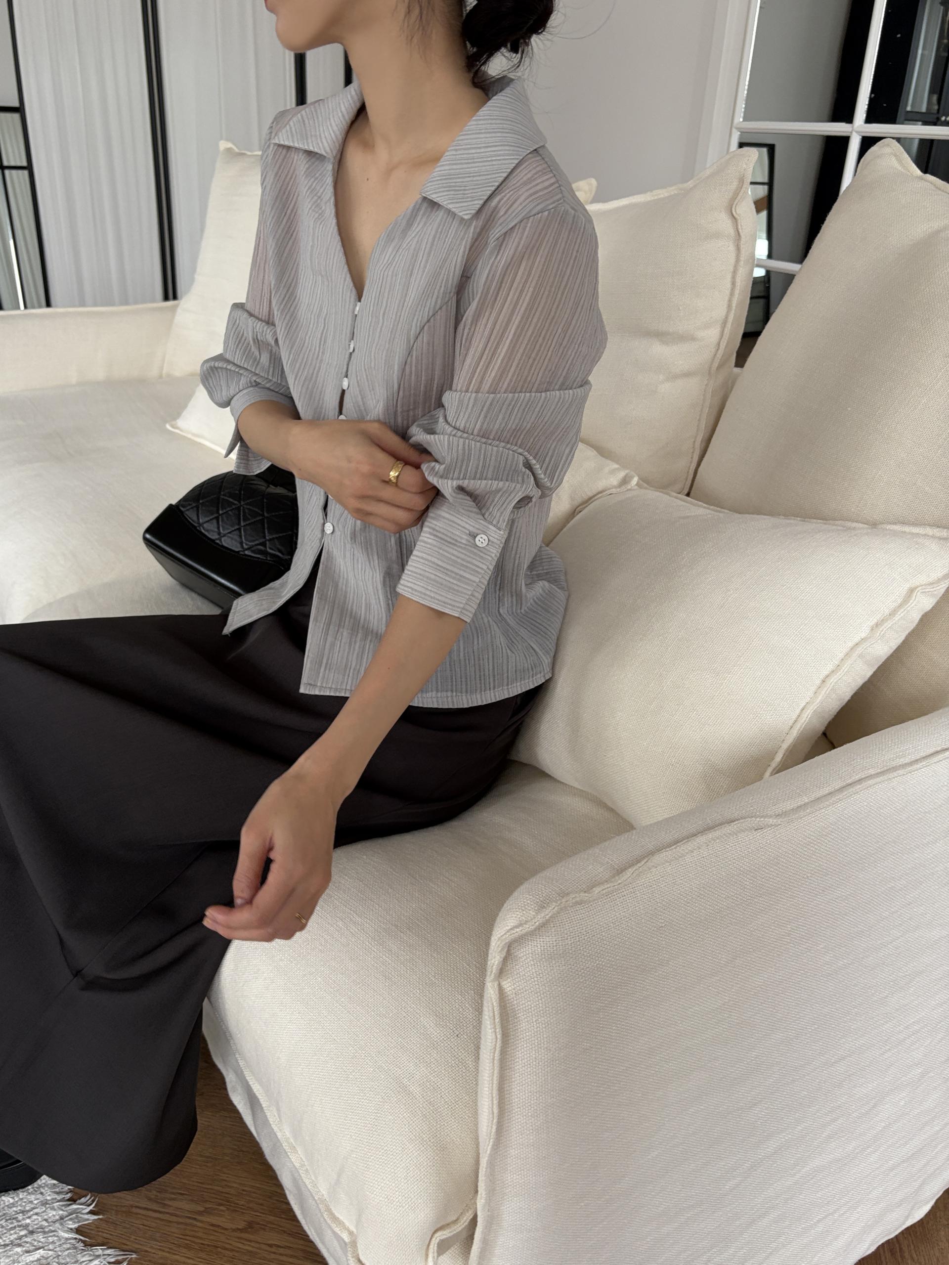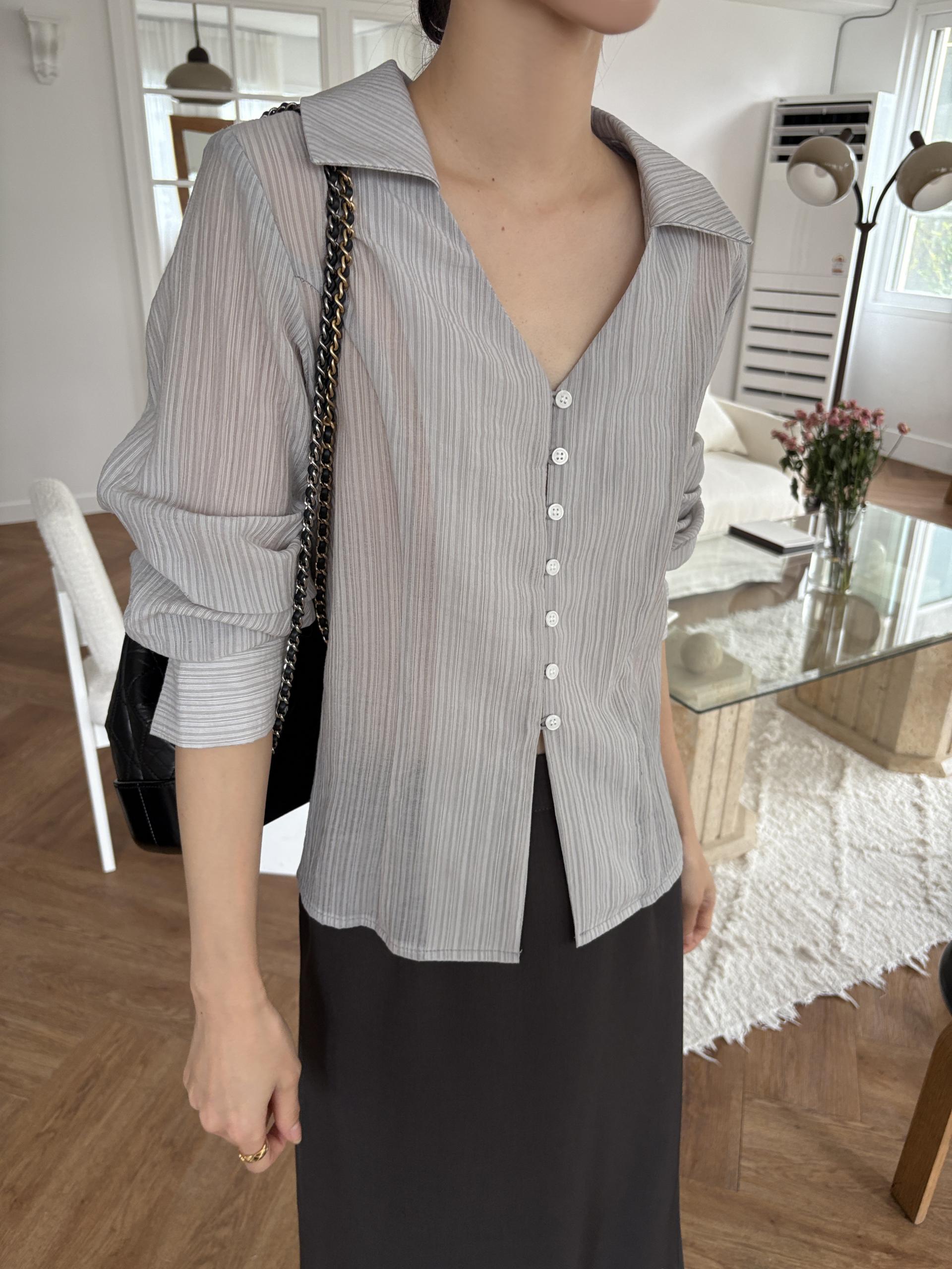세로 링클에 은은한 시스루로 여성스럽고 세련된 무드의 카라 블라우스입니다.