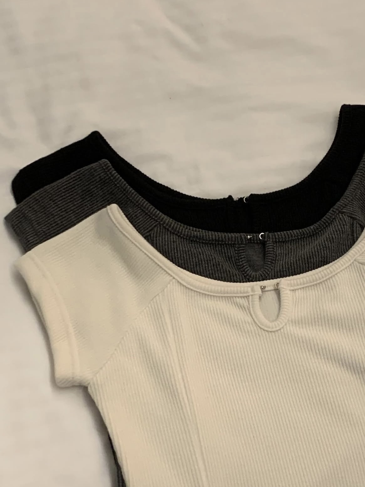무지 면과 후크와 작은 홀이 있는 두 방향 모두 착용 할 수 있고, 세미 오프숄더넥, 유넥 두 가지로 연출 가능합니다. 다양하게 연출할 수 있어 활용도 마저 좋은 아이템이에요.