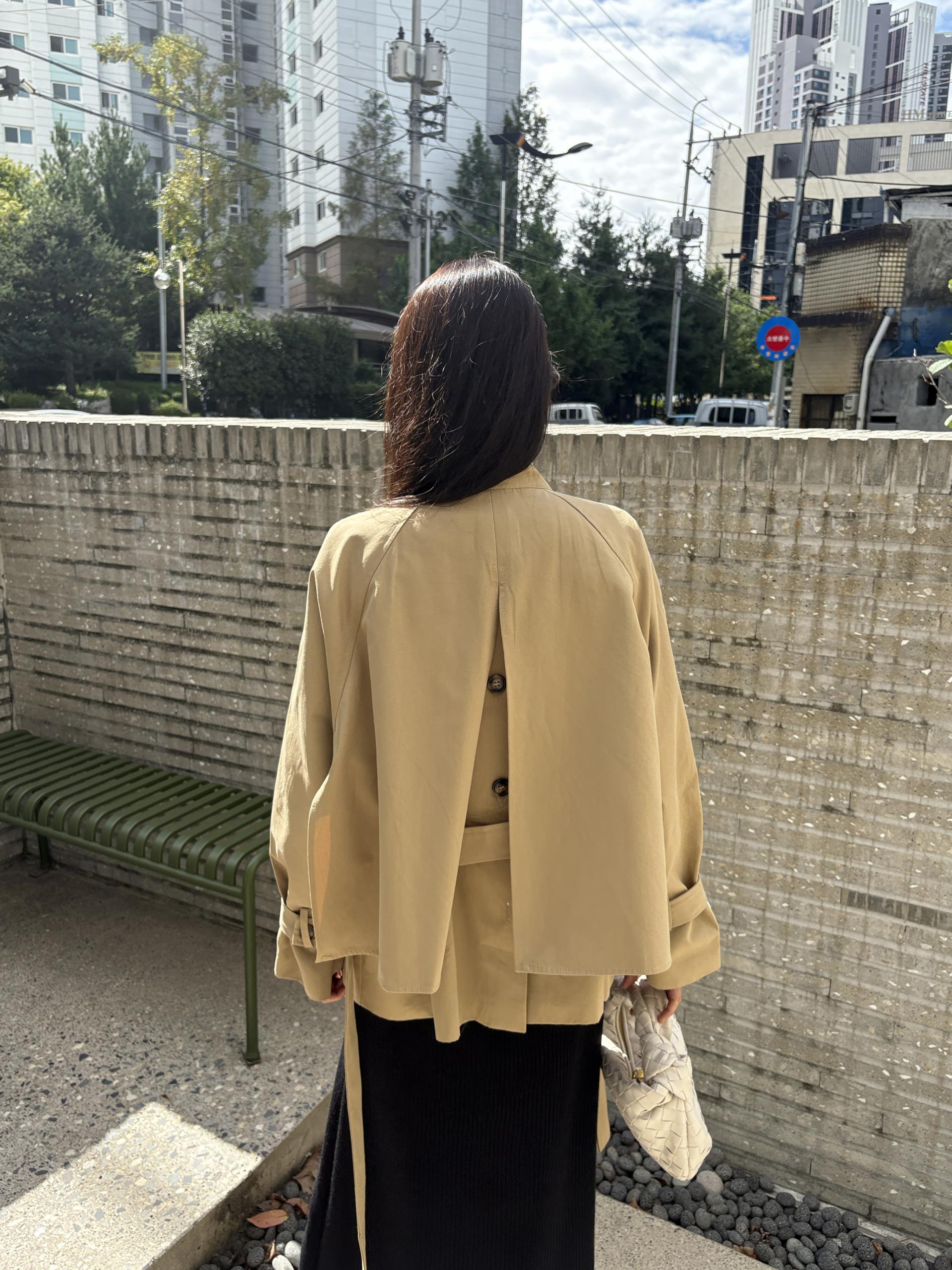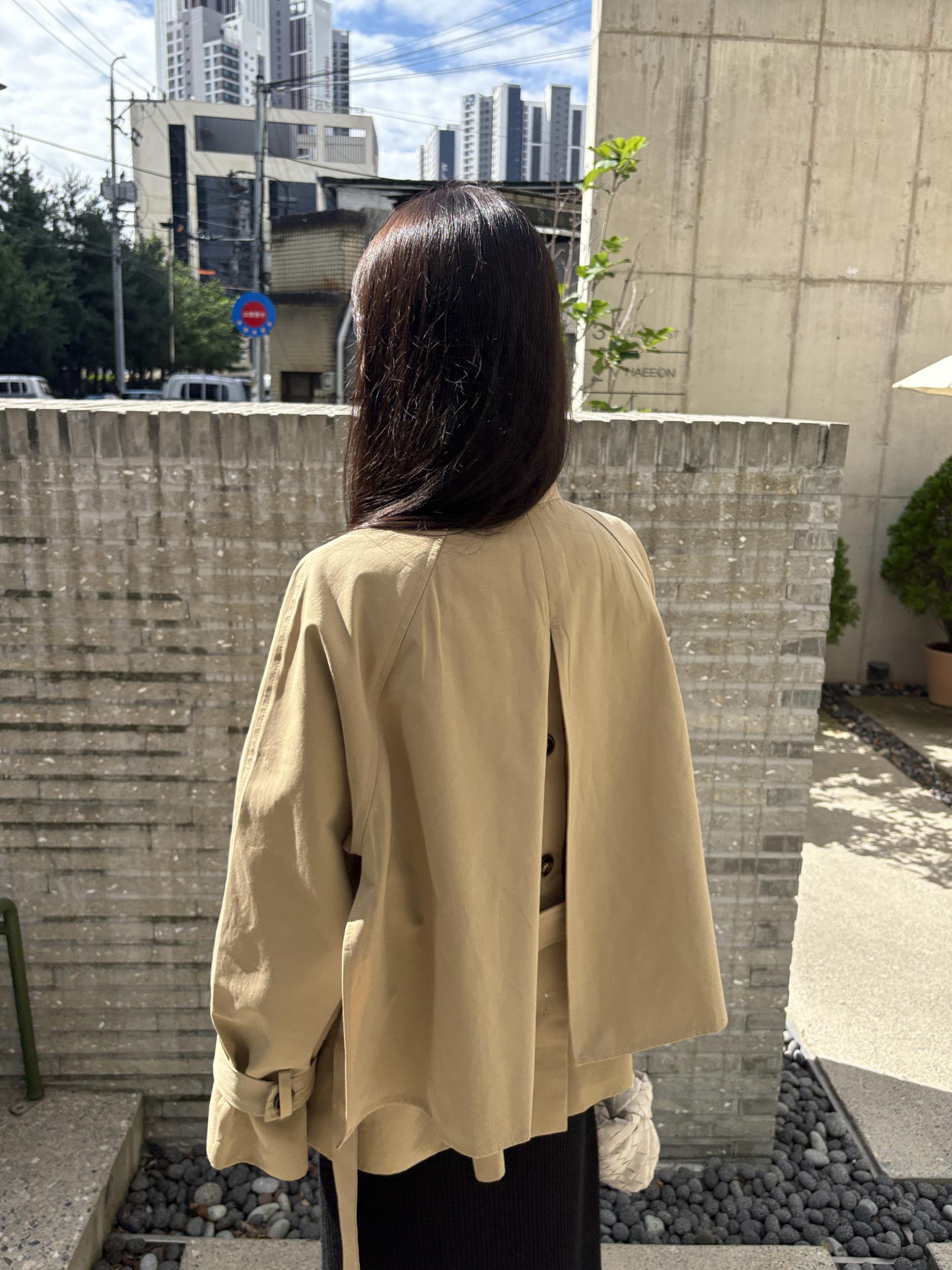 넥 부분의 두 개 단추로 클로징하며, 가슴 부분은 오픈형이고 벨트 스트랩으로 허리 라인을 고정할 수 있습니다. 그리고 뒷면에 버튼 디테일이 있어 걸을 때마다 살짝살짝 보이는 백버튼이 너무 매력적인 데일리 트렌치 숏 코트에요.
