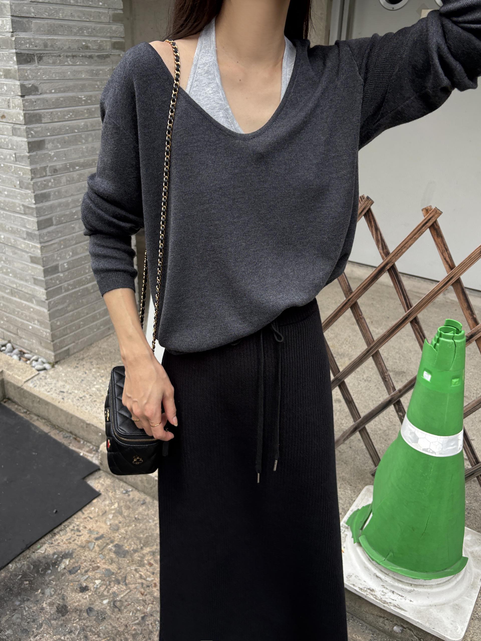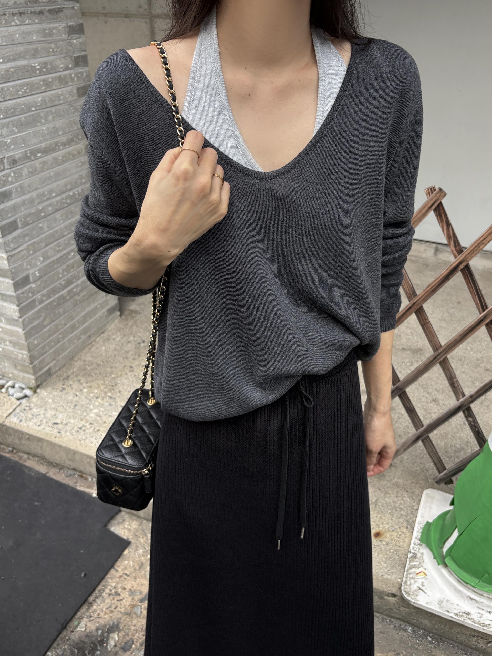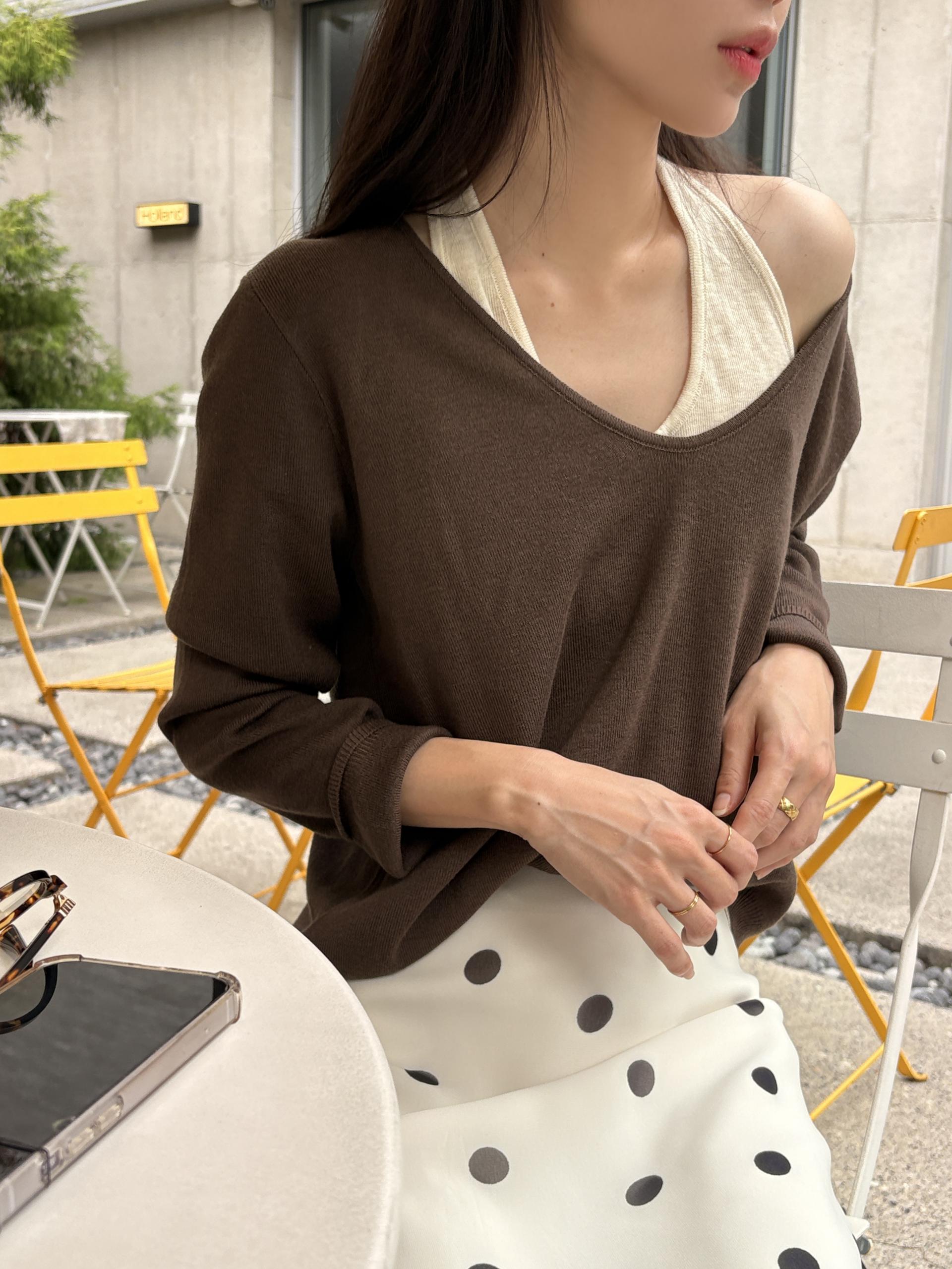 홀터넥 니트 나시와 브이넥 니트를 레이어드한 듯한 디자인의 루즈핏 긴팔 니트입니다.