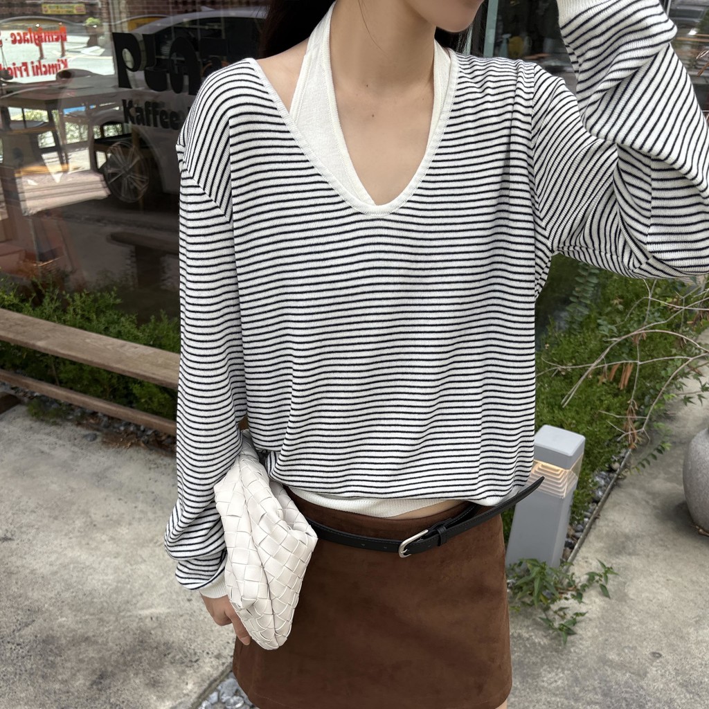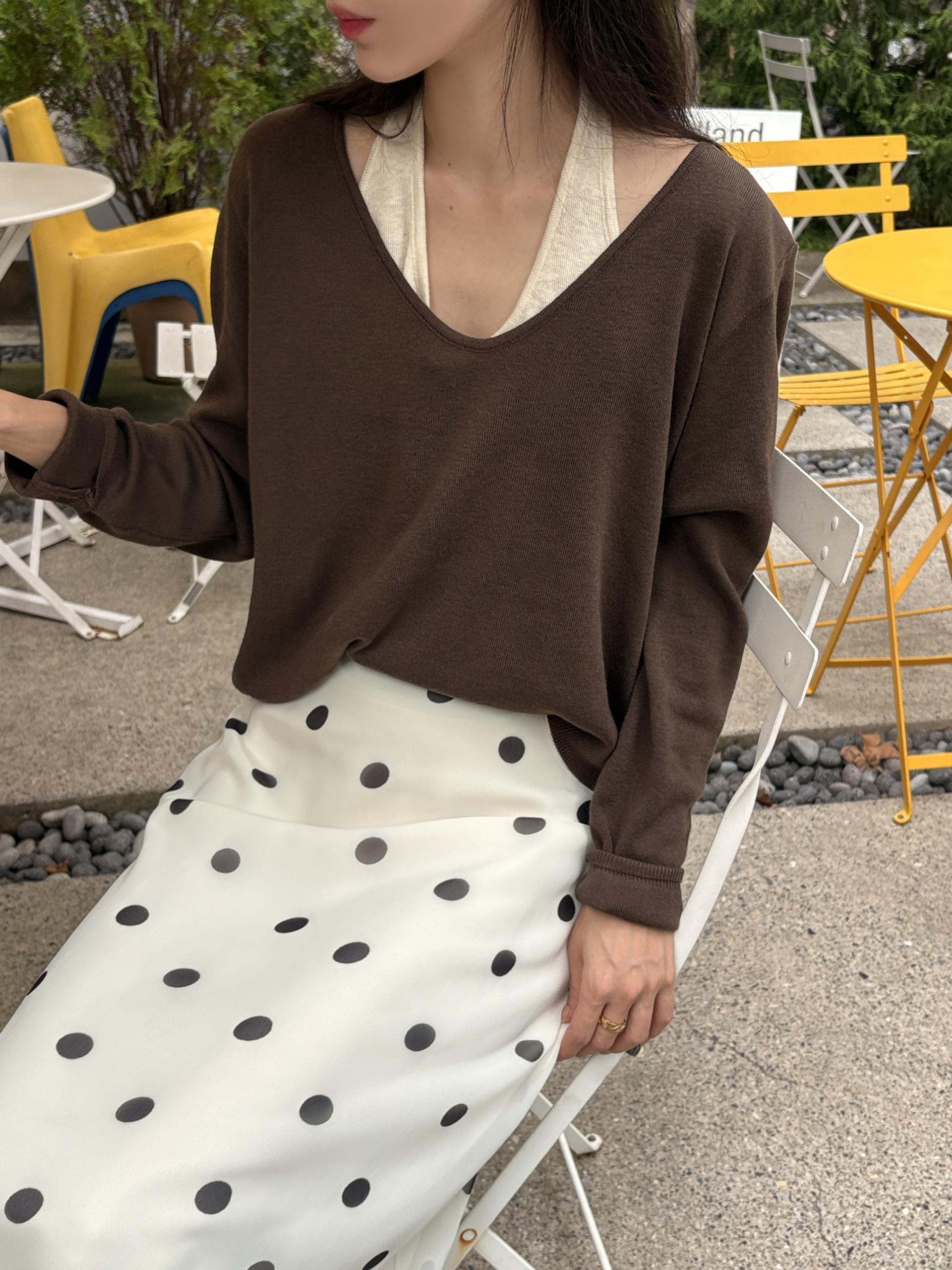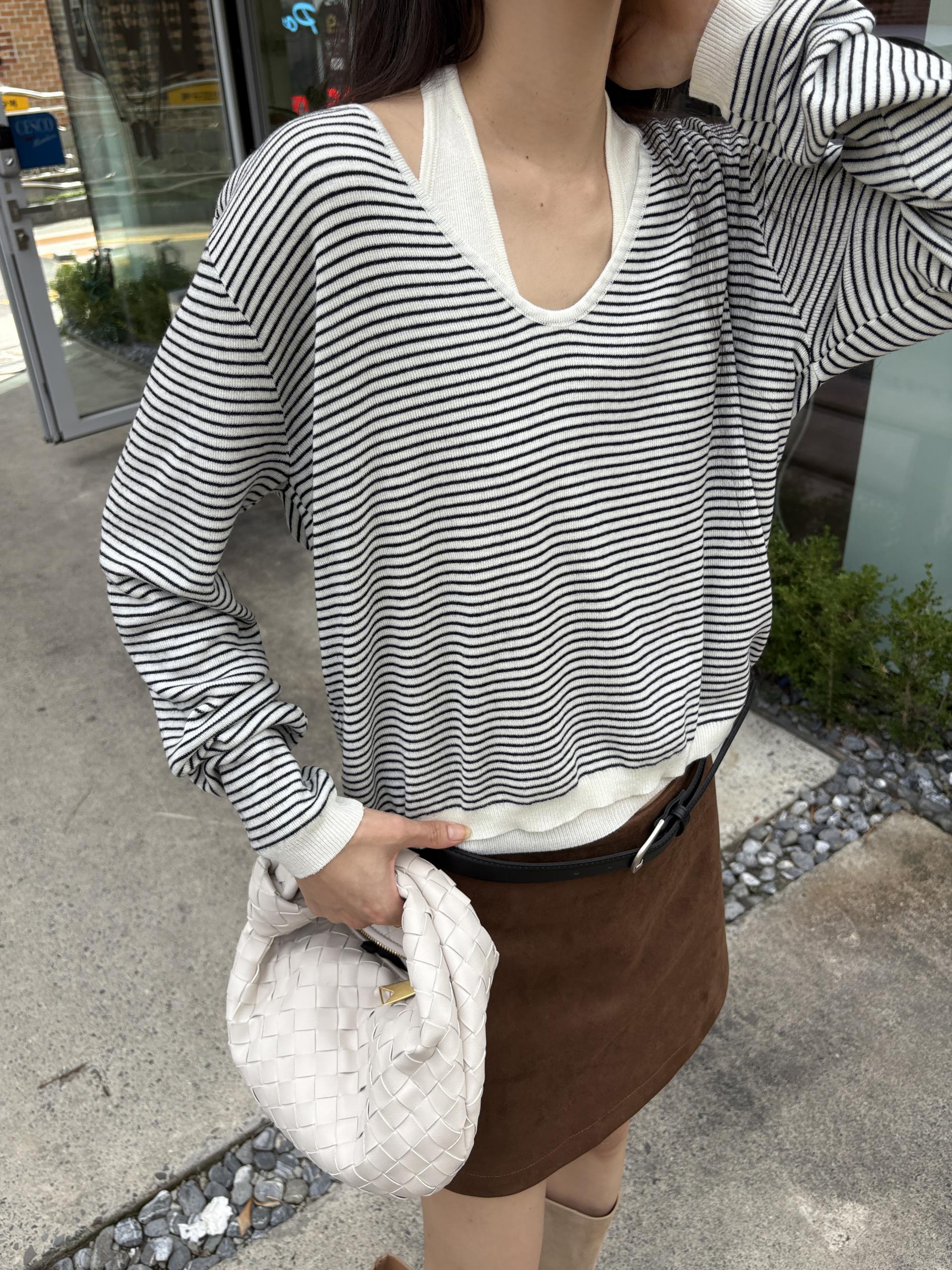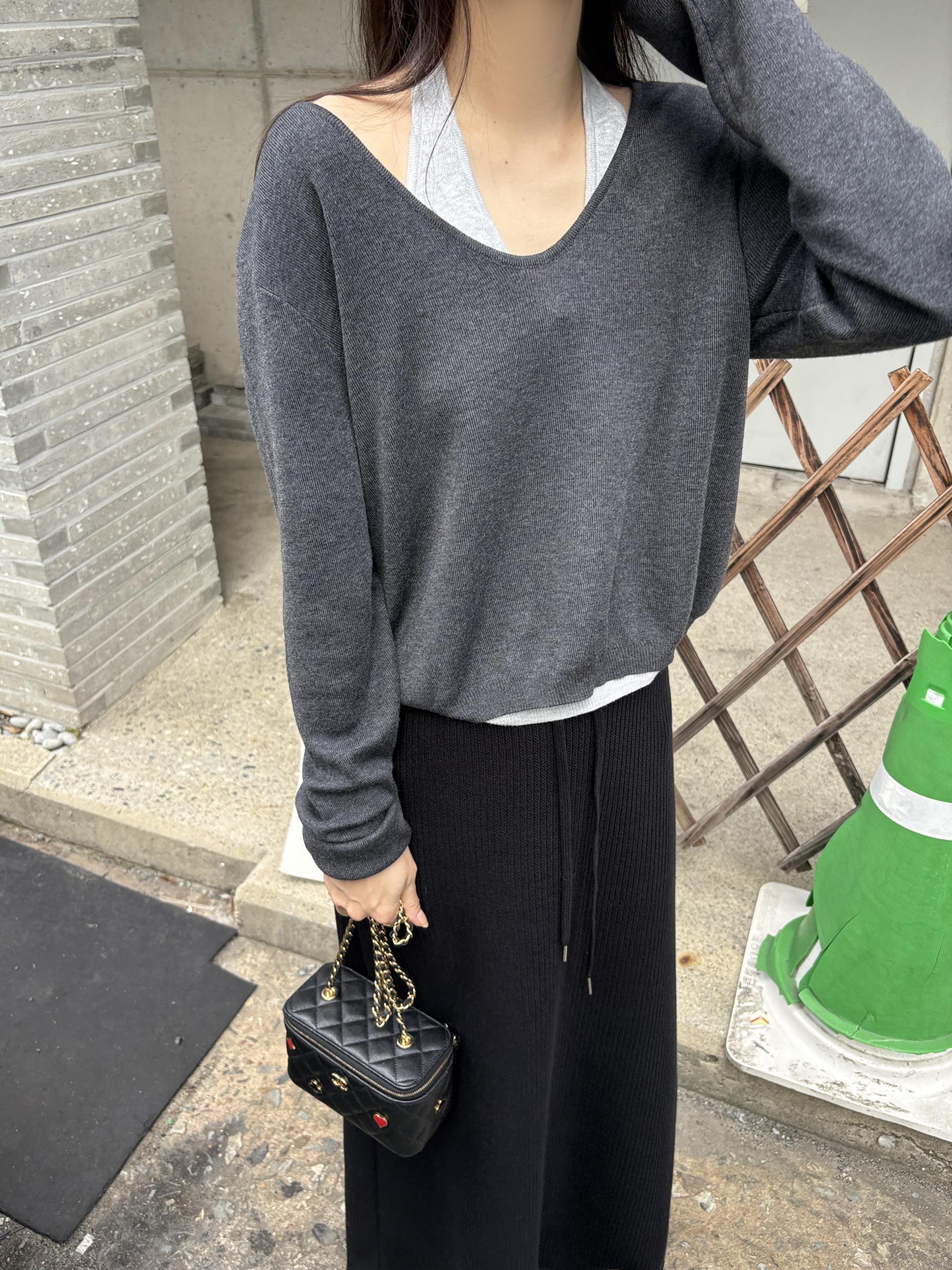 홀터넥 니트 나시와 브이넥 니트를 레이어드한 듯한 디자인의 루즈핏 긴팔 니트입니다.