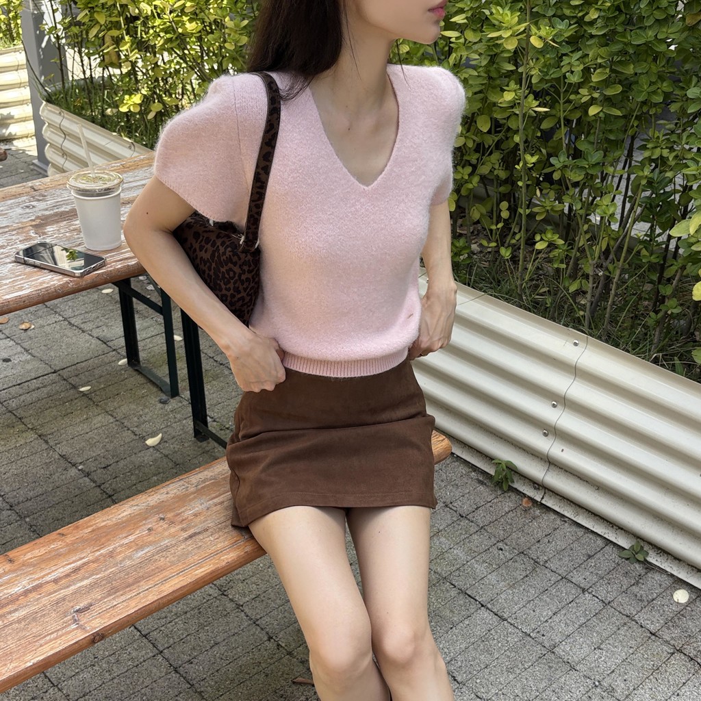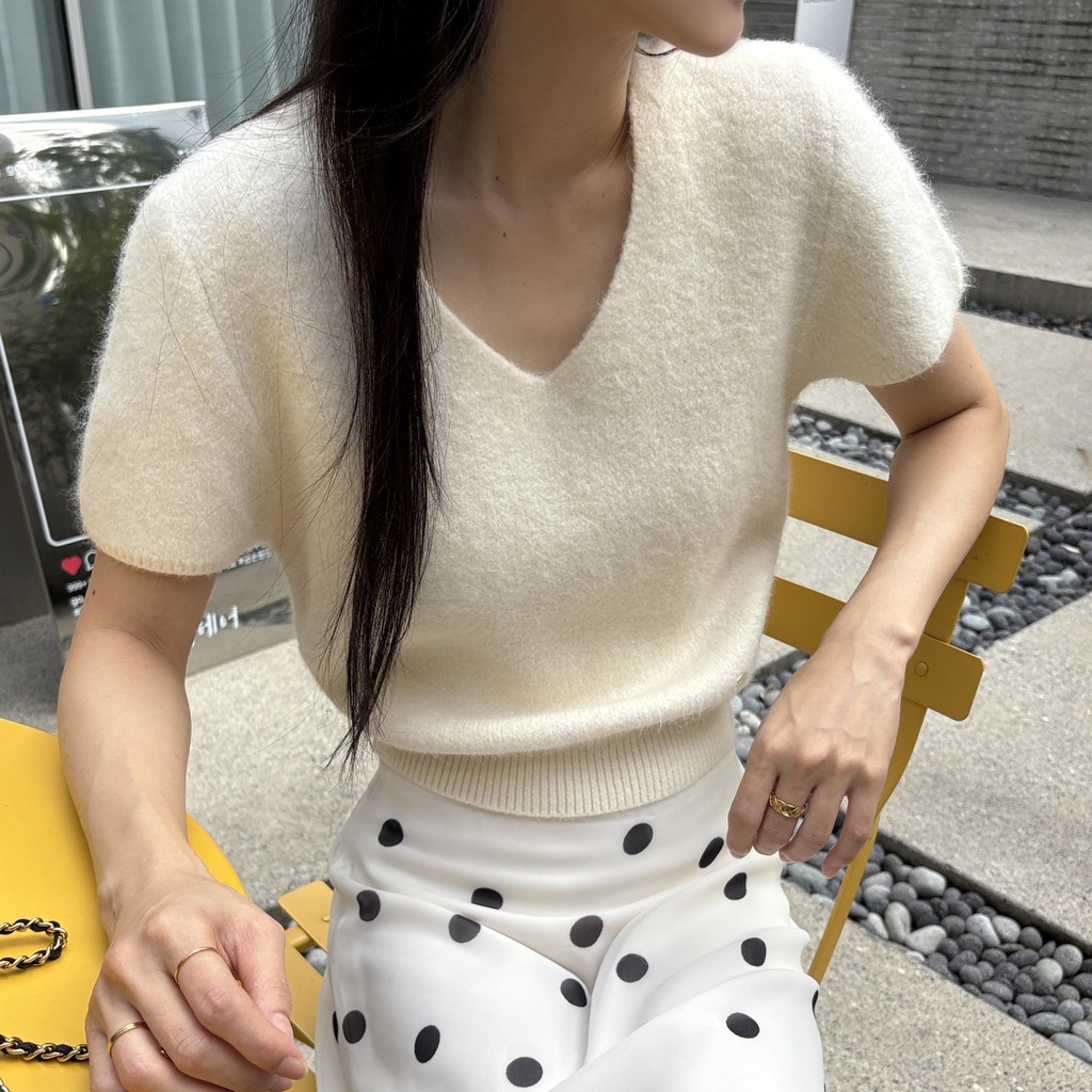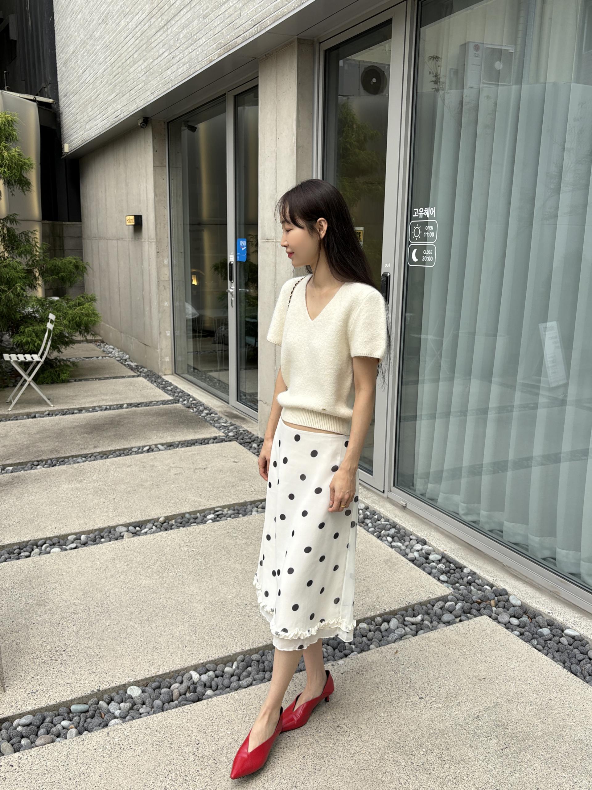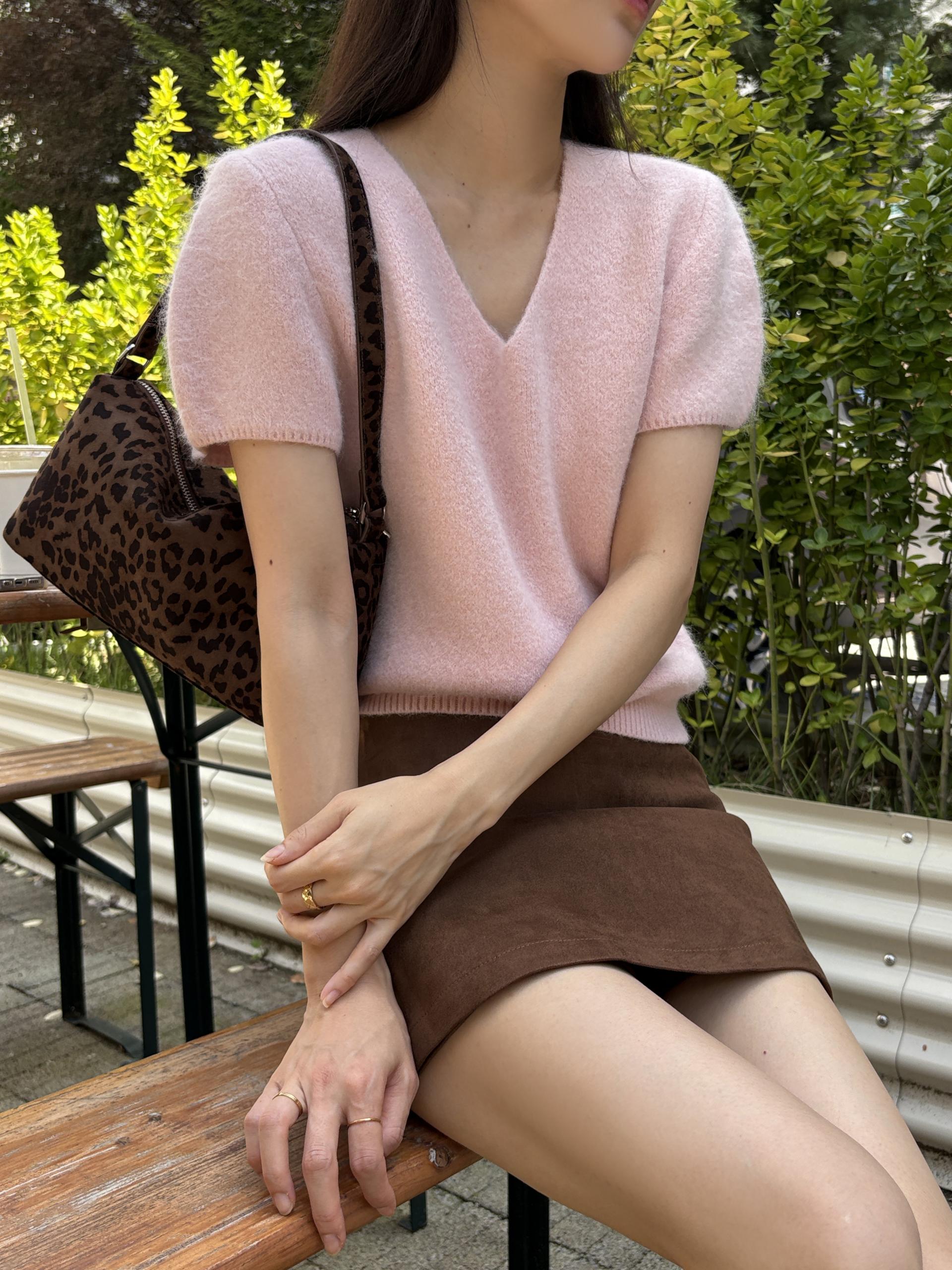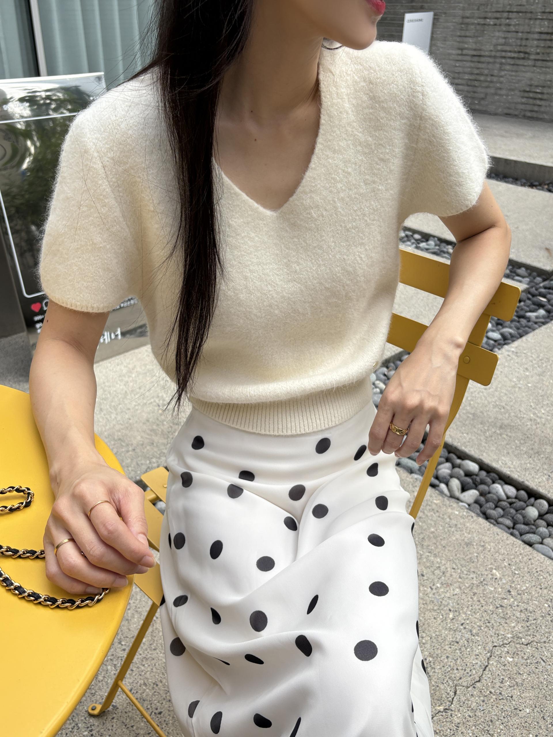 적당한 브이넥으로 목선이 길고 가늘어 보이면서 어떤 아이템과도 레이어드하기 좋아 단독으로도, 레이어드 용으로도 활용도 높은 깔끔한 반팔 니트입니다.
