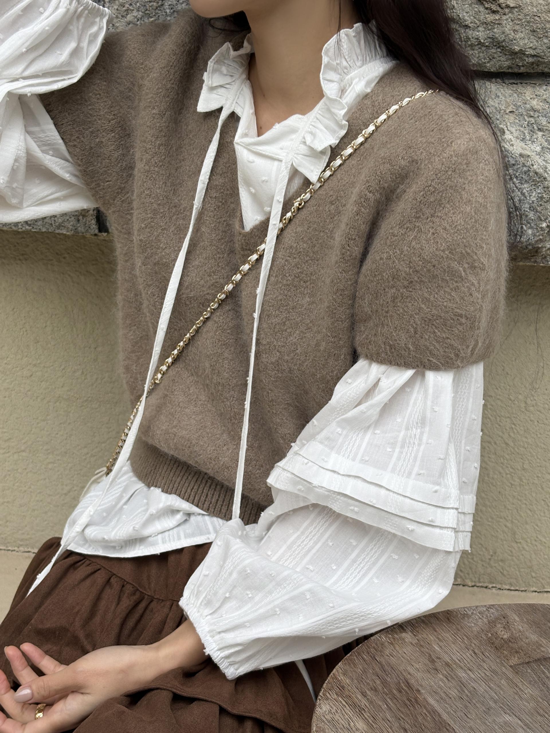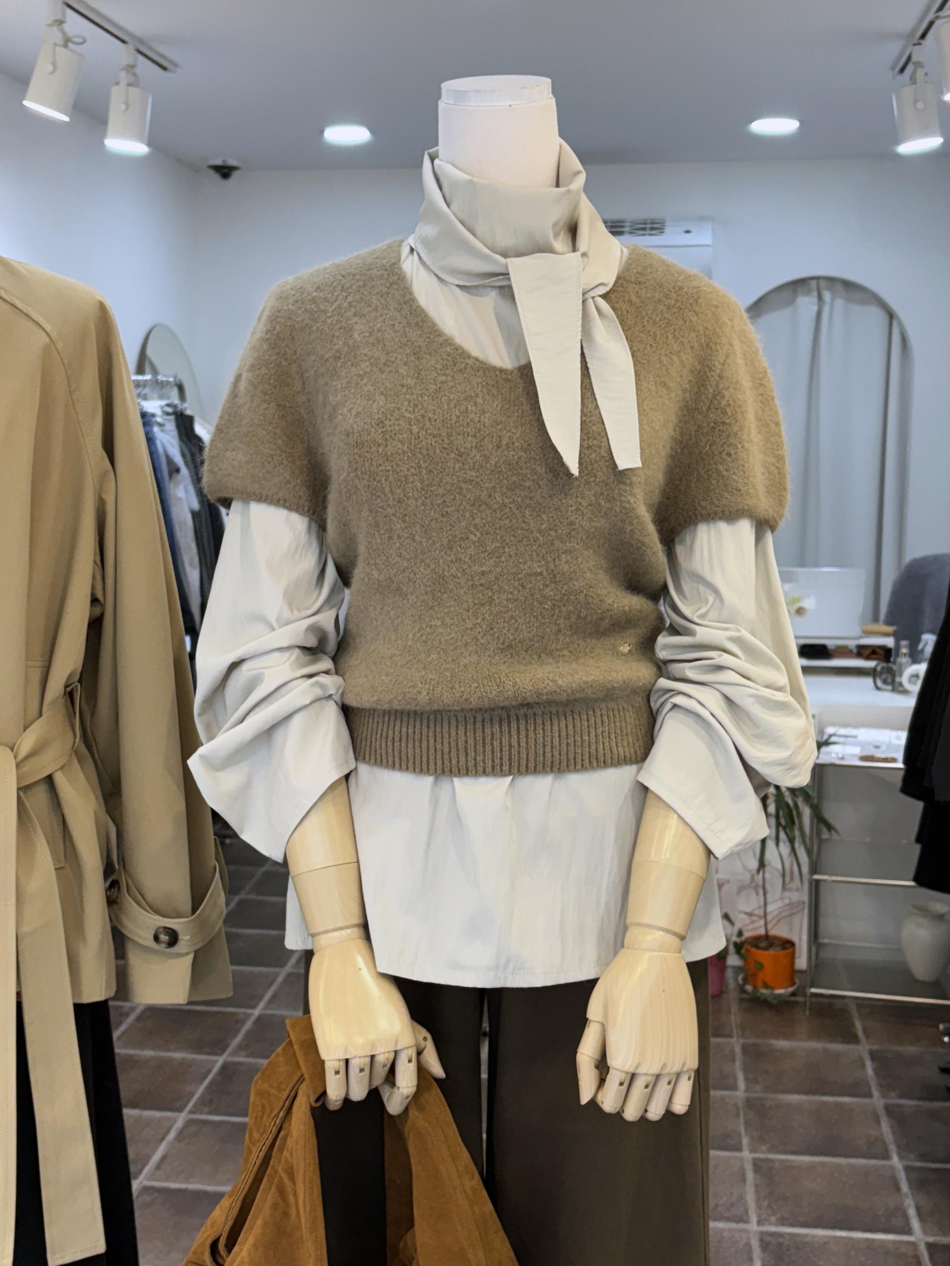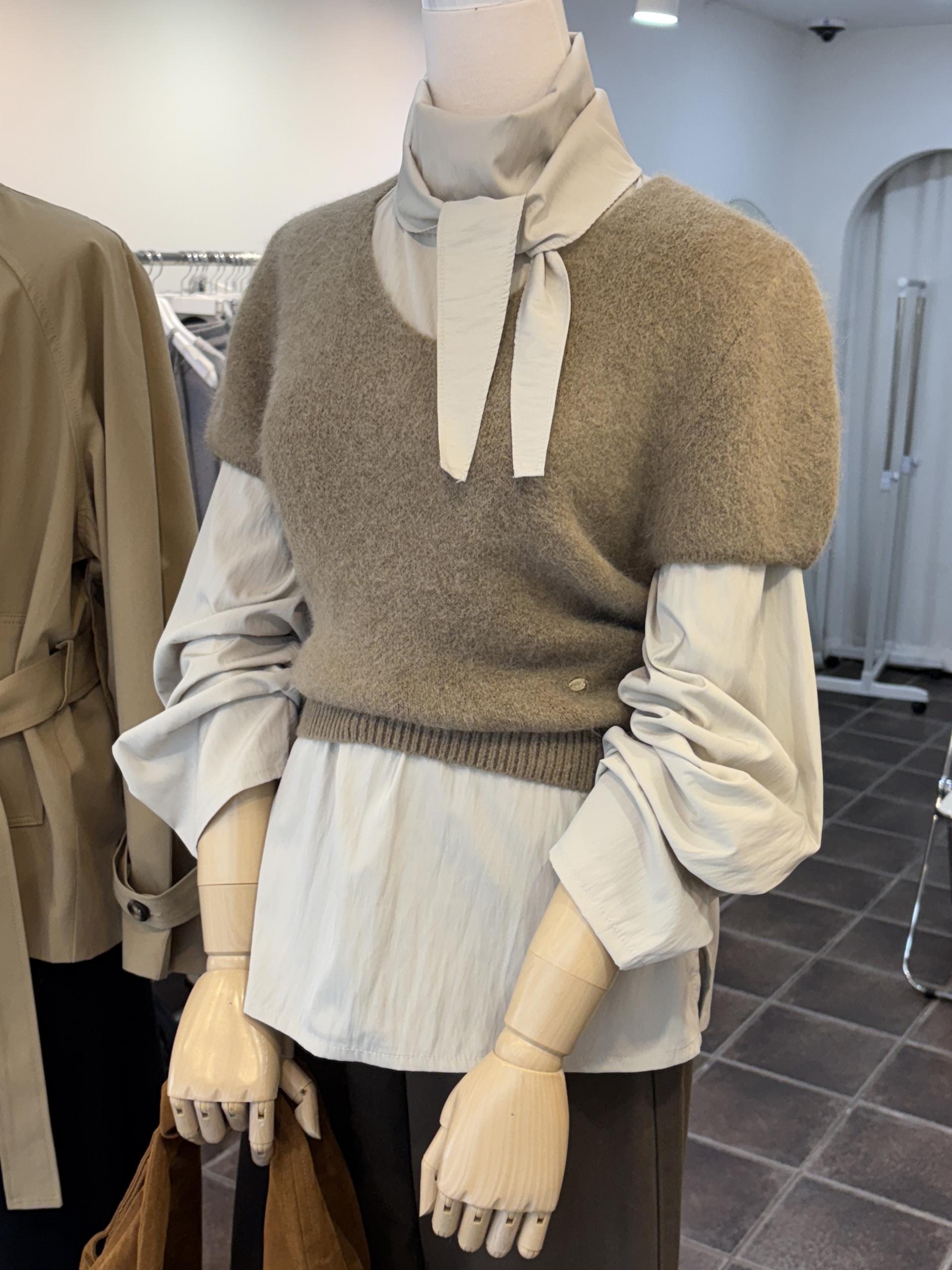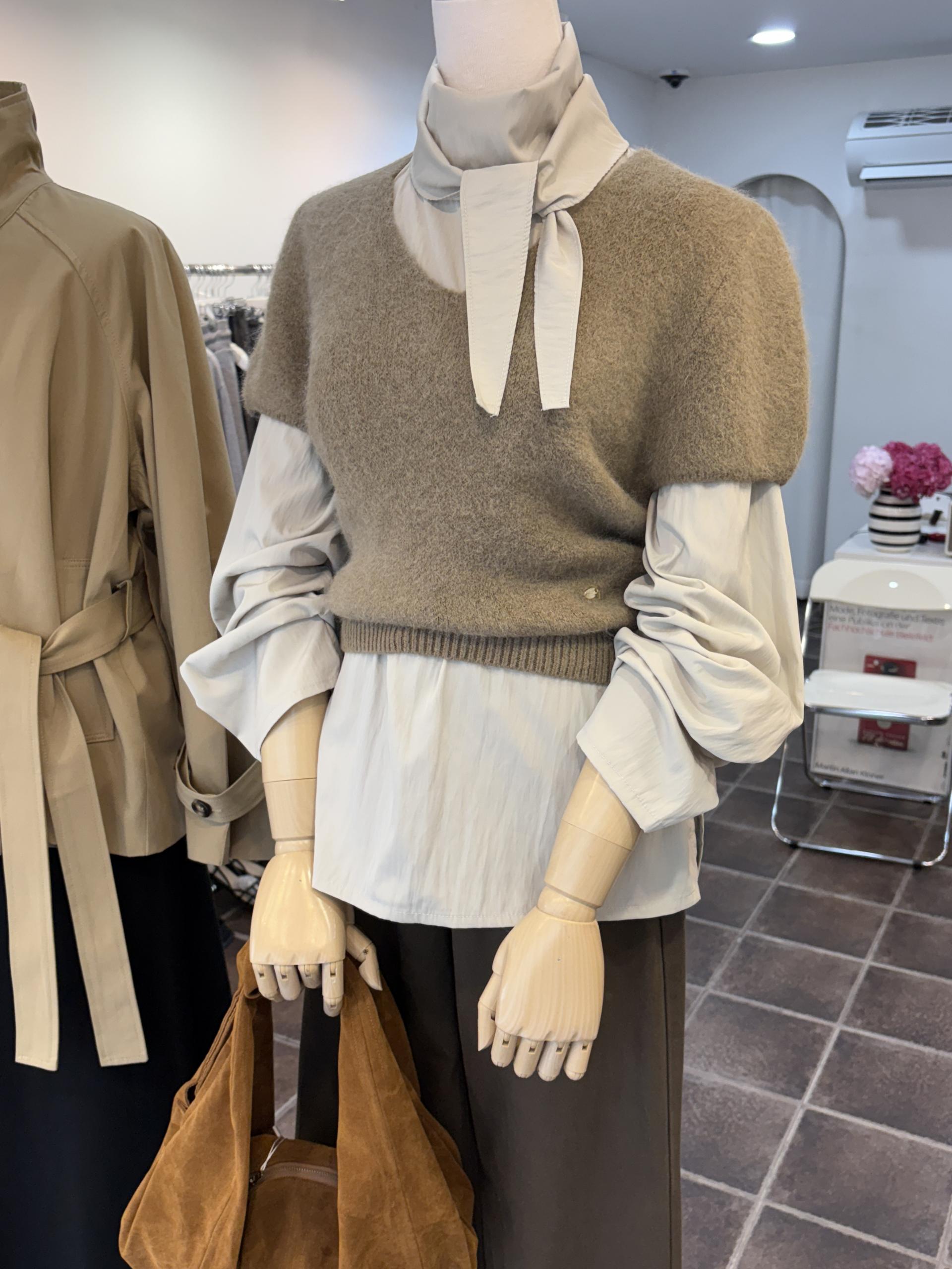소매는 약간의 퍼프로 너비가 여유로워 단독으로 입었을 때 팔뚝이 가늘어 보이고, 셔츠나 블라우스를 레이어드했을 때도 핏이 더 예쁘게 연출됩니다.