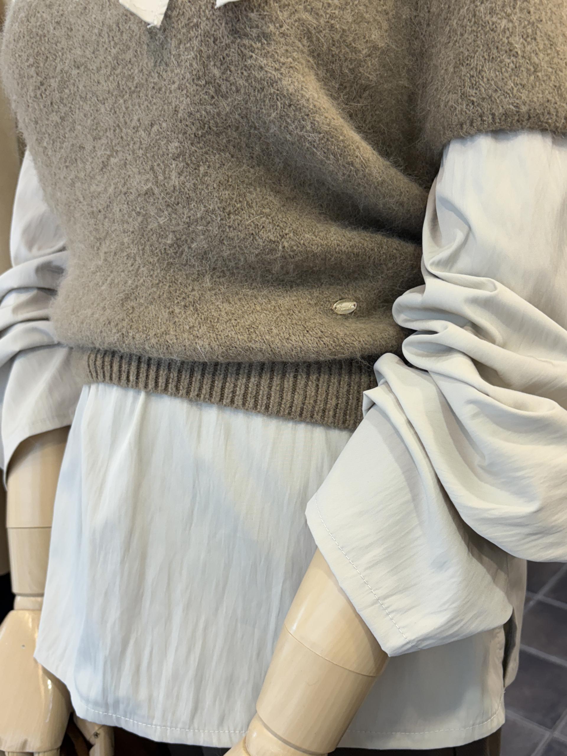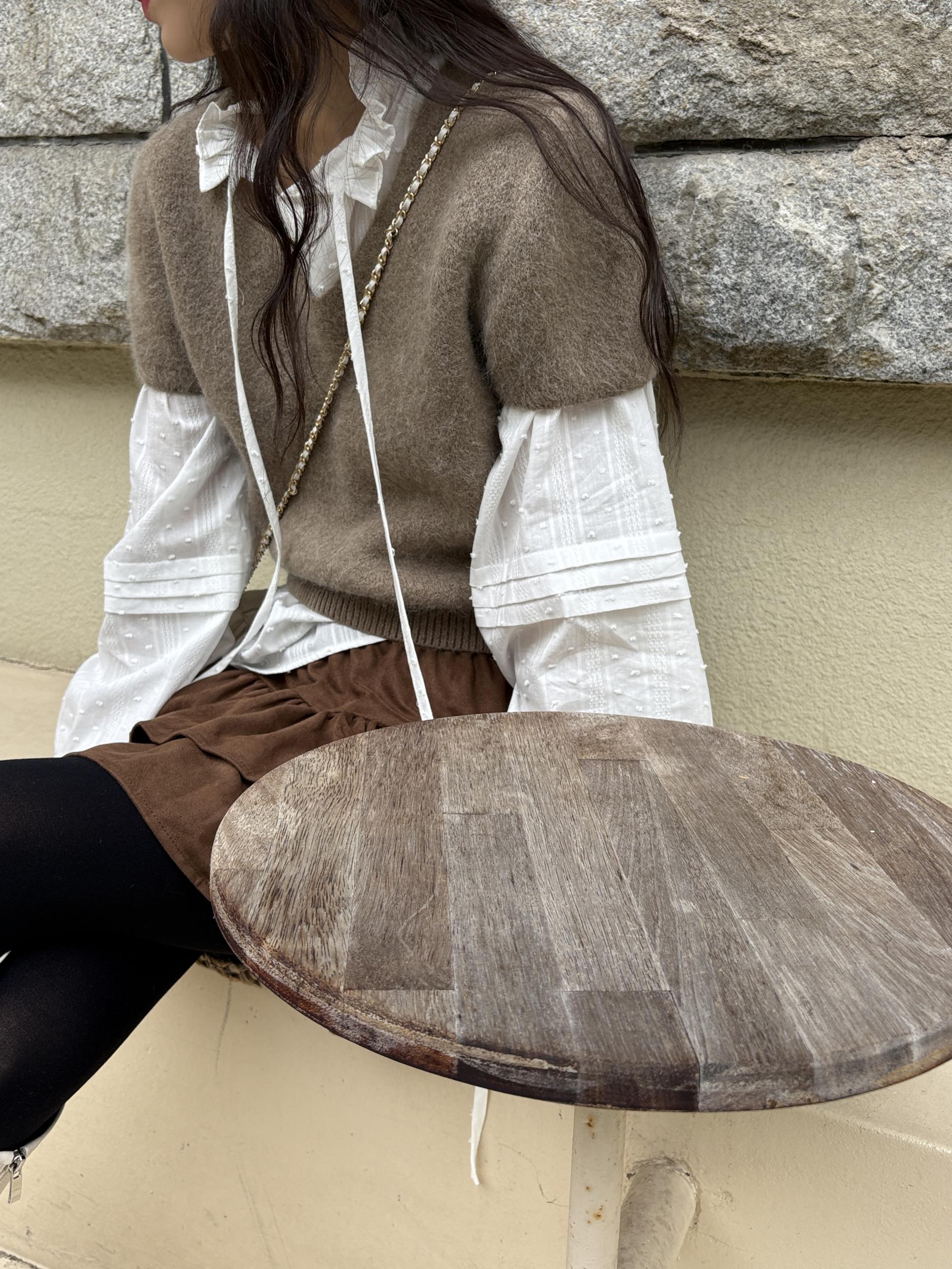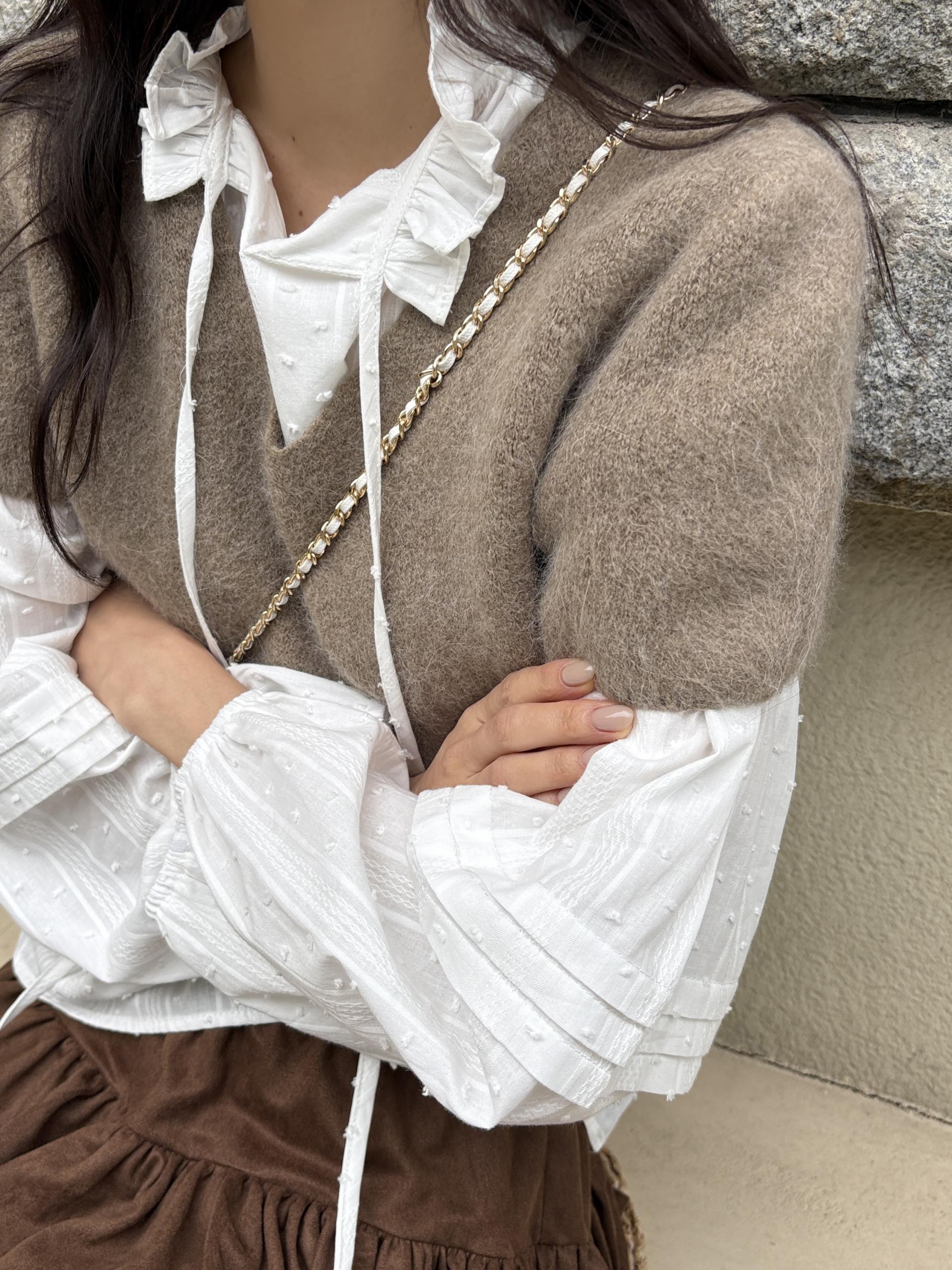 소매는 약간의 퍼프로 너비가 여유로워 단독으로 입었을 때 팔뚝이 가늘어 보이고, 셔츠나 블라우스를 레이어드했을 때도 핏이 더 예쁘게 연출됩니다.