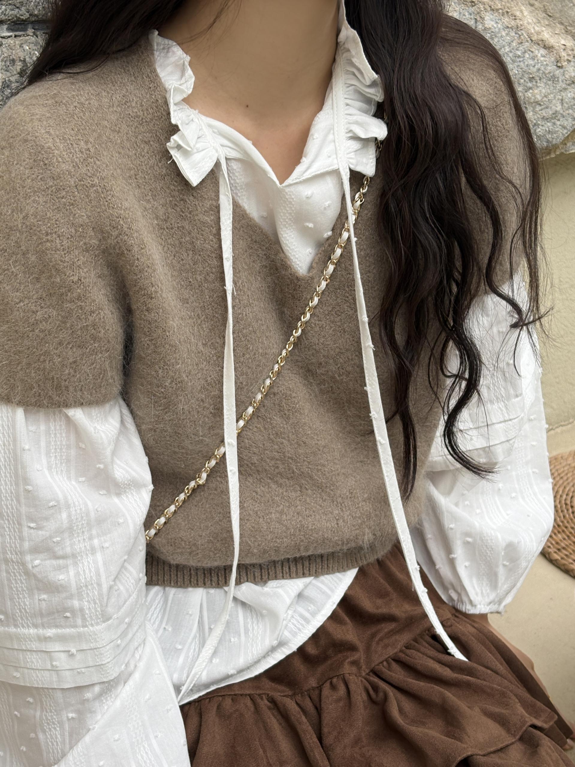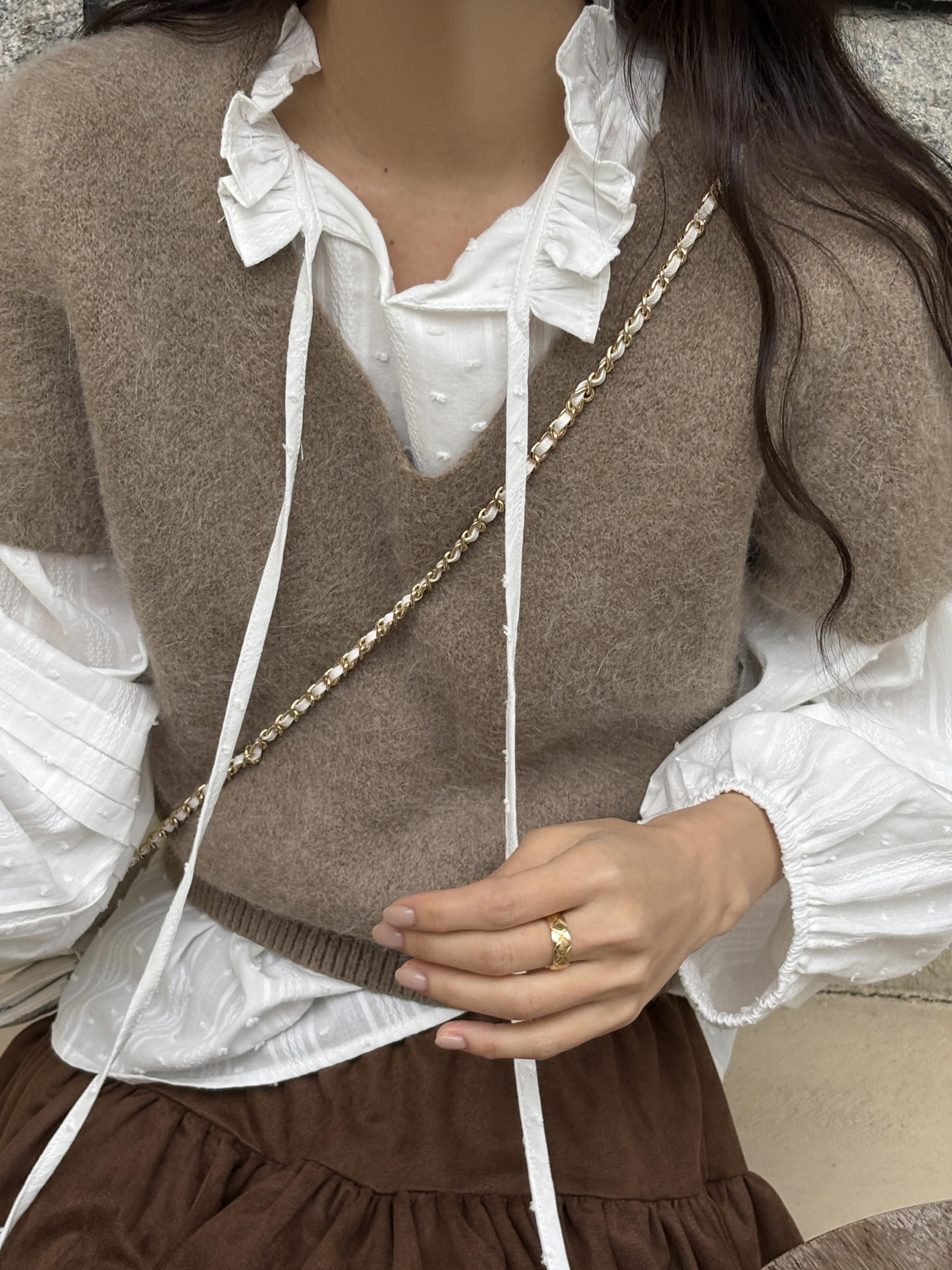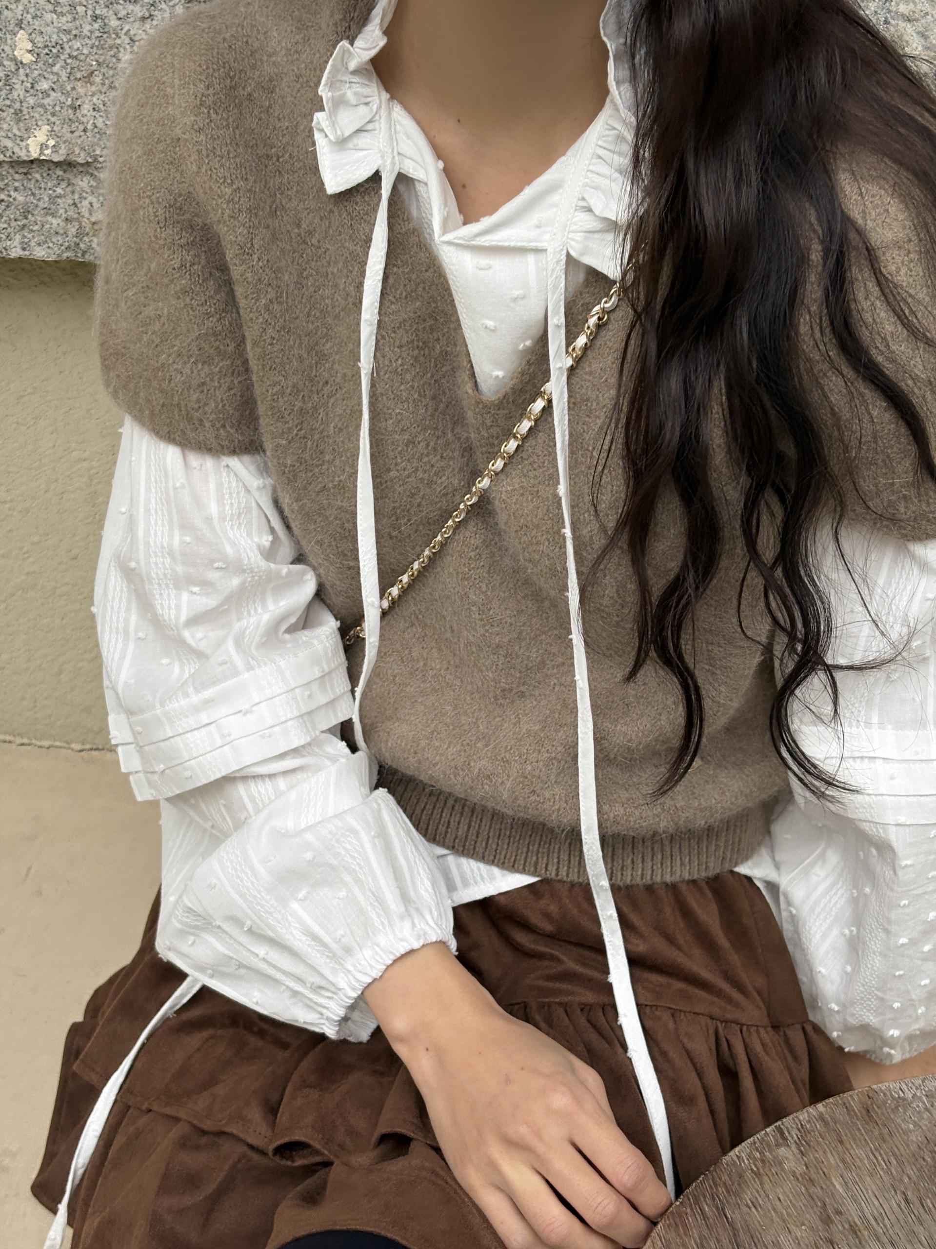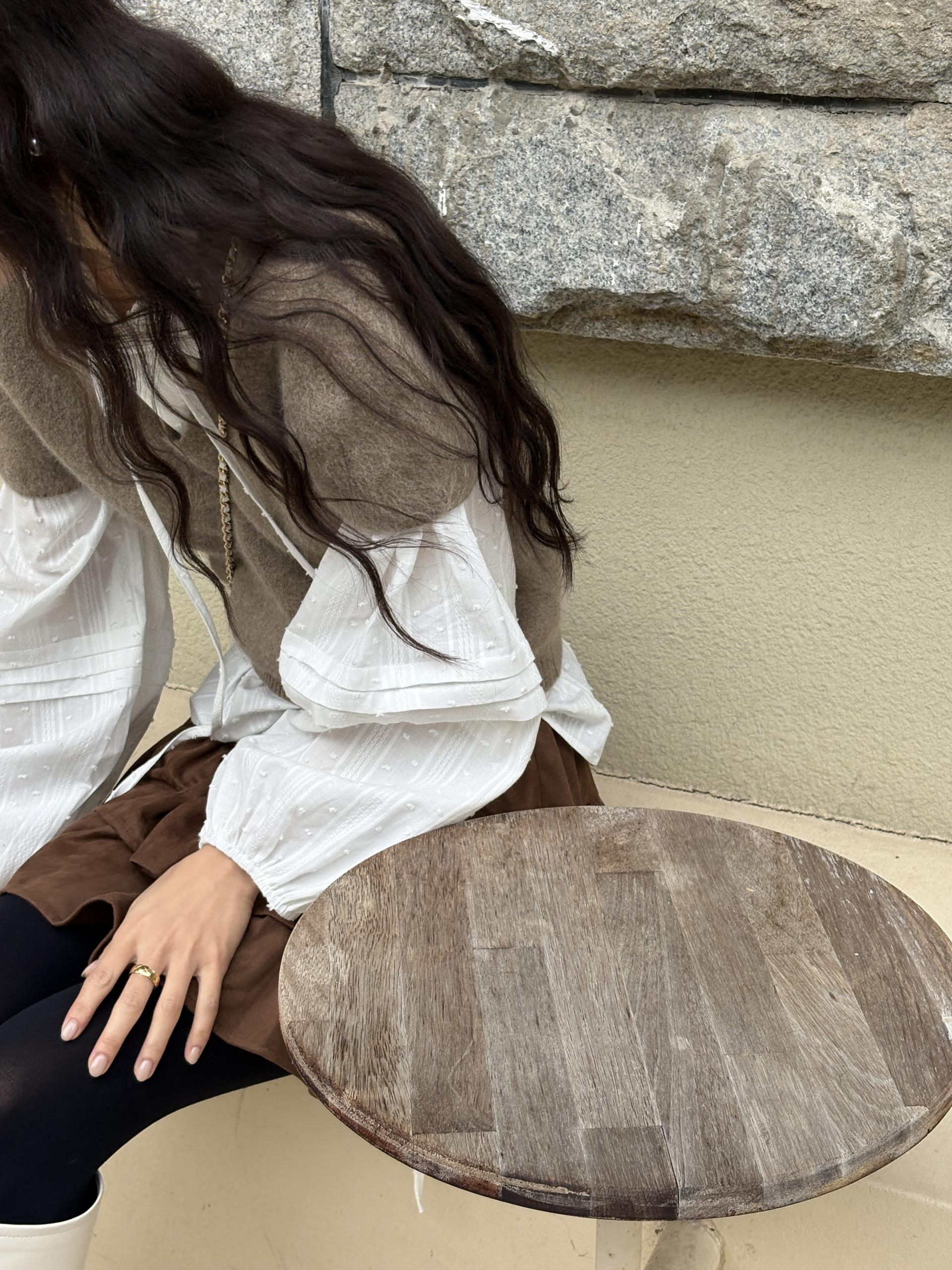 소매는 약간의 퍼프로 너비가 여유로워 단독으로 입었을 때 팔뚝이 가늘어 보이고, 셔츠나 블라우스를 레이어드했을 때도 핏이 더 예쁘게 연출됩니다.
