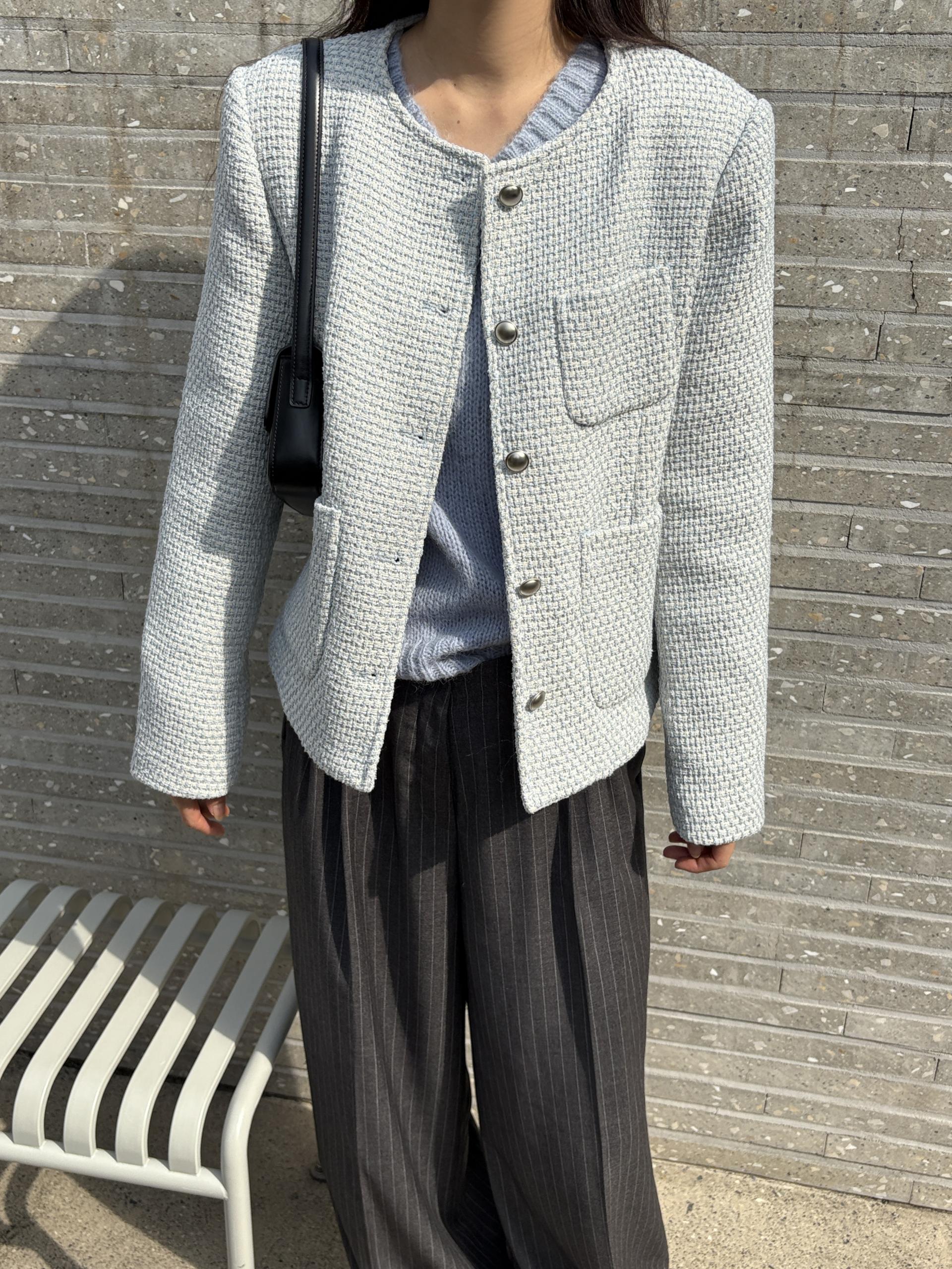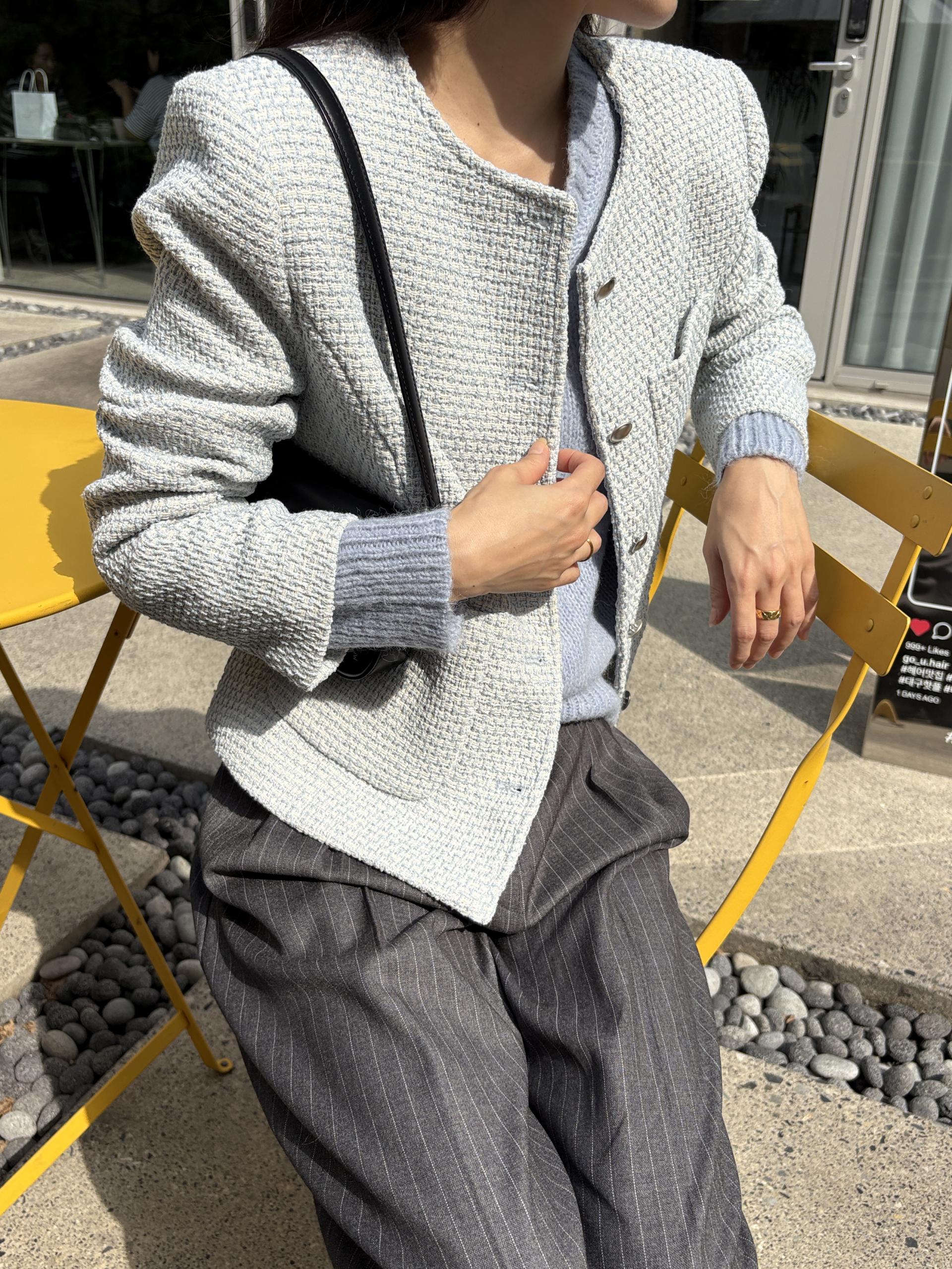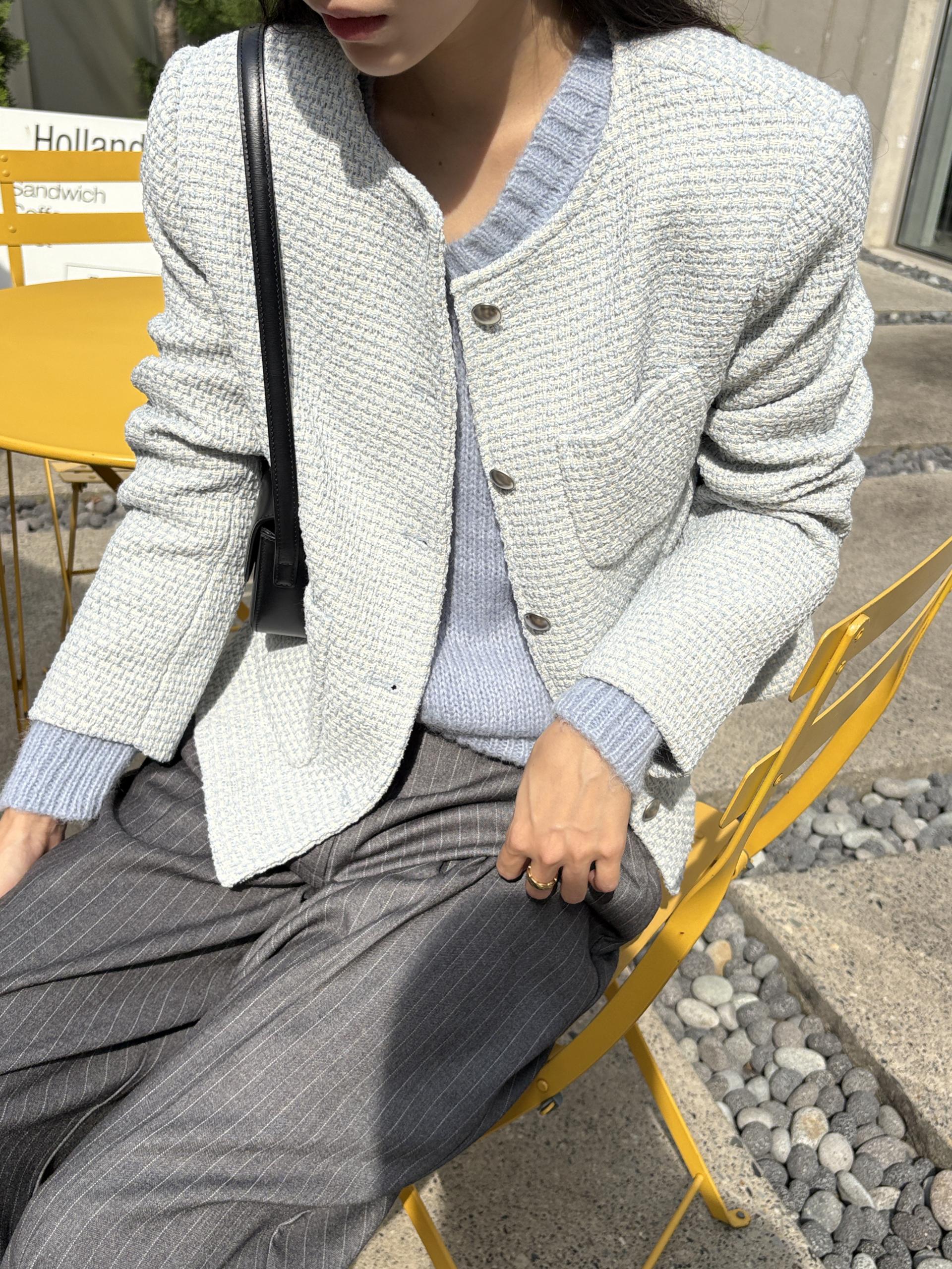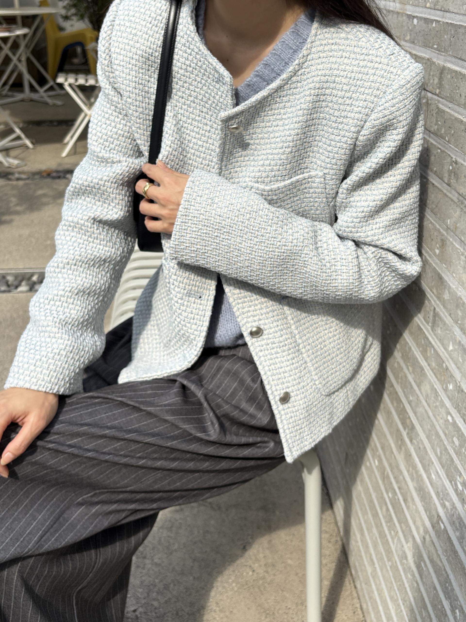세련된 무드가 느껴지는 노카라 트위드 자켓입니다.