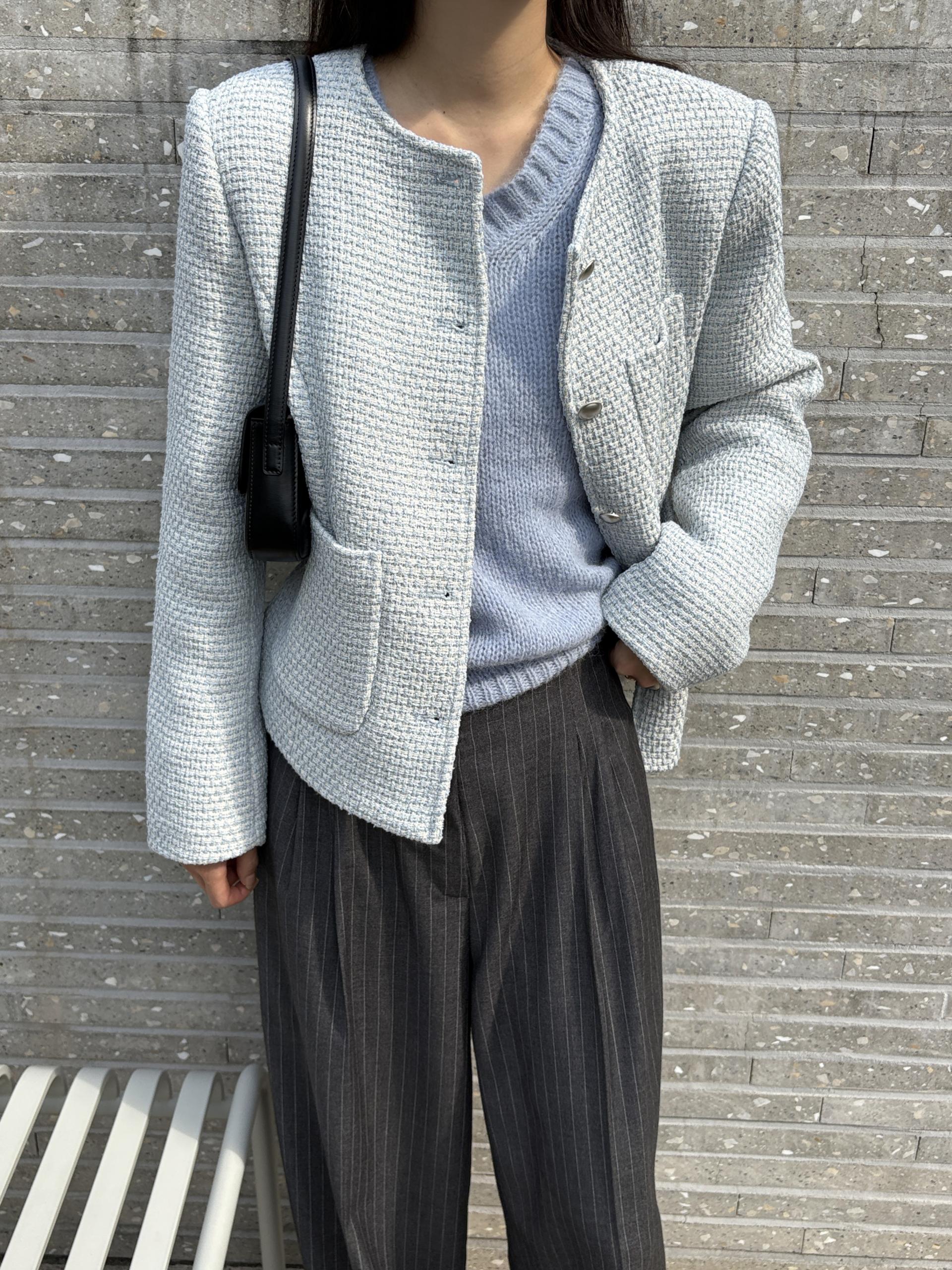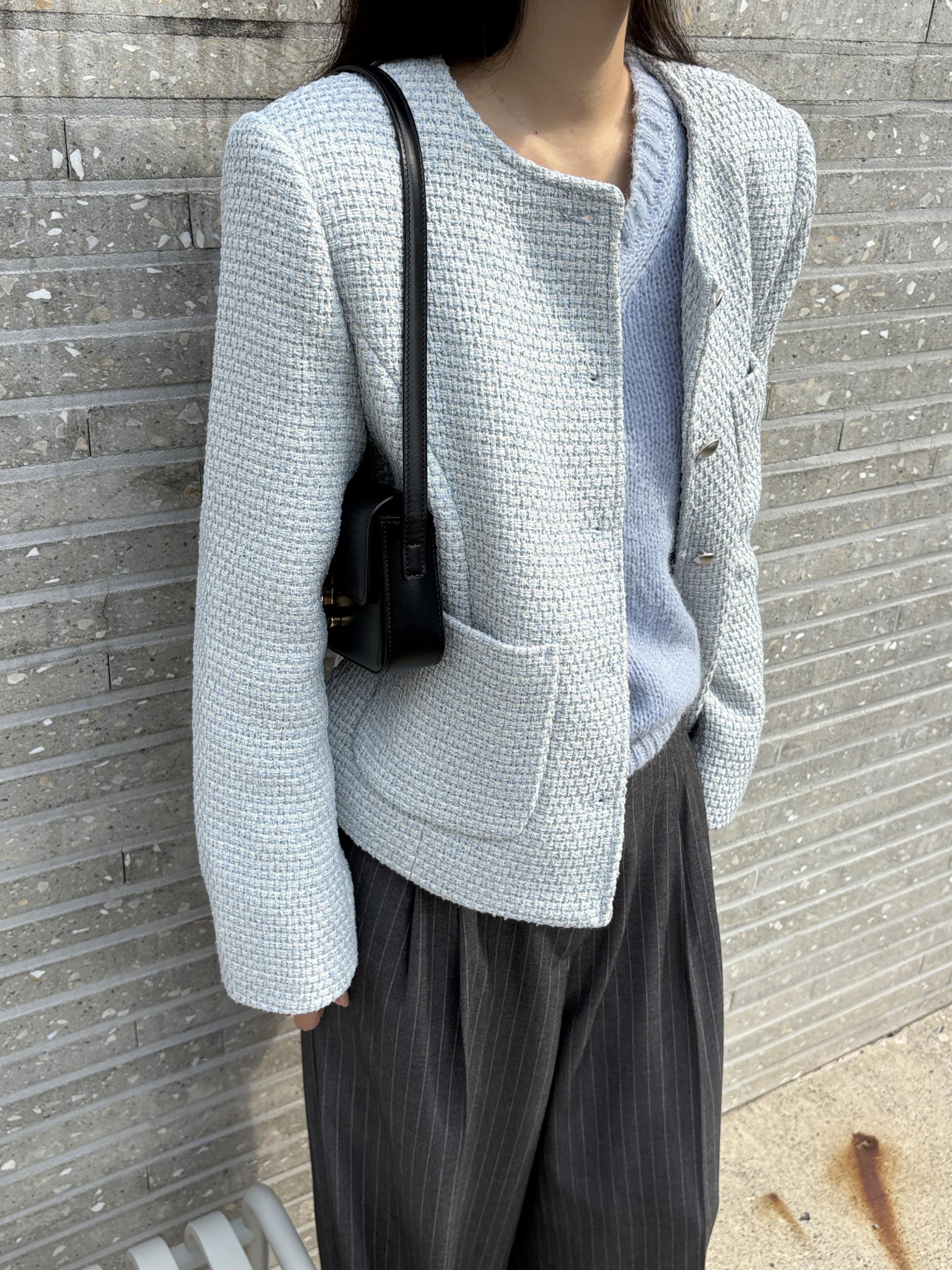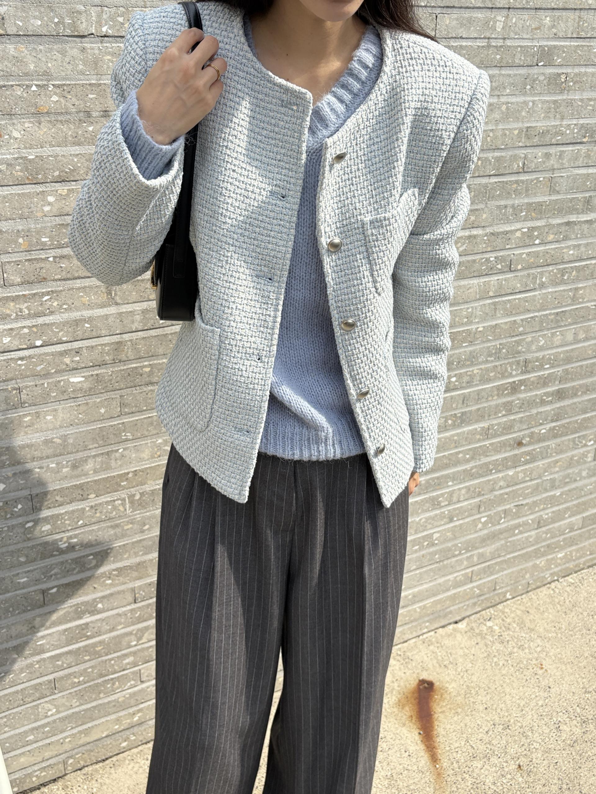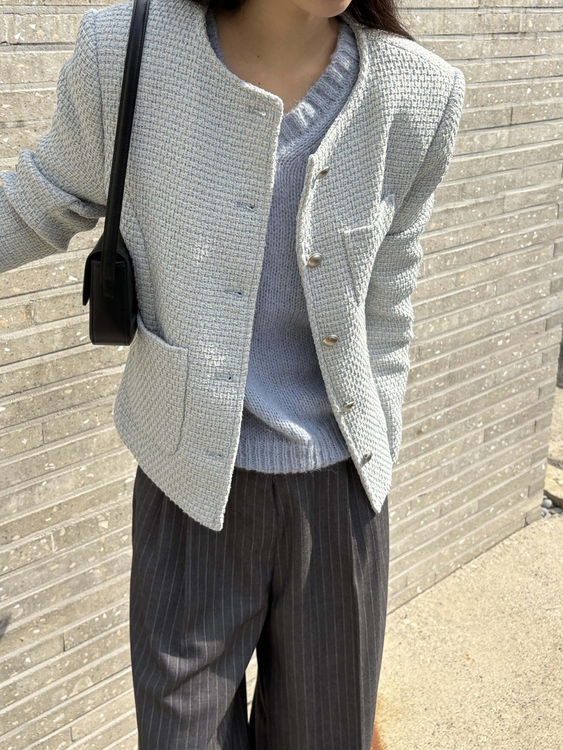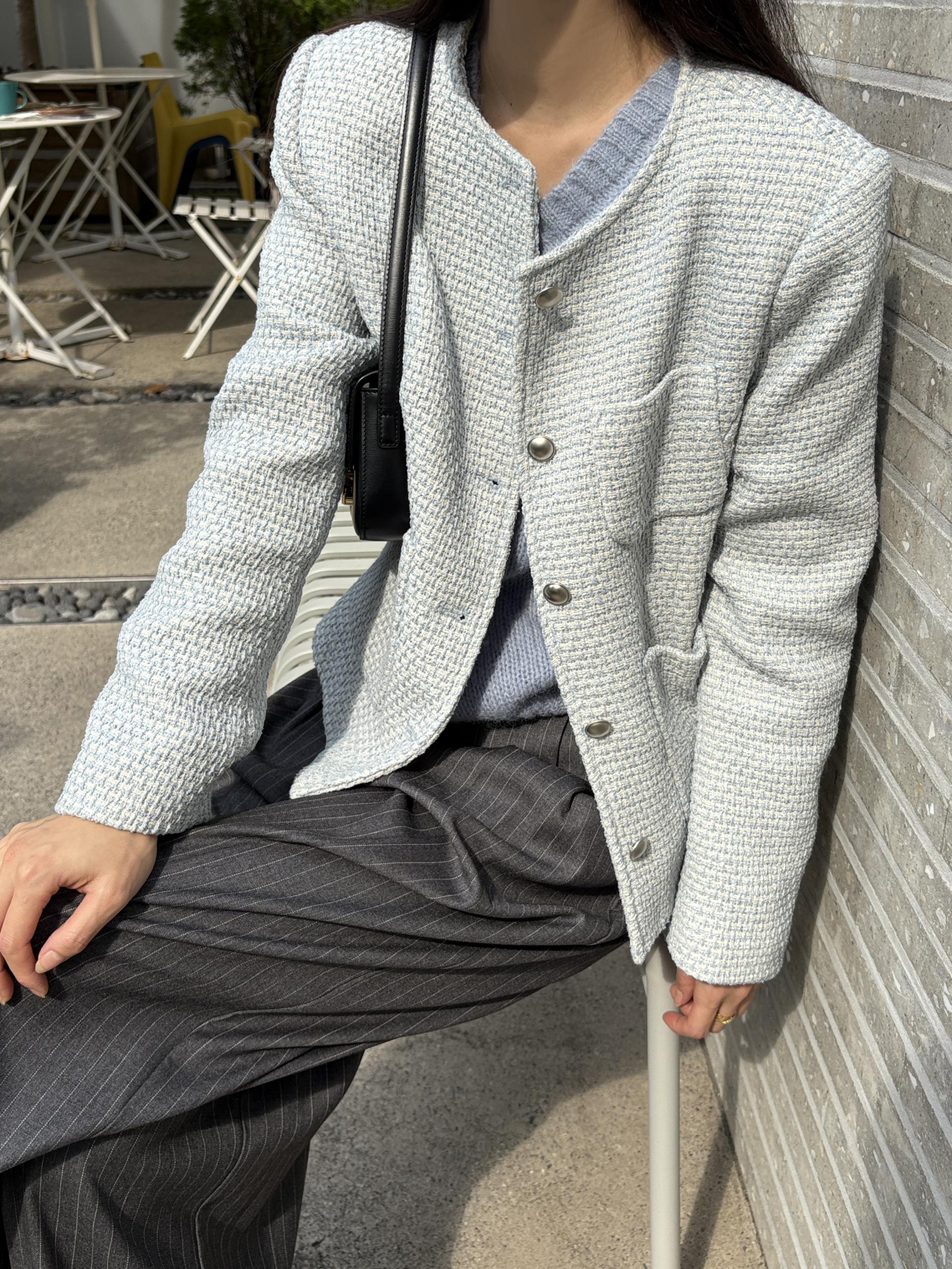 세련된 무드가 느껴지는 노카라 트위드 자켓입니다.