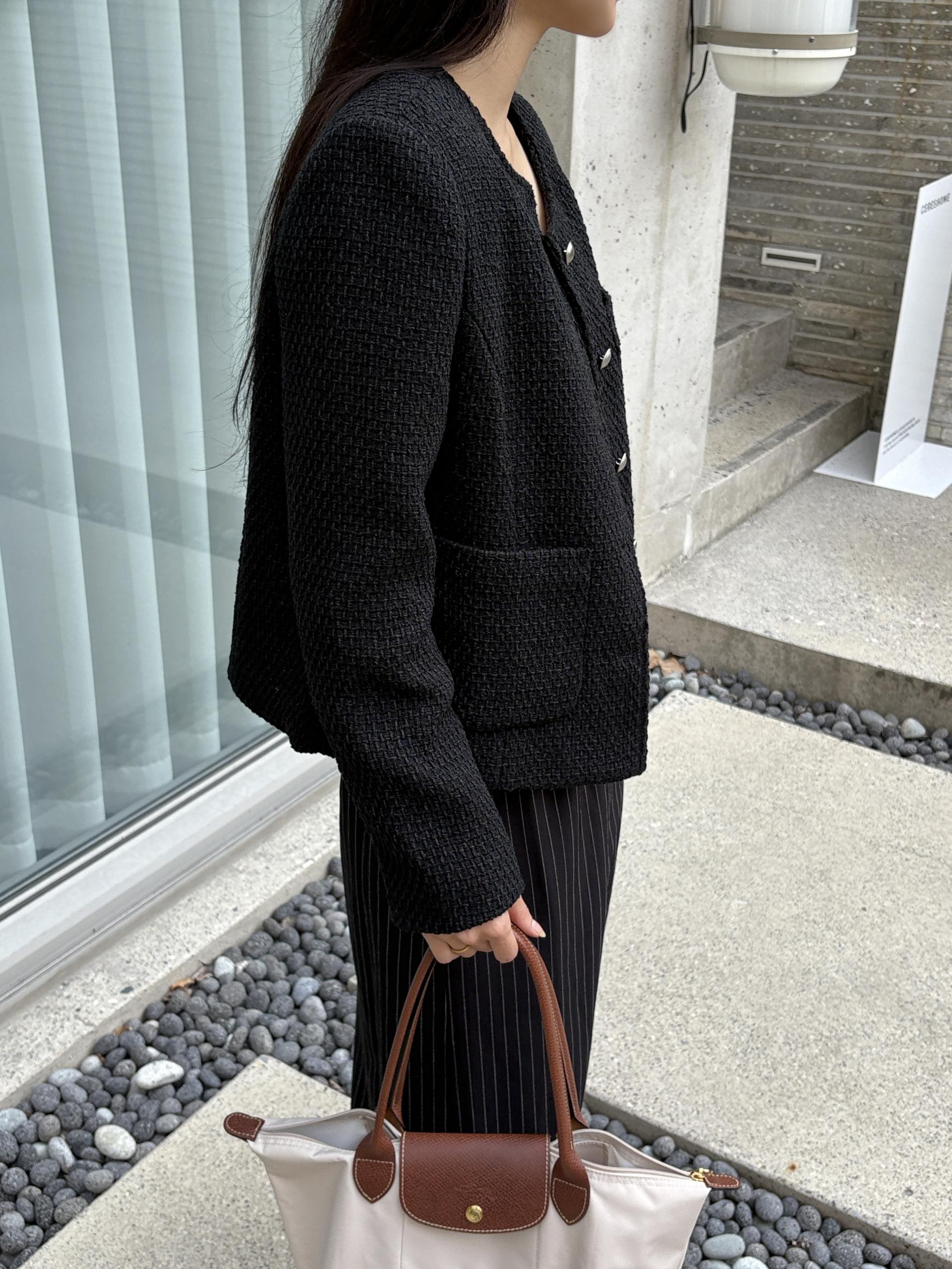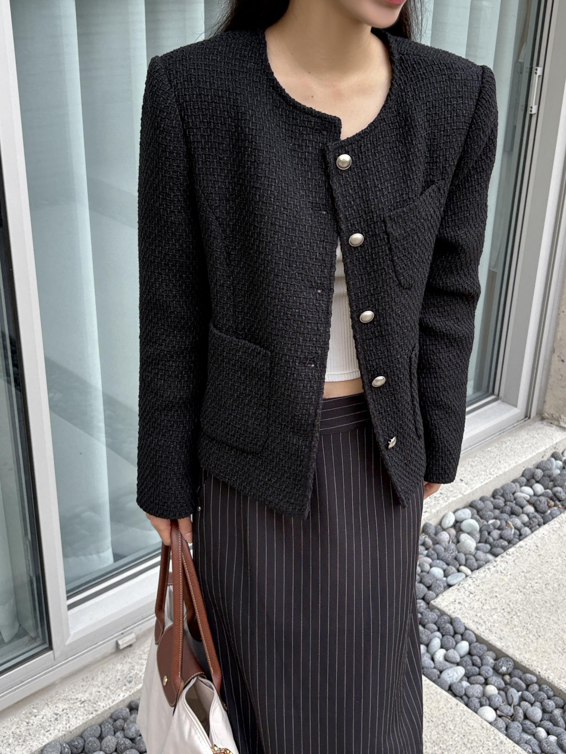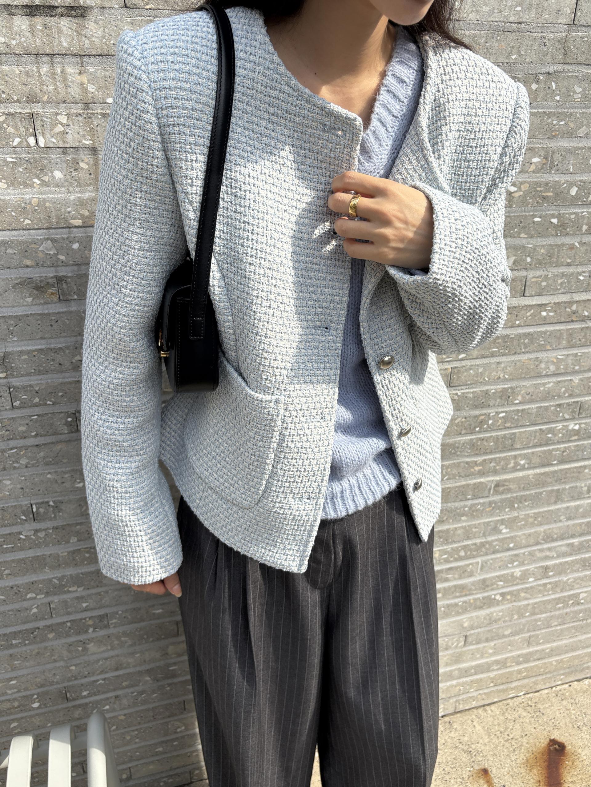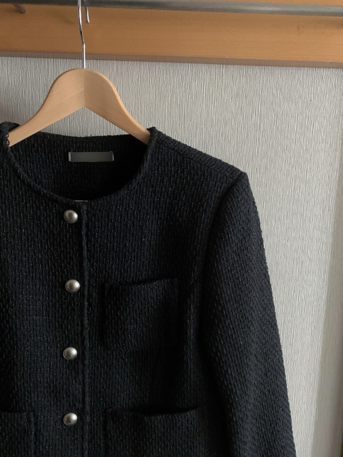 세련된 무드가 느껴지는 노카라 트위드 자켓입니다.