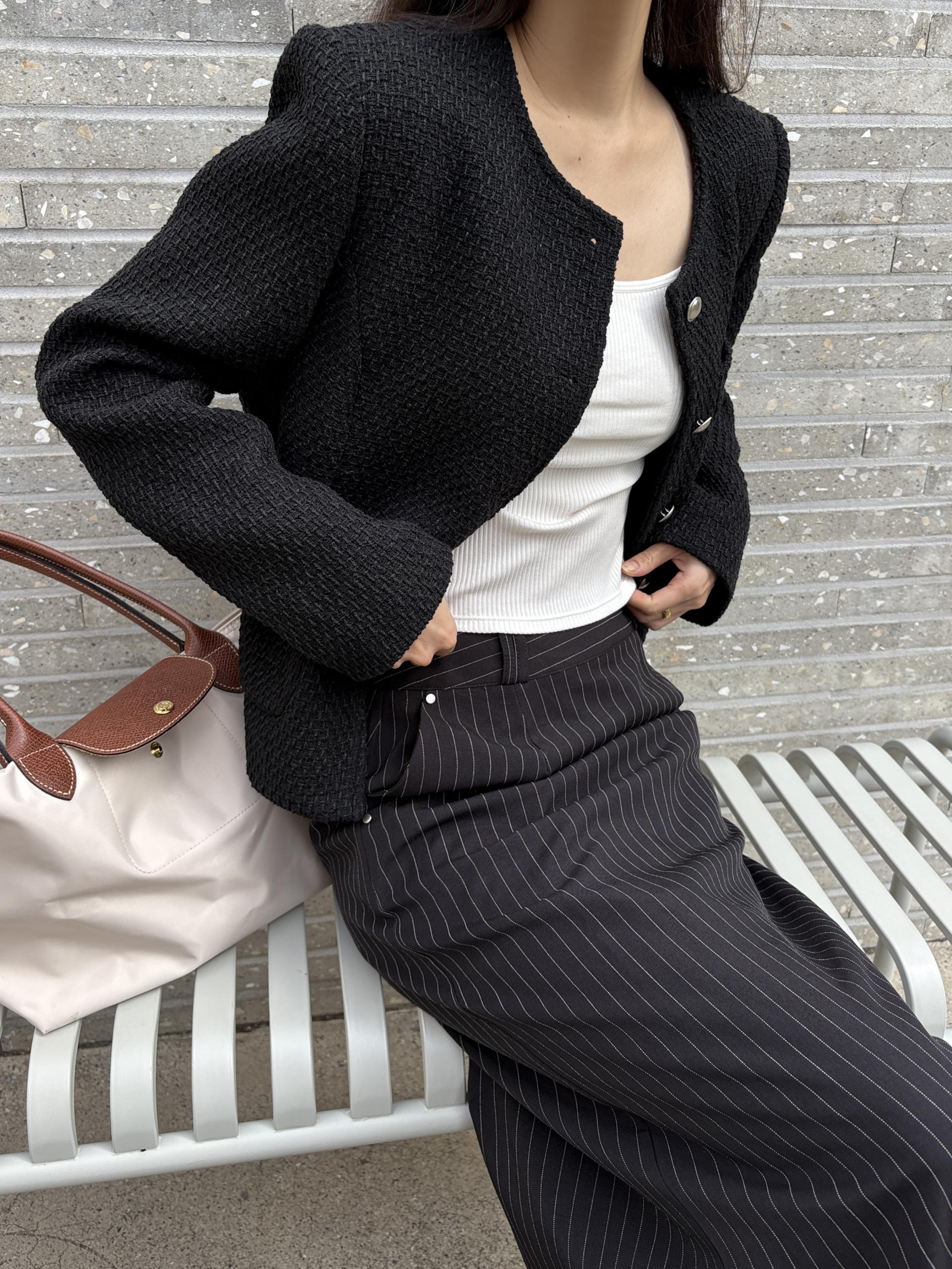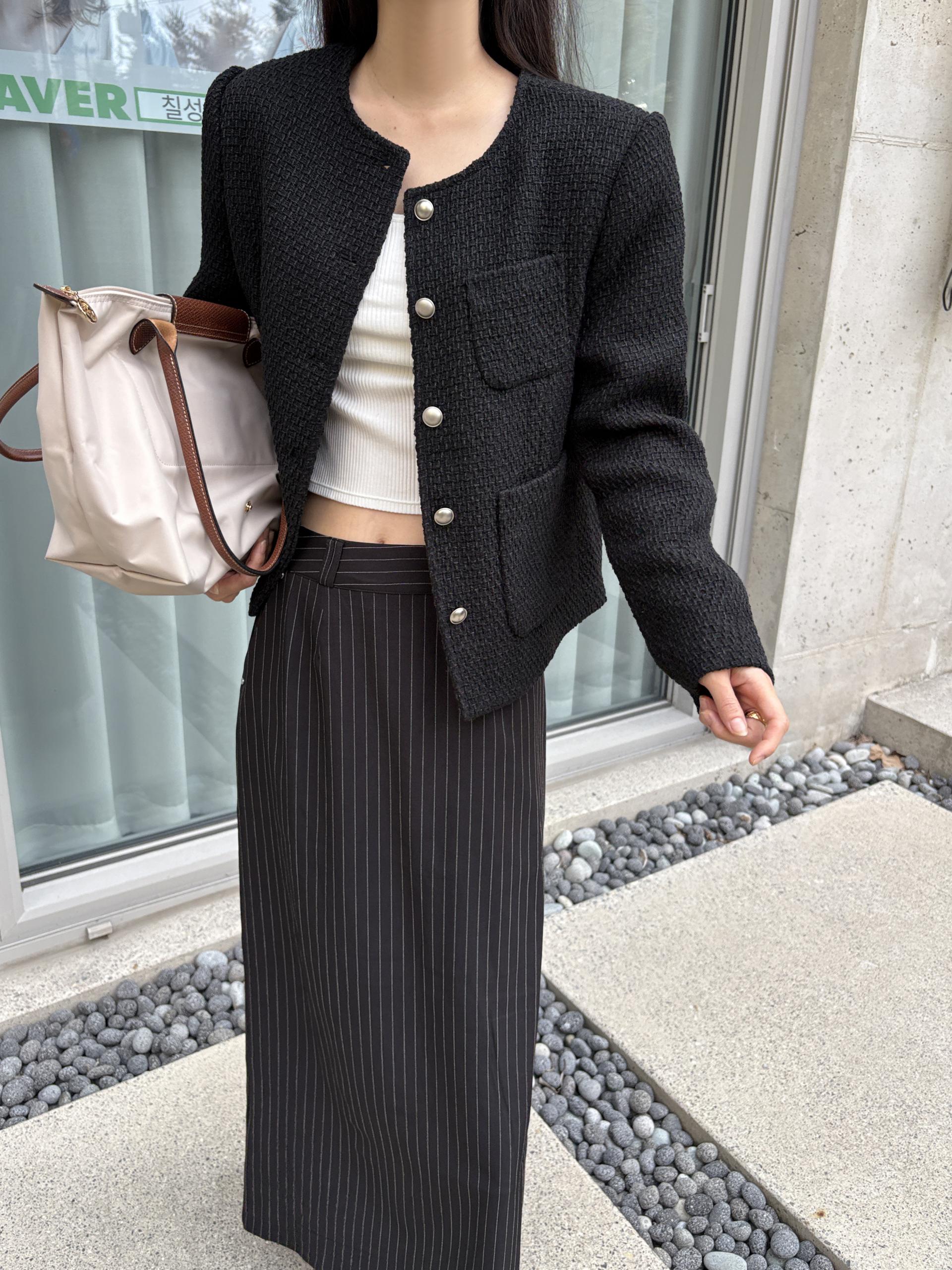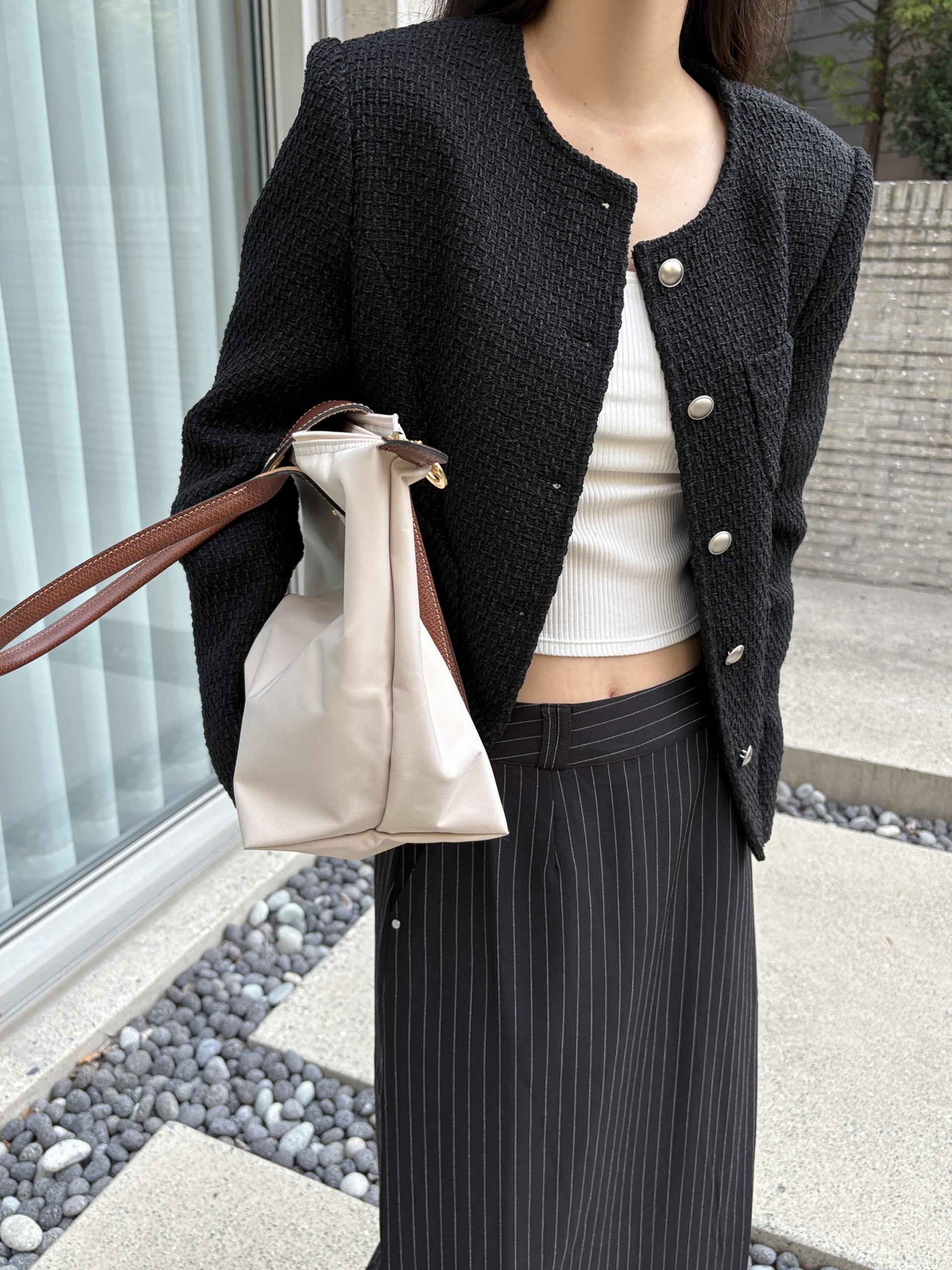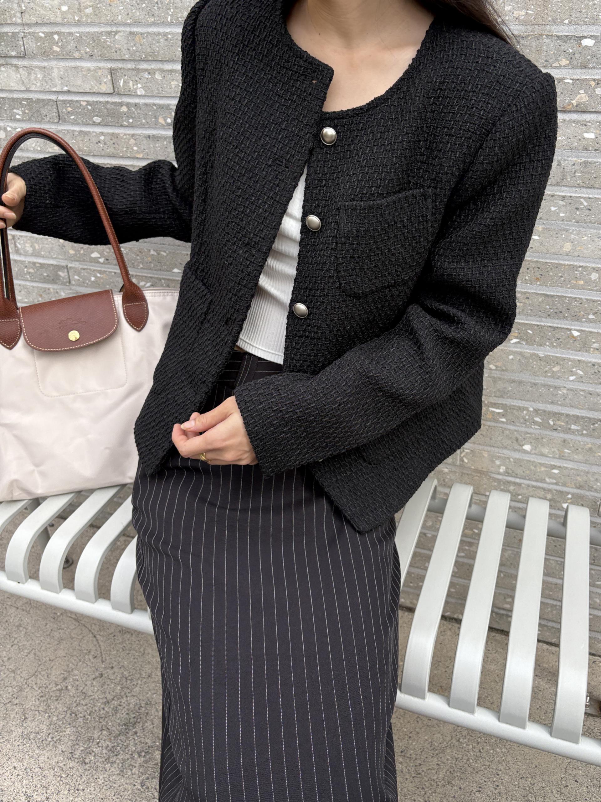 세련된 무드가 느껴지는 노카라 트위드 자켓입니다.